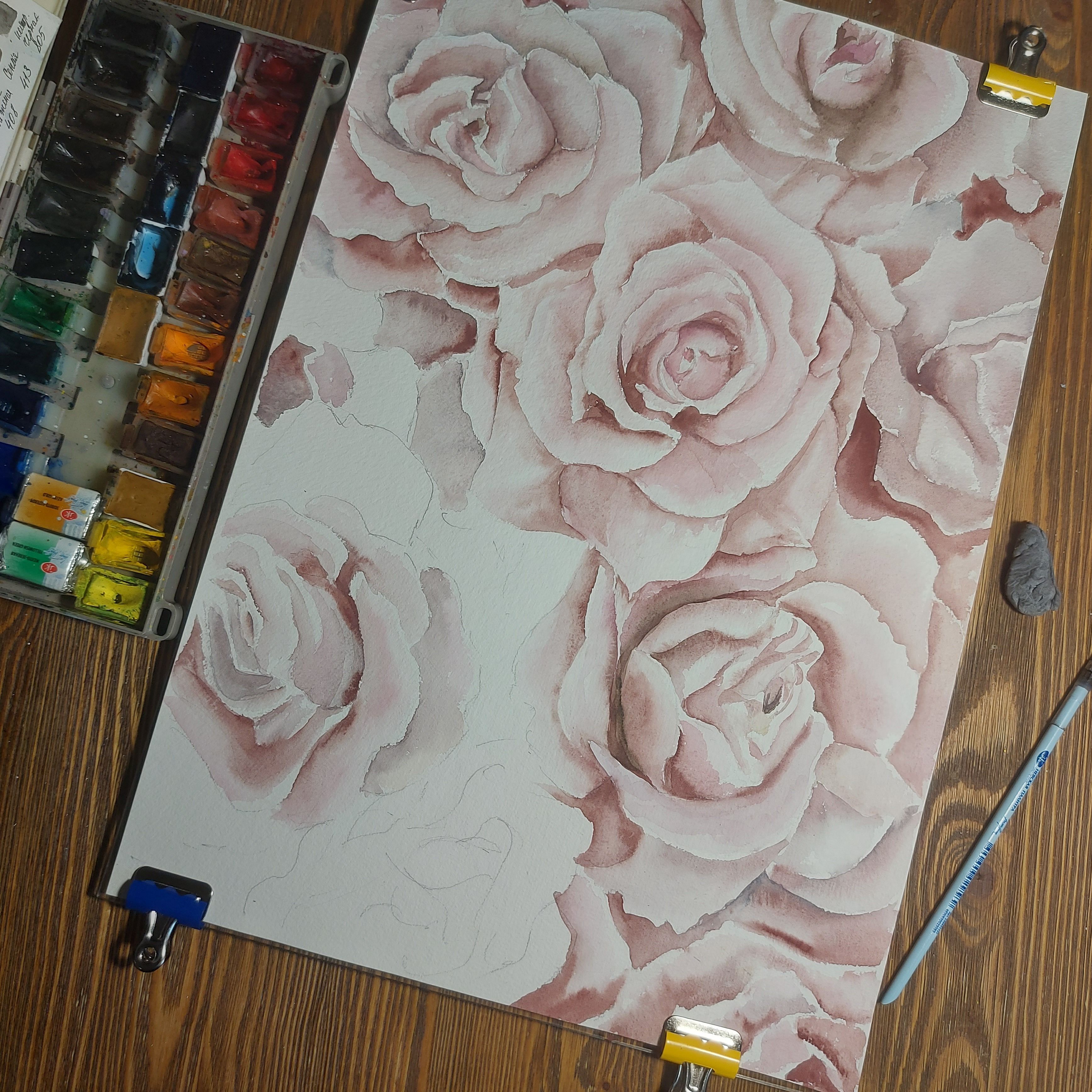 Цветы расположены достаточно плотно друг к другу, занимая почти все пространство изображения. Цвета характеризуются плавными переходами и акварельной техникой рисования, благодаря чему создается эффект мягкого фокуса. Контраст между цветами и фоном невысок, что делает общий образ более романтичным и спокойным.