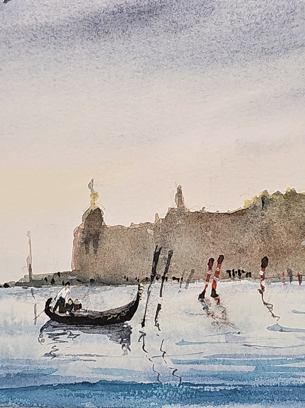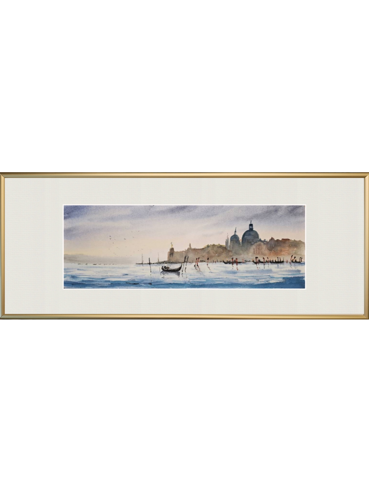 Нам представлена акварельная картина с видом на водную гладь и город на заднем плане. На переднем плане видна гондола, плывущая по спокойной воде. Вдалеке можно увидеть очертания зданий с куполами и башнями, которые создают атмосферу старинного европейского города Венеции. Цвета картины преимущественно мягкие и пастельные, с преобладанием голубых и бежевых тонов, что придаёт изображению спокойствие и романтичность. Работа оформлена в светлое паспарту и готова к размещению в стандартной раме 20*50 см.