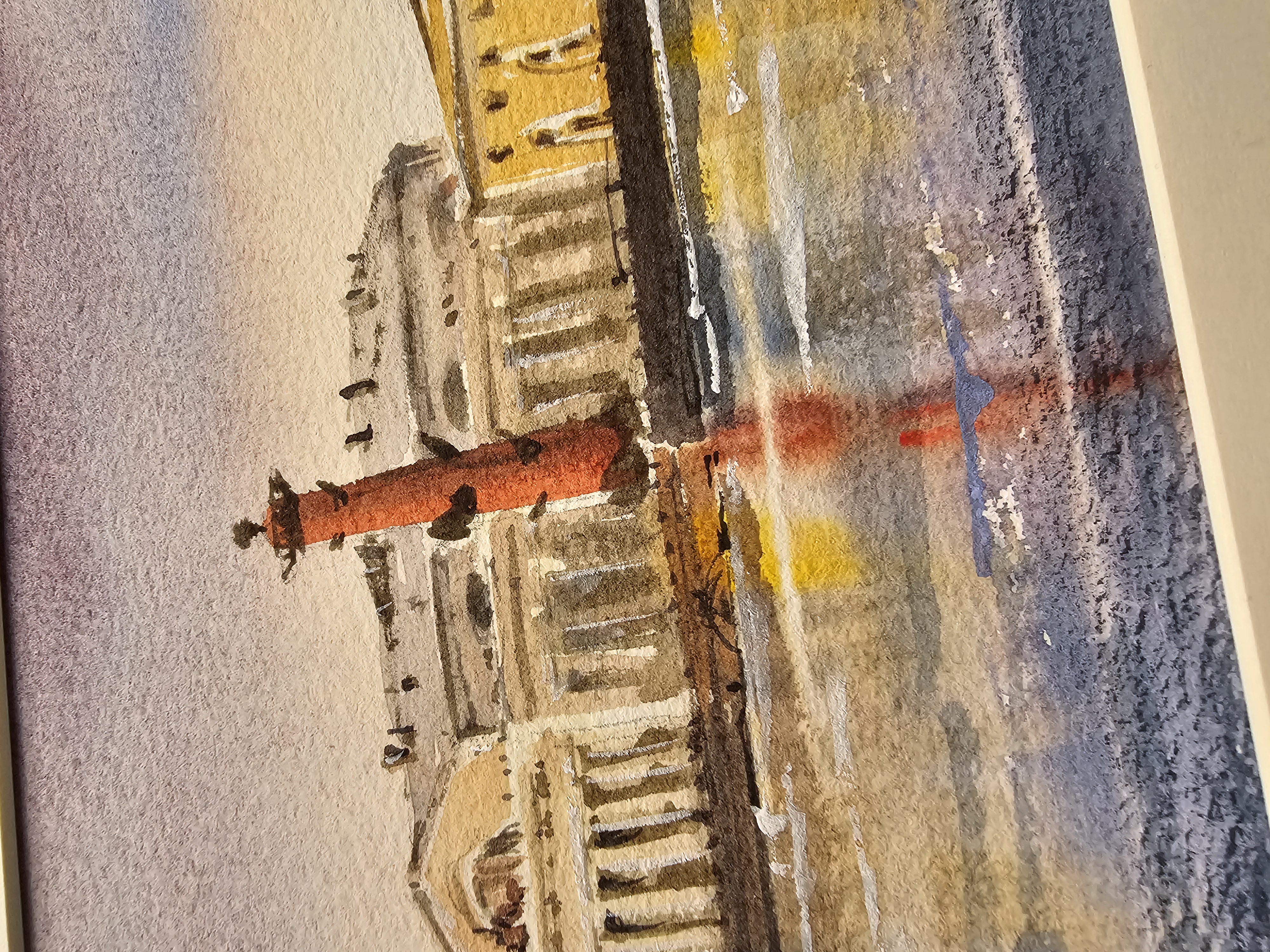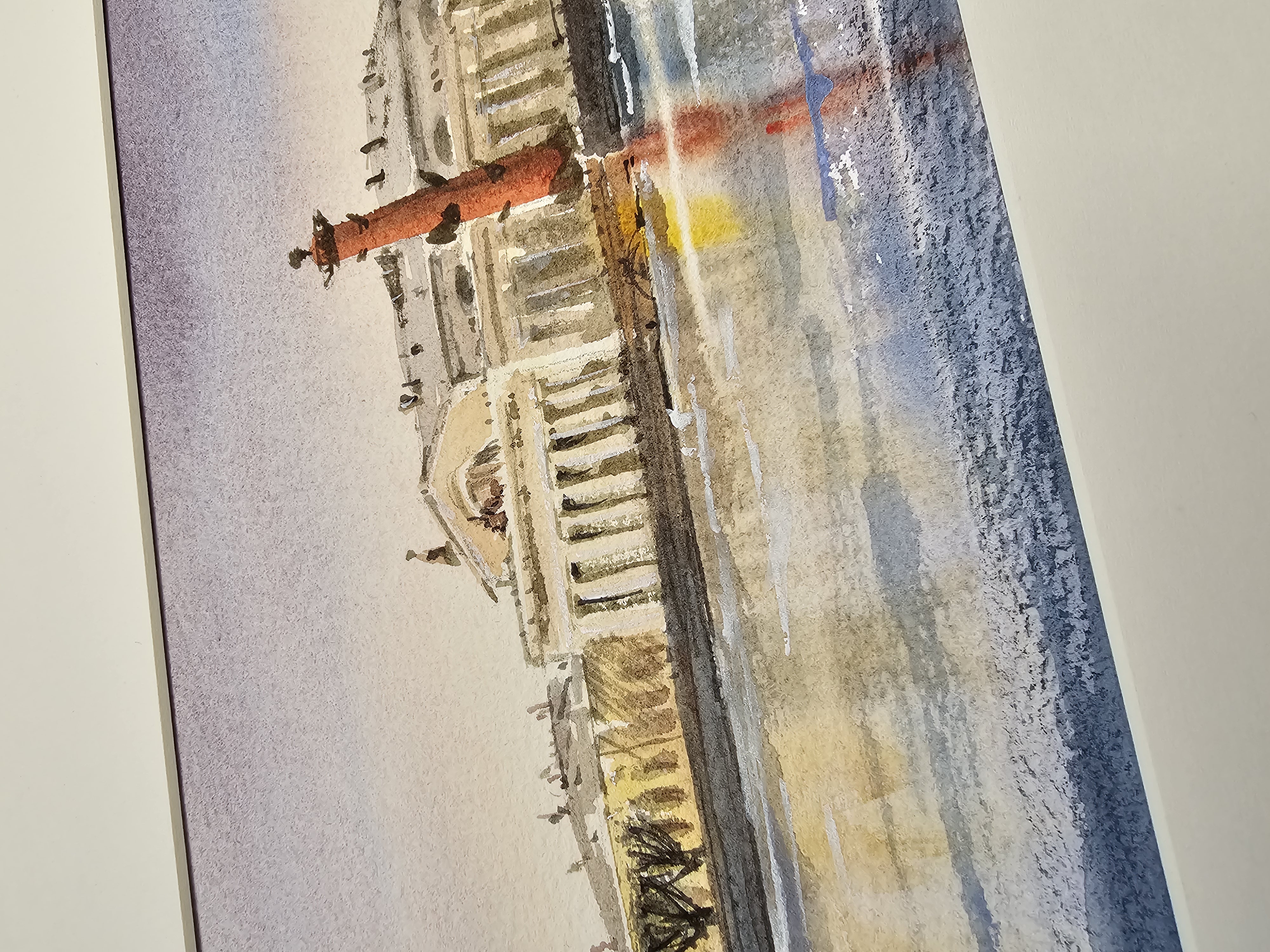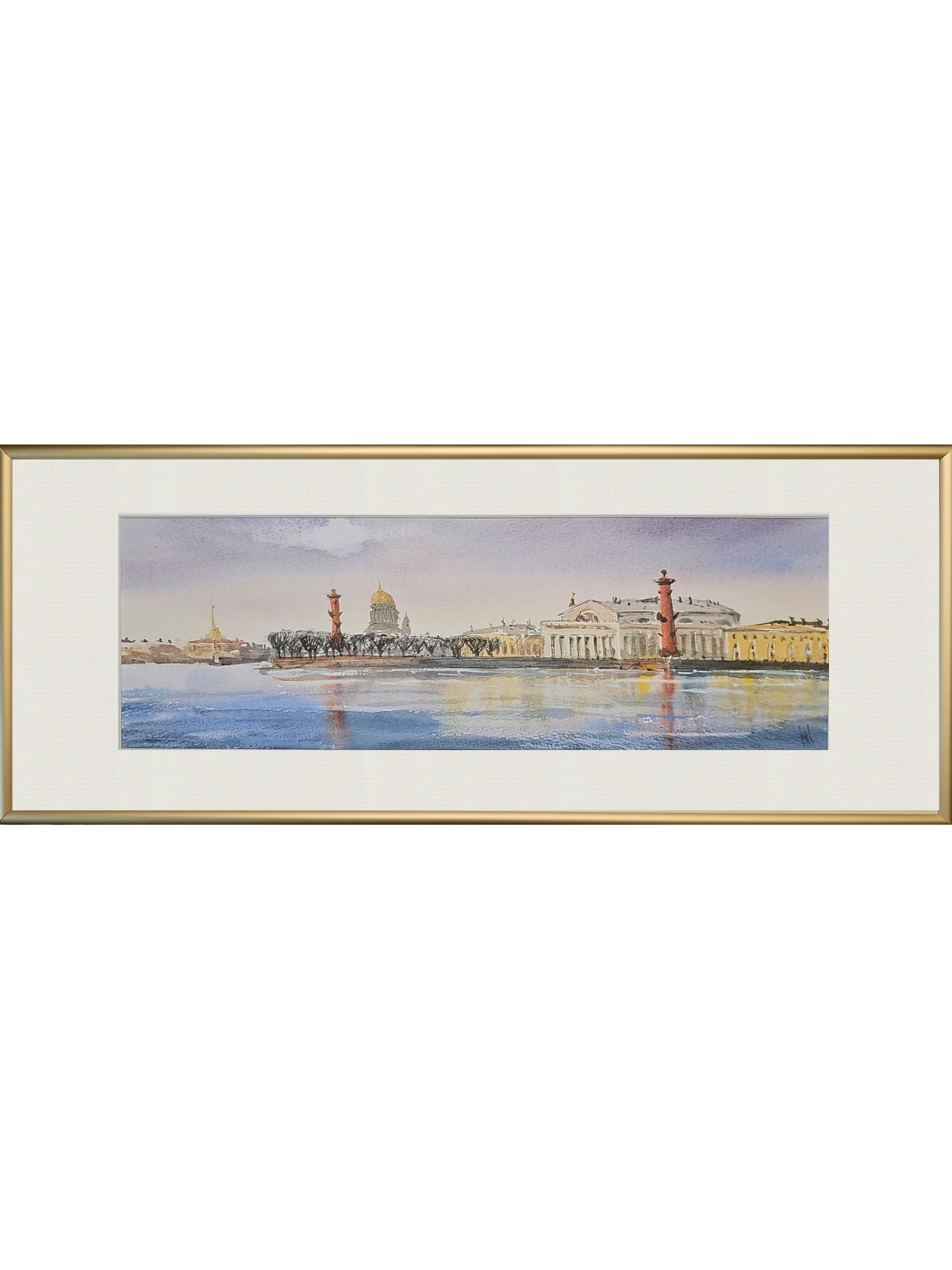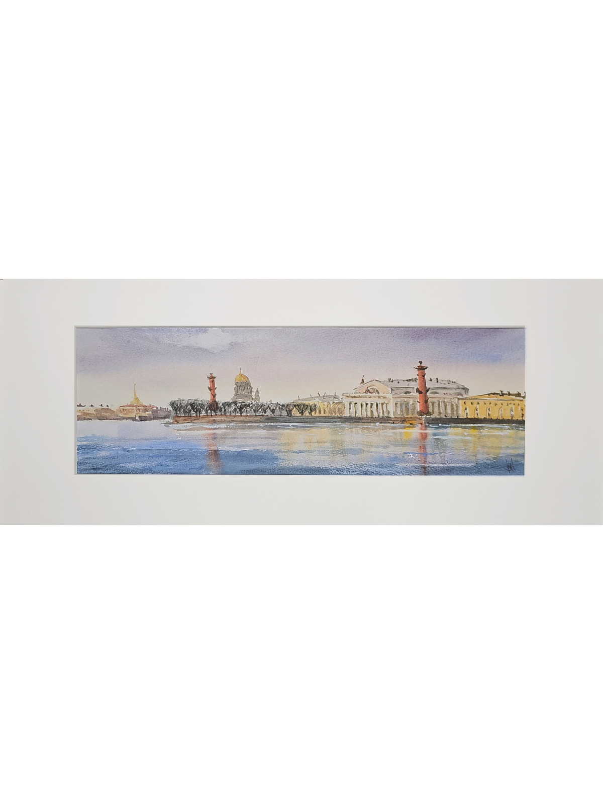 Нам представлена акварельная картина с панорамным видом набережной. На переднем плане изображена водная гладь, отражающая здания и архитектурные элементы. В центре композиции находятся две красные колонны, известные как Ростральные колонны. Справа от них виднеется здание с колоннадой и куполом, подтверждая архитектуру Санкт-Петербурга. На заднем плане можно увидеть купол и шпиль, относящиеся к известным достопримечательностям города. Картина выполнена в мягких пастельных тонах, создающих атмосферу спокойствия и гармонии. Работа оформлена в светлое паспарту и готова к размещению в стандартной раме 20*50 см.