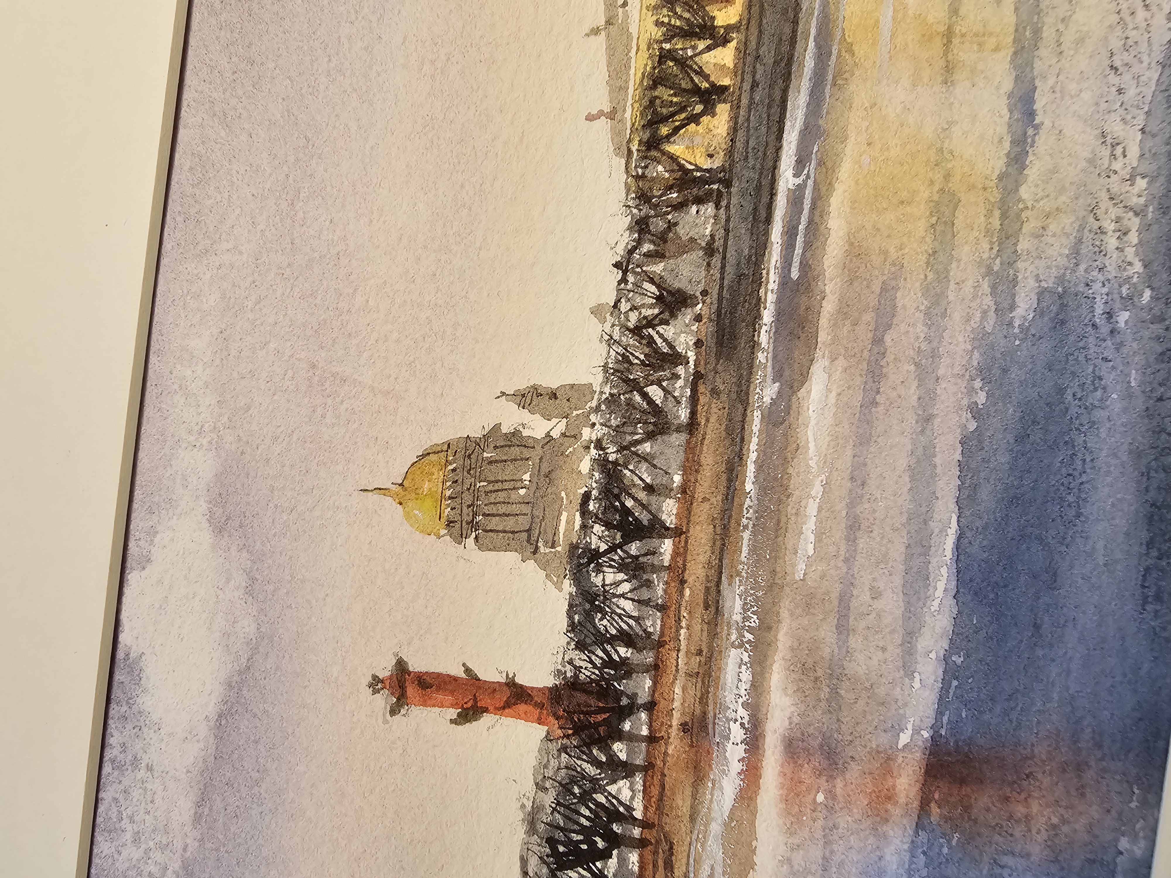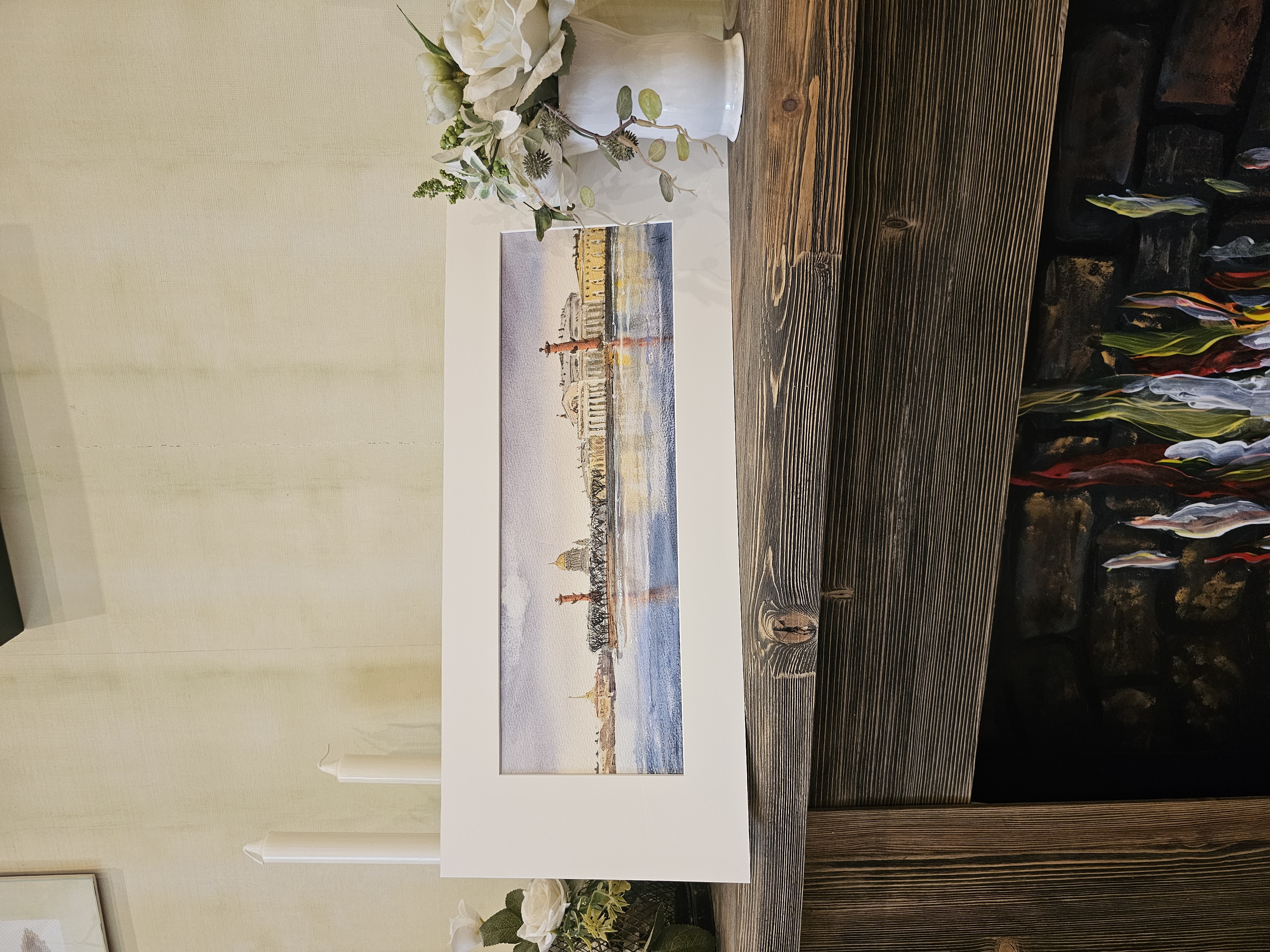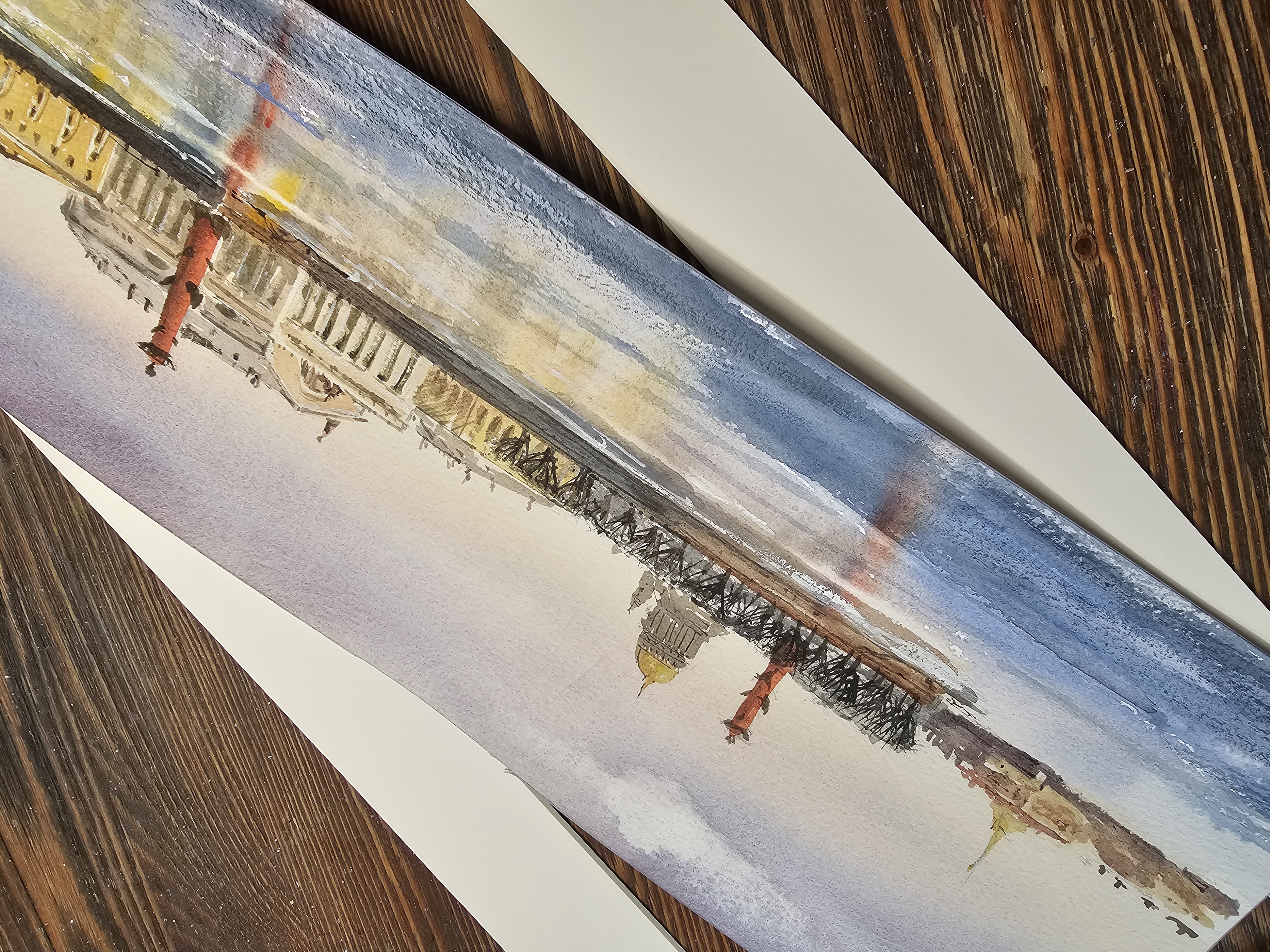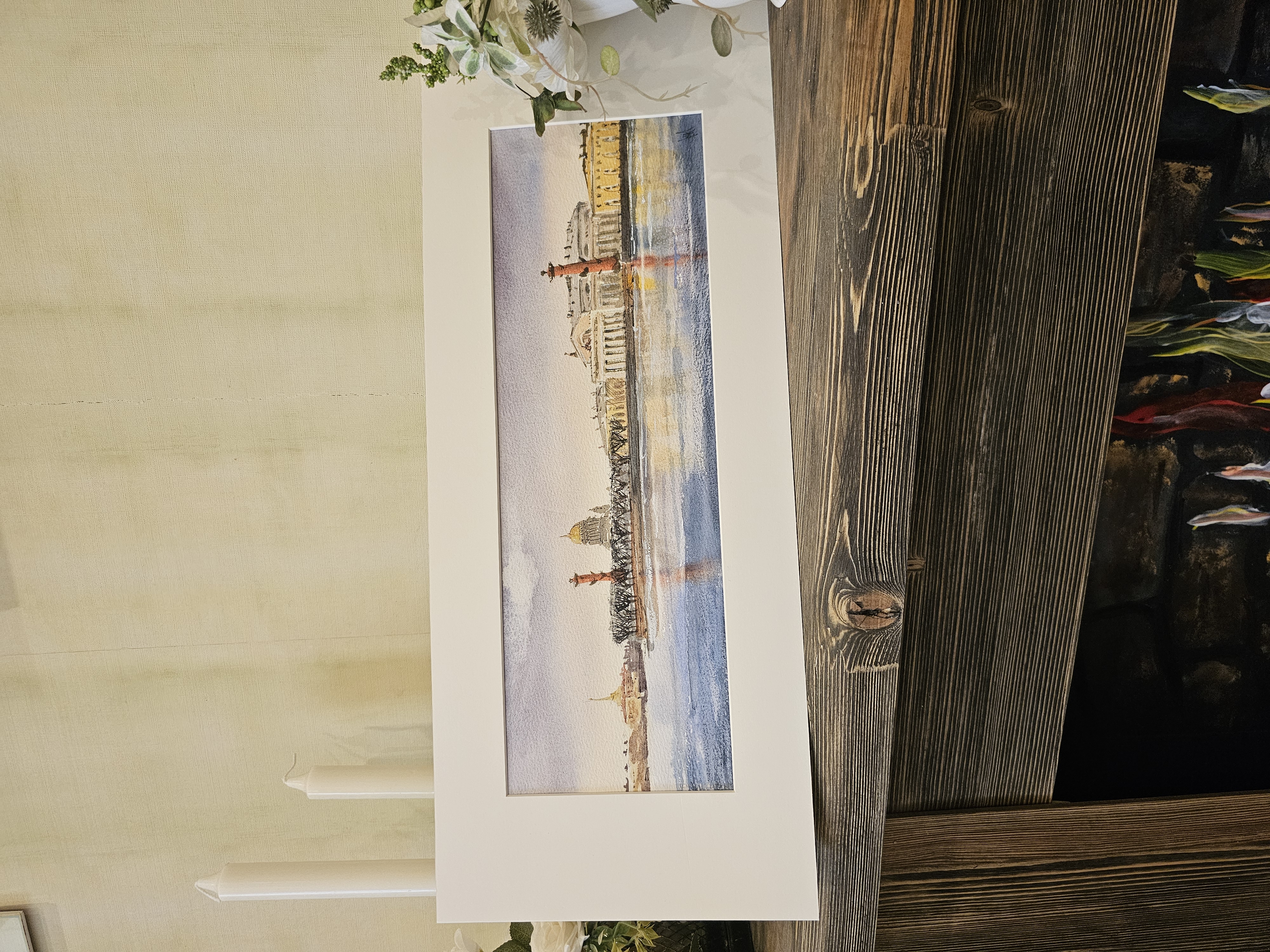 Нам представлена акварельная картина с панорамным видом набережной. На переднем плане изображена водная гладь, отражающая здания и архитектурные элементы. В центре композиции находятся две красные колонны, известные как Ростральные колонны. Справа от них виднеется здание с колоннадой и куполом, подтверждая архитектуру Санкт-Петербурга. На заднем плане можно увидеть купол и шпиль, относящиеся к известным достопримечательностям города. Картина выполнена в мягких пастельных тонах, создающих атмосферу спокойствия и гармонии. Работа оформлена в светлое паспарту и готова к размещению в стандартной раме 20*50 см.