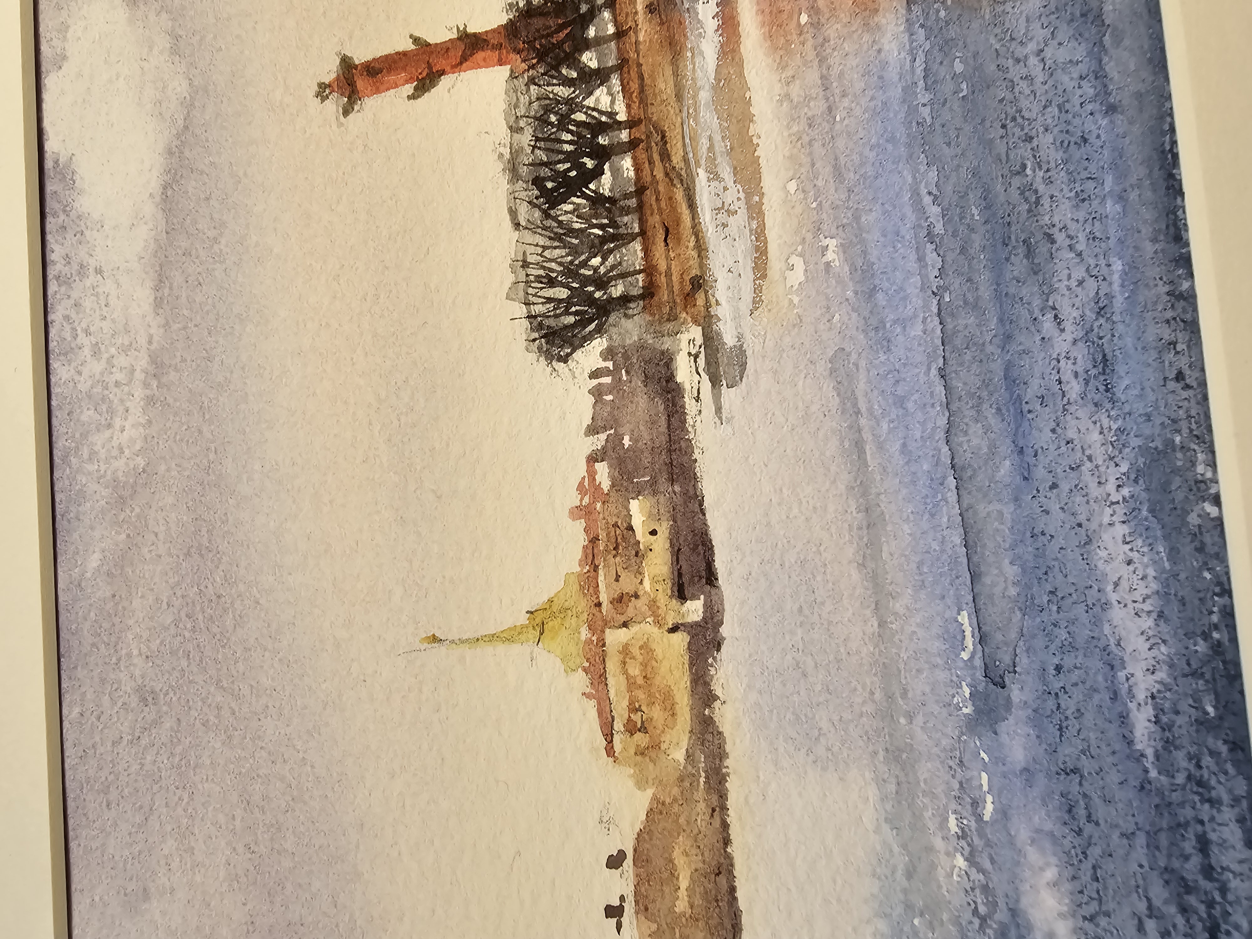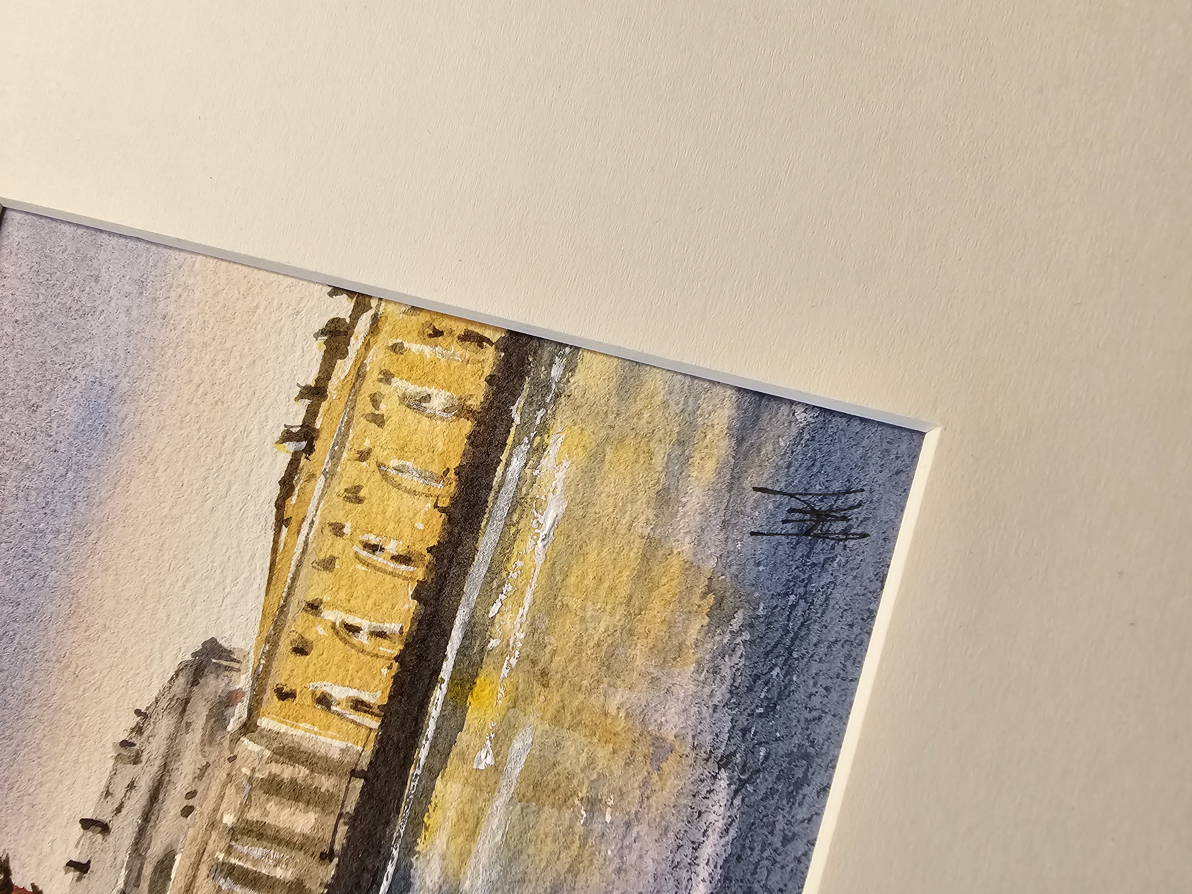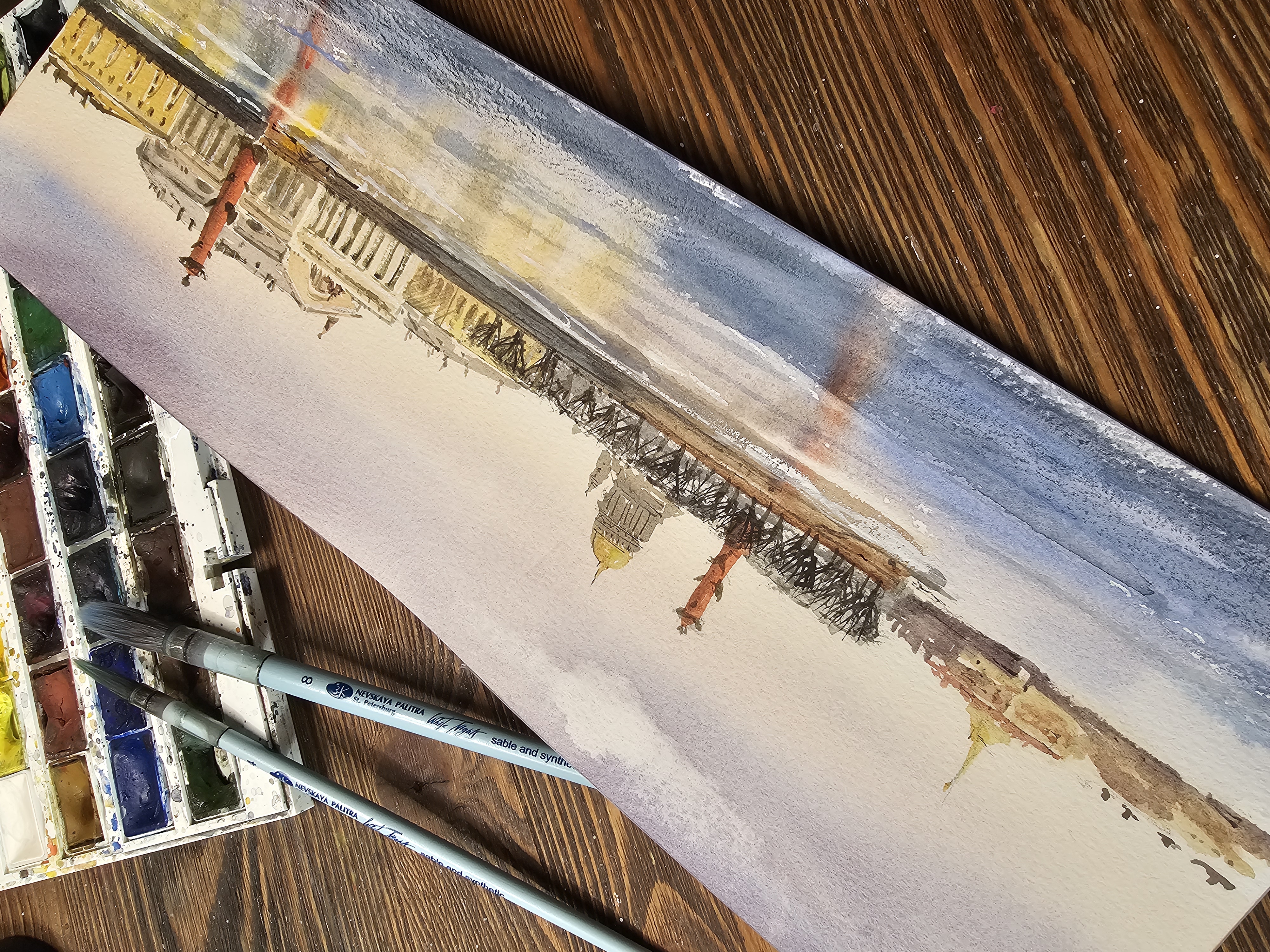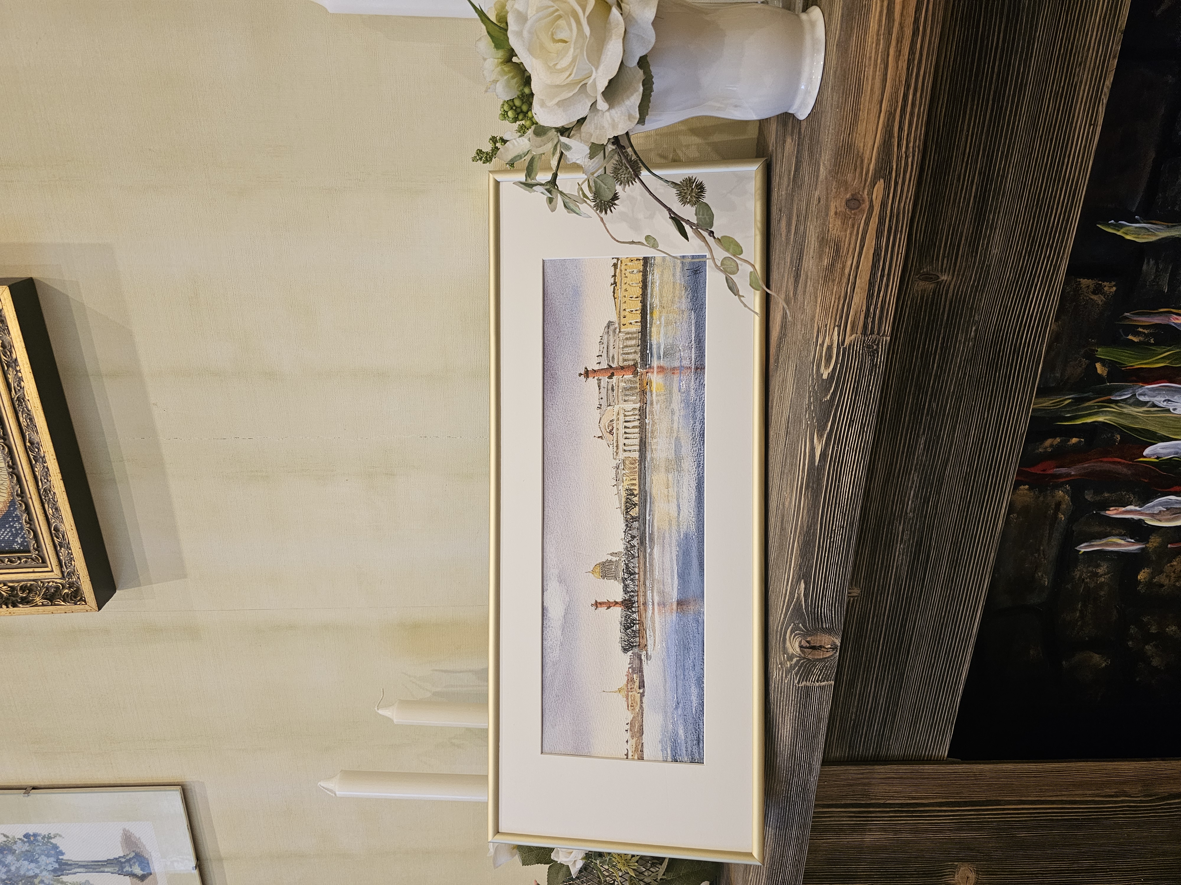 Нам представлена акварельная картина с панорамным видом набережной. На переднем плане изображена водная гладь, отражающая здания и архитектурные элементы. В центре композиции находятся две красные колонны, известные как Ростральные колонны. Справа от них виднеется здание с колоннадой и куполом, подтверждая архитектуру Санкт-Петербурга. На заднем плане можно увидеть купол и шпиль, относящиеся к известным достопримечательностям города. Картина выполнена в мягких пастельных тонах, создающих атмосферу спокойствия и гармонии. Работа оформлена в светлое паспарту и готова к размещению в стандартной раме 20*50 см.