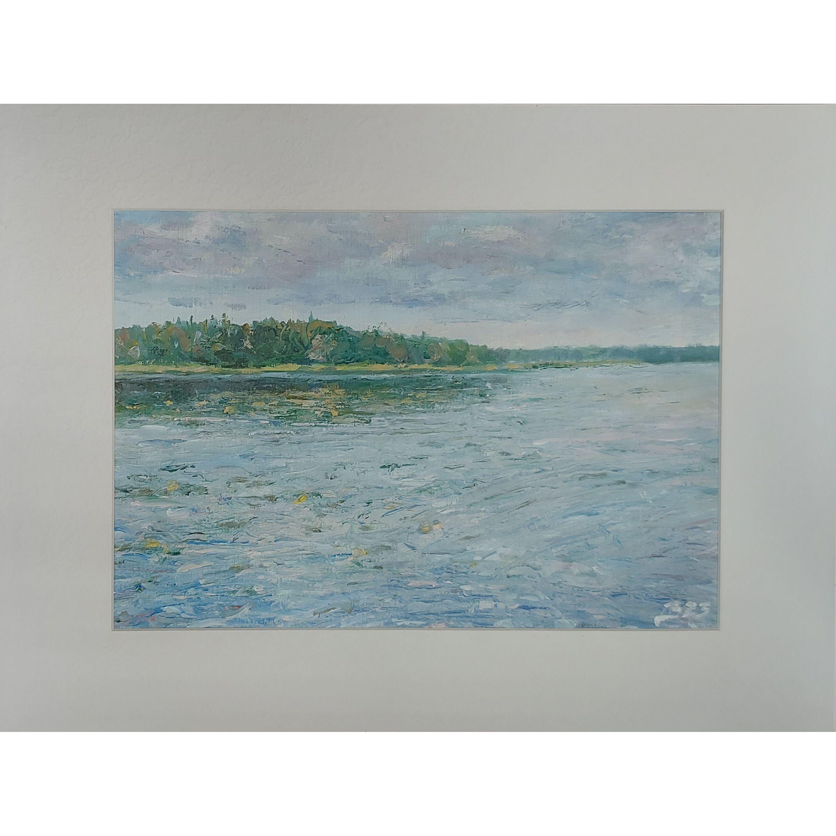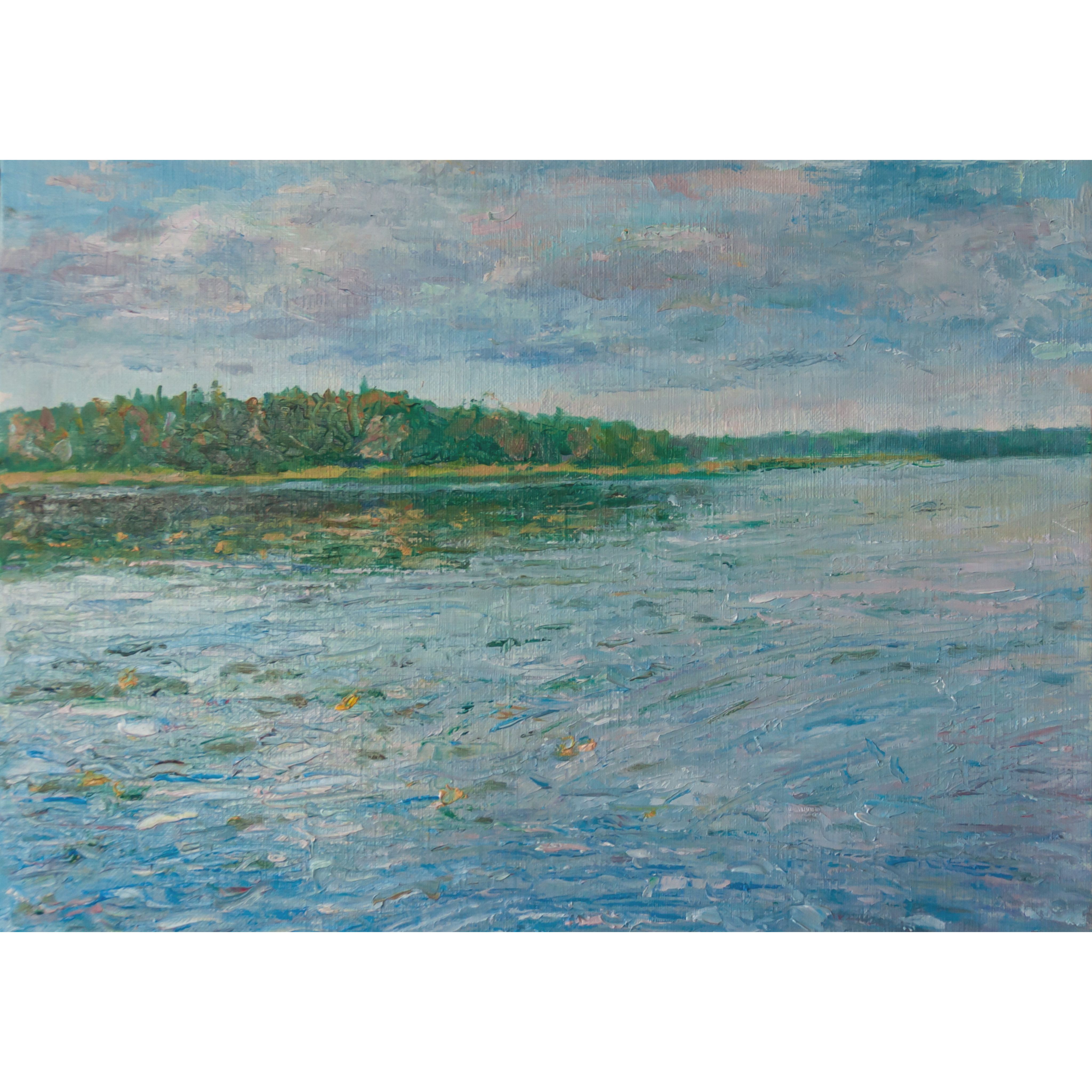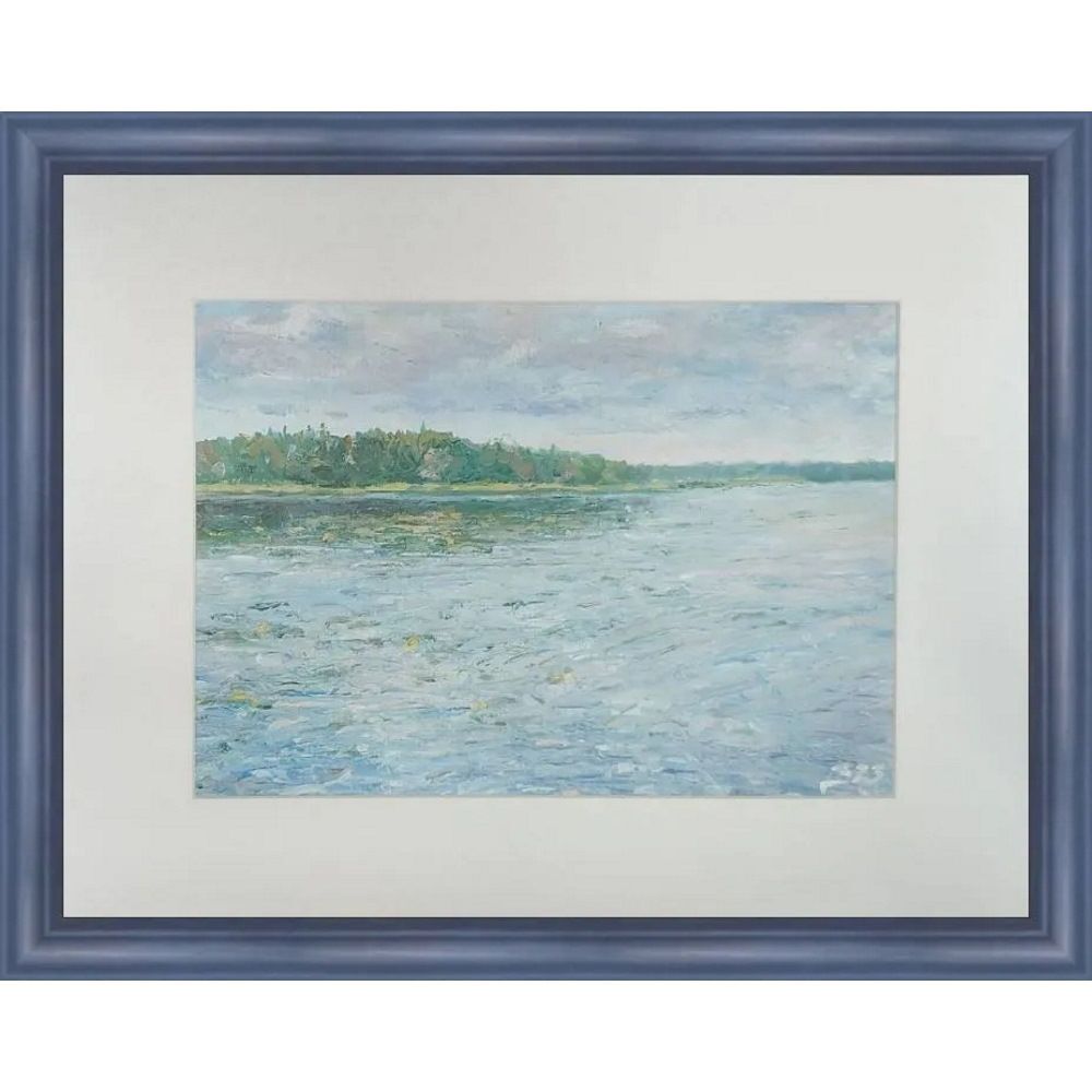 Картина выполнена в основном в синих и зелёных тонах. Перед нами пейзаж, изображающий водную гладь, это река, под покровом неба с облаками. Вдали можно увидеть зелёный лесной массив, который отражается в воде. Взгляд зрителя, кажется, направлен с высокой точки на водную гладь, и в результате создаётся впечатление широкого и открытого пространства. Мазки краски похожи на мелкие волнушки на воде, которые создают ощущение движения и живописности. В воде можно разглядеть оттенки жёлтого, возможно, это отражение солнца или листьев. Картина оформлена в светлое паспарту, которое аккуратно обрамляет художественное произведение и подчёркивает его цвета.