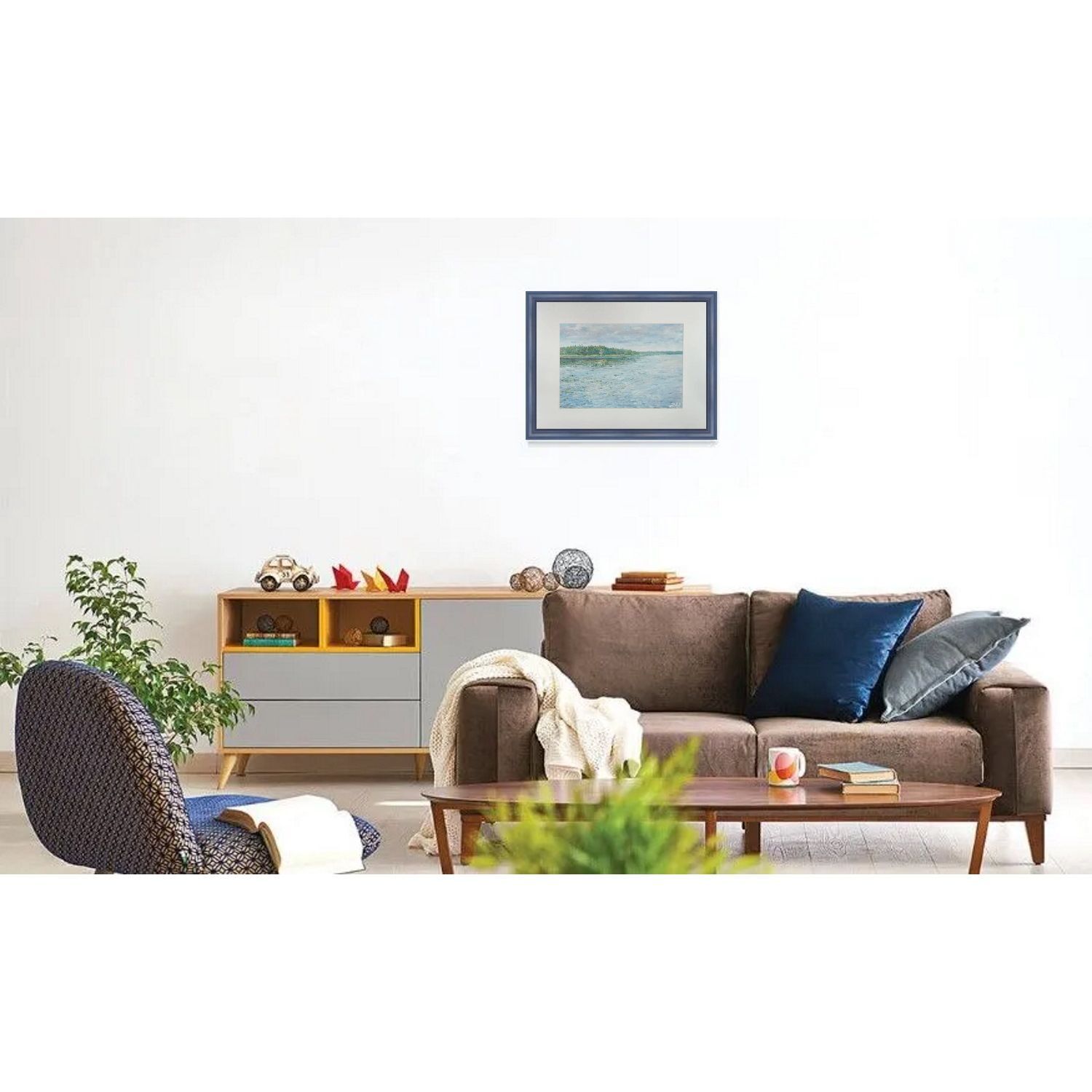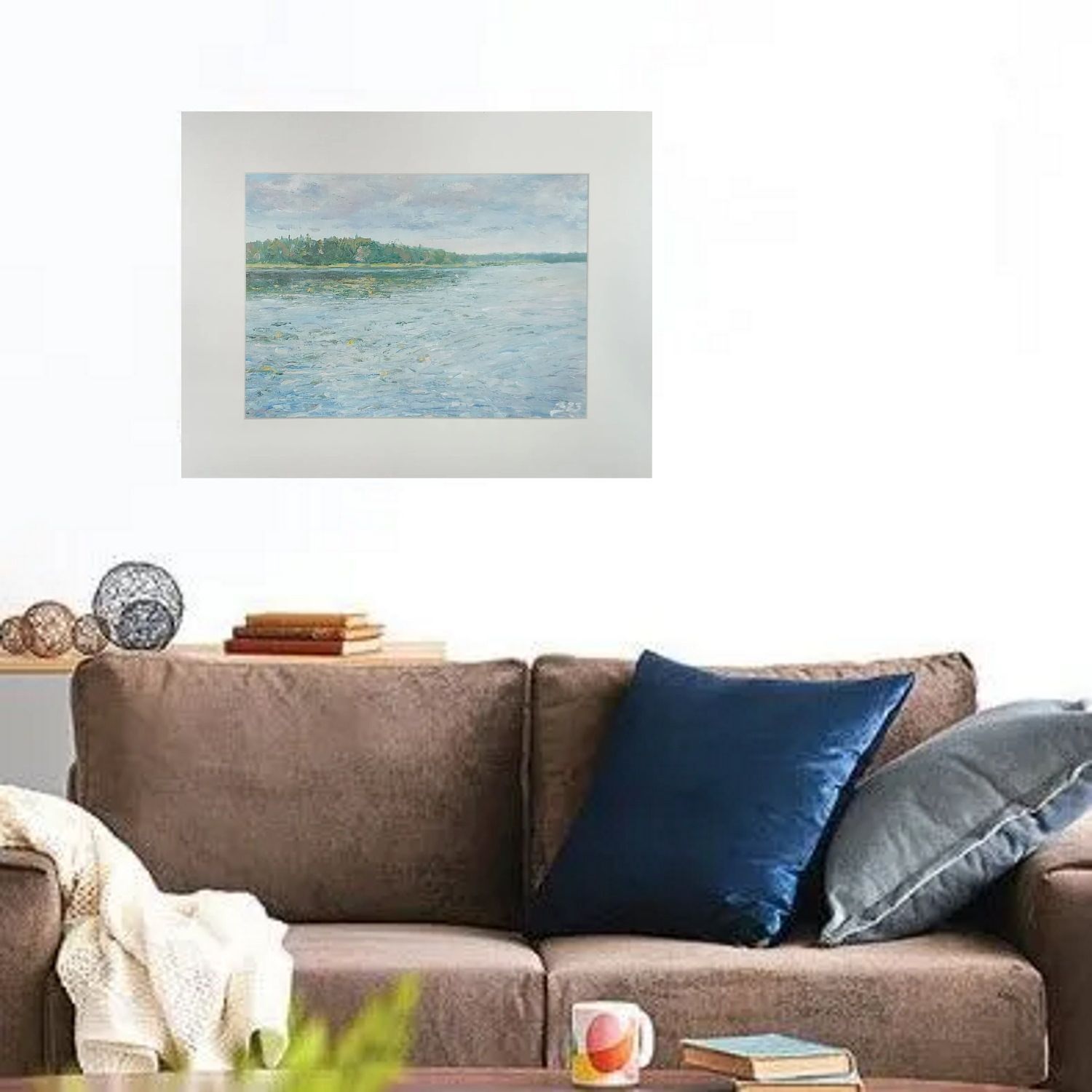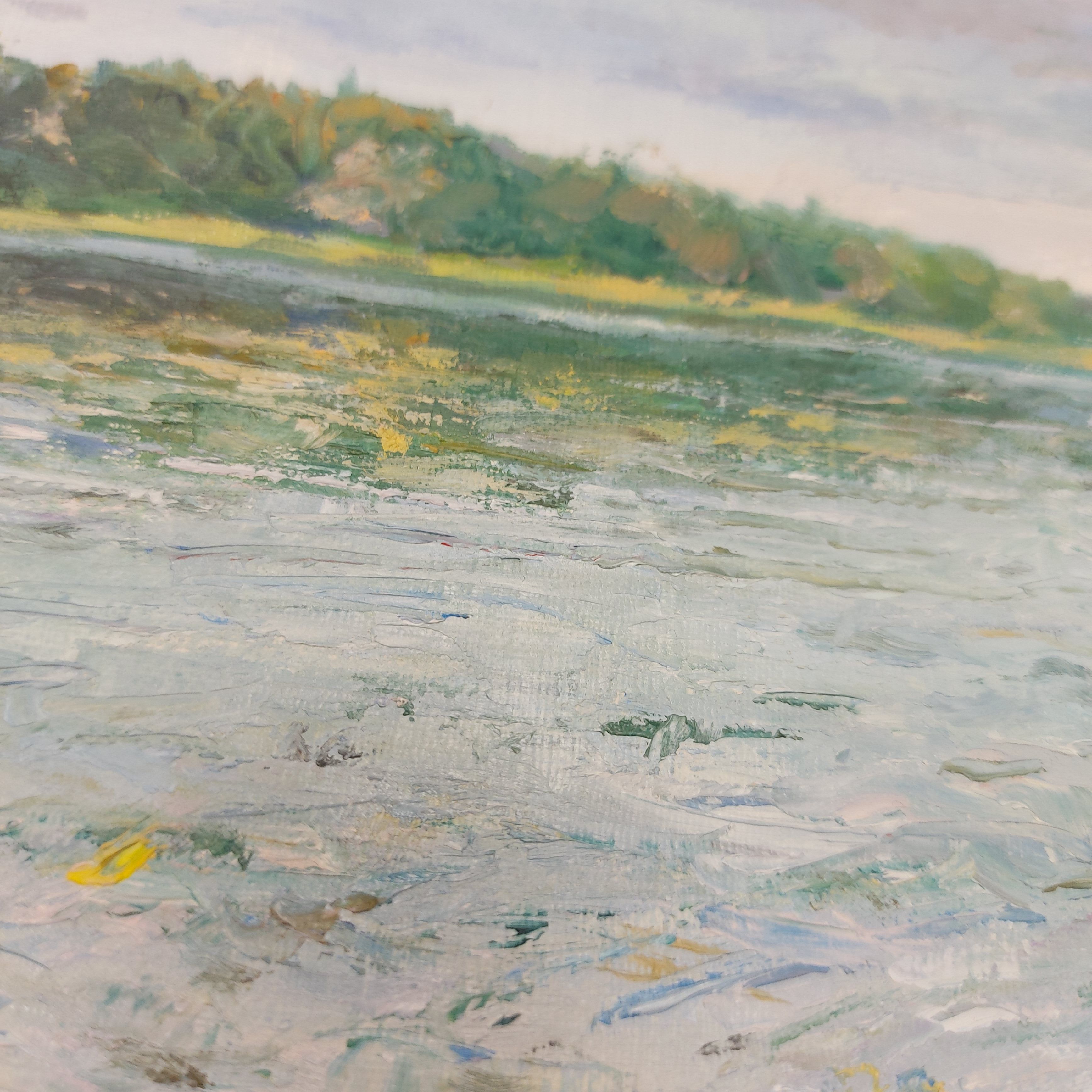 Картина выполнена в основном в синих и зелёных тонах. Перед нами пейзаж, изображающий водную гладь, это река, под покровом неба с облаками. Вдали можно увидеть зелёный лесной массив, который отражается в воде. Взгляд зрителя, кажется, направлен с высокой точки на водную гладь, и в результате создаётся впечатление широкого и открытого пространства. Мазки краски похожи на мелкие волнушки на воде, которые создают ощущение движения и живописности. В воде можно разглядеть оттенки жёлтого, возможно, это отражение солнца или листьев. Картина оформлена в светлое паспарту, которое аккуратно обрамляет художественное произведение и подчёркивает его цвета.