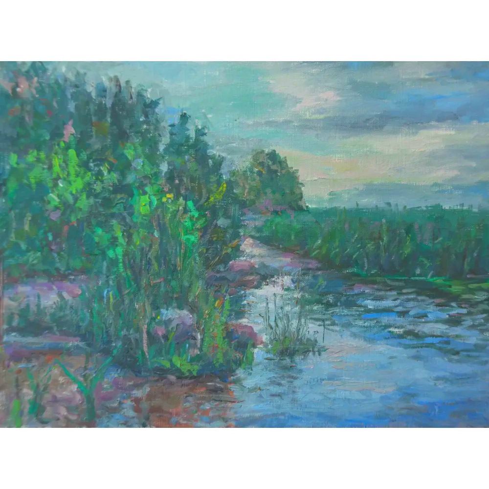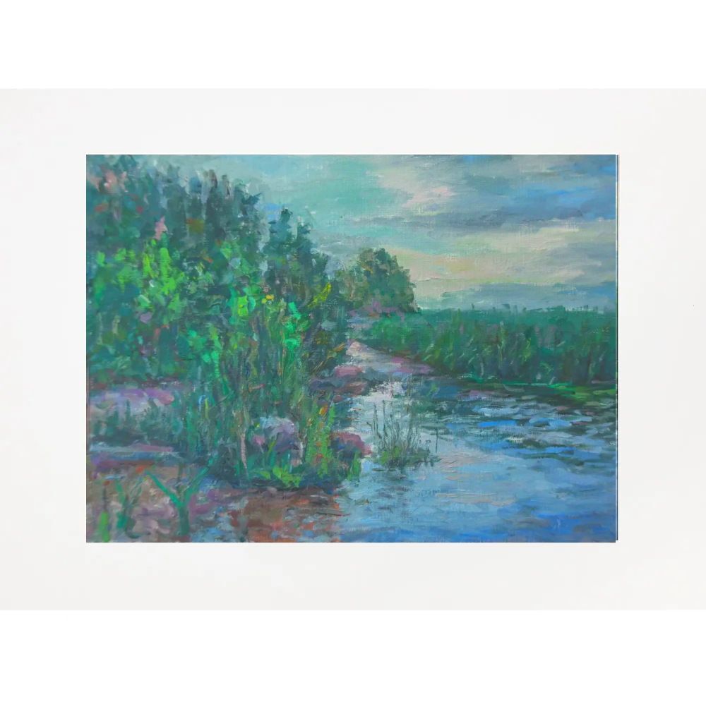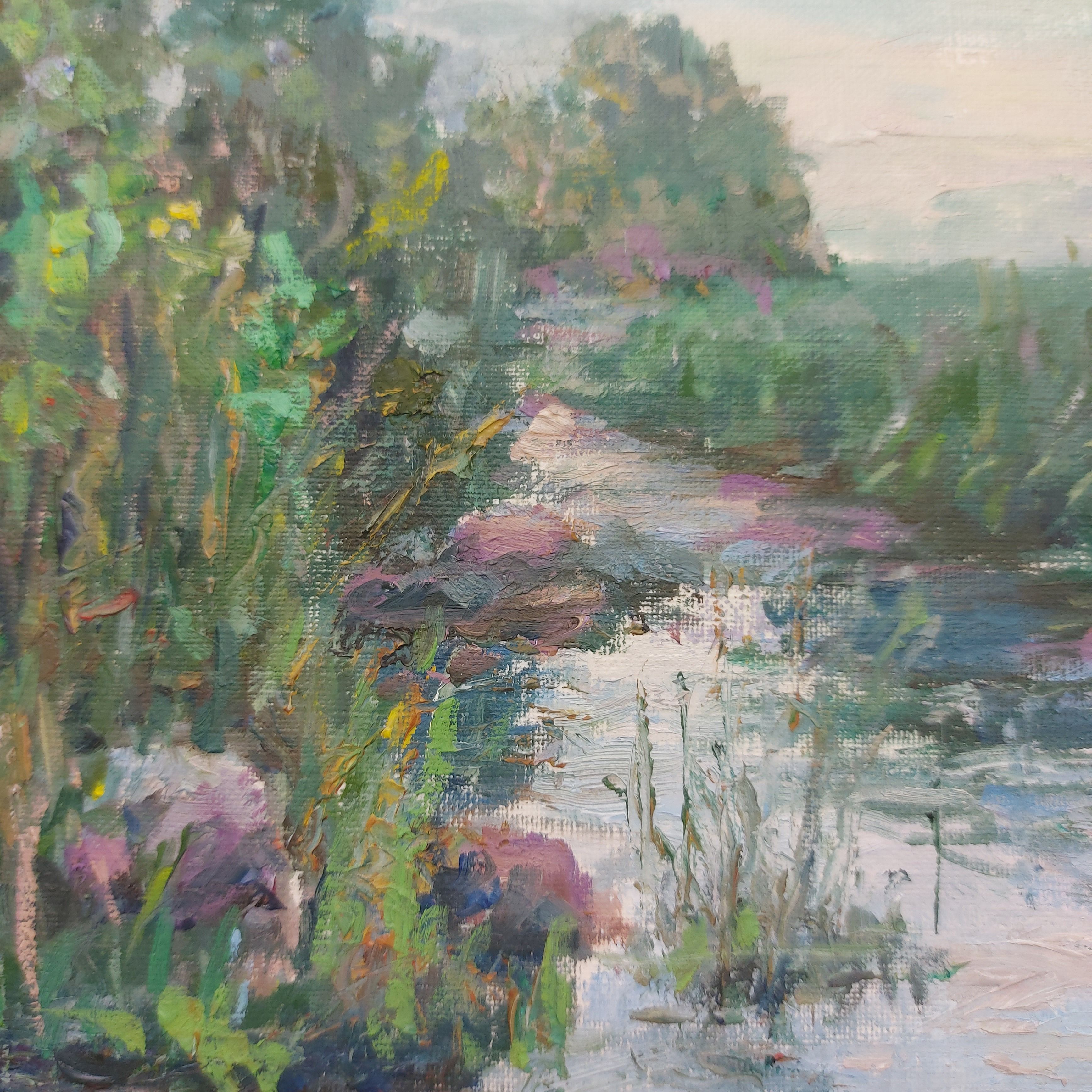 На картине мы видим пейзаж с берегом реки, протекающий через природный ландшафт. На переднем плане кусты и деревья с различными оттенками зеленого и фиолетового. Солнечный свет проникает сквозь листву, создавая яркие блики и тени. Вода отражает небо и окружающую растительность, благодаря чему возникает эффект зеркального отражения разнообразия цветов и света. На заднем плане можно увидеть линию горизонта с более темными деревьями. Небо выглядит спокойным с мягкими переходами от голубого к серым и белым оттенкам, предчувствуя наступление вечера. Общее впечатление от картины - это спокойная, пленительная атмосфера уединенного уголка природы.