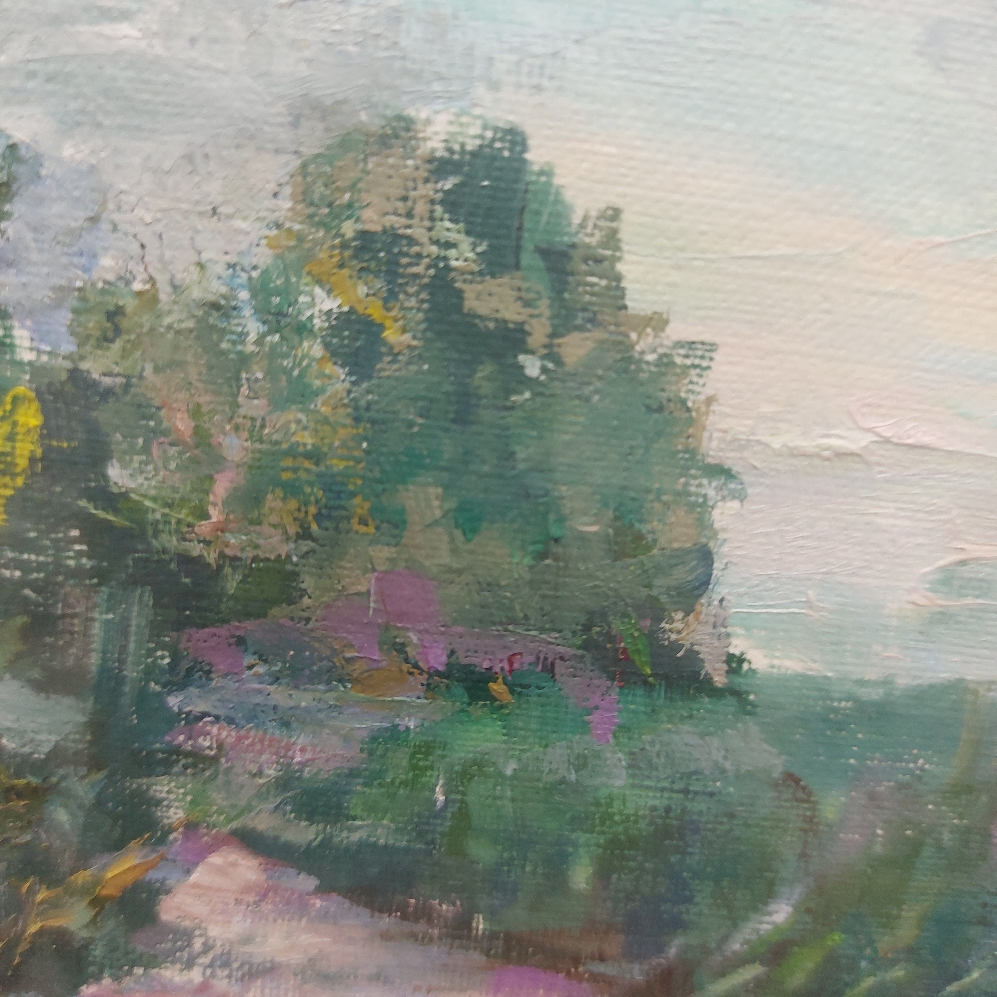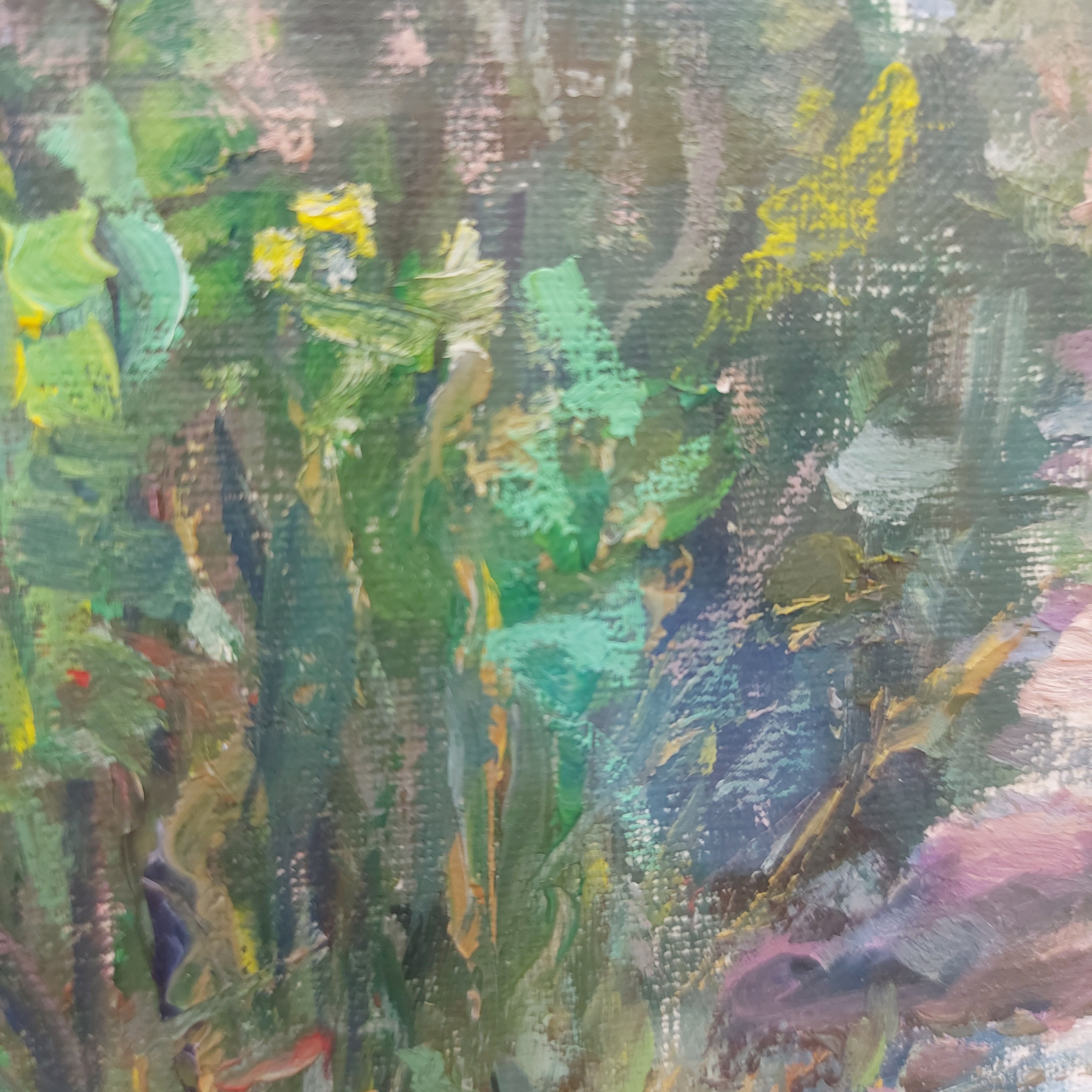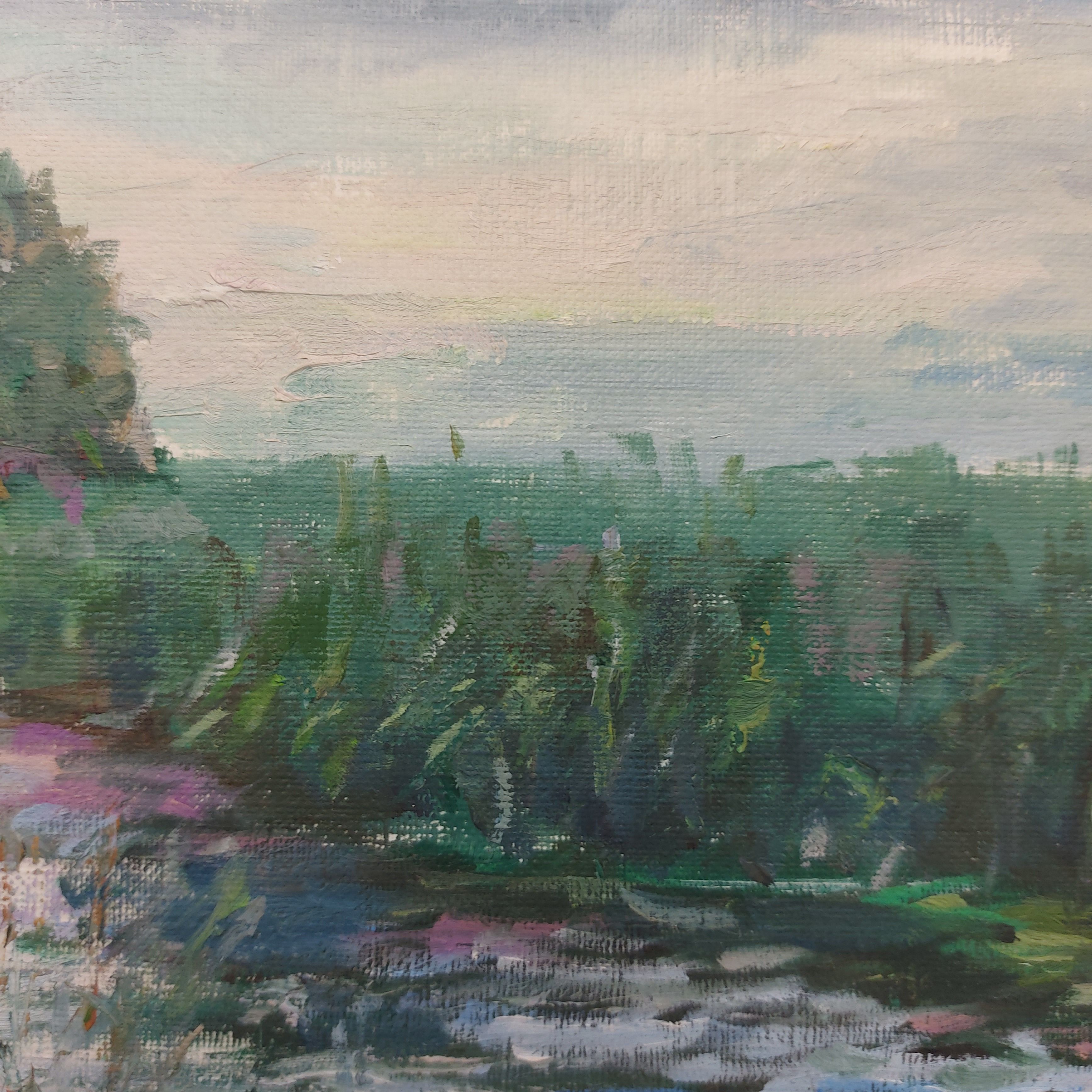 На картине мы видим пейзаж с берегом реки, протекающий через природный ландшафт. На переднем плане кусты и деревья с различными оттенками зеленого и фиолетового. Солнечный свет проникает сквозь листву, создавая яркие блики и тени. Вода отражает небо и окружающую растительность, благодаря чему возникает эффект зеркального отражения разнообразия цветов и света. На заднем плане можно увидеть линию горизонта с более темными деревьями. Небо выглядит спокойным с мягкими переходами от голубого к серым и белым оттенкам, предчувствуя наступление вечера. Общее впечатление от картины - это спокойная, пленительная атмосфера уединенного уголка природы.