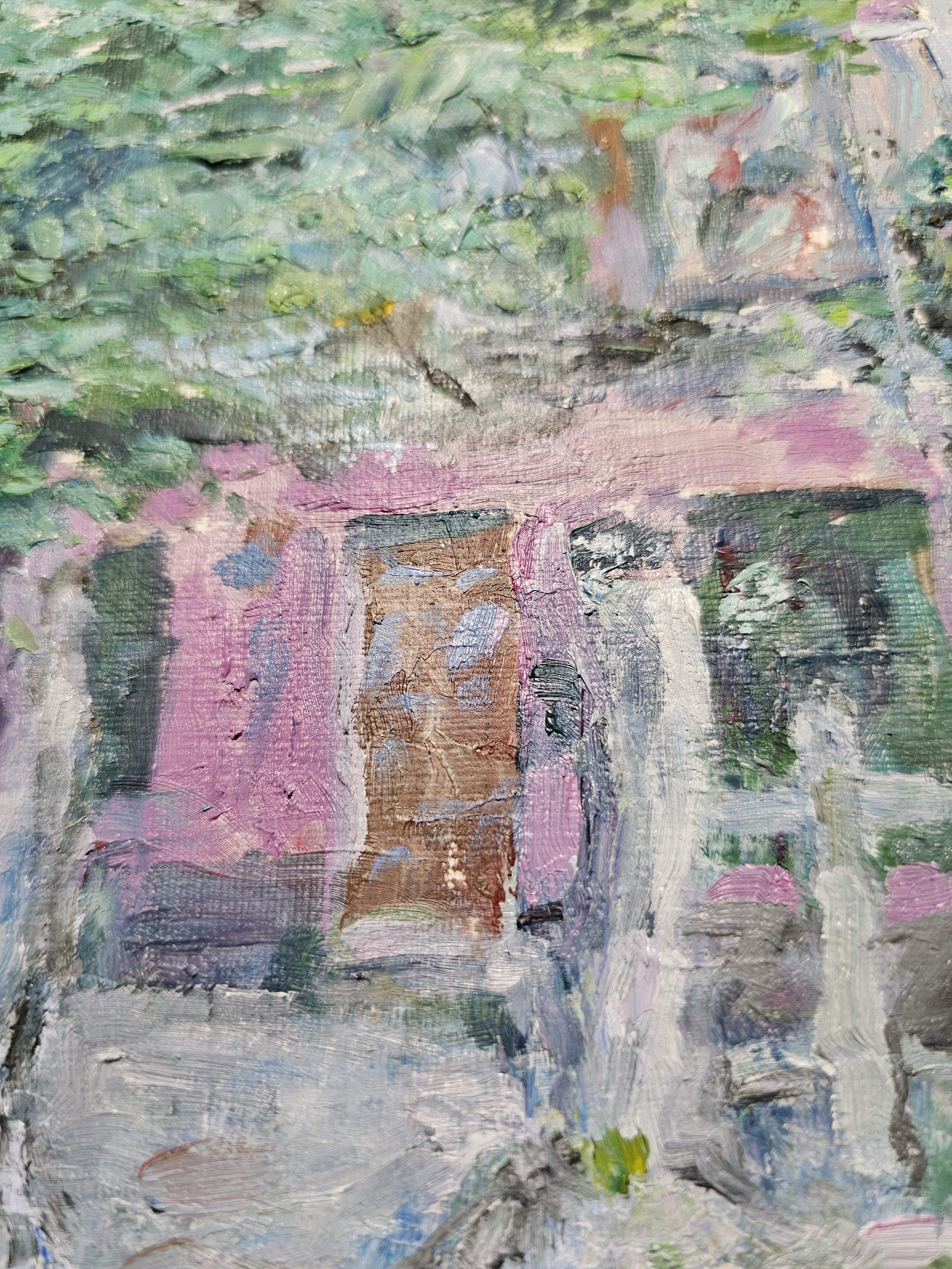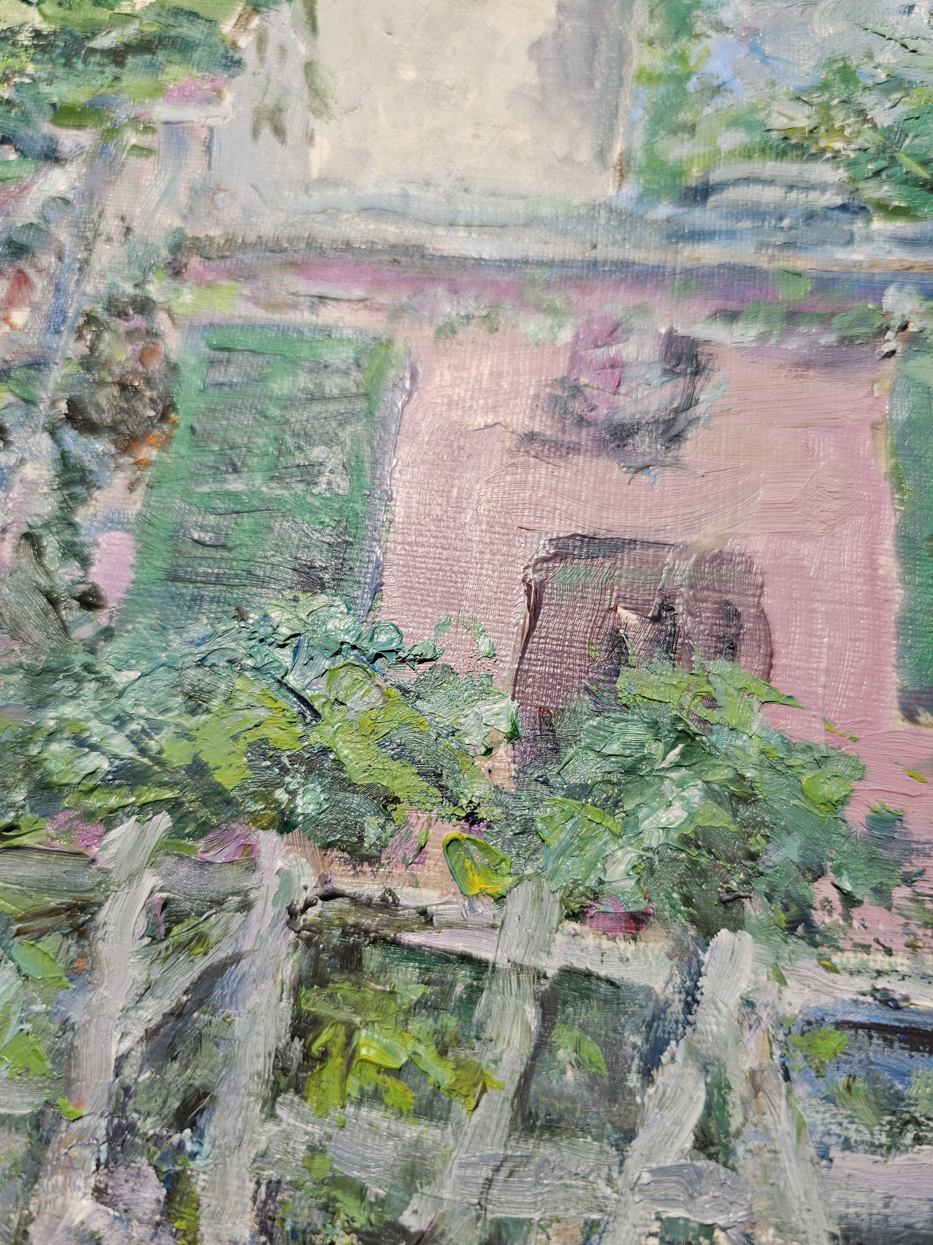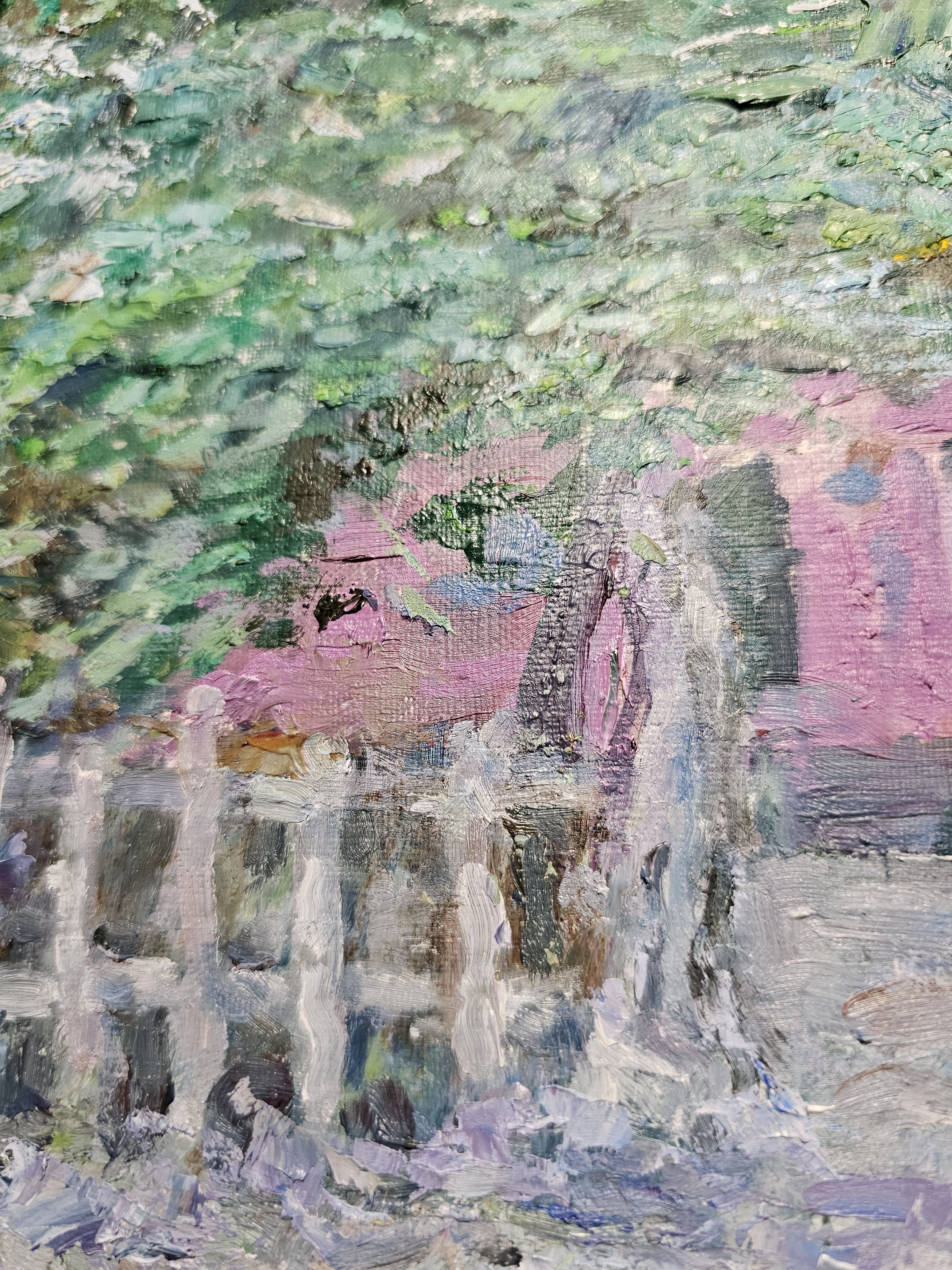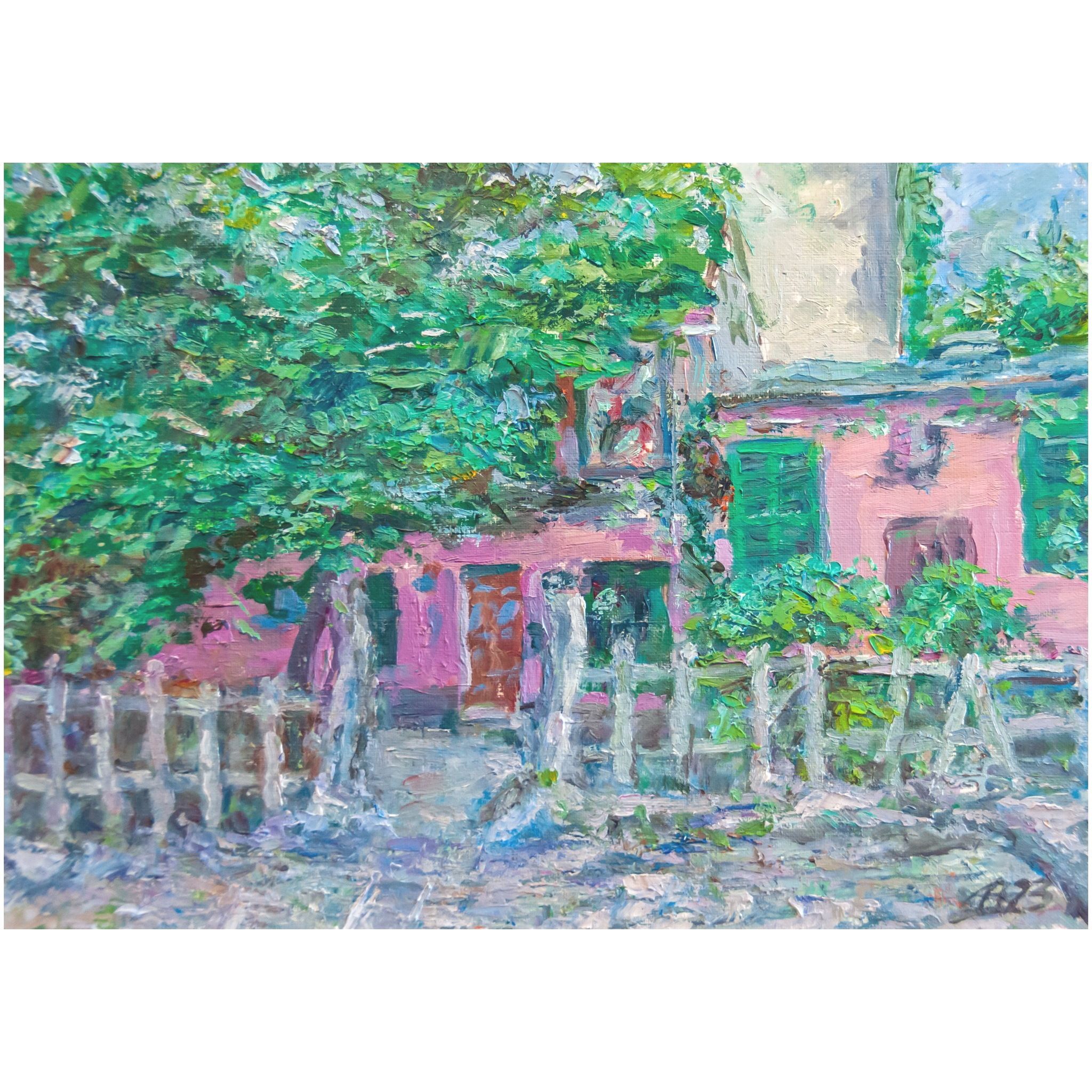 Перед нами представлена живописная картина, выполненная, масляными красками. Она изображает зеленый пейзаж с розовым домом в центре. Дом слегка прикрыт густой зеленью деревьев и кустарников. На переднем плане видны чёткие вертикальные элементы, которые могут быть частью забора. Цветовая гамма картины включает различные оттенки зелёного, розового, синего и белого. Стиль изображения экспрессивен, с сильными мазками и насыщенными красками, что придаёт сцене динамичность и живость.