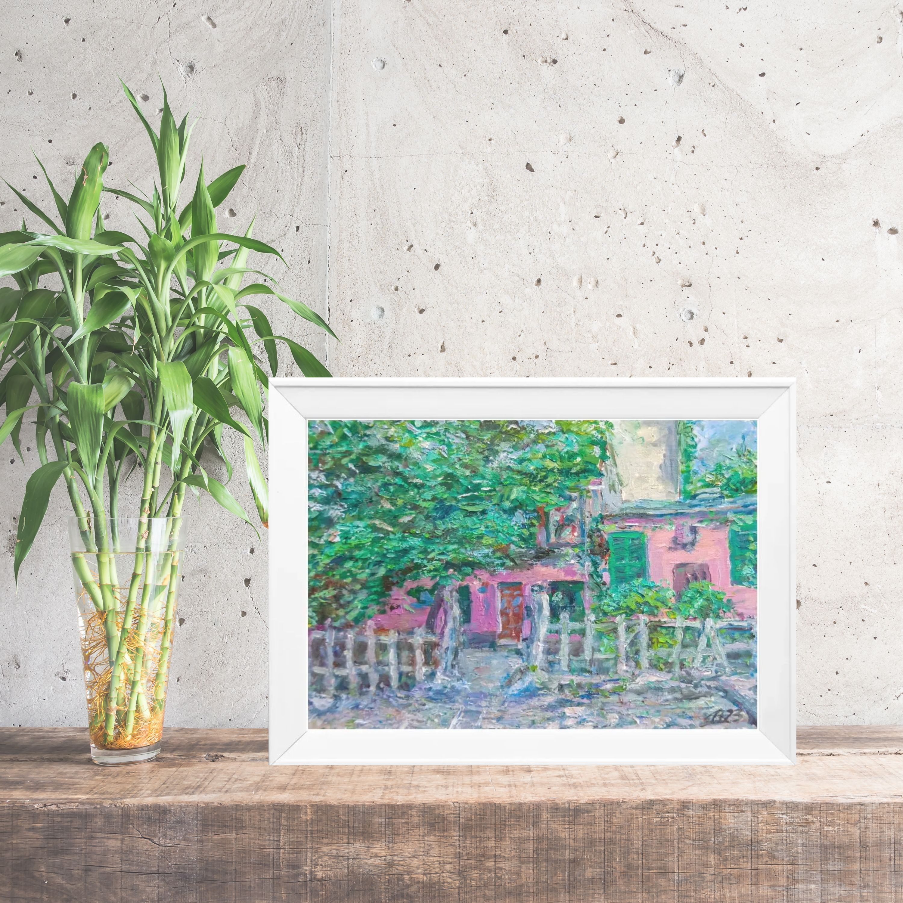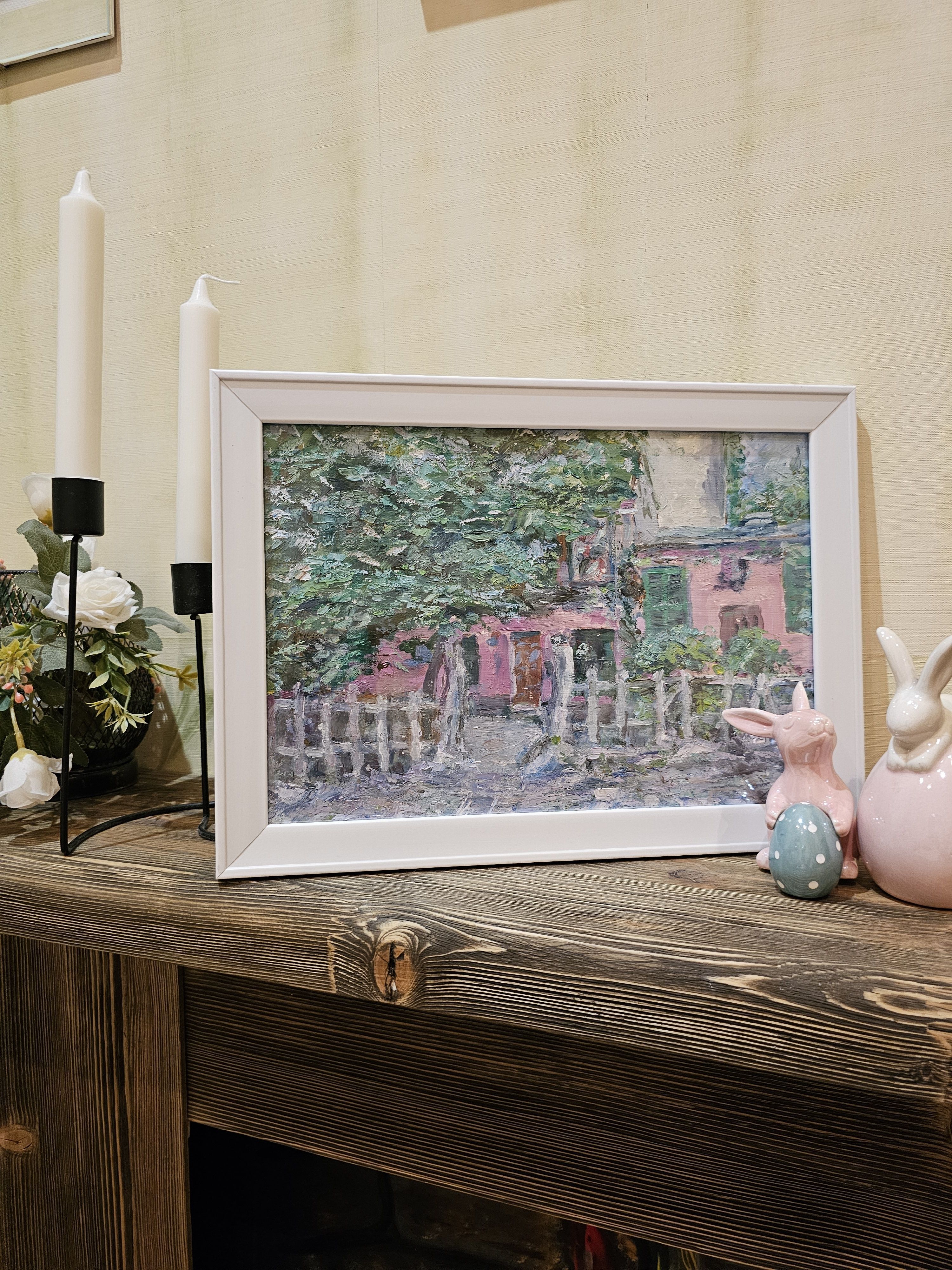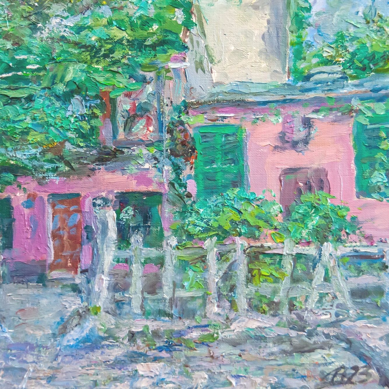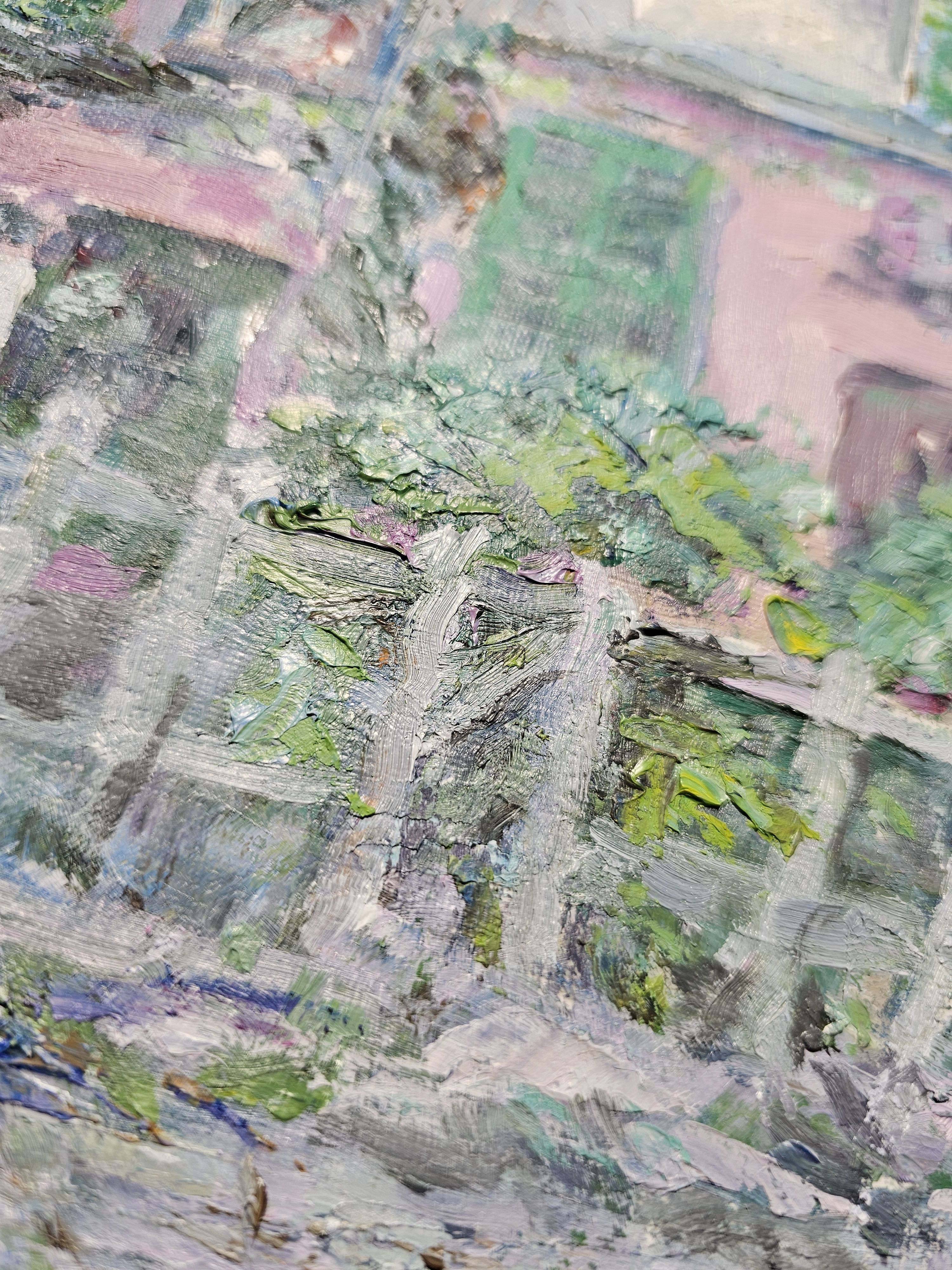 Перед нами представлена живописная картина, выполненная, масляными красками. Она изображает зеленый пейзаж с розовым домом в центре. Дом слегка прикрыт густой зеленью деревьев и кустарников. На переднем плане видны чёткие вертикальные элементы, которые могут быть частью забора. Цветовая гамма картины включает различные оттенки зелёного, розового, синего и белого. Стиль изображения экспрессивен, с сильными мазками и насыщенными красками, что придаёт сцене динамичность и живость.