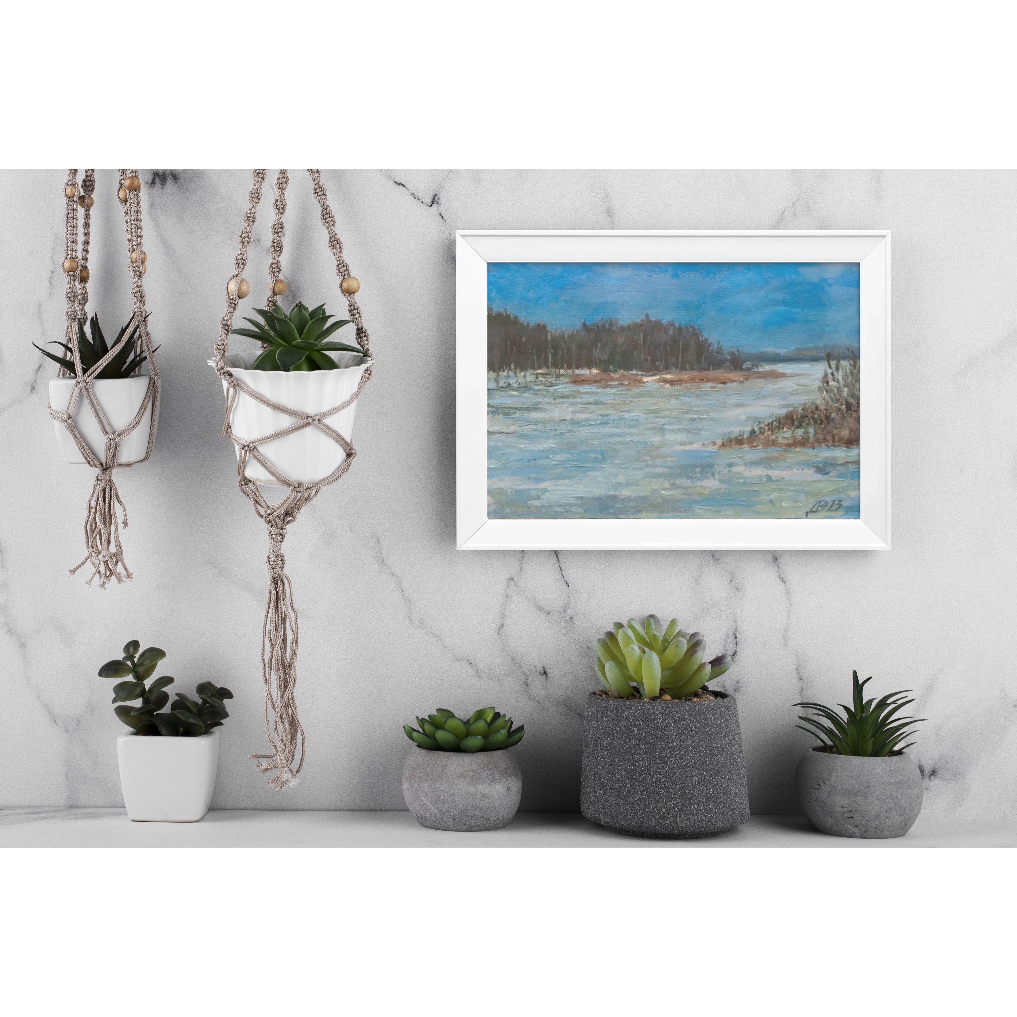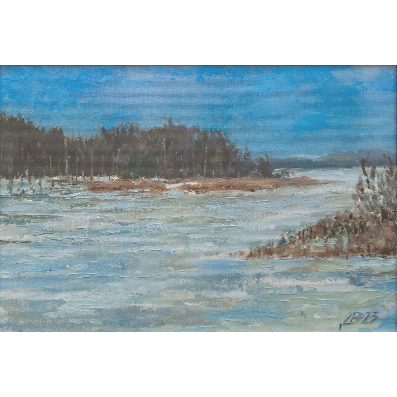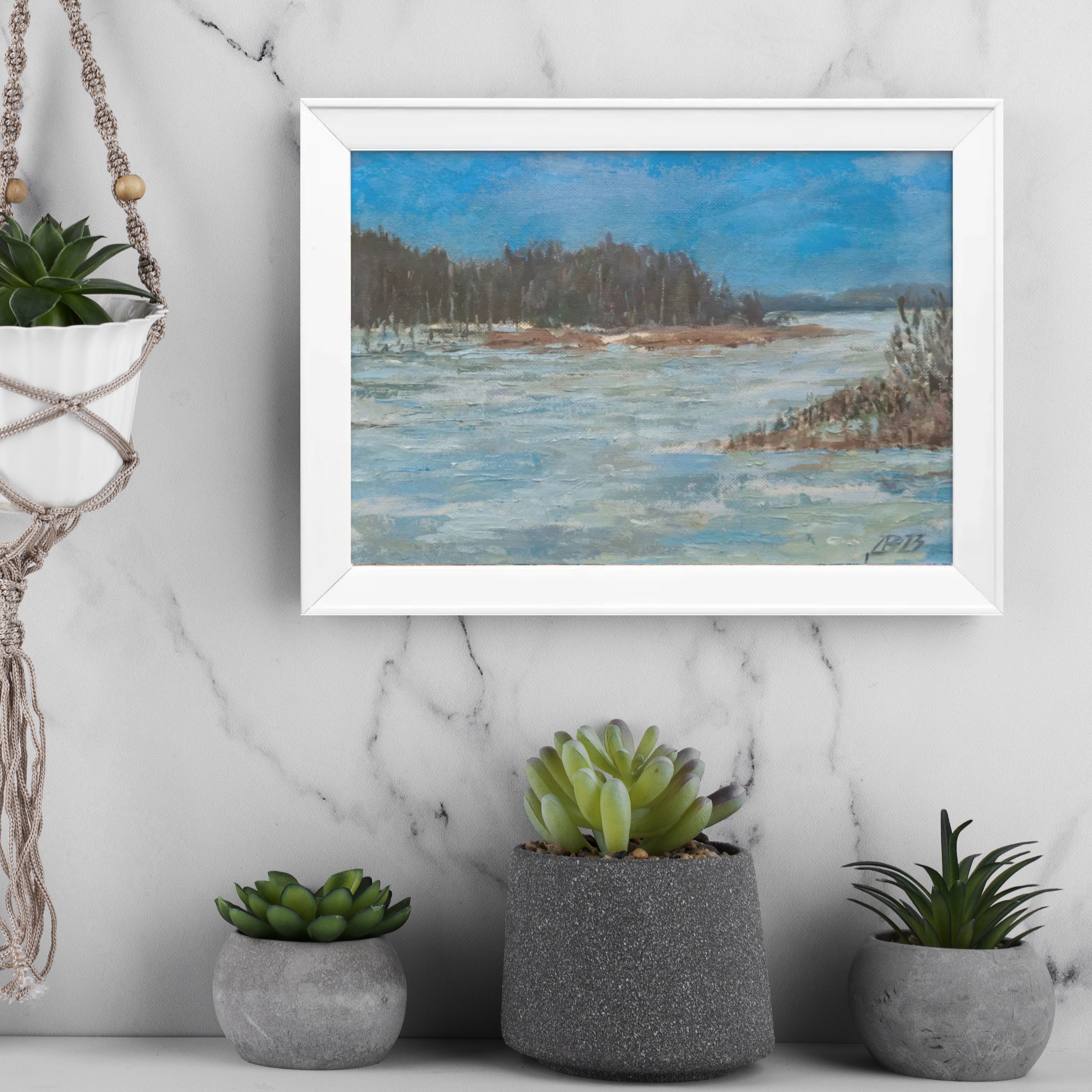 На картине мы видим речной пейзаж, выполненный масляными красками на холсте. Картина оформлена в простую белую раму. На переднем плане изображены замерзшие или заснеженные камни и кустарник, выполненные в холодных тонах, с преобладанием белого и голубого цветов с добавлением коричневых и зеленых мазков, что создаёт ощущение мороза.