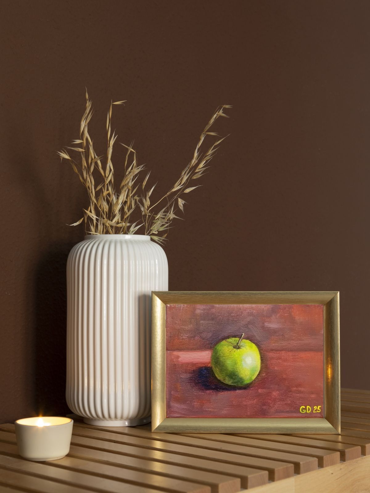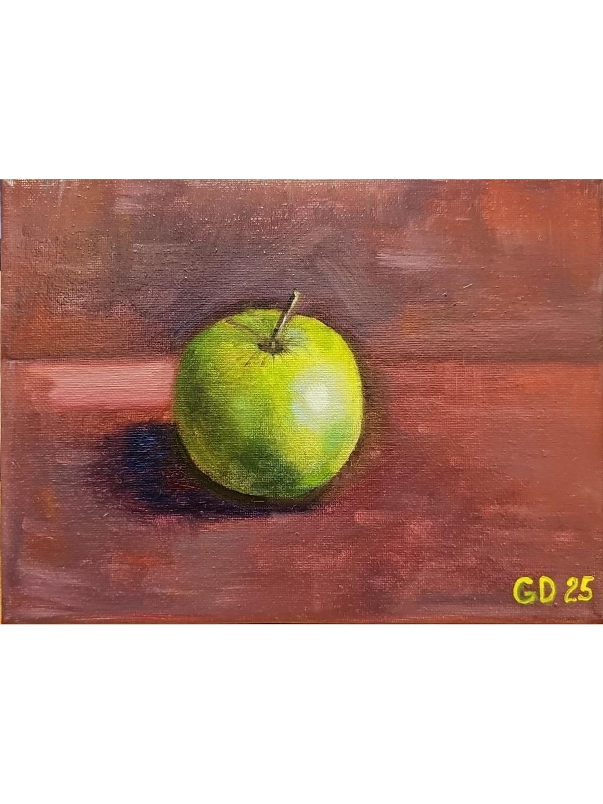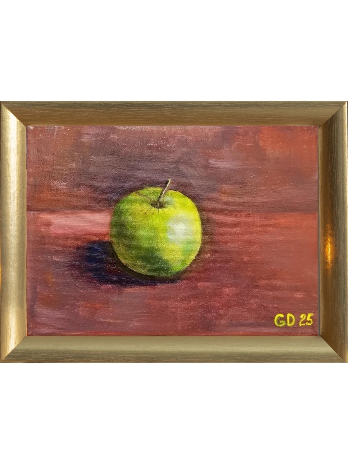 Нам представлена картина с изображением зеленого яблока, лежащее на поверхности с коричнево-бордовым оттенком, возможно столе. Яблоко расположено в центре композиции и освещено так, что виден отблеск света сверху. Фон не содержит детализированных элементов и выполнен в темных приглушенных тонах. В правом нижнем углу добавлена подпись художника