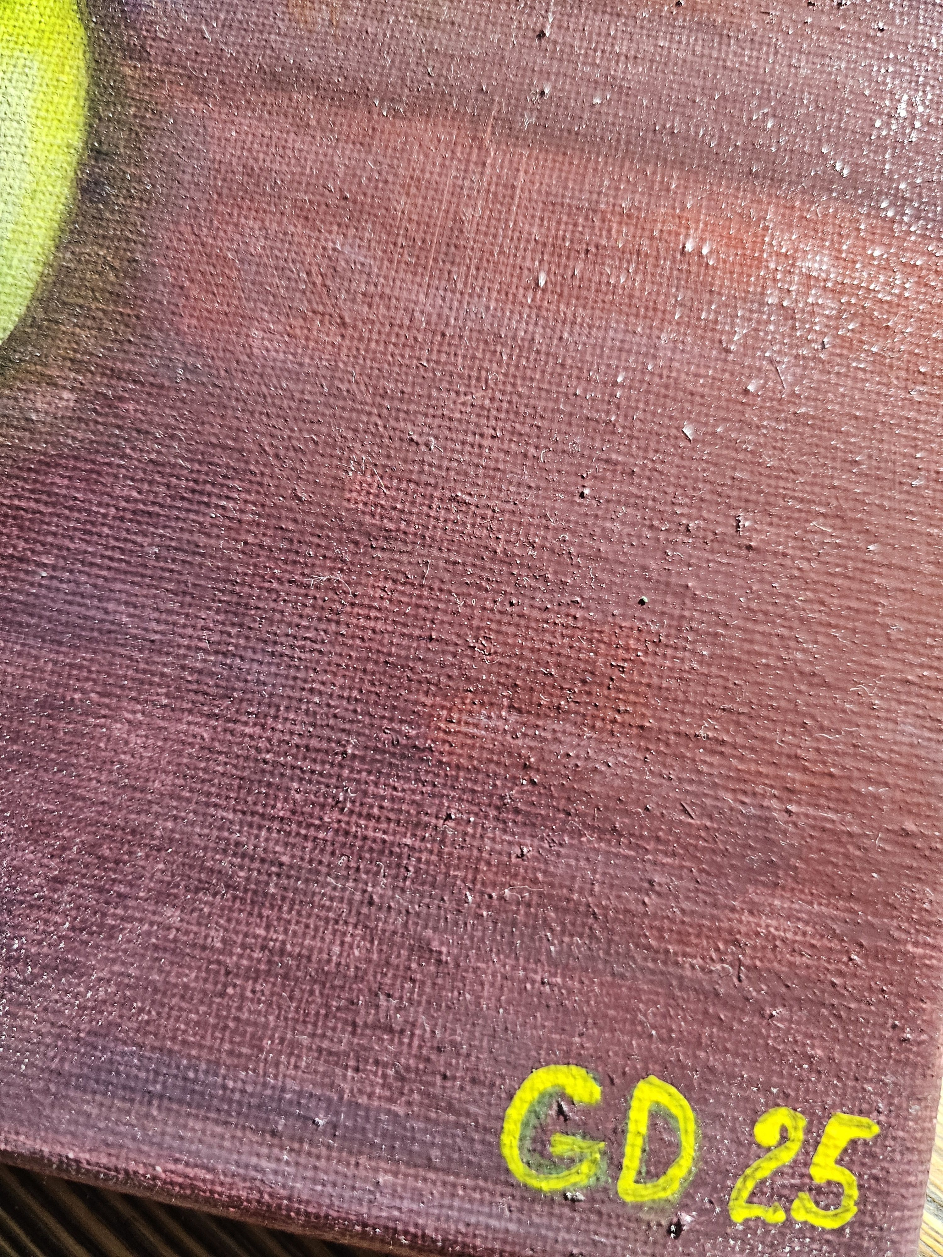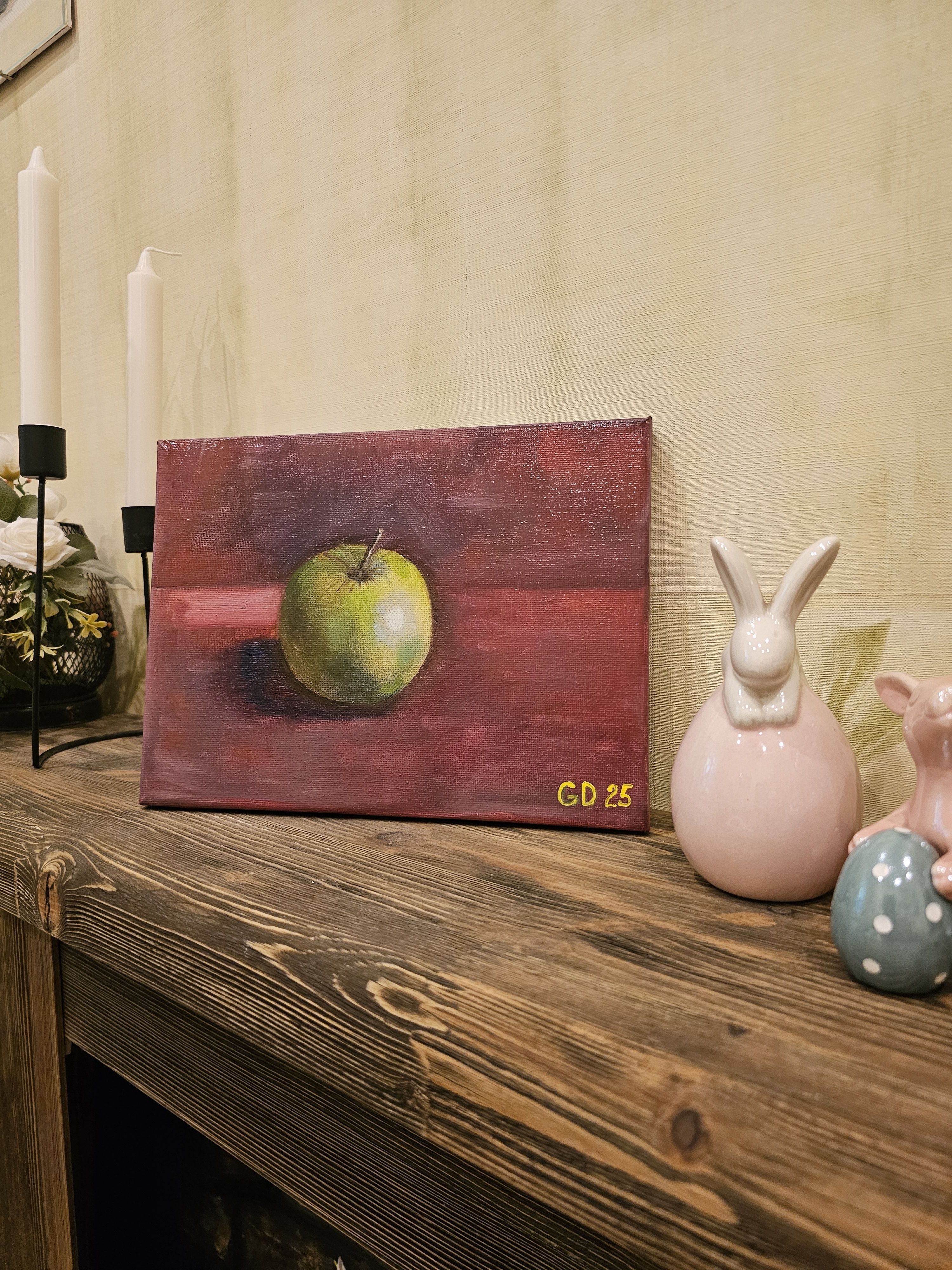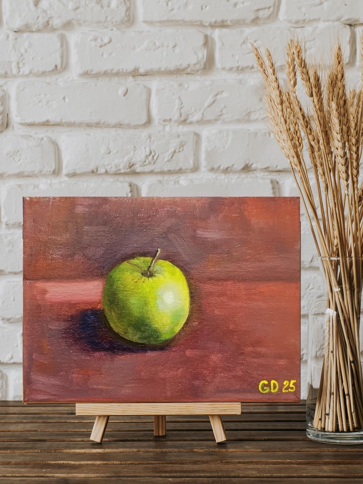 Нам представлена картина с изображением зеленого яблока, лежащее на поверхности с коричнево-бордовым оттенком, возможно столе. Яблоко расположено в центре композиции и освещено так, что виден отблеск света сверху. Фон не содержит детализированных элементов и выполнен в темных приглушенных тонах. В правом нижнем углу добавлена подпись художника