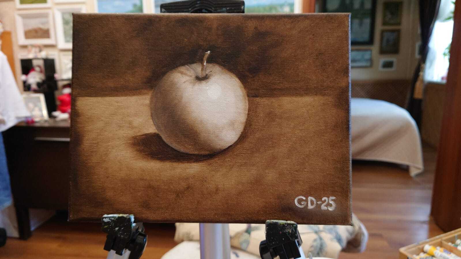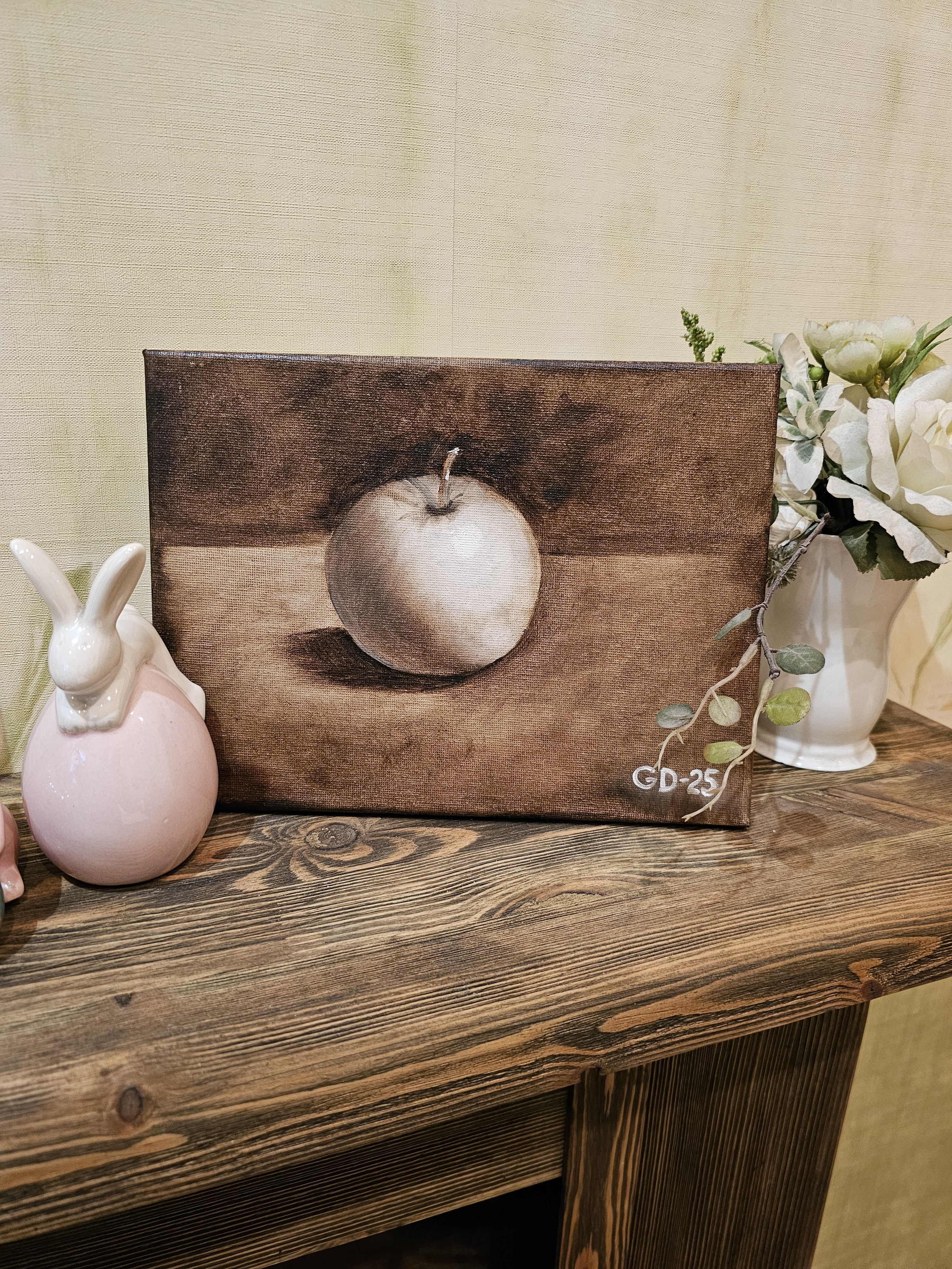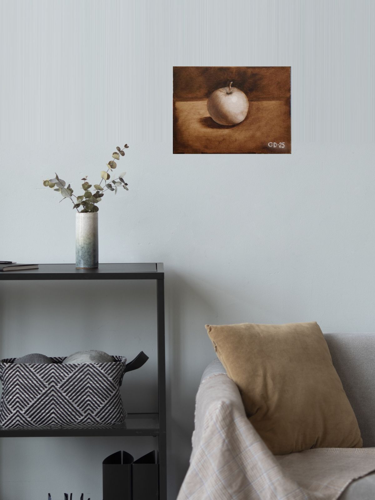 Нам представлена сепия - картина с изображением яблока. Яблоко расположено в центре композиции и имеет светлые и темные тона, что создает объем и реалистичность. Фон выполнен в теплых коричневых оттенках. Картина выполнена в минималистичном стиле с акцентом на свет и тень. Внизу подпись художника "GD-25".