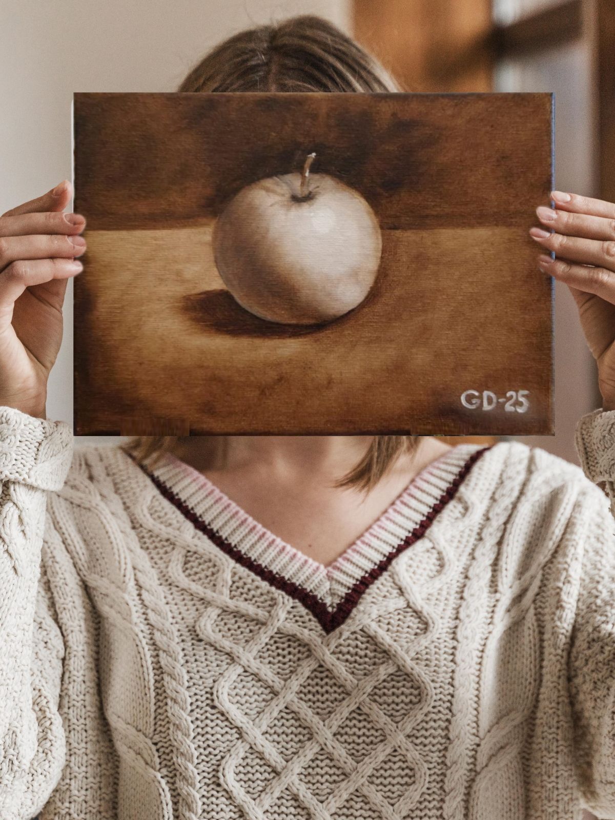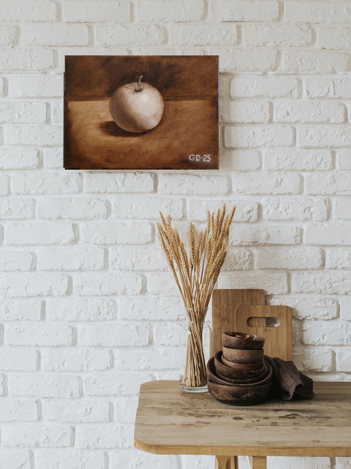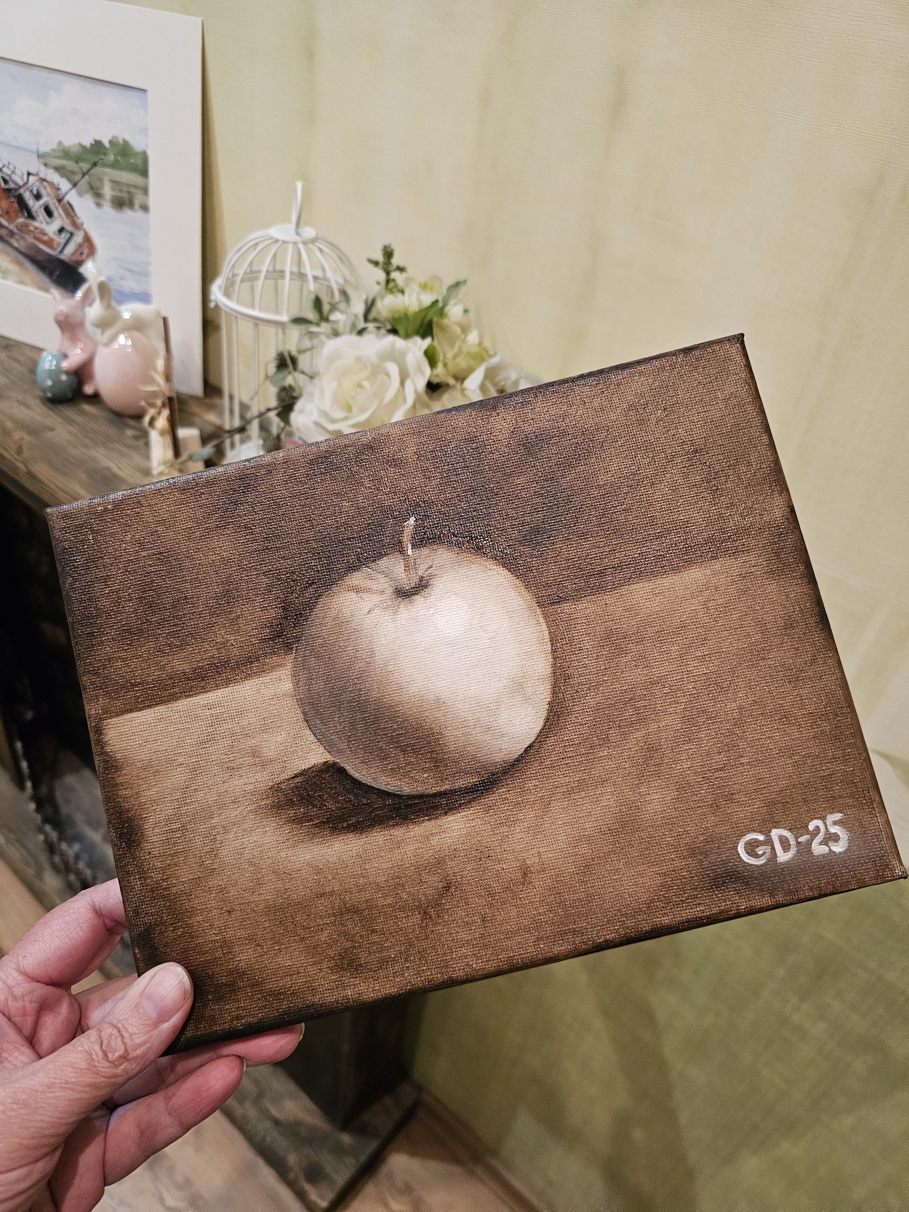 Нам представлена сепия - картина с изображением яблока. Яблоко расположено в центре композиции и имеет светлые и темные тона, что создает объем и реалистичность. Фон выполнен в теплых коричневых оттенках. Картина выполнена в минималистичном стиле с акцентом на свет и тень. Внизу подпись художника "GD-25".