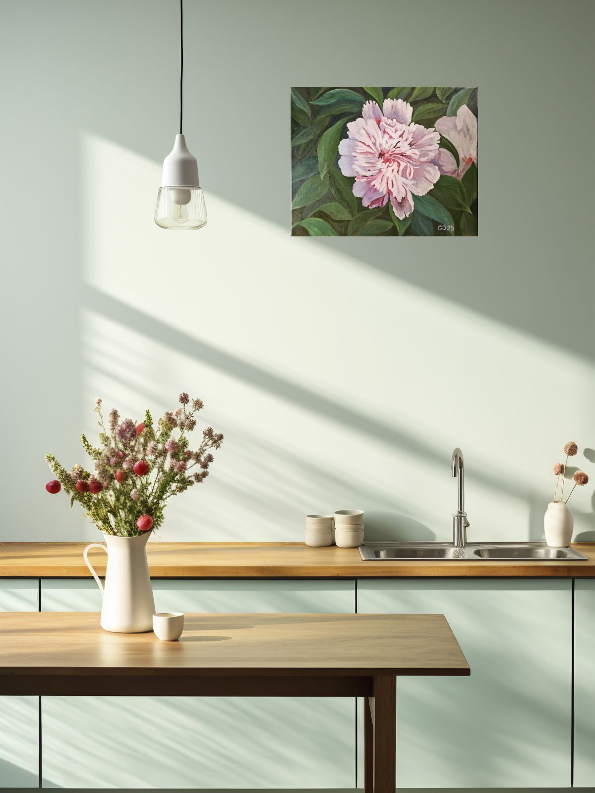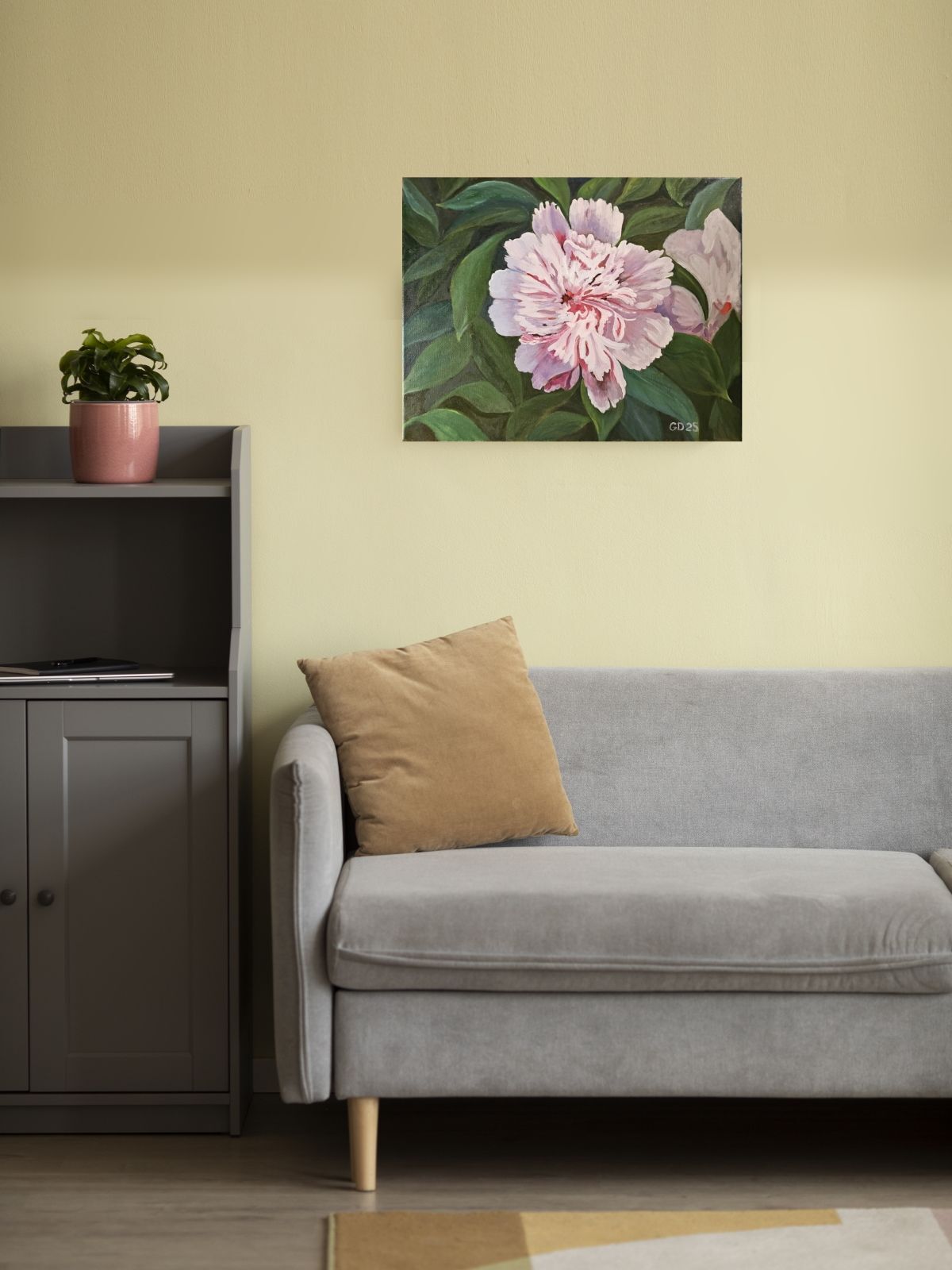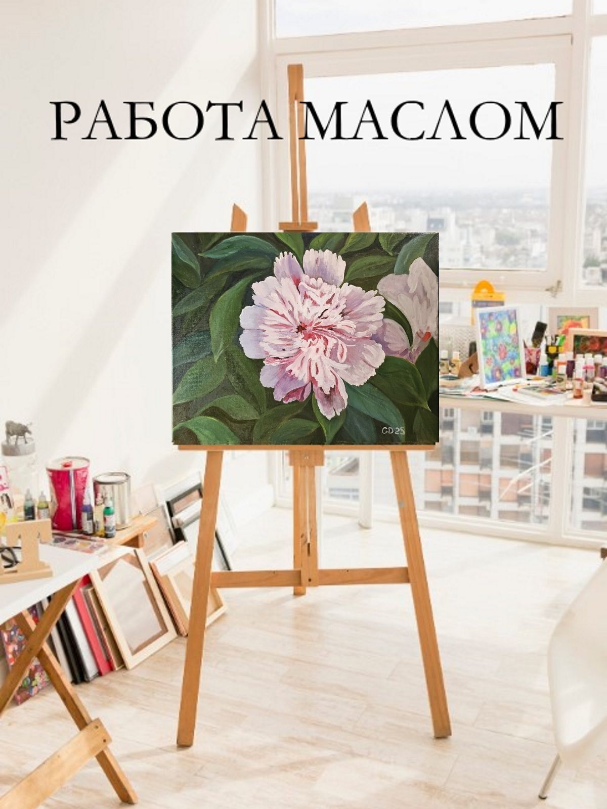 Нам представлена художественная картина маслом на которой изображен пион. Цветок пышный, с белыми и розовыми лепестками, смотрится очень живописно. Он окружен зелеными листьями, создающими контраст и подчеркивающими красоту цветка. На картине также видны инициалы "GD25", указывающие на художника и год создания работы.