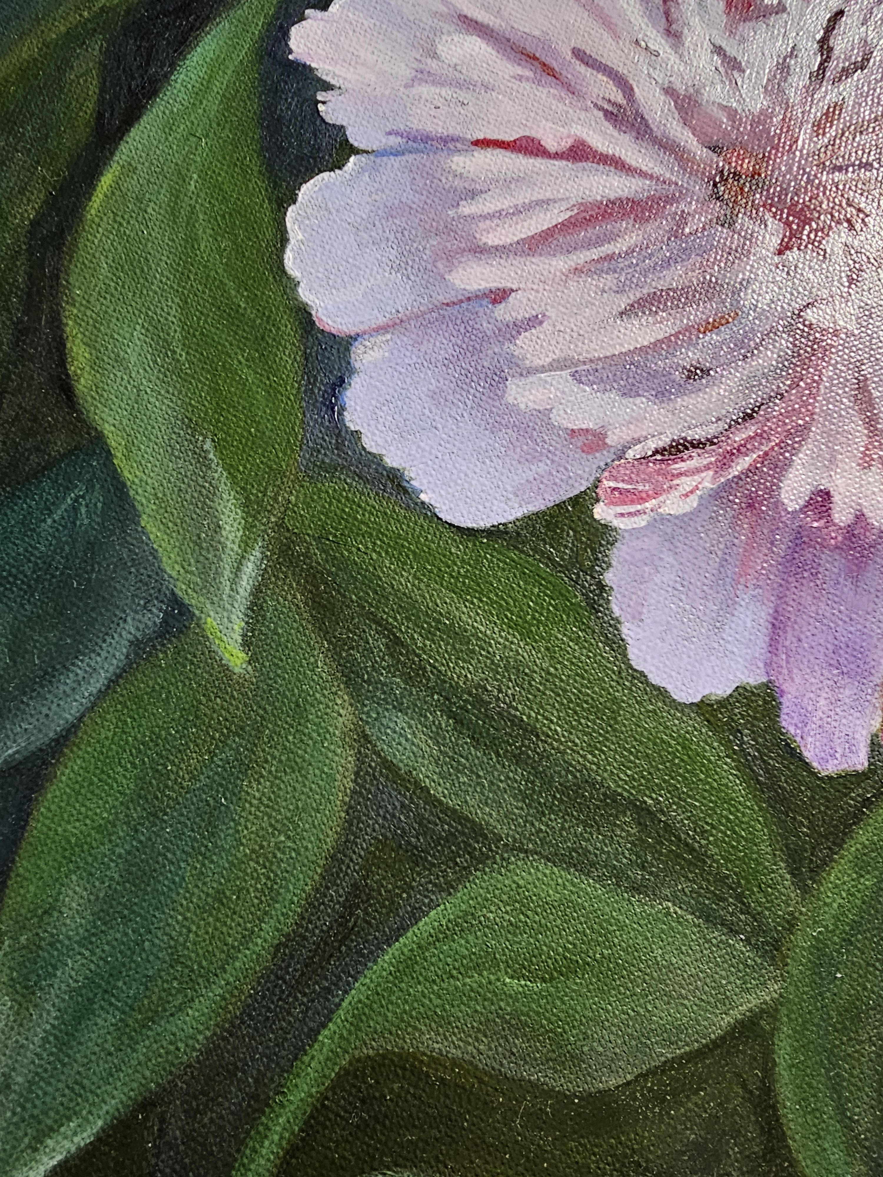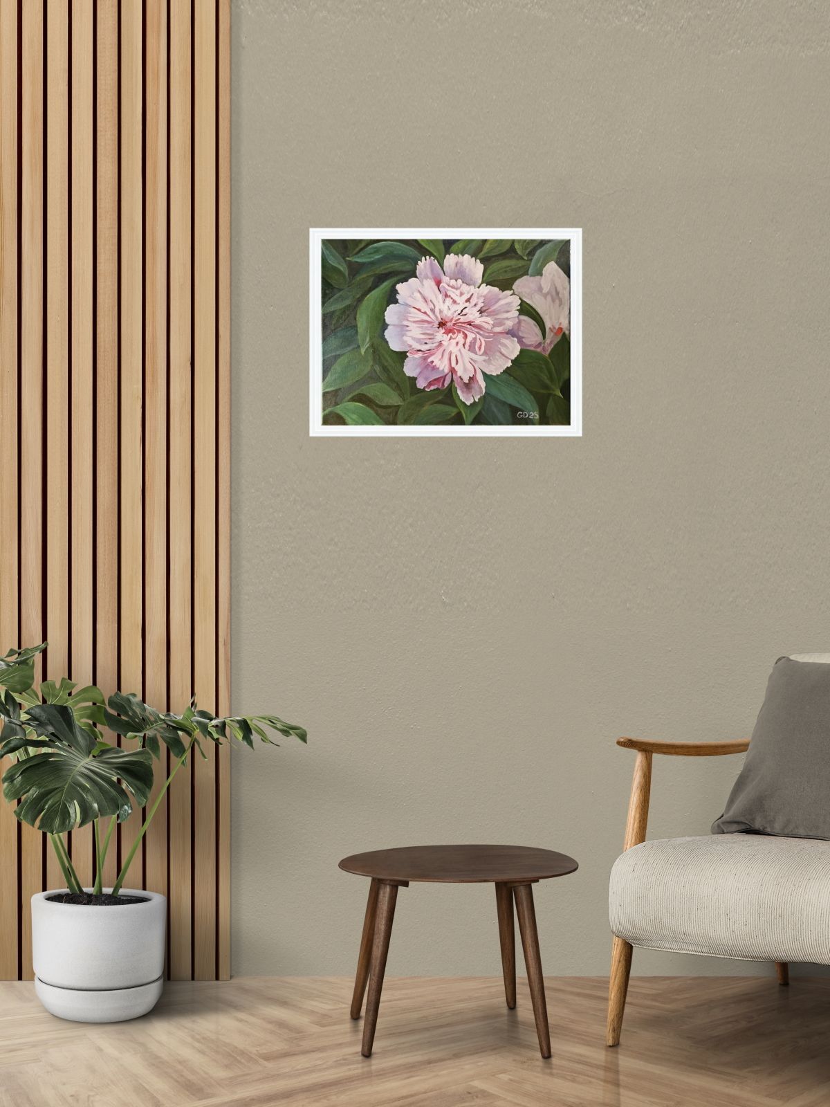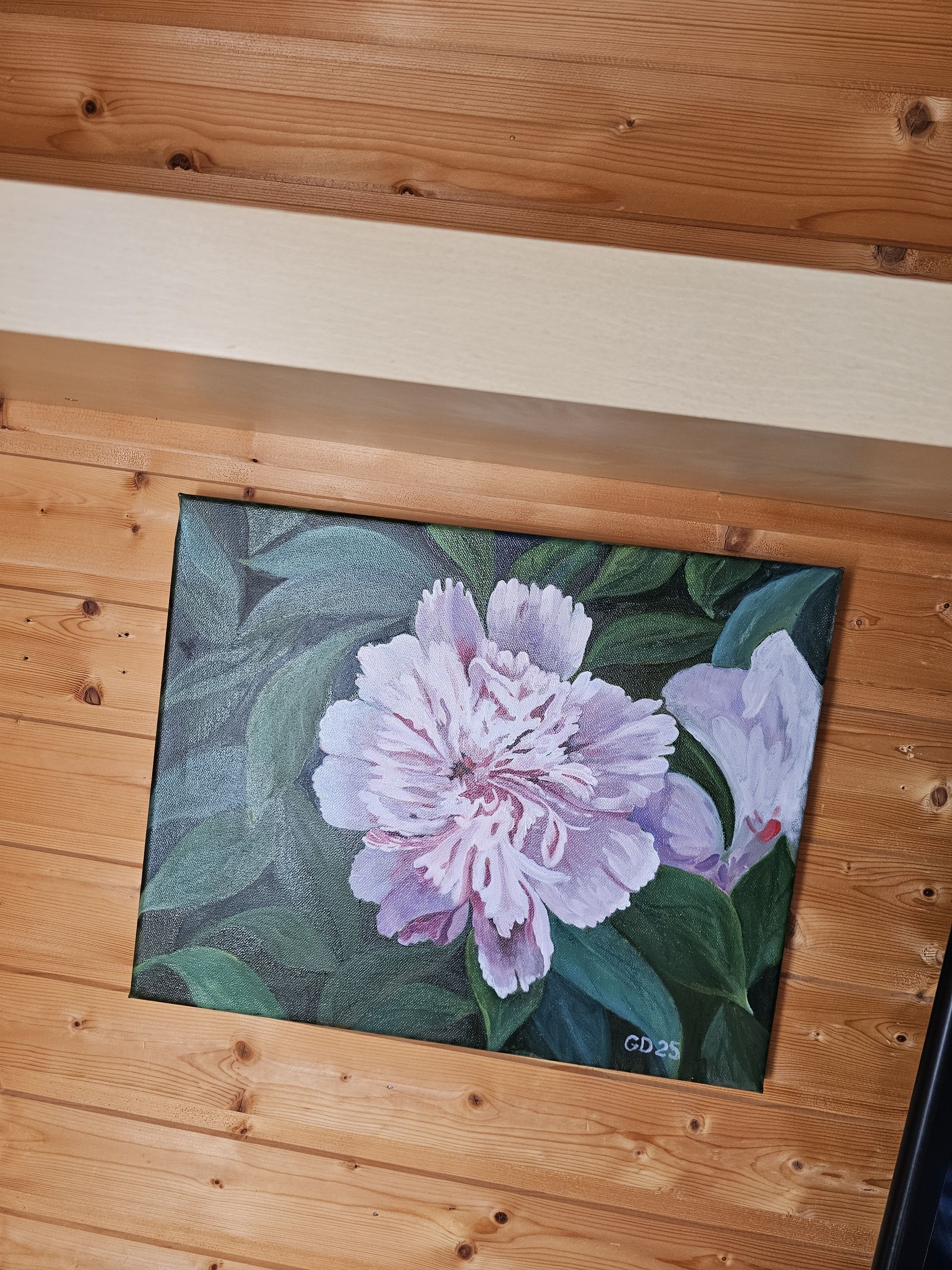 Нам представлена художественная картина маслом на которой изображен пион. Цветок пышный, с белыми и розовыми лепестками, смотрится очень живописно. Он окружен зелеными листьями, создающими контраст и подчеркивающими красоту цветка. На картине также видны инициалы "GD25", указывающие на художника и год создания работы.