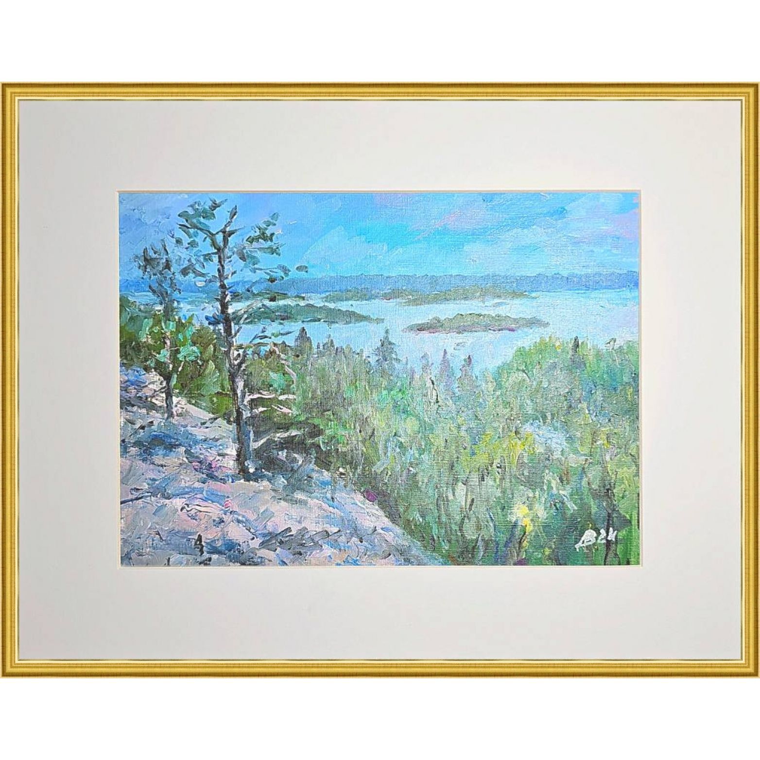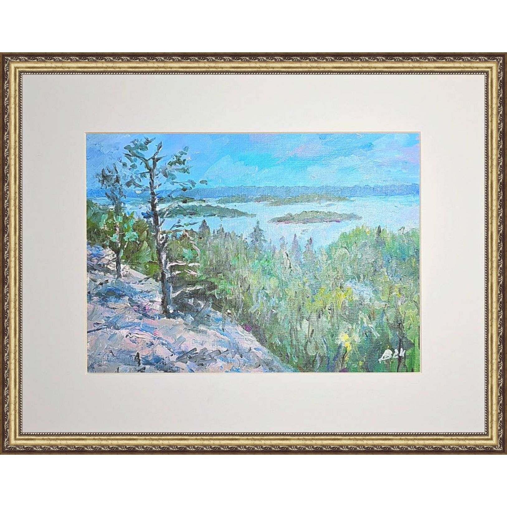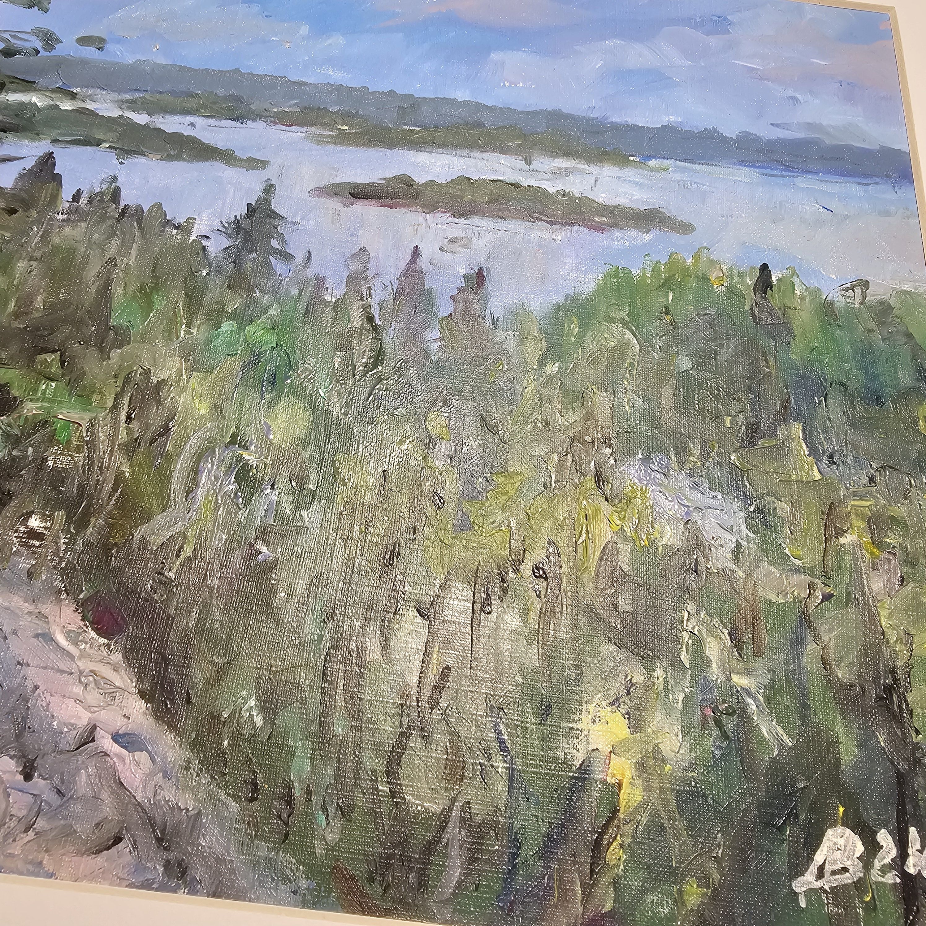 Нам представлена картина, выполненная масляными красками. Картина изображает природный пейзаж с видом на Ладогу, вокруг которого располагаются острова. На переднем плане произведения изображены деревья и кустарники зелёного цвета. Также заметен скалистый участок земли слева, покрытый растительностью. На заднем плане четко видна линия горизонта, где небо встречается с водой, а небеса окрашены в голубые и нежно-розовые цвета.