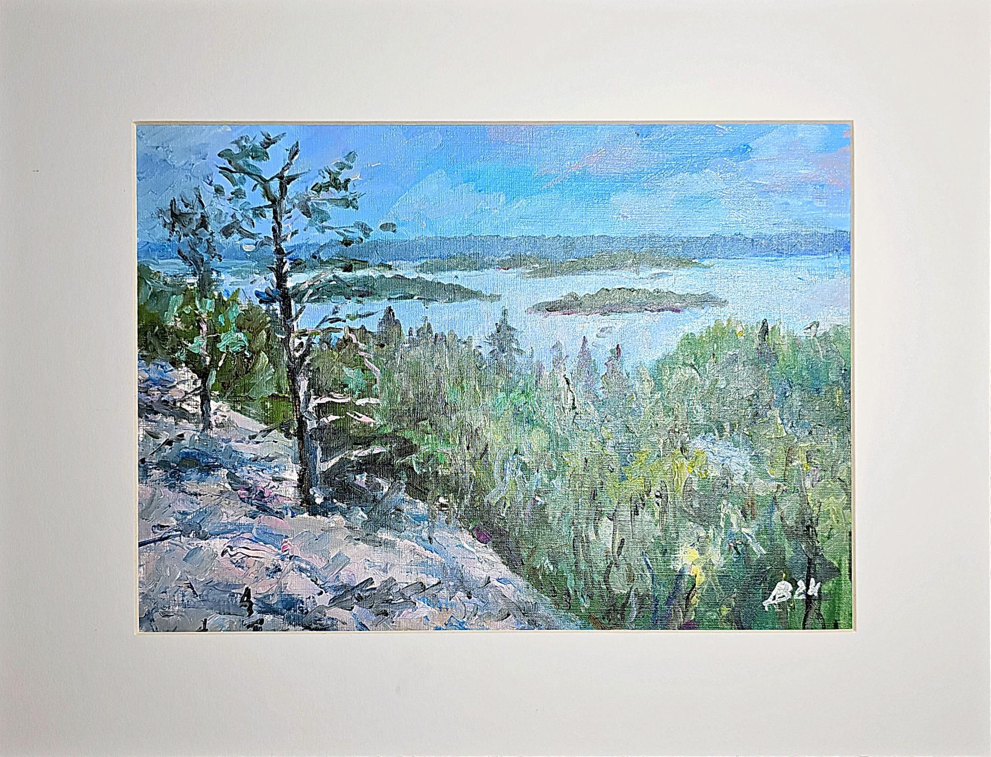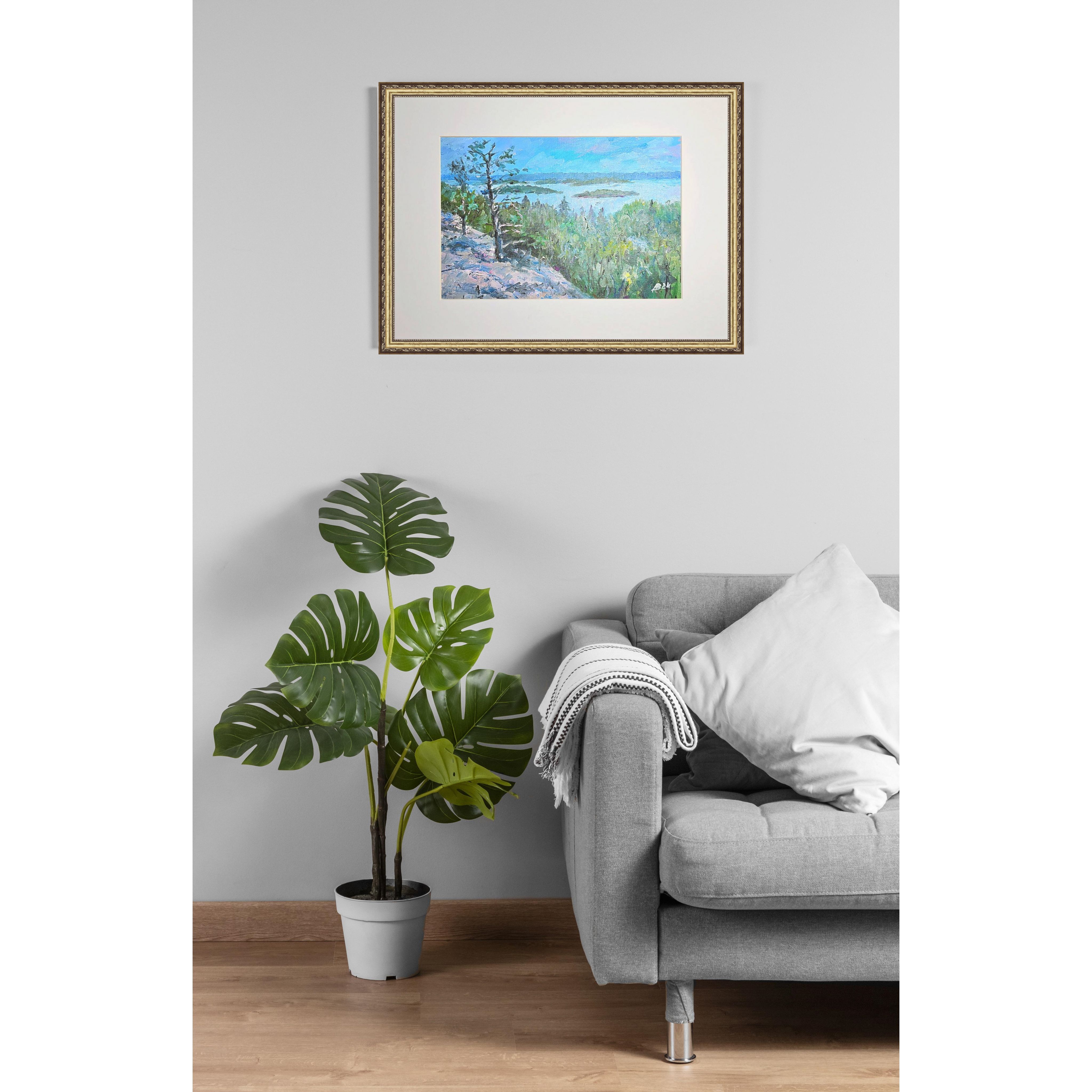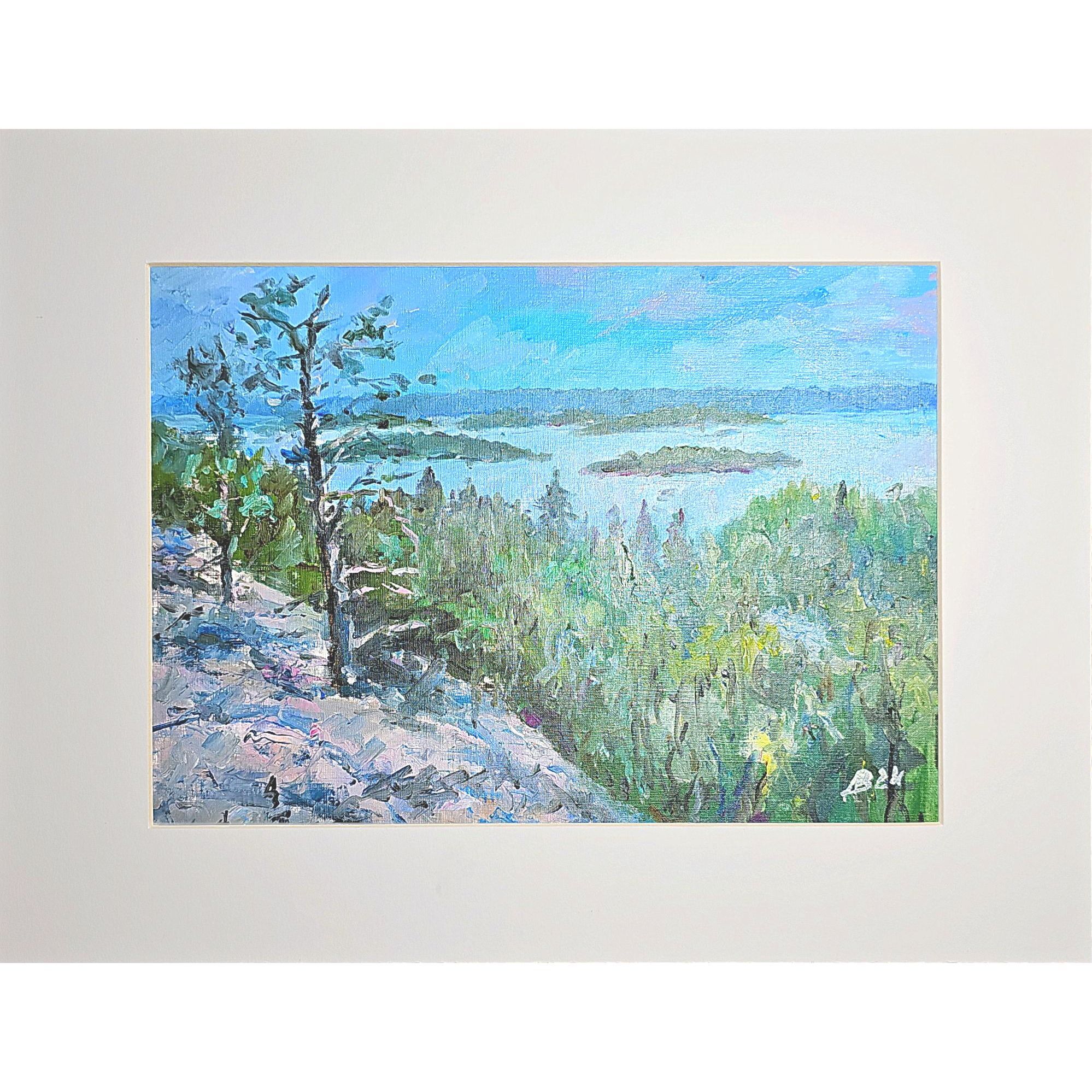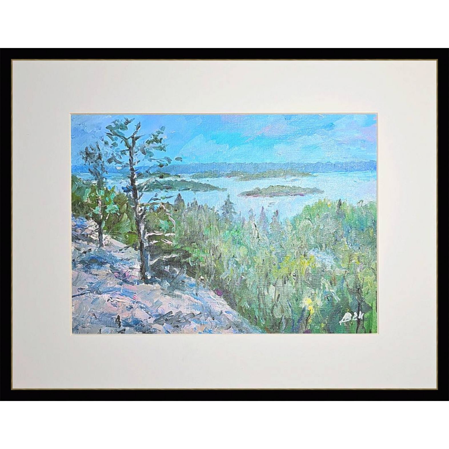 Нам представлена картина, выполненная масляными красками. Картина изображает природный пейзаж с видом на Ладогу, вокруг которого располагаются острова. На переднем плане произведения изображены деревья и кустарники зелёного цвета. Также заметен скалистый участок земли слева, покрытый растительностью. На заднем плане четко видна линия горизонта, где небо встречается с водой, а небеса окрашены в голубые и нежно-розовые цвета.