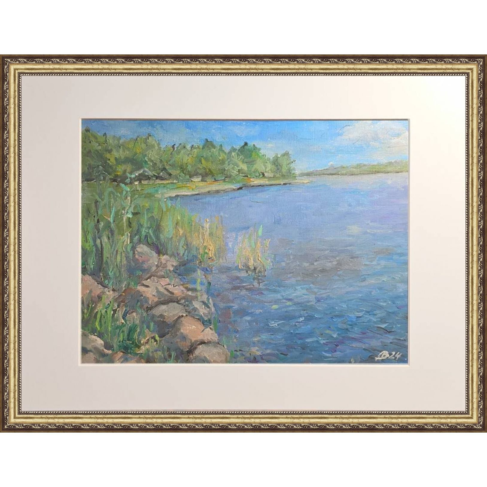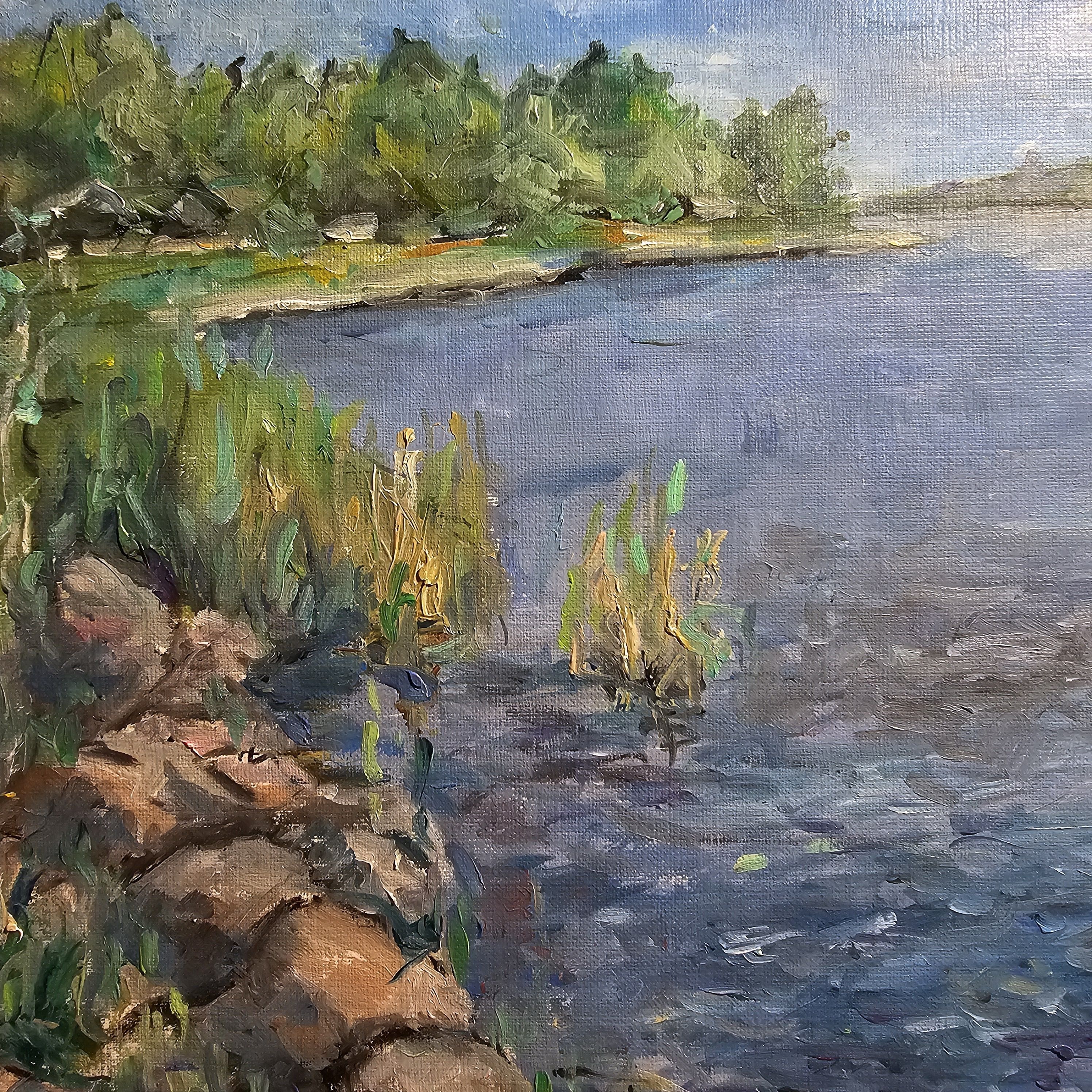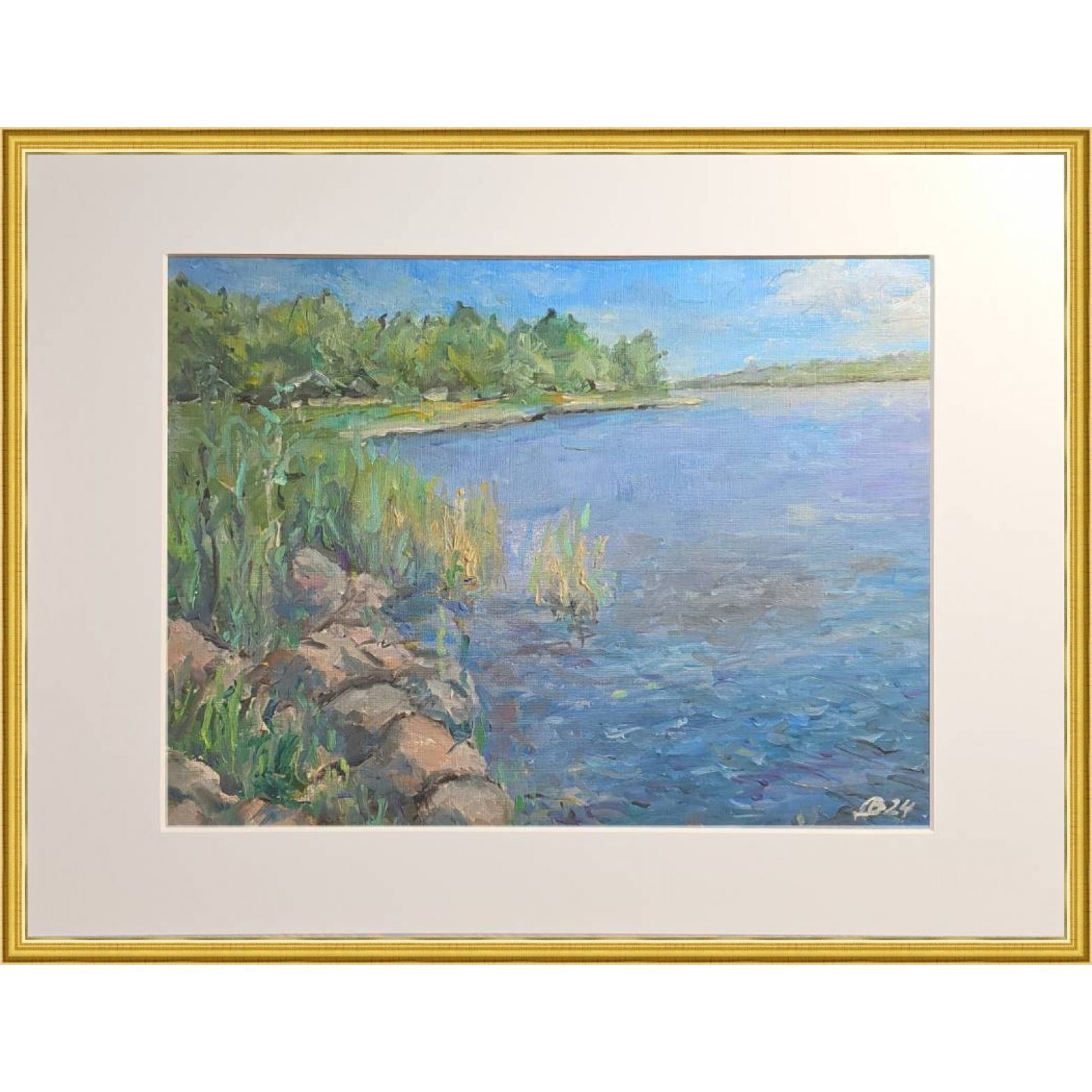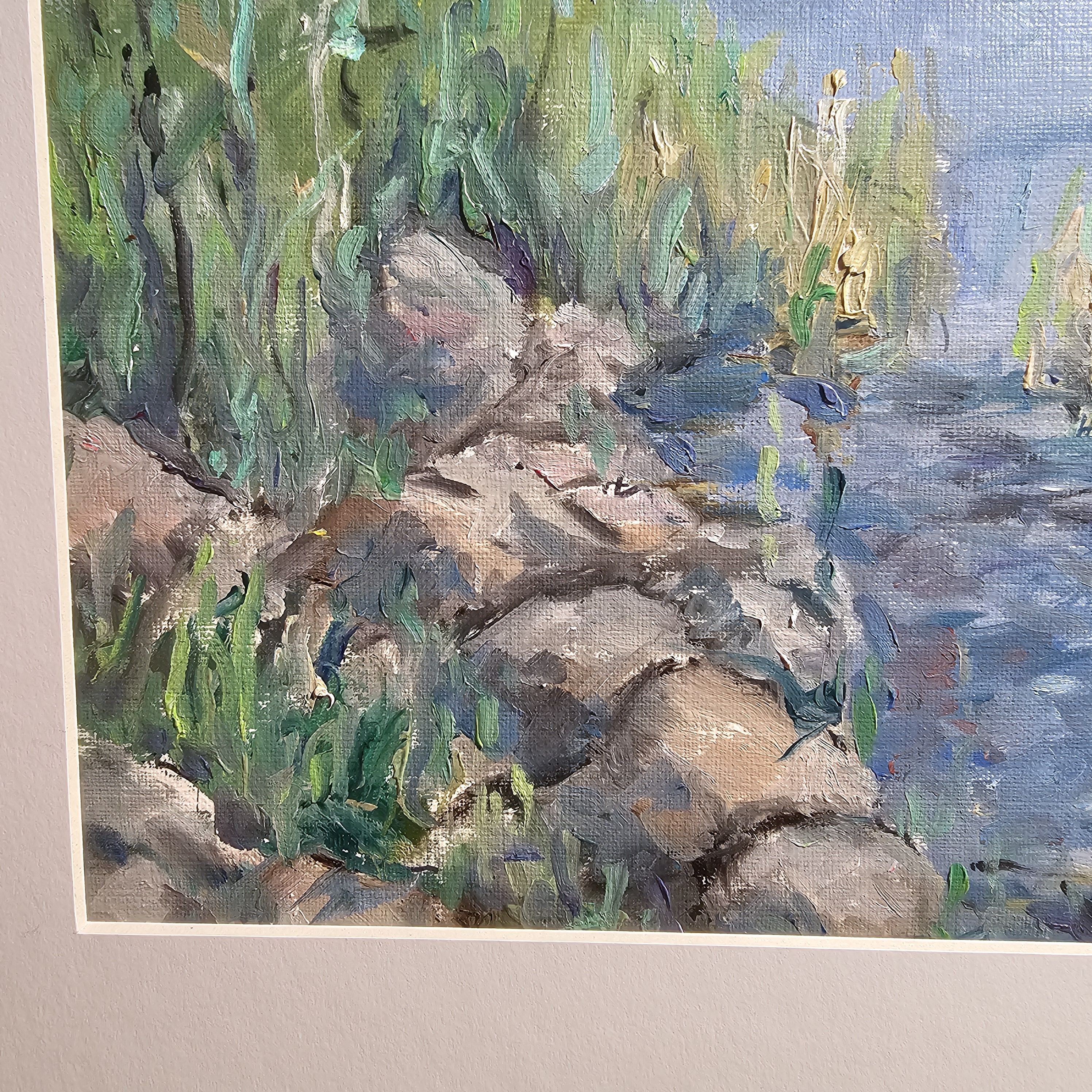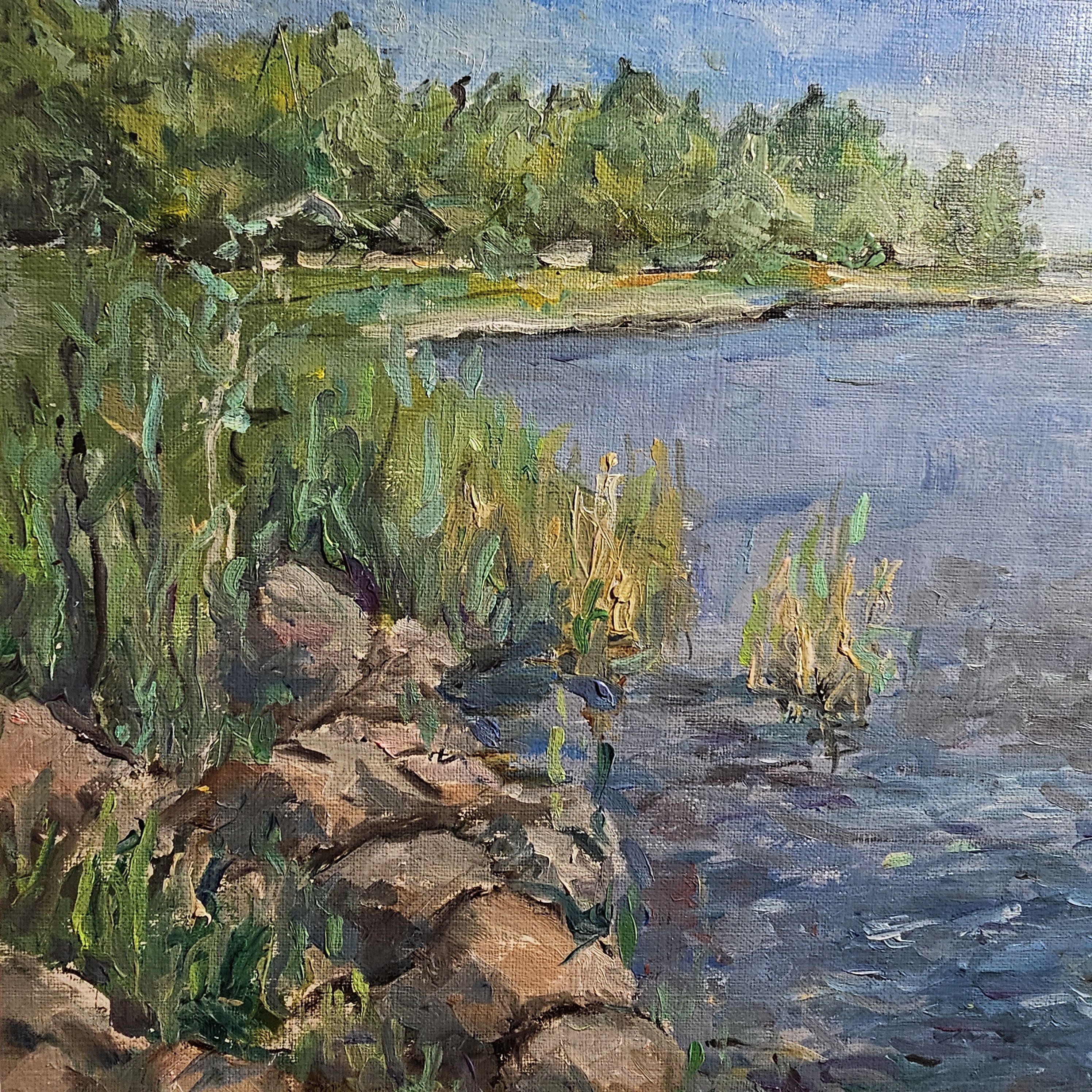 Нам представлена живописная картина с изображением природного пейзажа. Справа расположен водоём с ясной голубой водой, а слева находятся зелёные кусты и деревья. Вдоль берега видны камни и тростник. Над горизонтом виднеется ясное голубое небо с мелкими белыми облаками. Картина выполнена в светлых и жизнерадостных тонах, передавая атмосферу спокойствия и природной красоты.