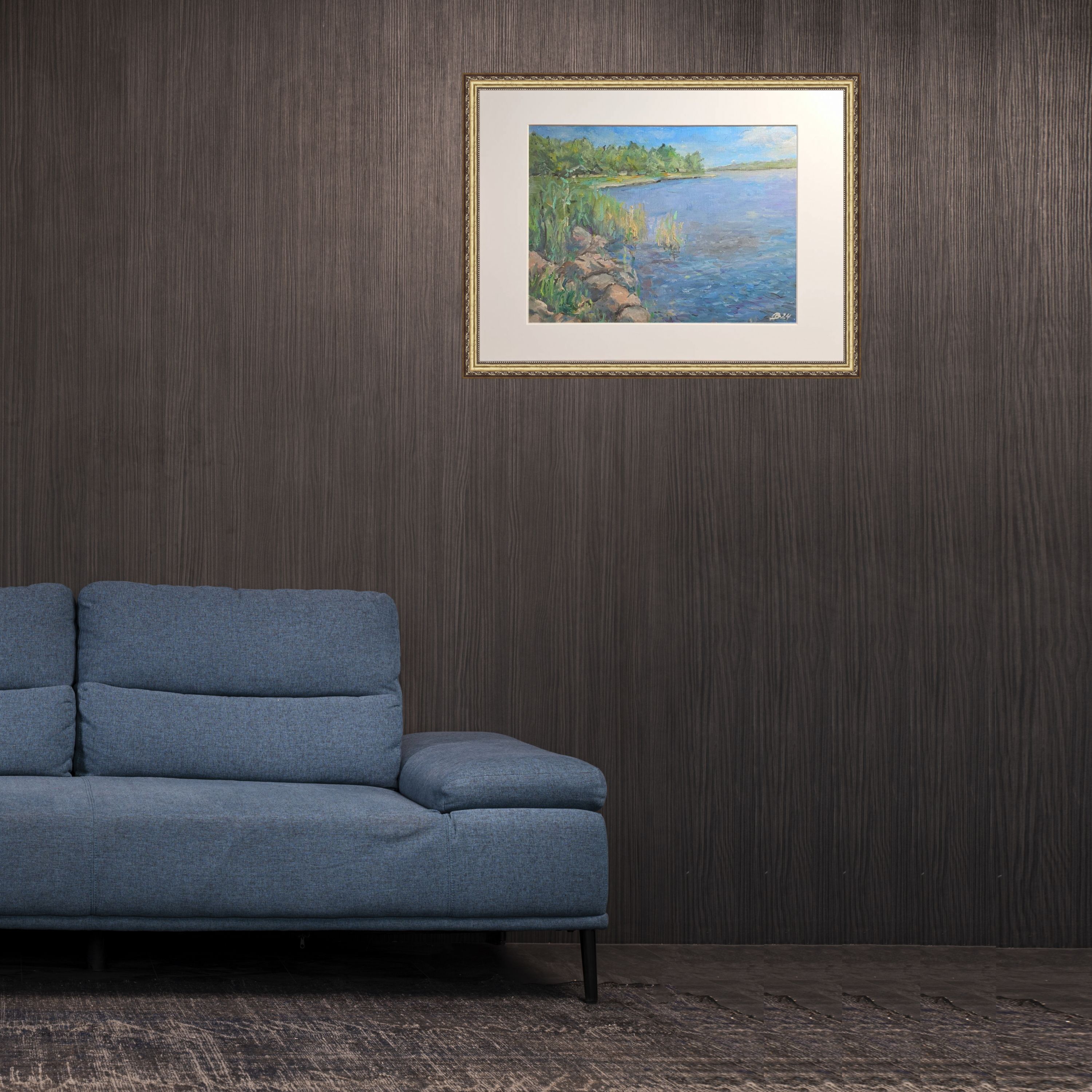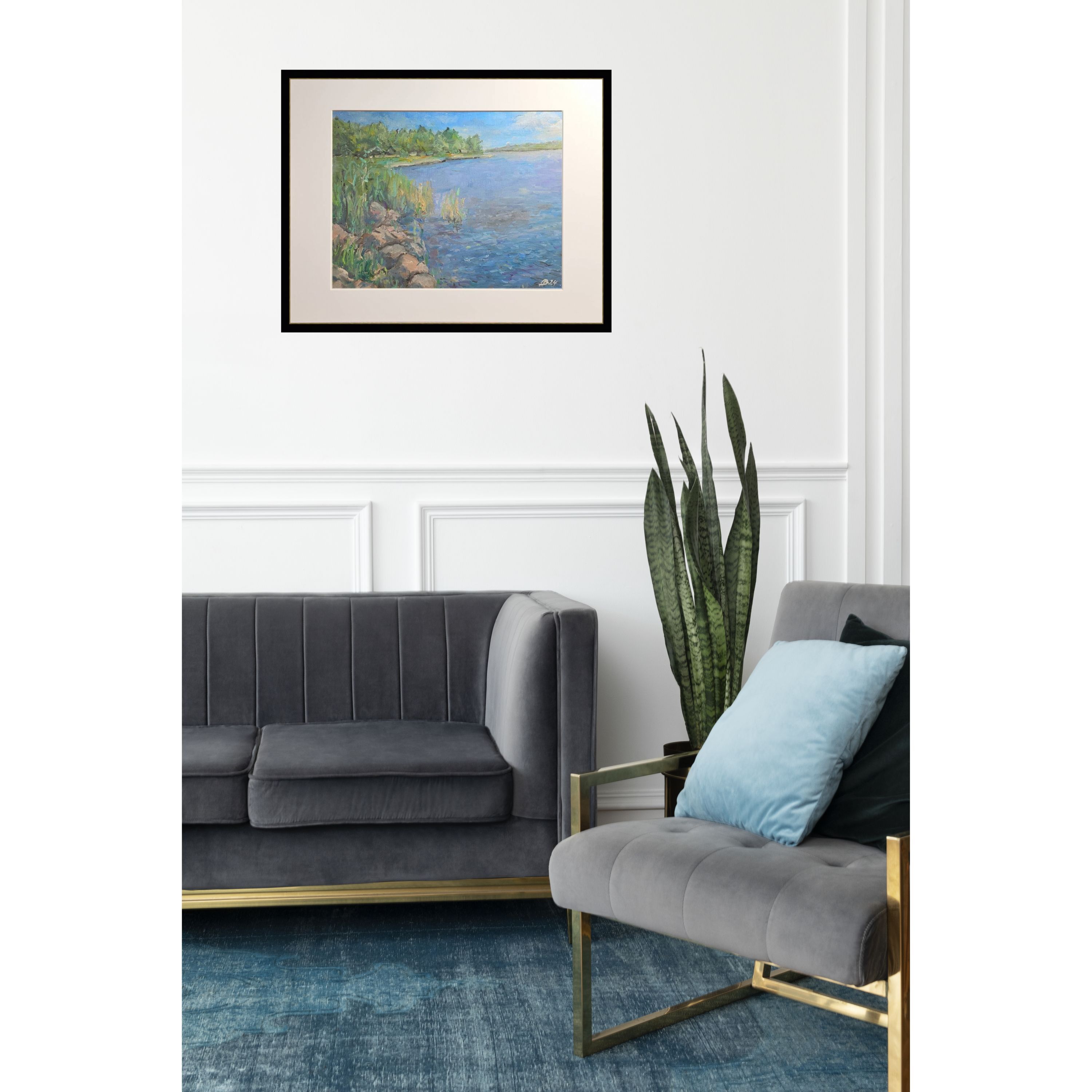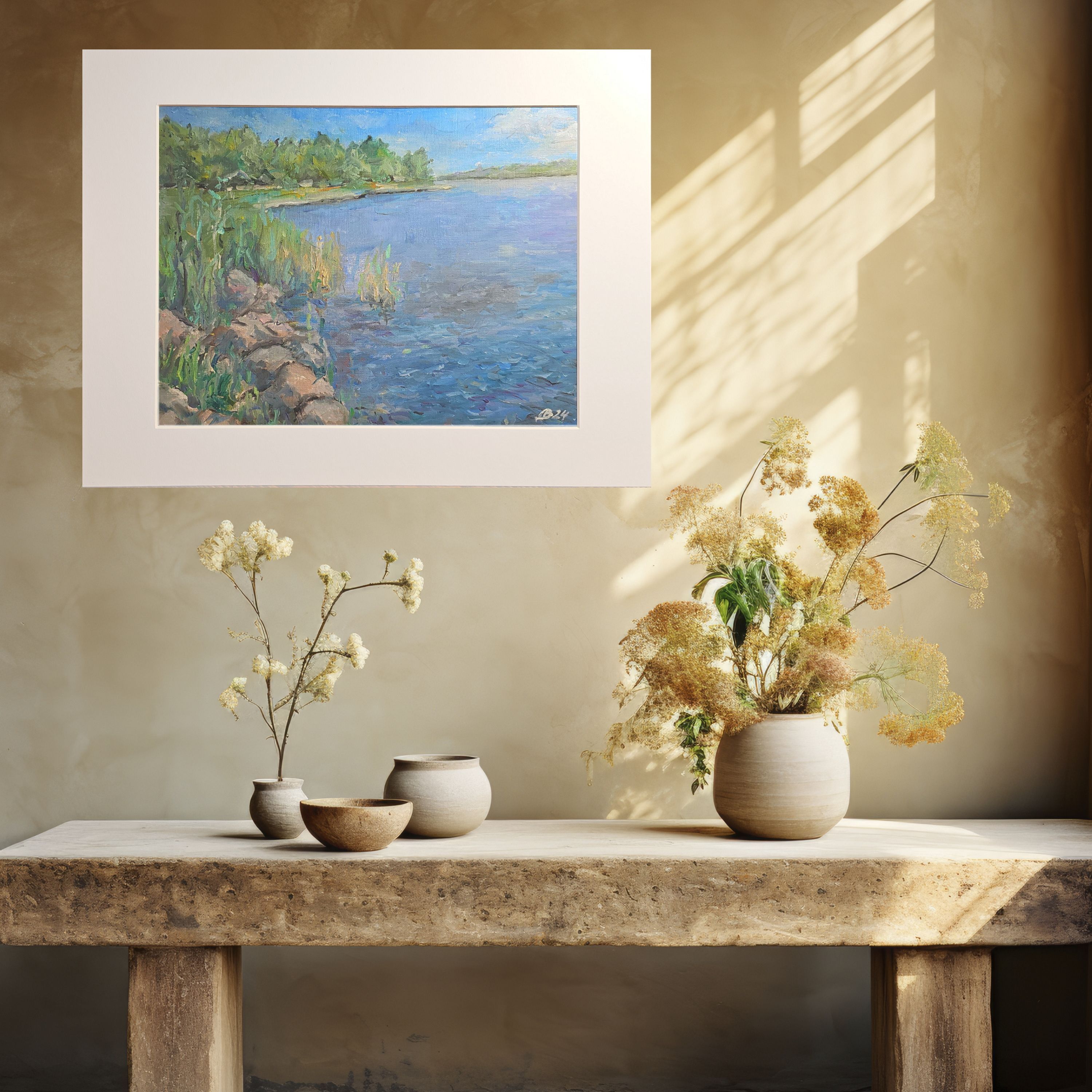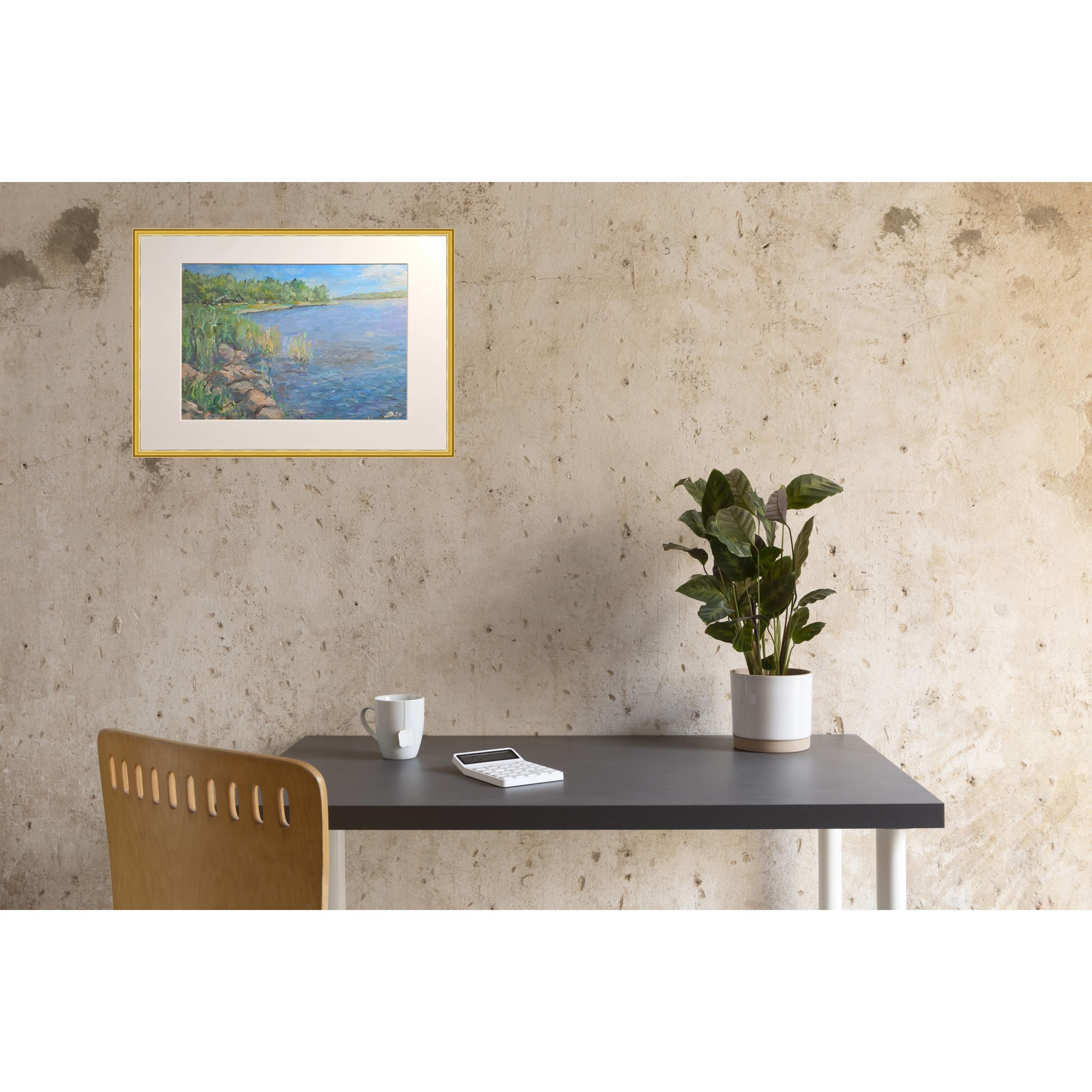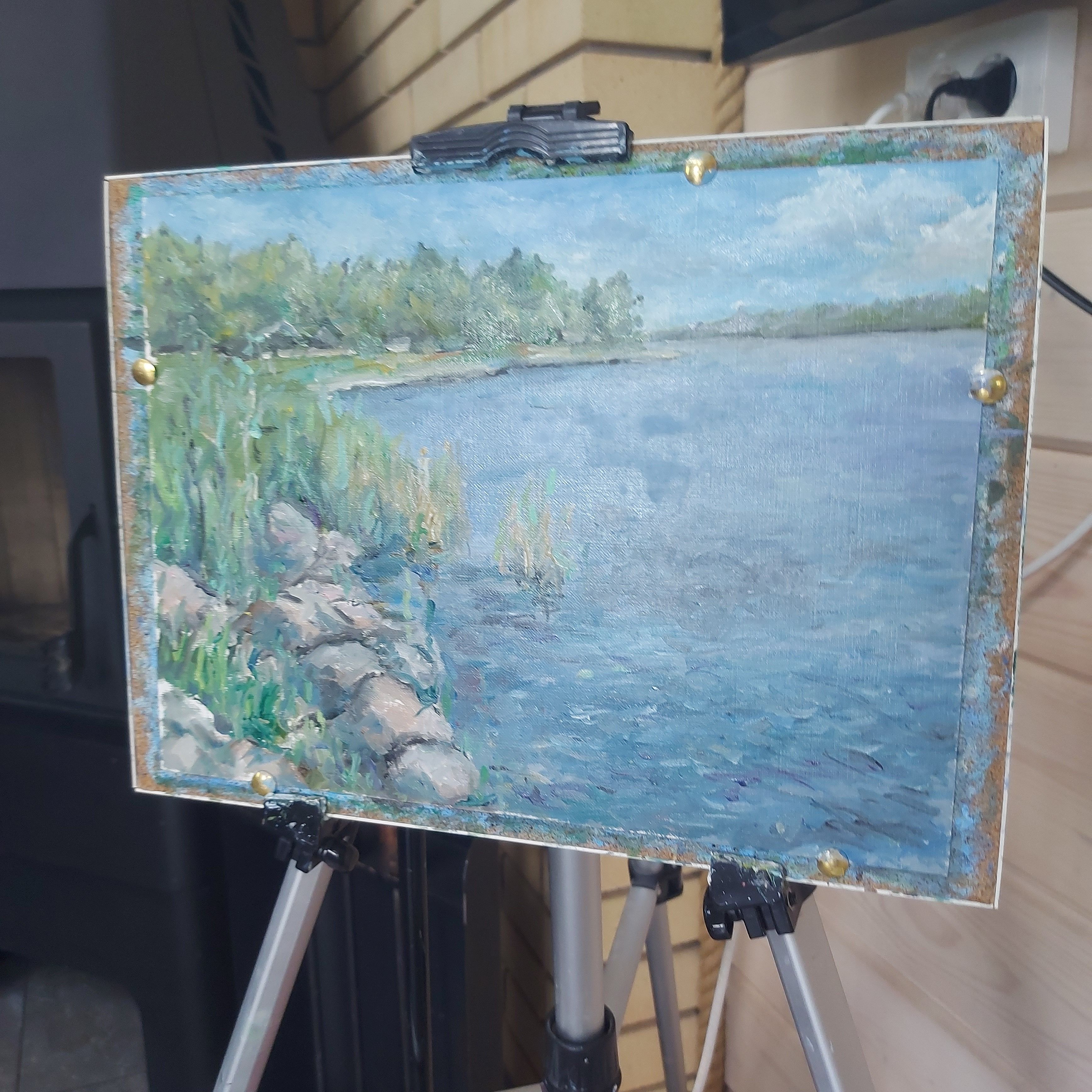 Нам представлена живописная картина с изображением природного пейзажа. Справа расположен водоём с ясной голубой водой, а слева находятся зелёные кусты и деревья. Вдоль берега видны камни и тростник. Над горизонтом виднеется ясное голубое небо с мелкими белыми облаками. Картина выполнена в светлых и жизнерадостных тонах, передавая атмосферу спокойствия и природной красоты.