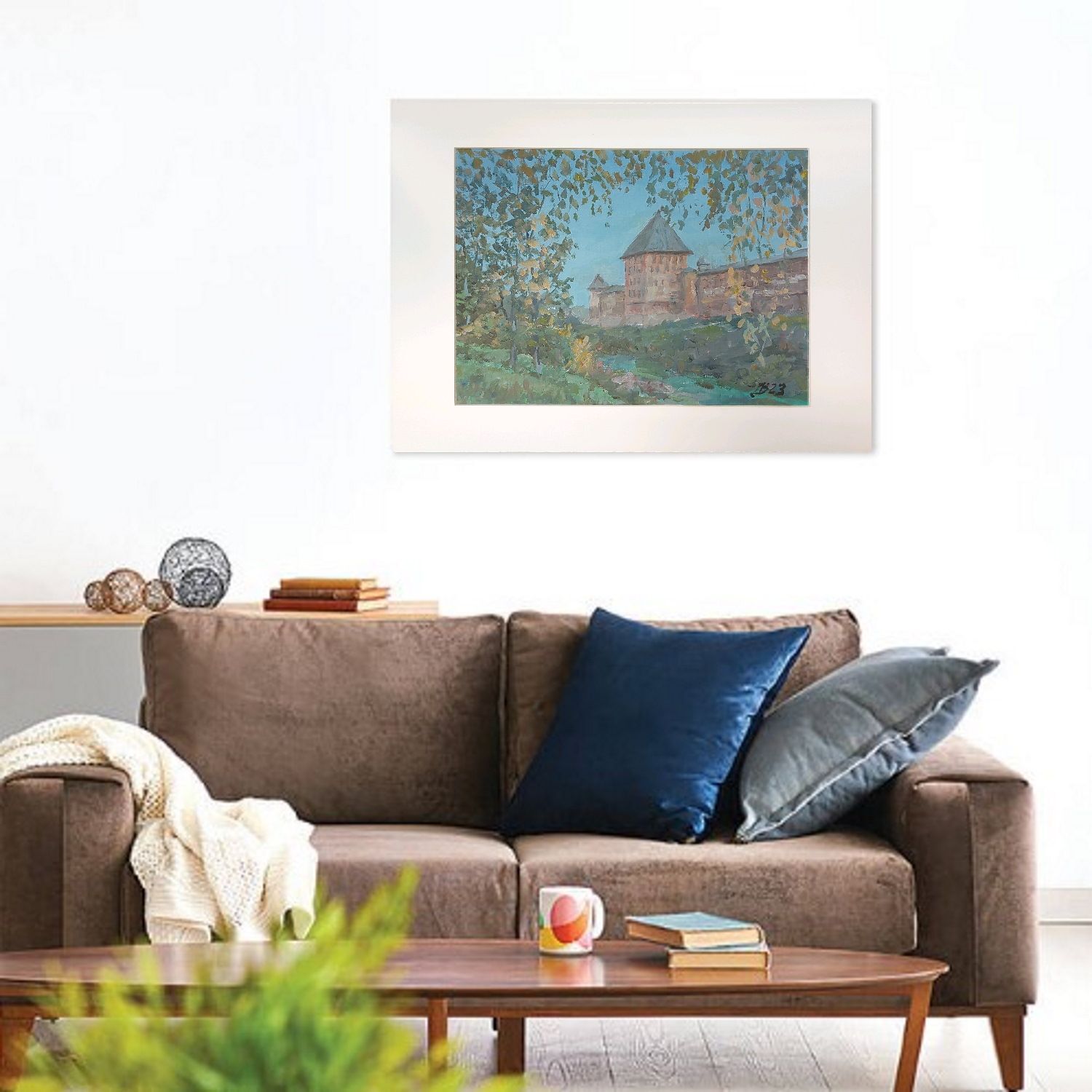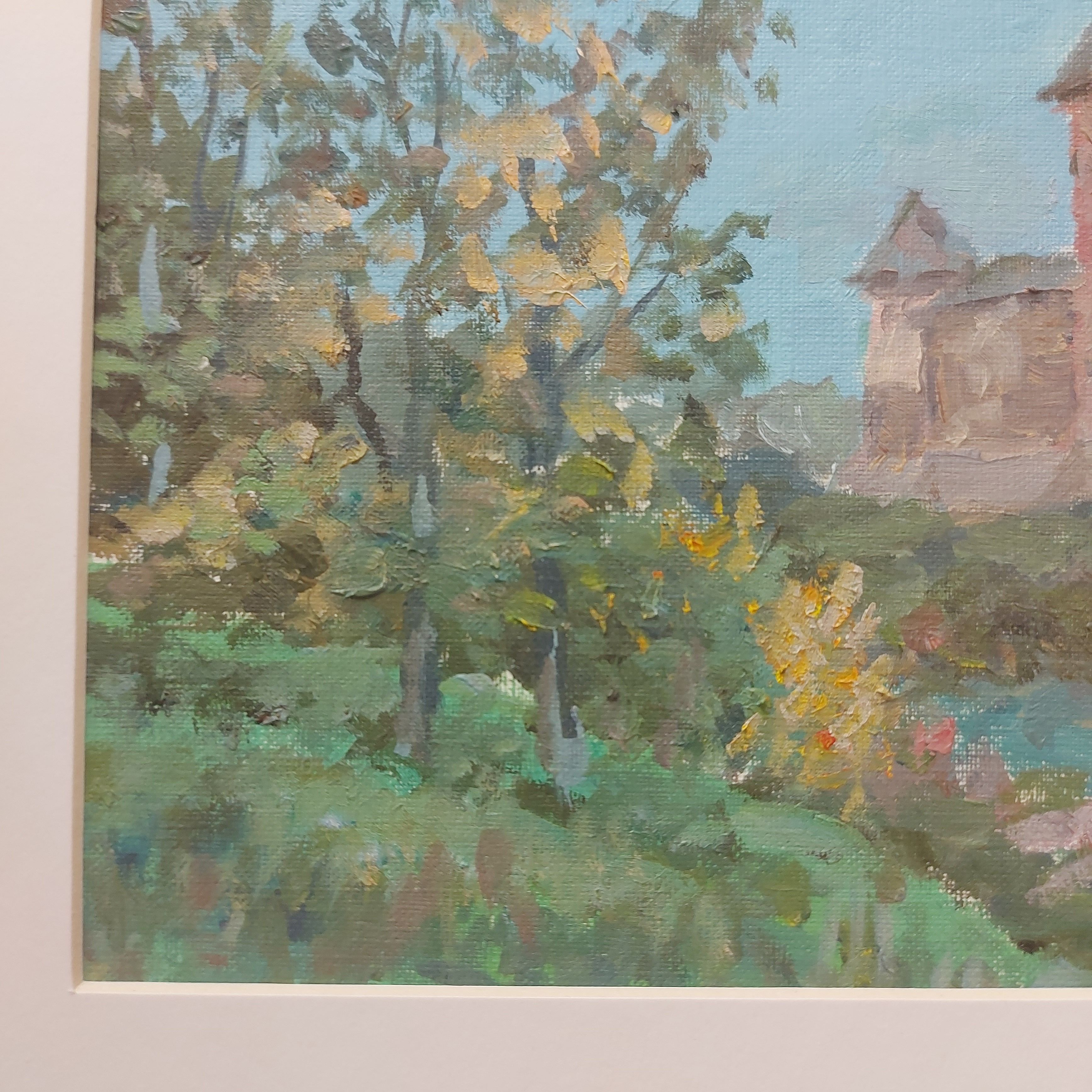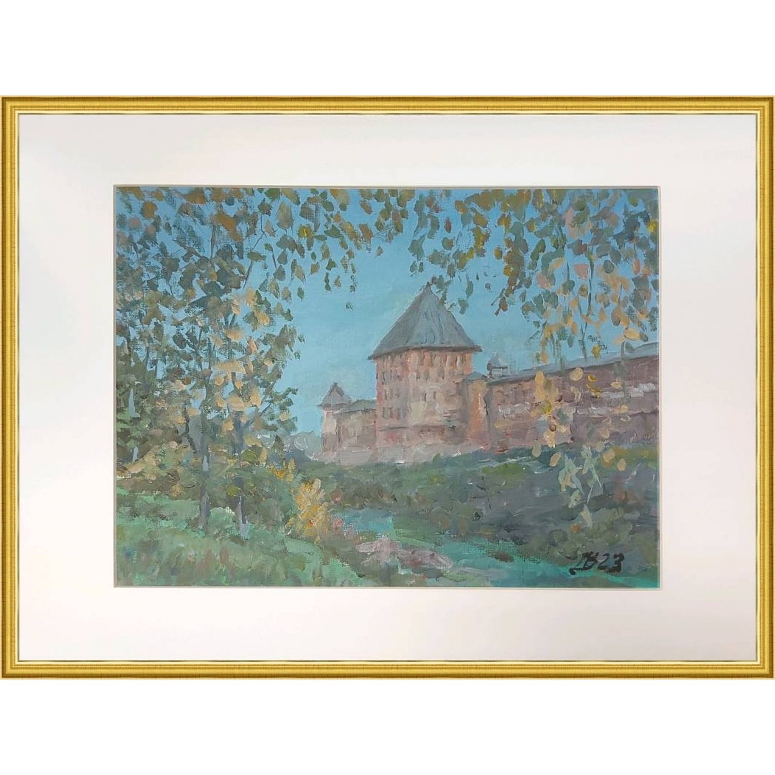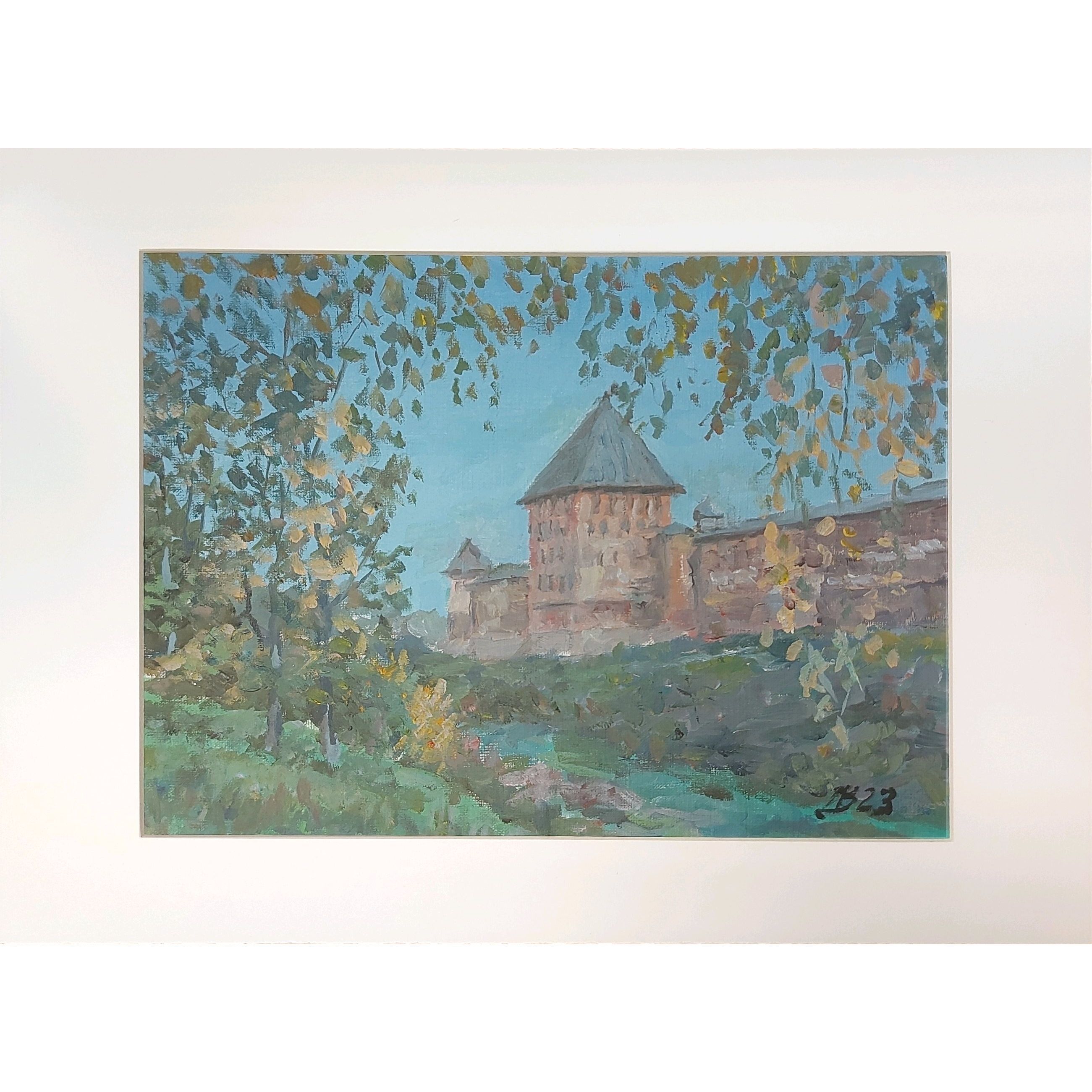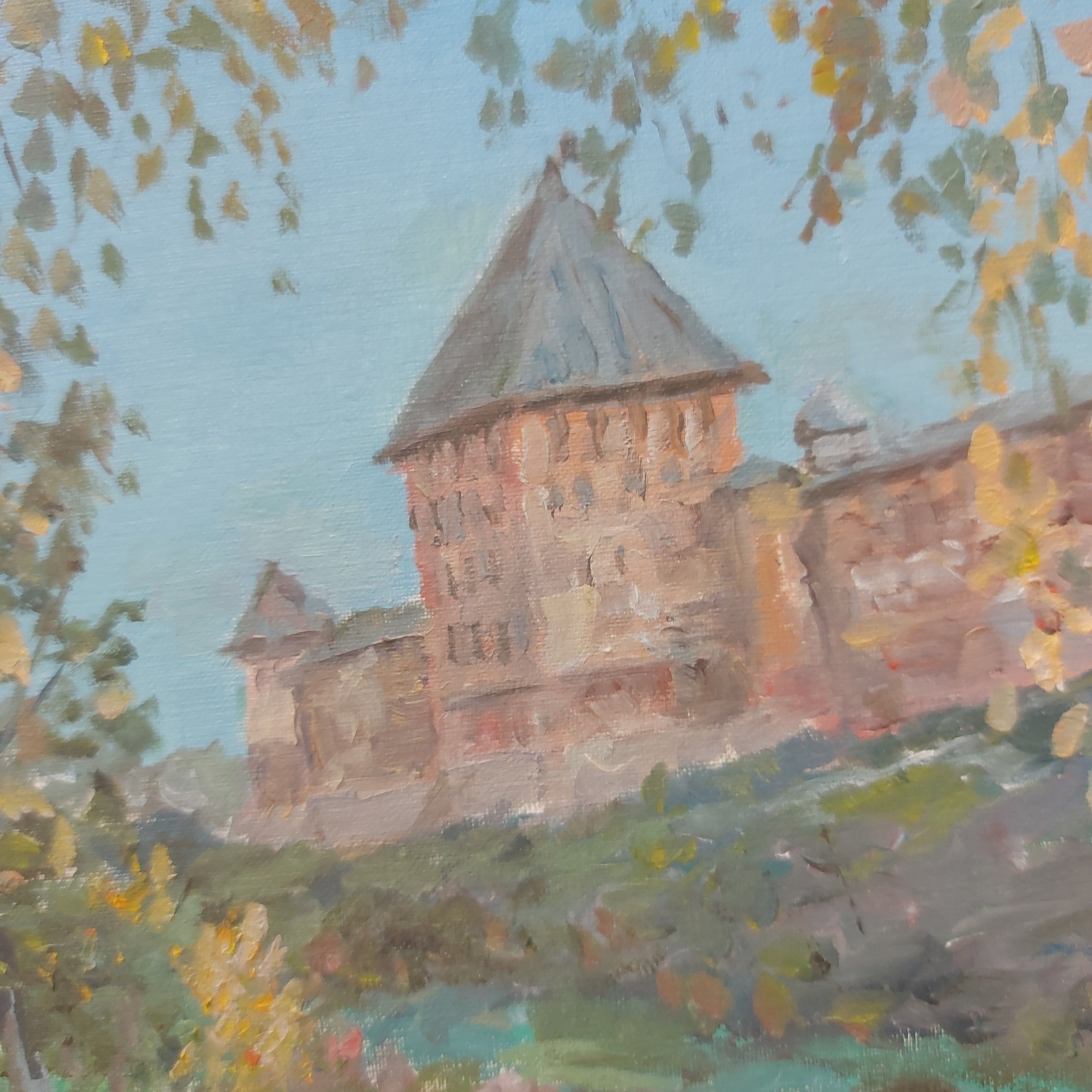 На изображении - живописная картина, выполненная, маслом. Картина в импрессионистическом стиле изображает сцену с деревьями и старинной крепостью Великого Новгорода. На переднем плане расположены высокие деревья с зелёной и жёлтой листвой, что намекает на начало осени.