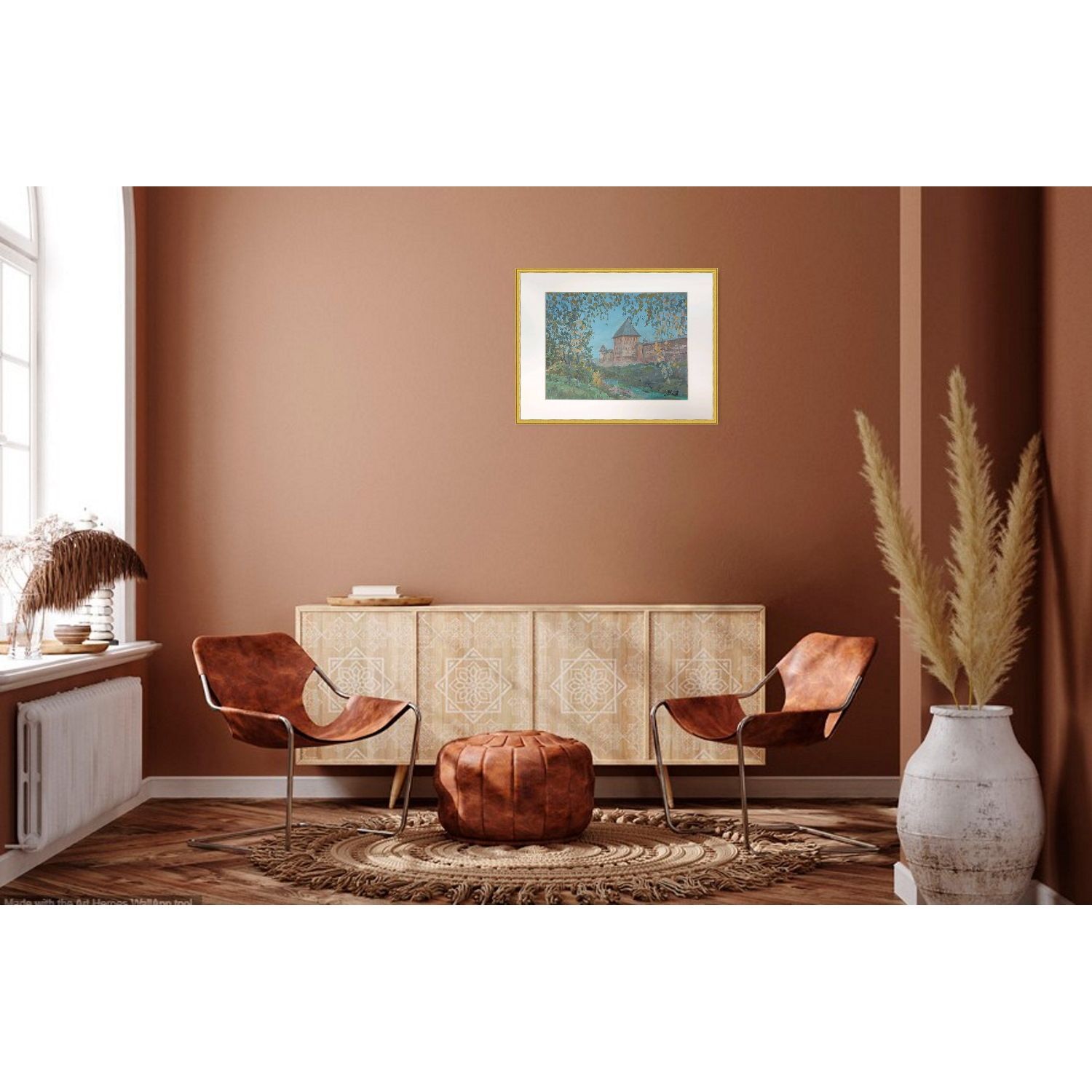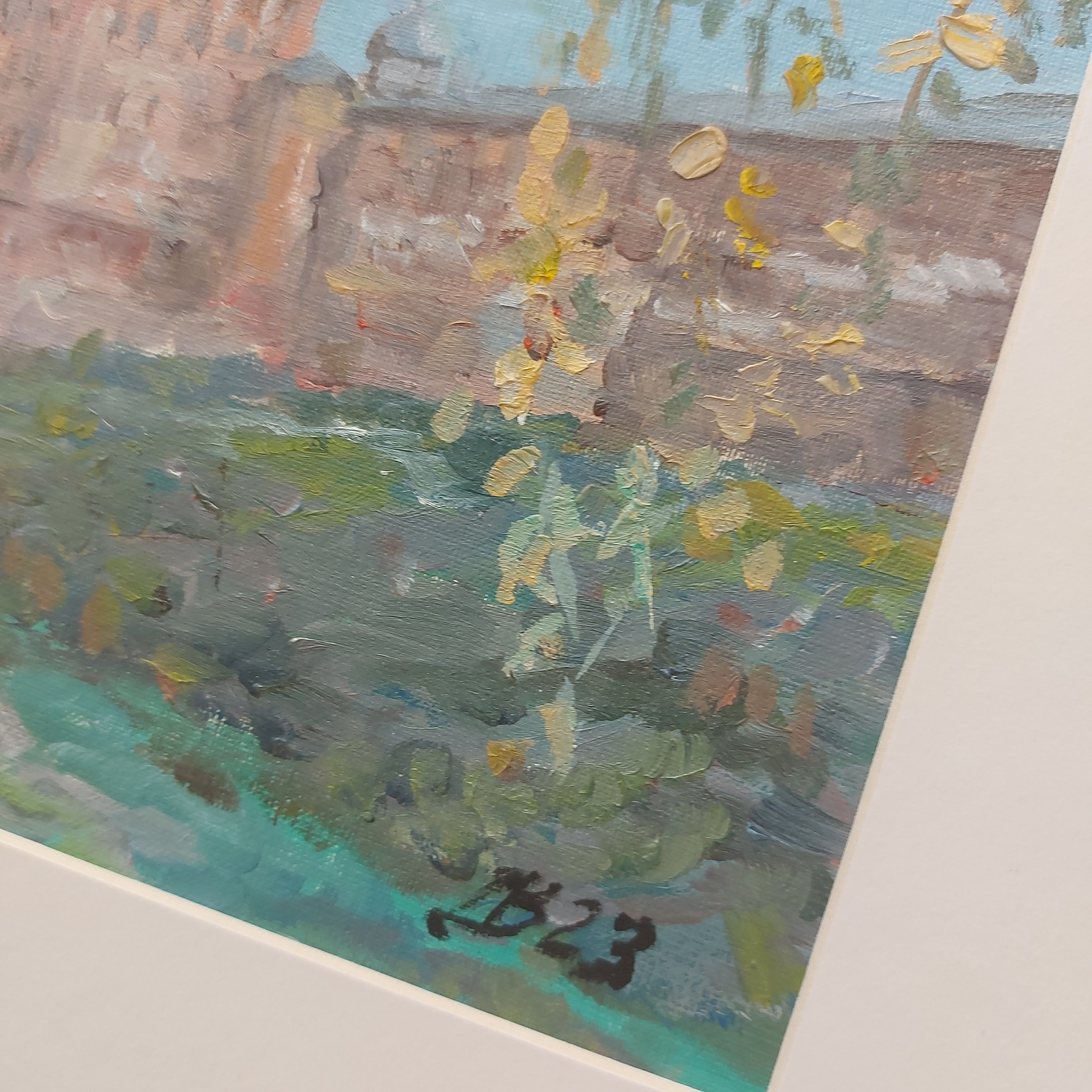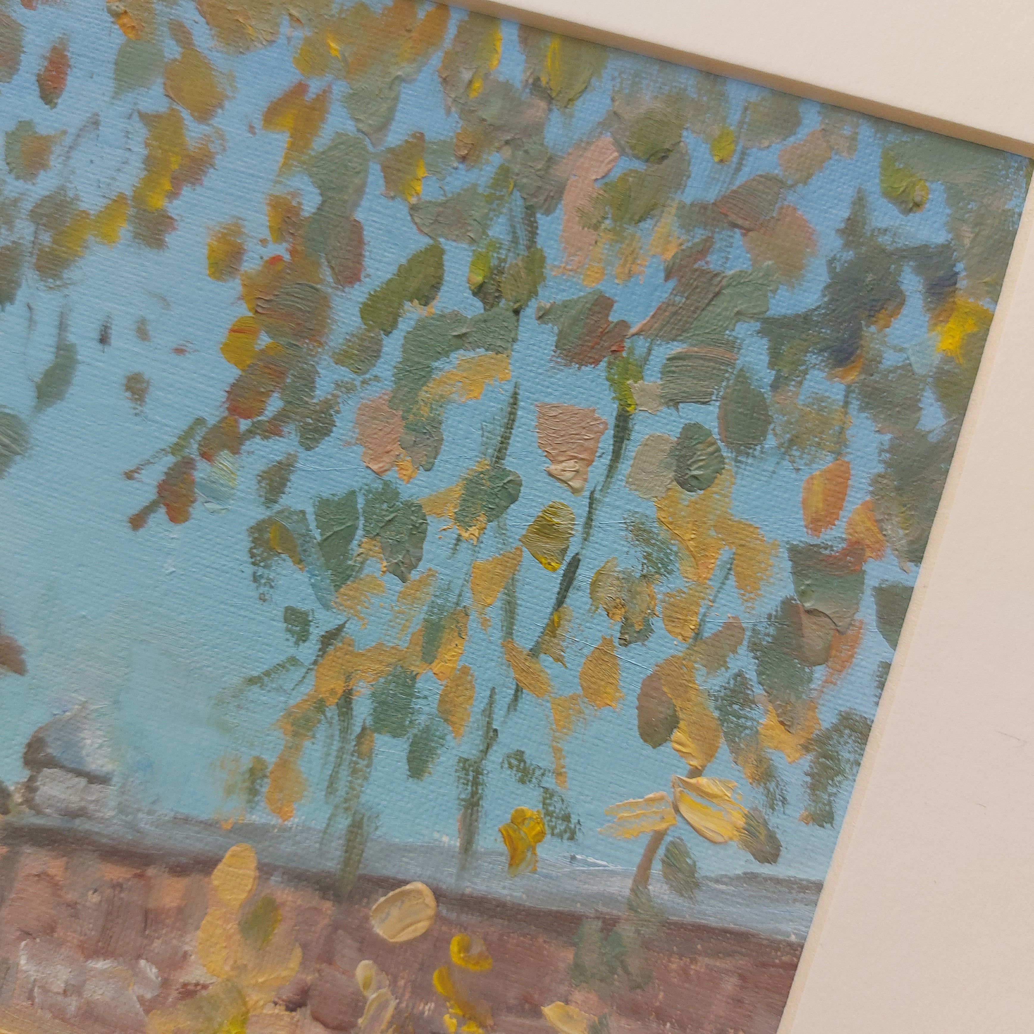 В нижнем правом углу изображения присутствует подпись художника. Холст аккуратно вставлен в паспарту белого цвета, что дополнительно подчёркивает и оформляет произведение.