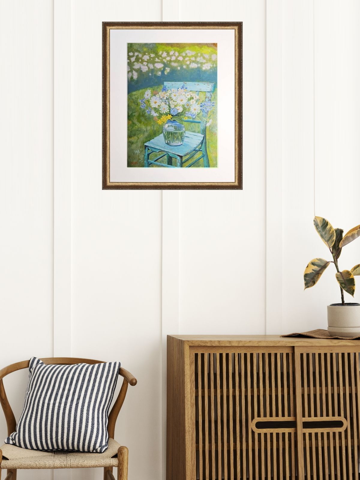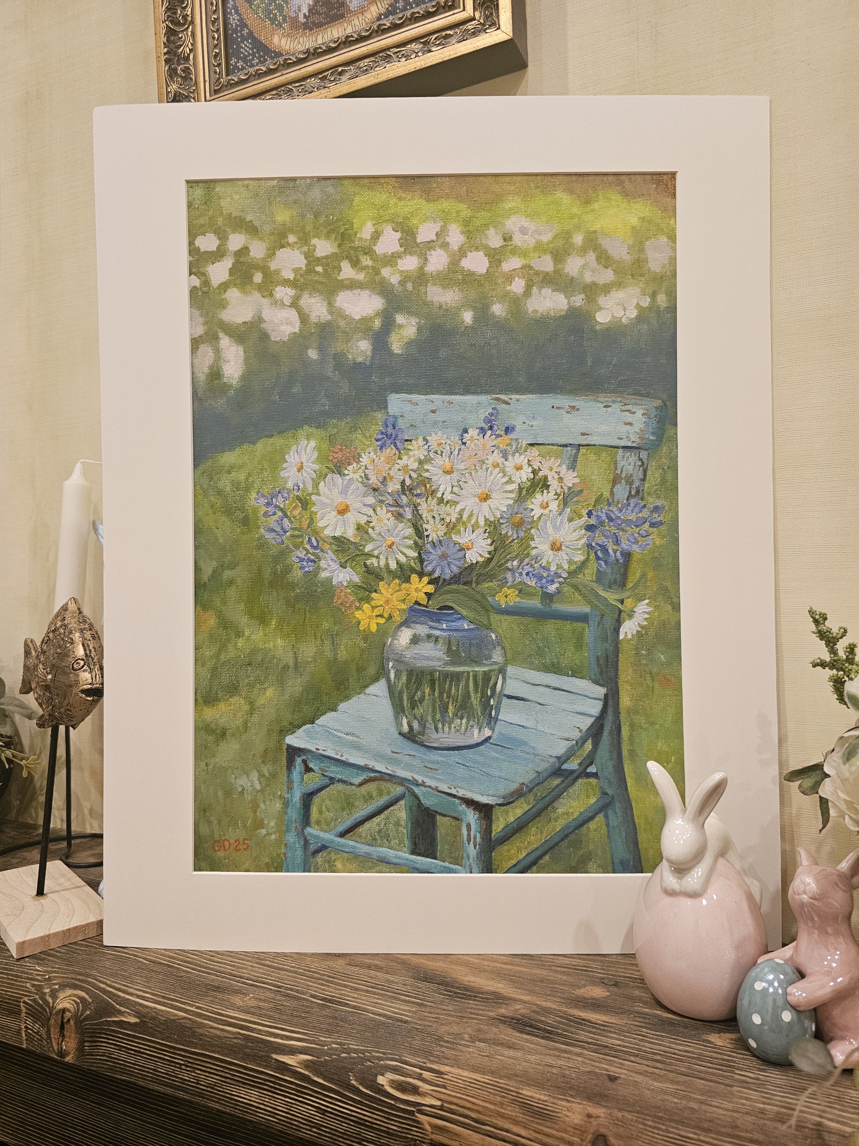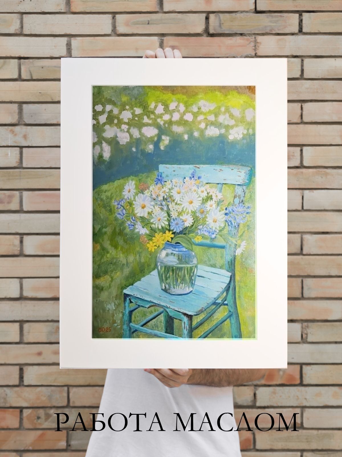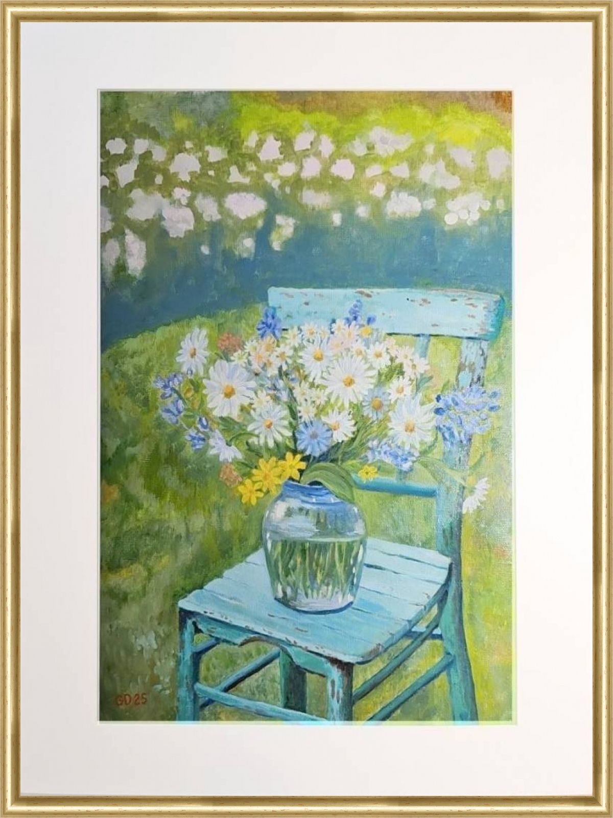 Нам представлена картина, на которой изображен букет полевых цветов, стоящий в стеклянной вазе на старом голубом деревянном стуле. Букет состоит из ромашек и синих и жёлтых цветов. Фон картины выполнен в зеленых и голубых тонах, возможно, изображая сад. На заднем плане можно заметить размытые розовато-белые пятна, которые могут быть цветами. Картина выполнена в мягких, пастельных тонах, создавая атмосферу спокойствия и уюта и обрамлена в светлое паспарту.