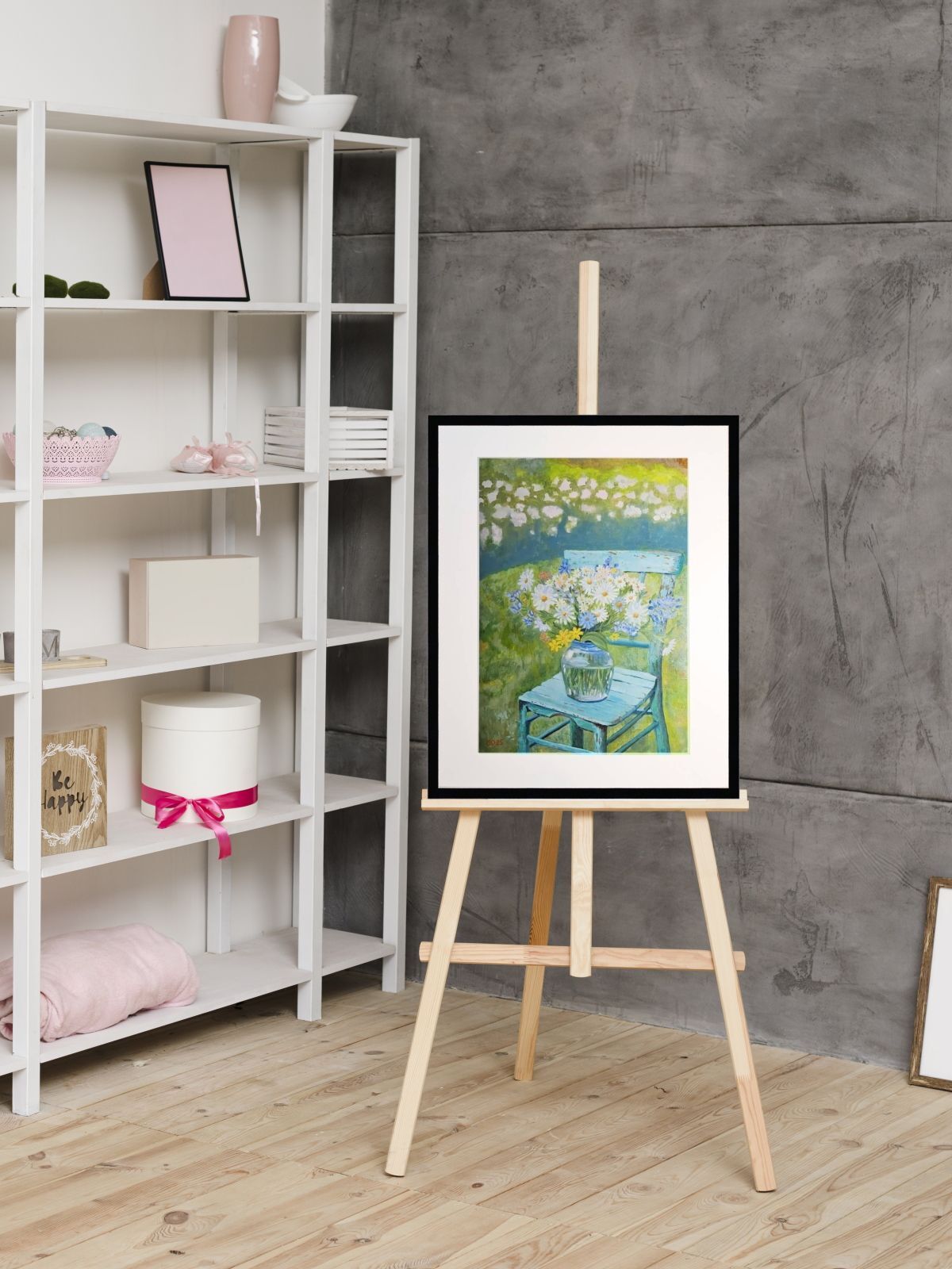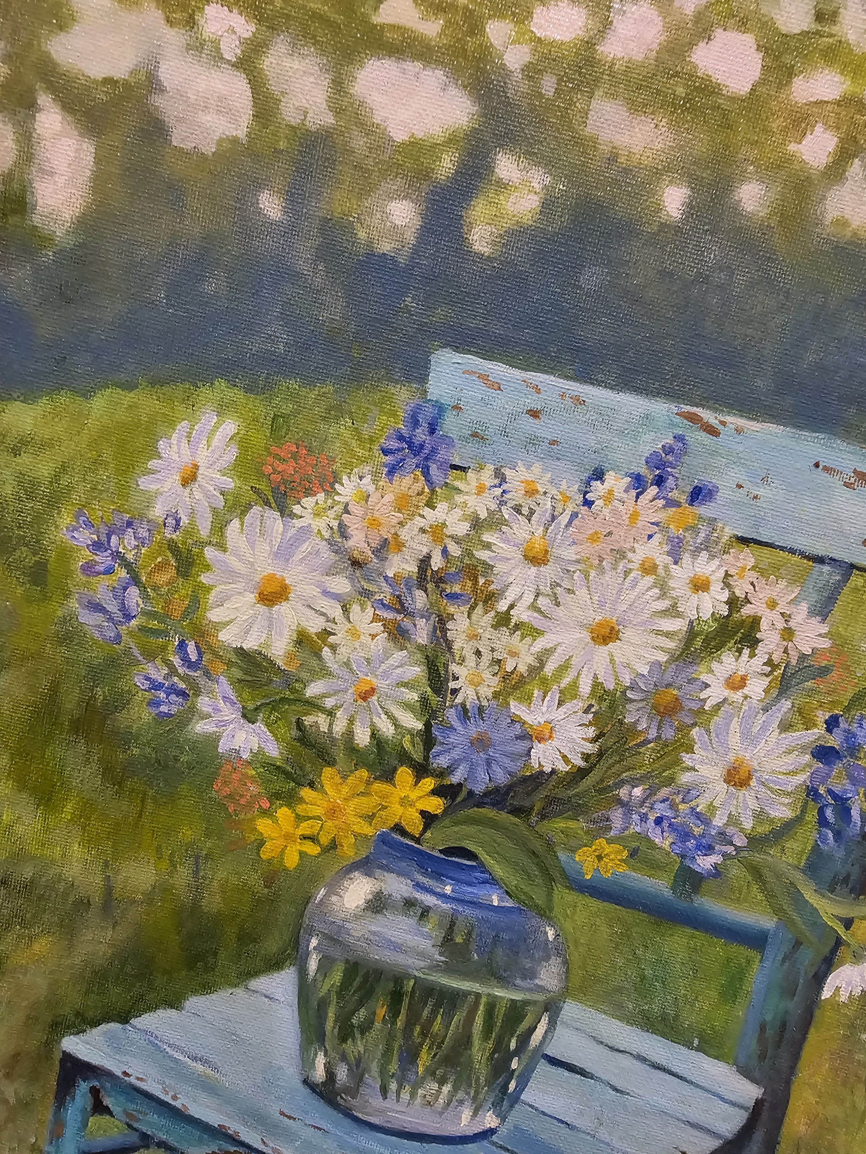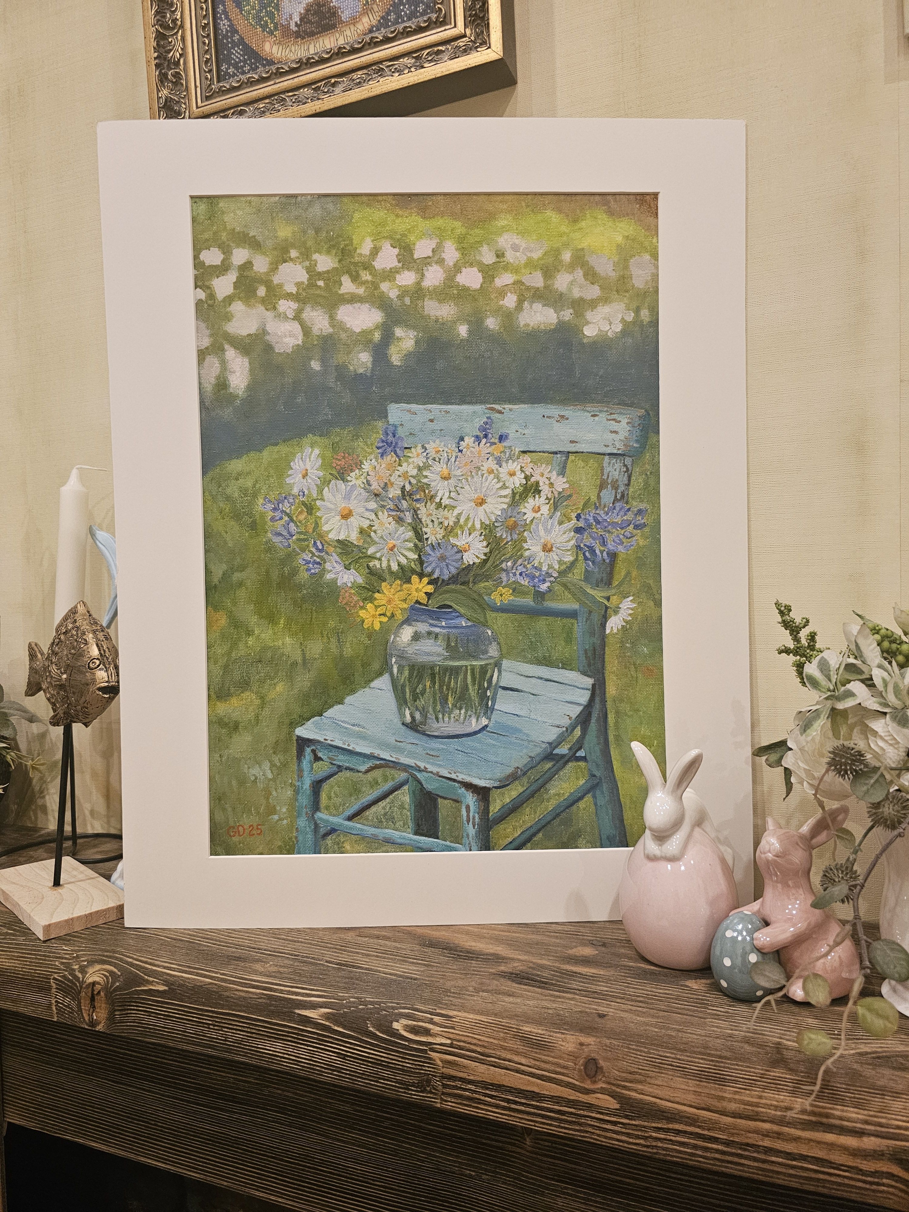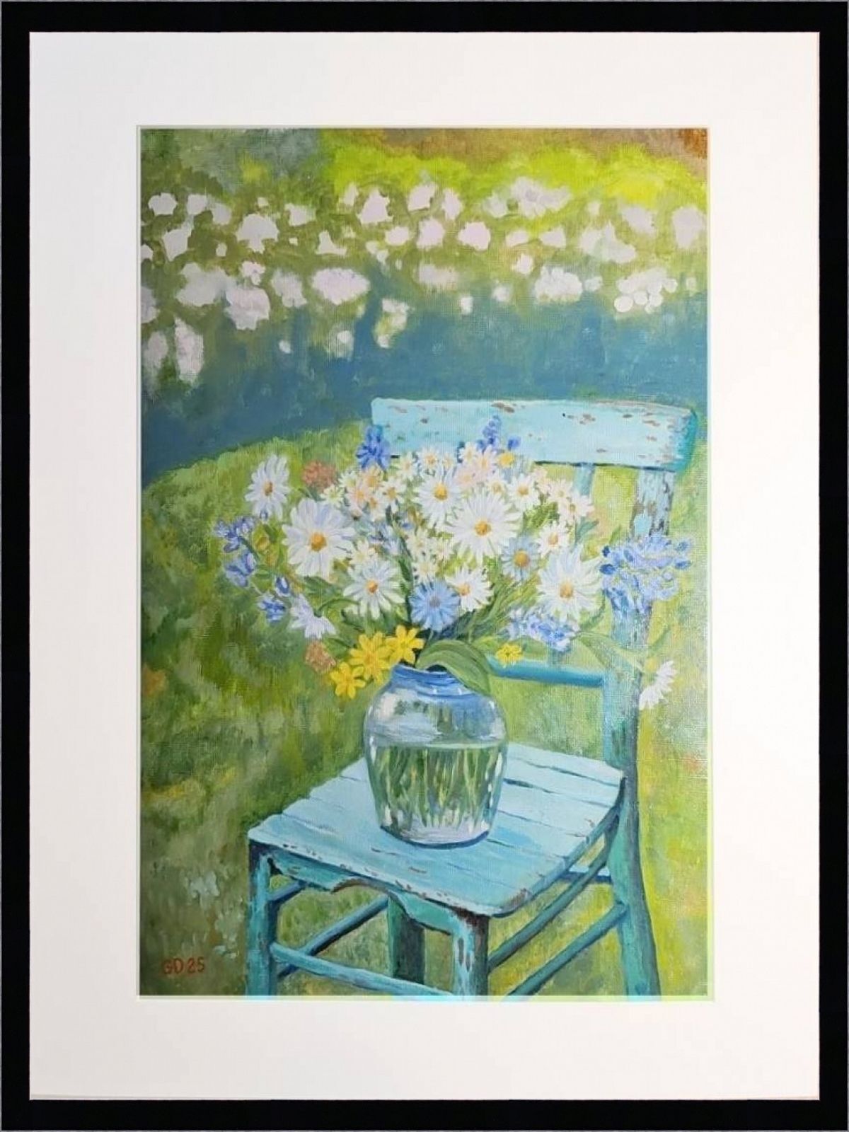 Нам представлена картина, на которой изображен букет полевых цветов, стоящий в стеклянной вазе на старом голубом деревянном стуле. Букет состоит из ромашек и синих и жёлтых цветов. Фон картины выполнен в зеленых и голубых тонах, возможно, изображая сад. На заднем плане можно заметить размытые розовато-белые пятна, которые могут быть цветами. Картина выполнена в мягких, пастельных тонах, создавая атмосферу спокойствия и уюта и обрамлена в светлое паспарту.