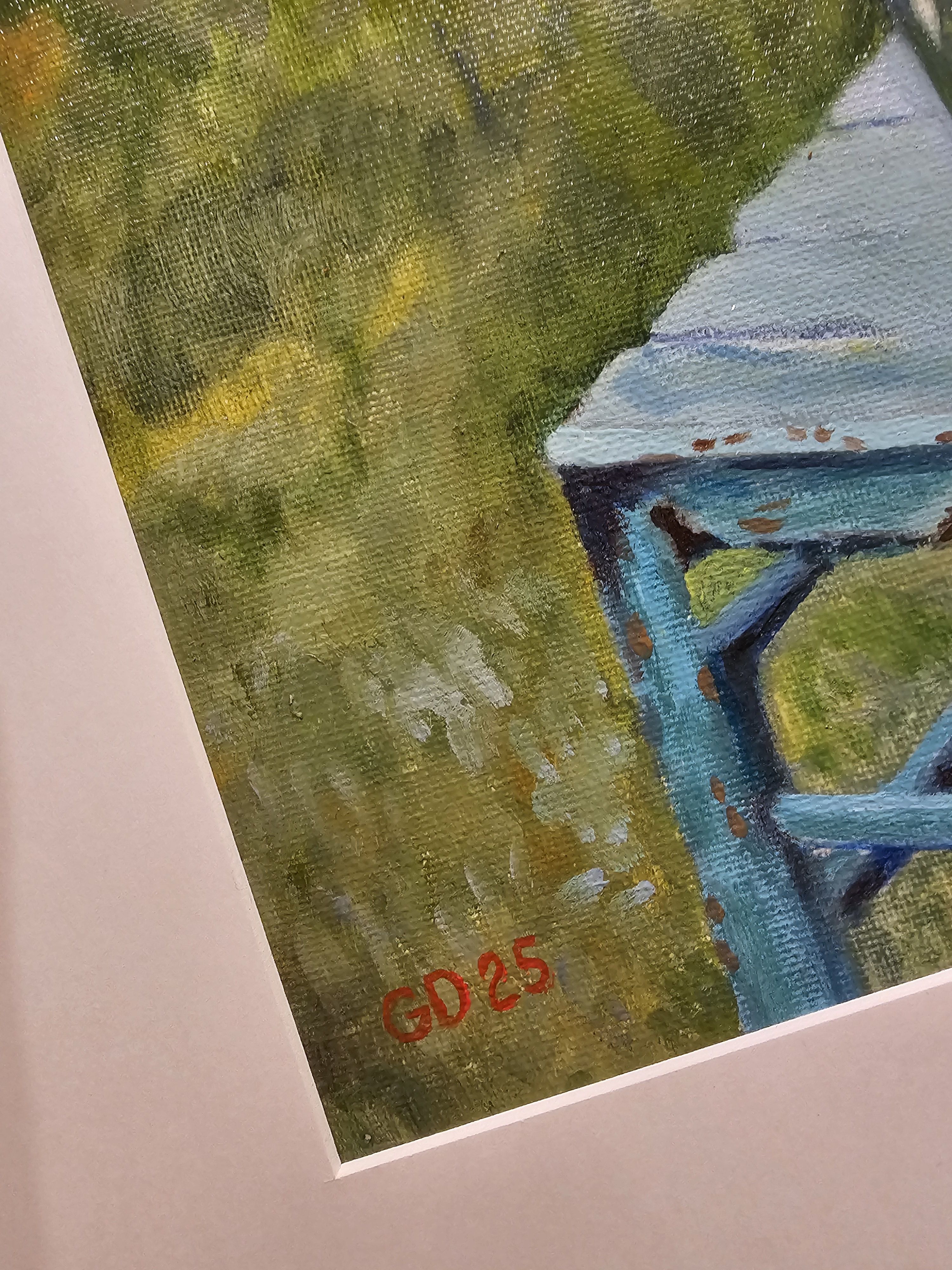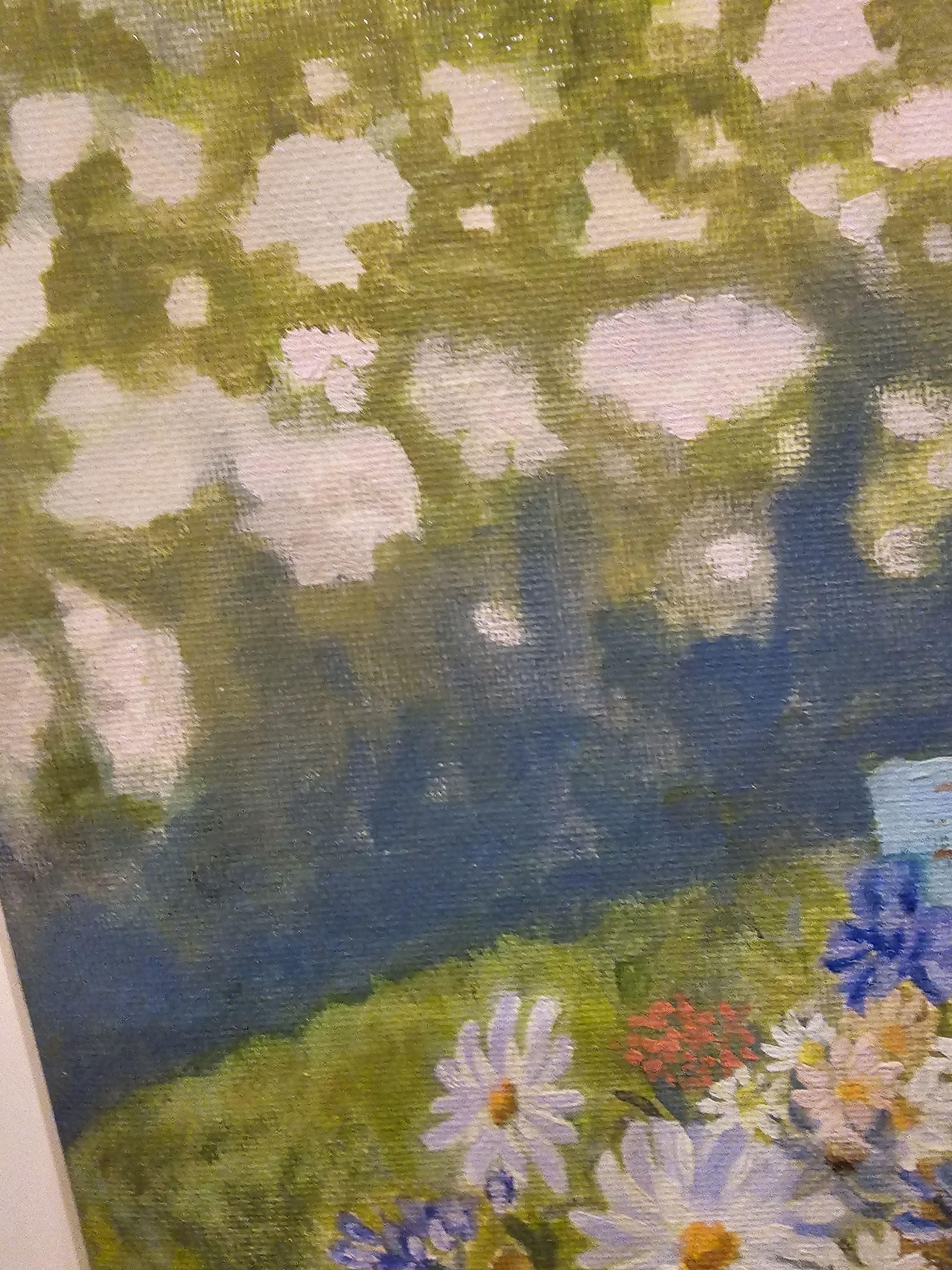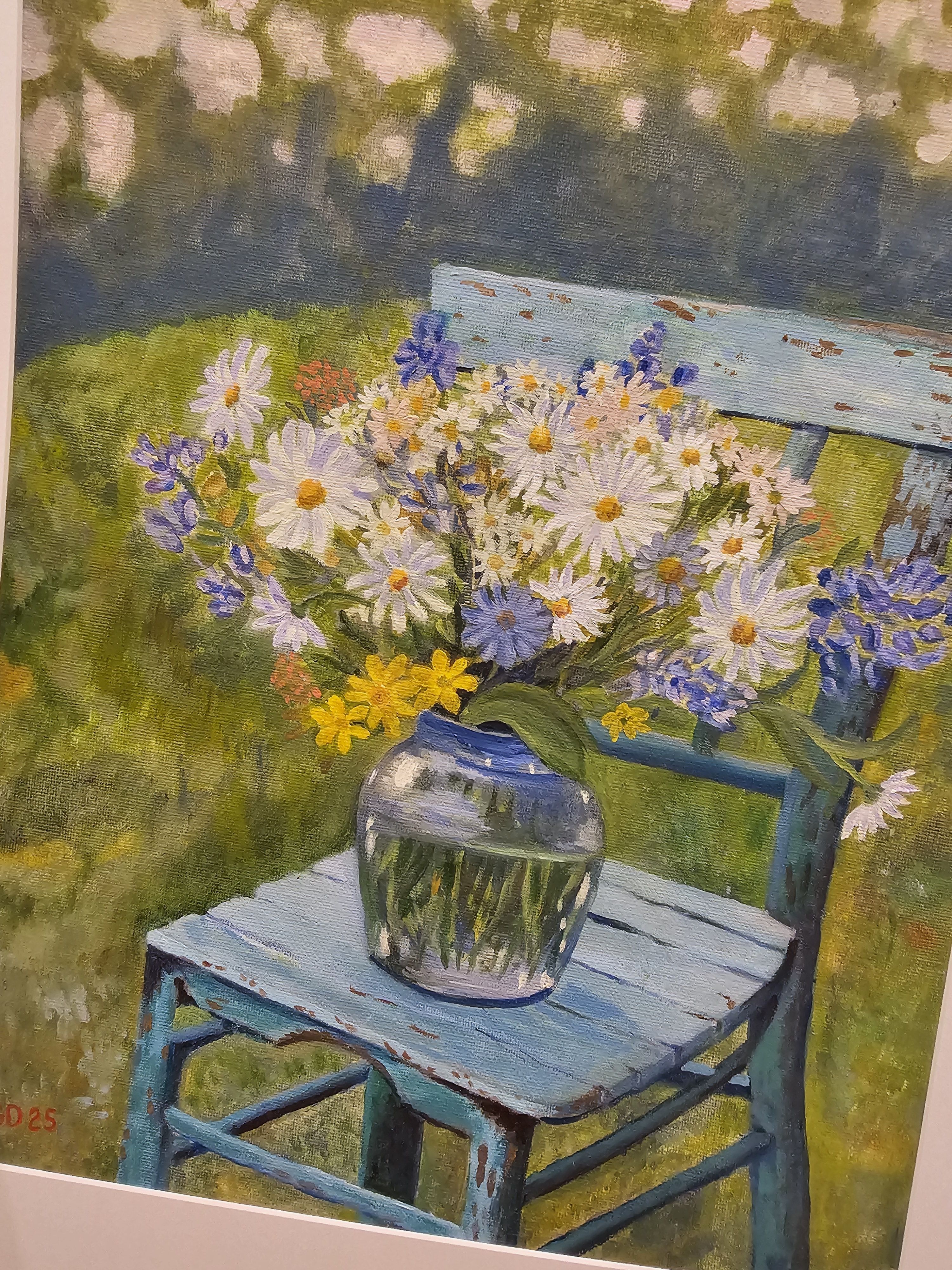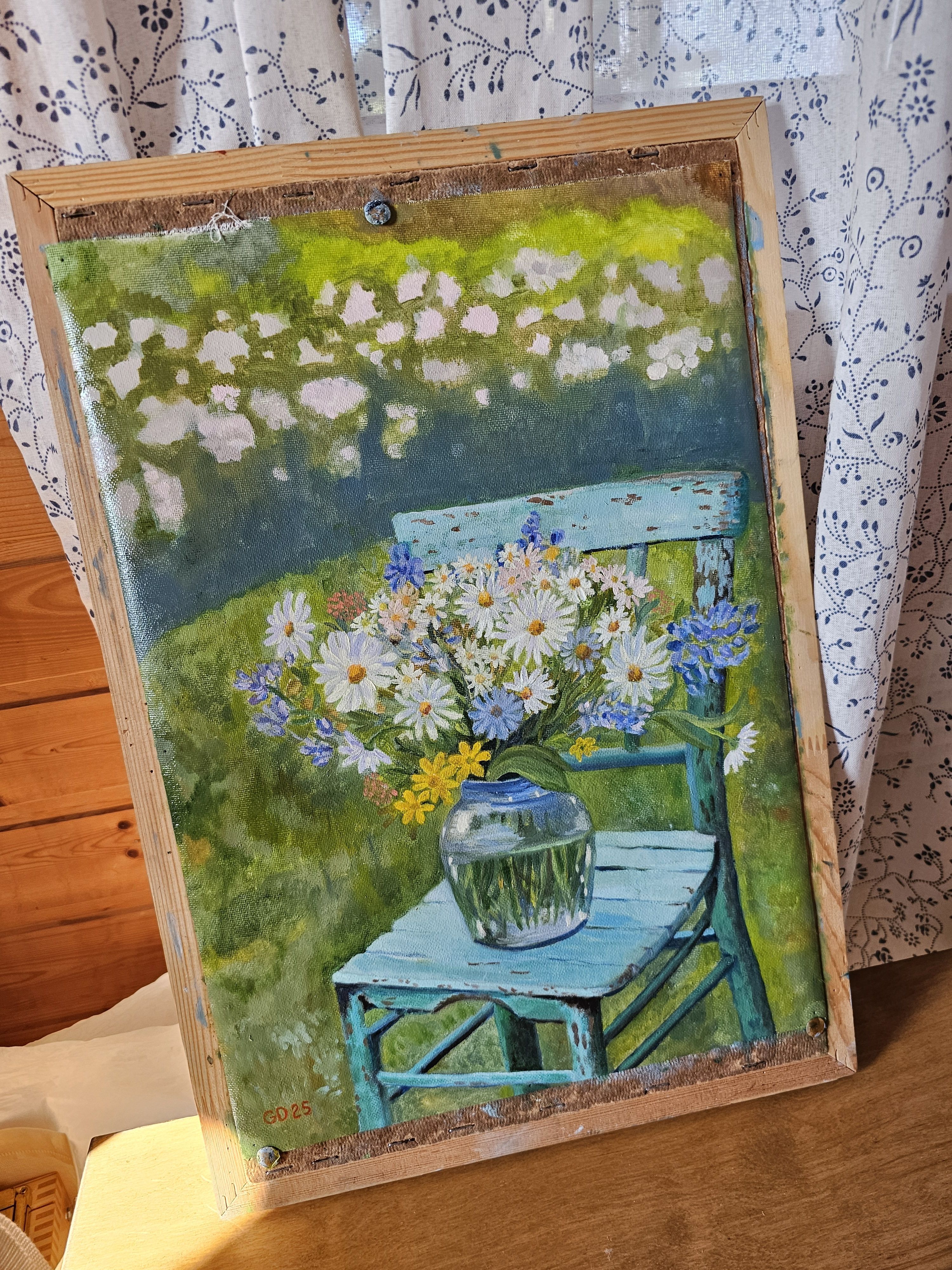 Нам представлена картина, на которой изображен букет полевых цветов, стоящий в стеклянной вазе на старом голубом деревянном стуле. Букет состоит из ромашек и синих и жёлтых цветов. Фон картины выполнен в зеленых и голубых тонах, возможно, изображая сад. На заднем плане можно заметить размытые розовато-белые пятна, которые могут быть цветами. Картина выполнена в мягких, пастельных тонах, создавая атмосферу спокойствия и уюта и обрамлена в светлое паспарту.