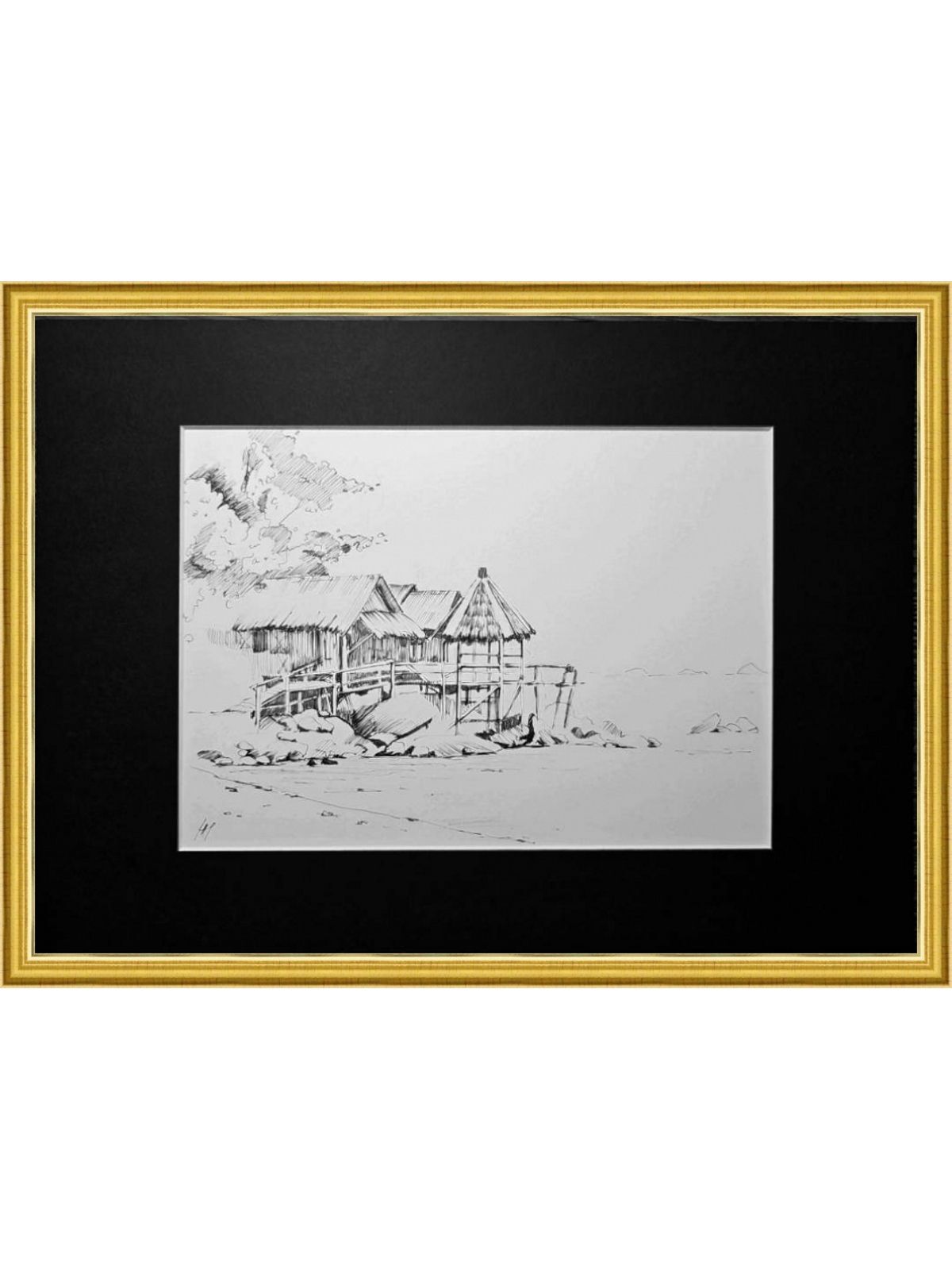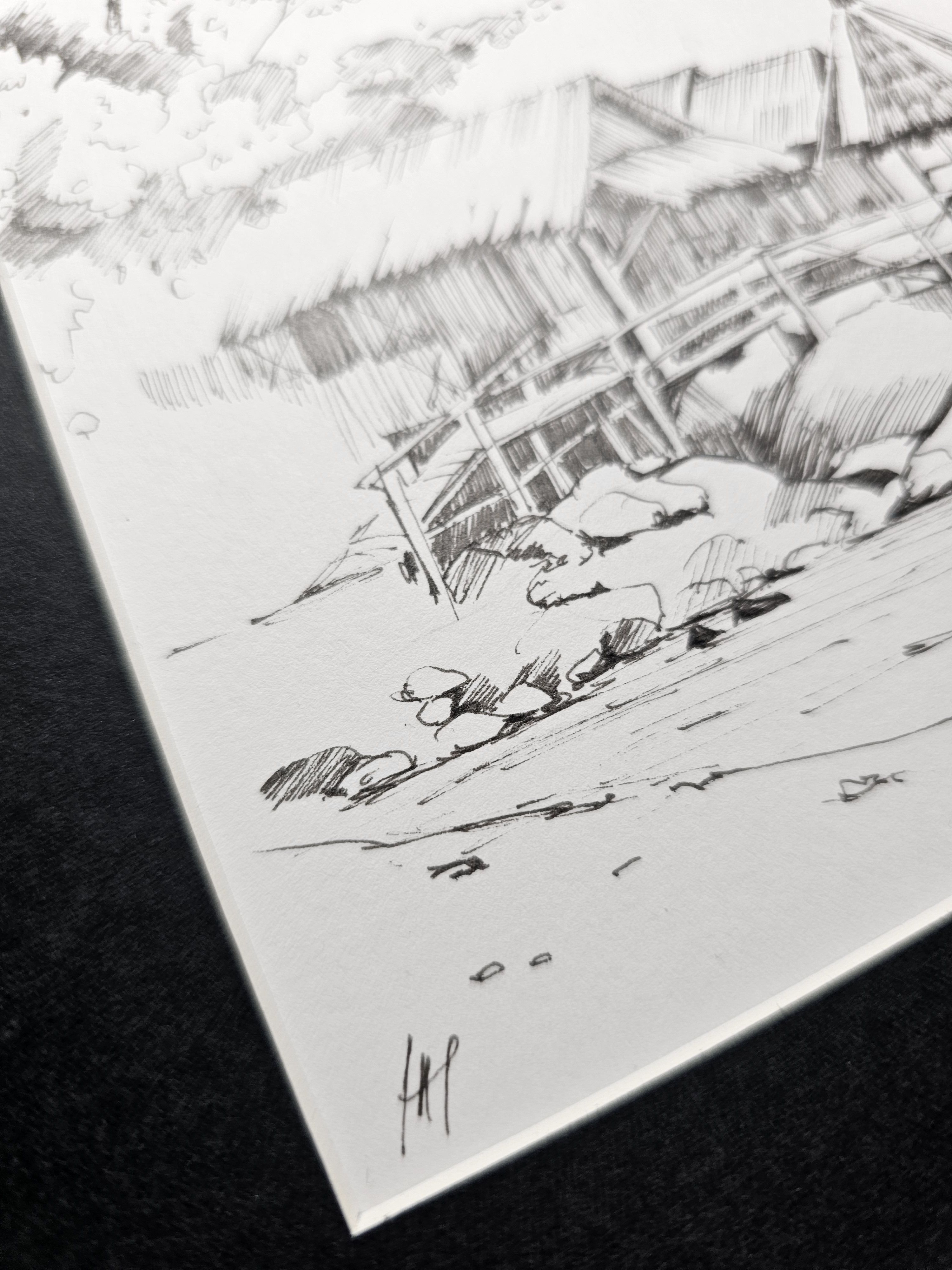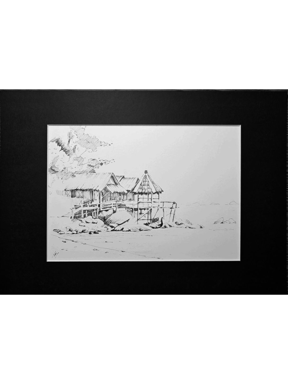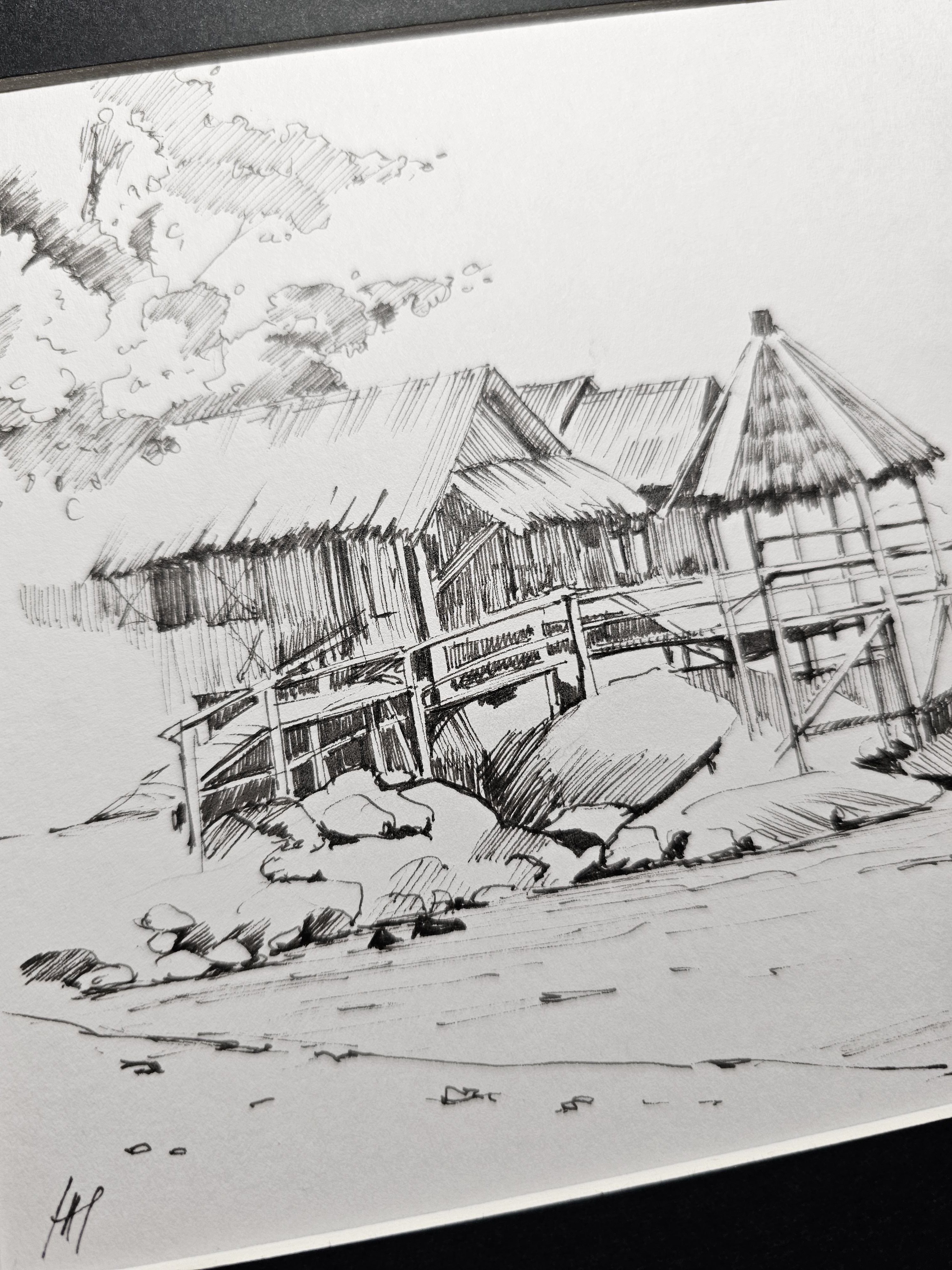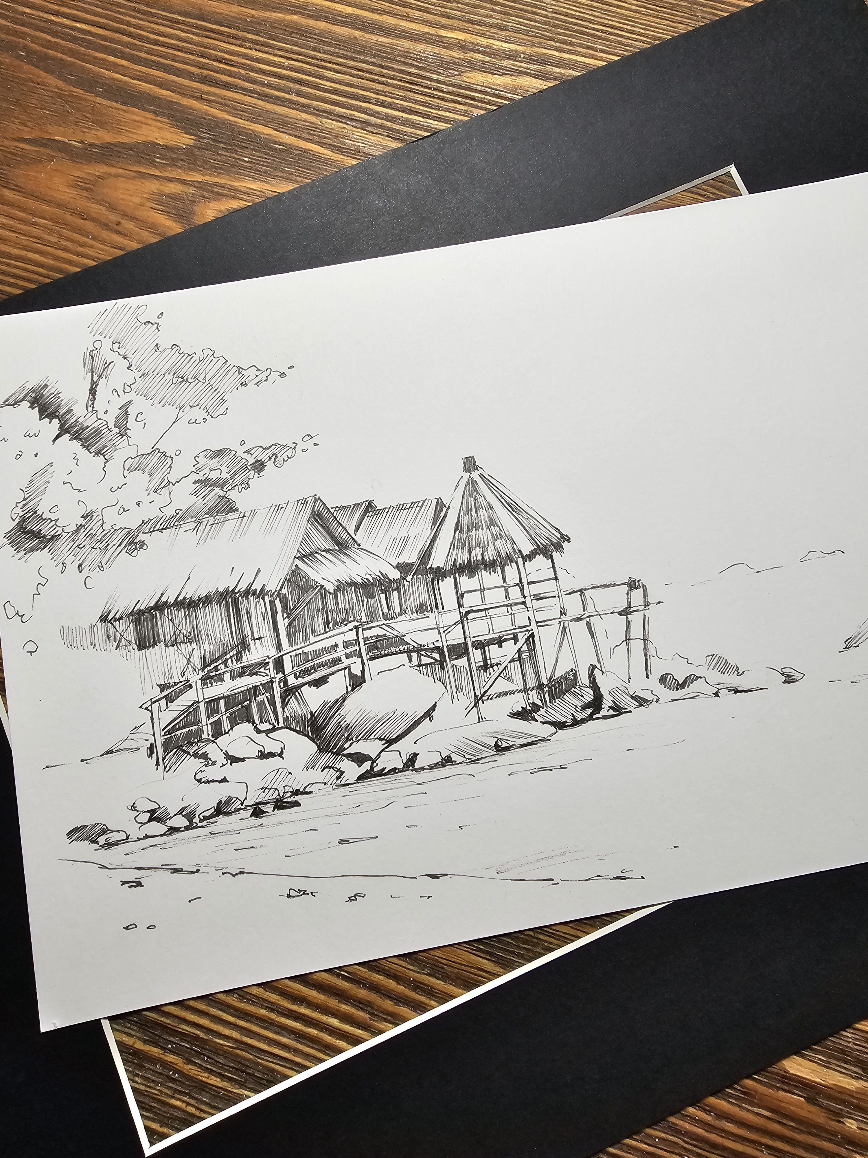 Нам представлена чёрно-белая графическая картина, на которой изображена деревянная хижина с соломенной крышей. Хижина расположена на возвышении, вероятно, на берегу водоёма, так как видно деревянные сваи и ступени, ведущие к ней. На переднем плане находятся камни и песчаная территория. Слева изображены деревья или кустарники, создающие фон для хижины. Атмосфера рисунка спокойная и слегка деревенская.