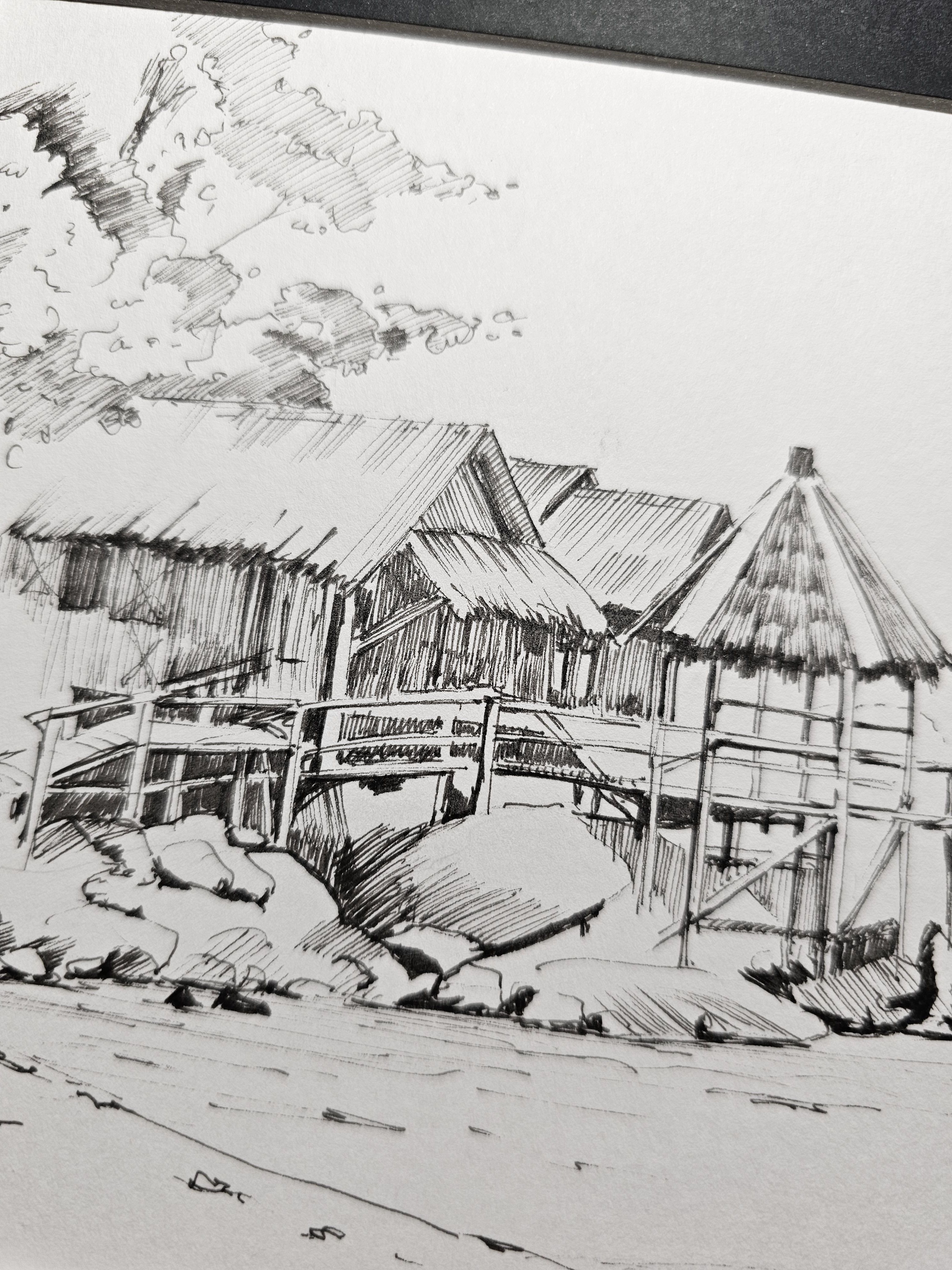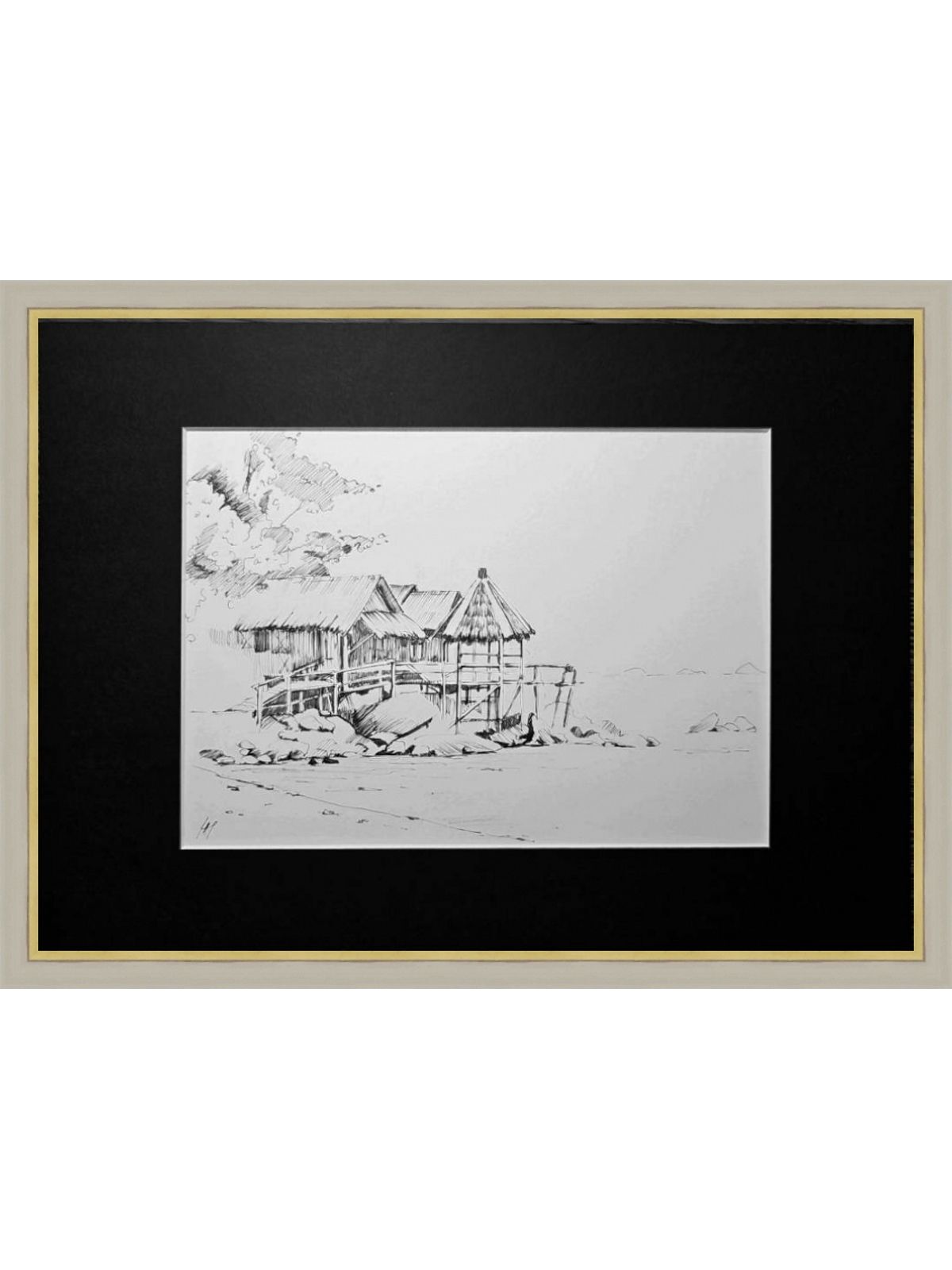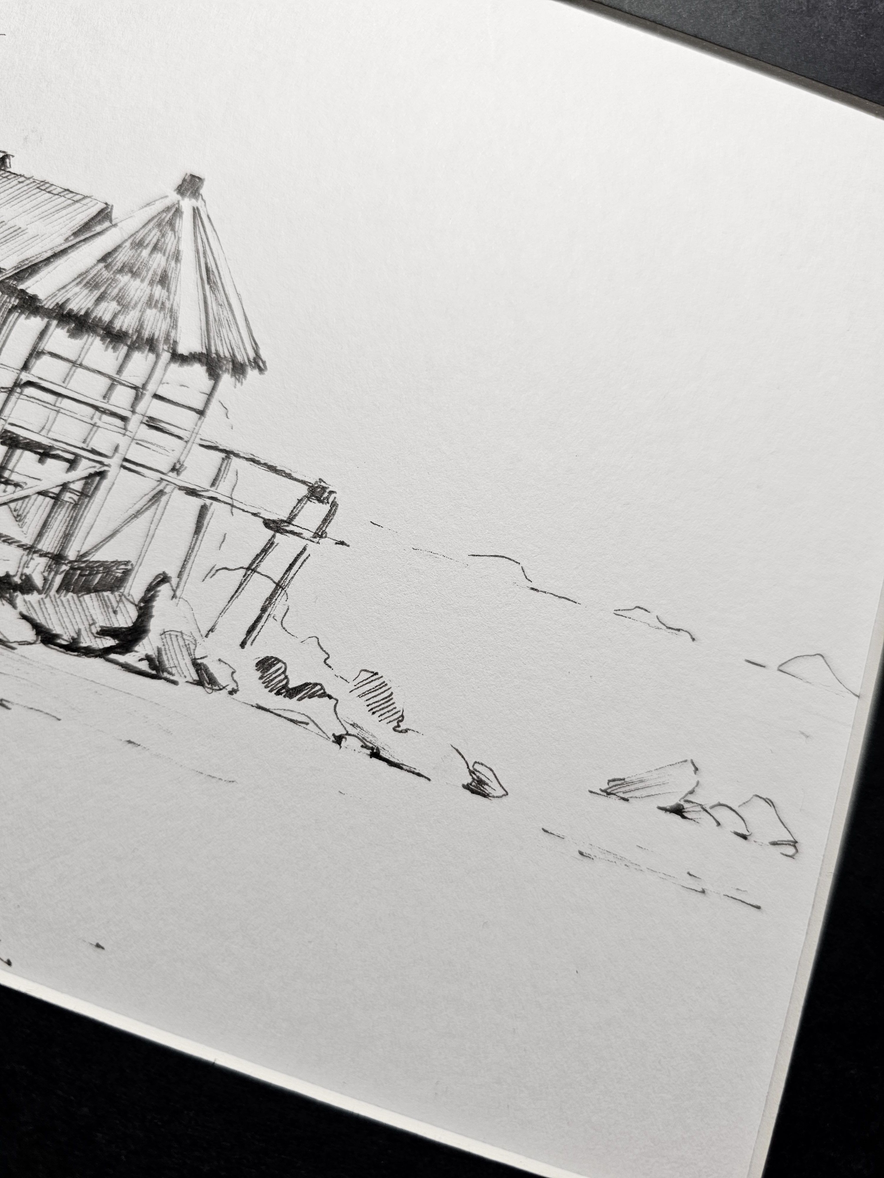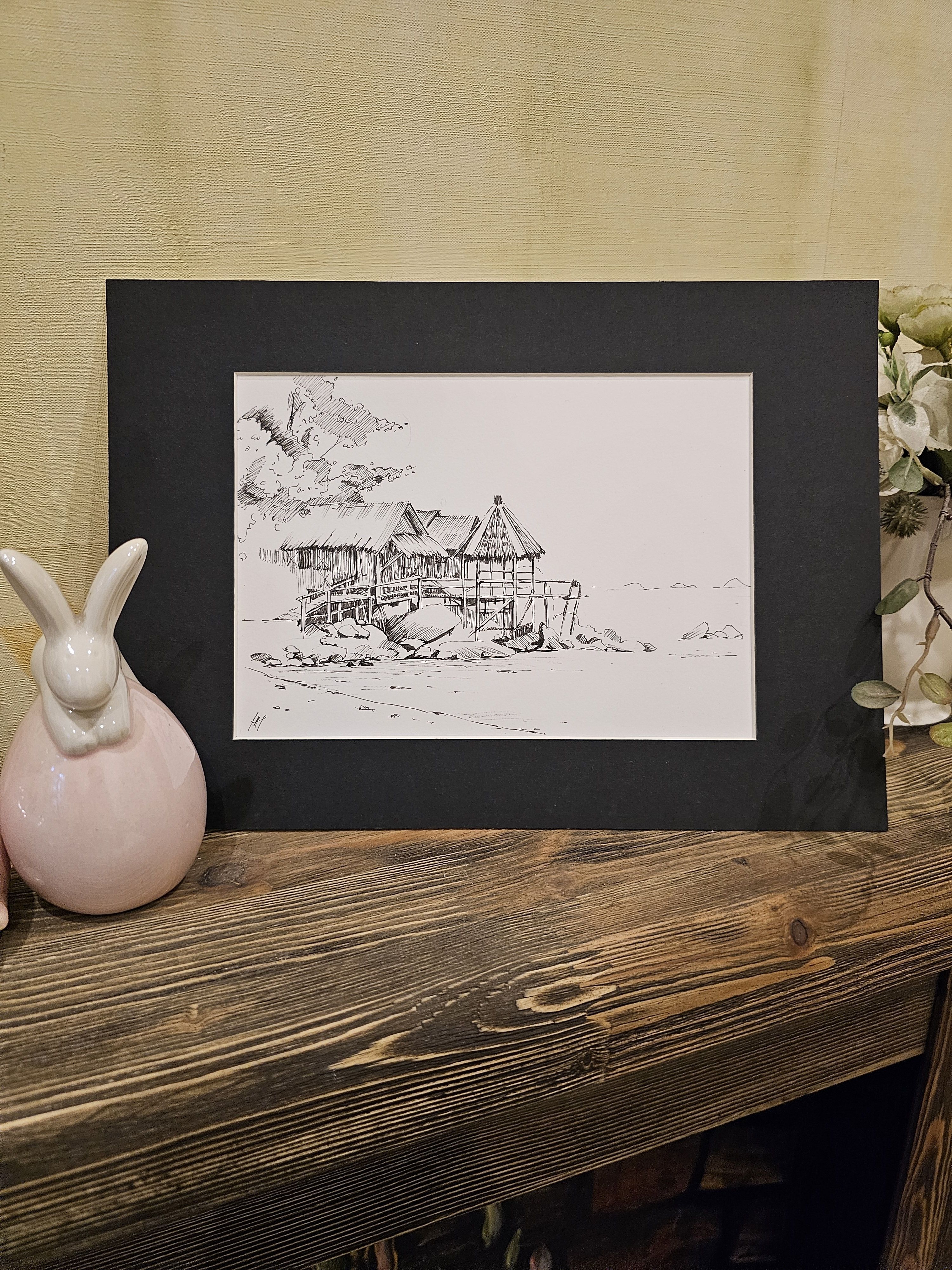 Нам представлена чёрно-белая графическая картина, на которой изображена деревянная хижина с соломенной крышей. Хижина расположена на возвышении, вероятно, на берегу водоёма, так как видно деревянные сваи и ступени, ведущие к ней. На переднем плане находятся камни и песчаная территория. Слева изображены деревья или кустарники, создающие фон для хижины. Атмосфера рисунка спокойная и слегка деревенская.