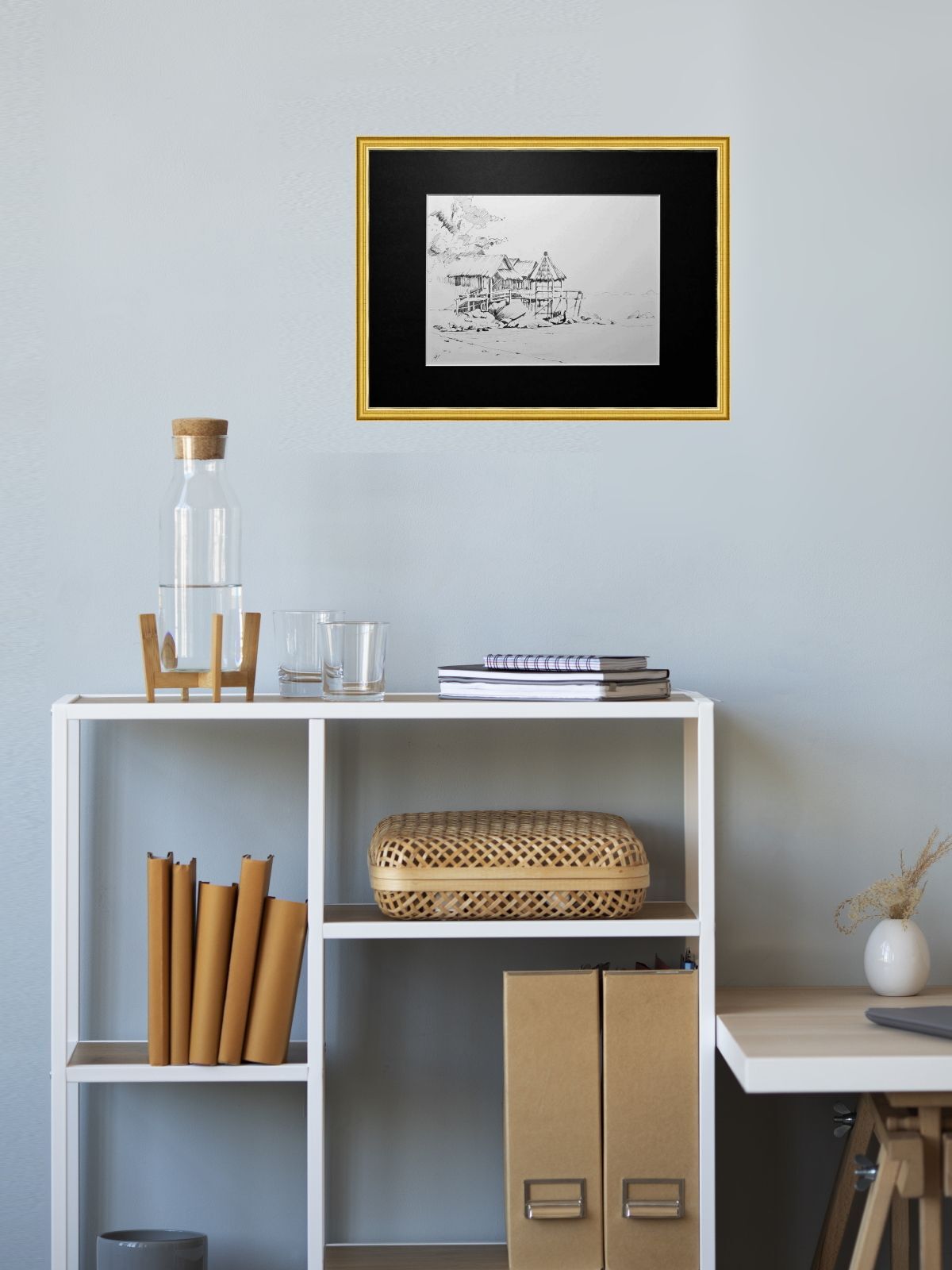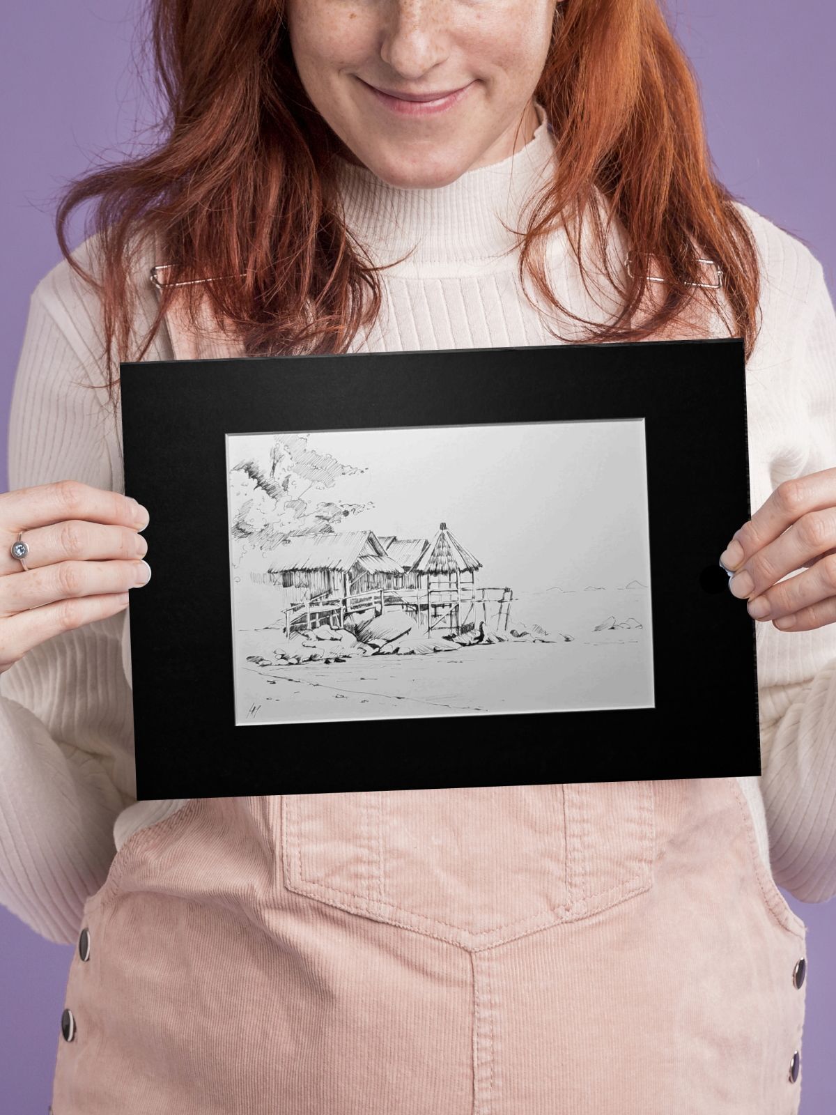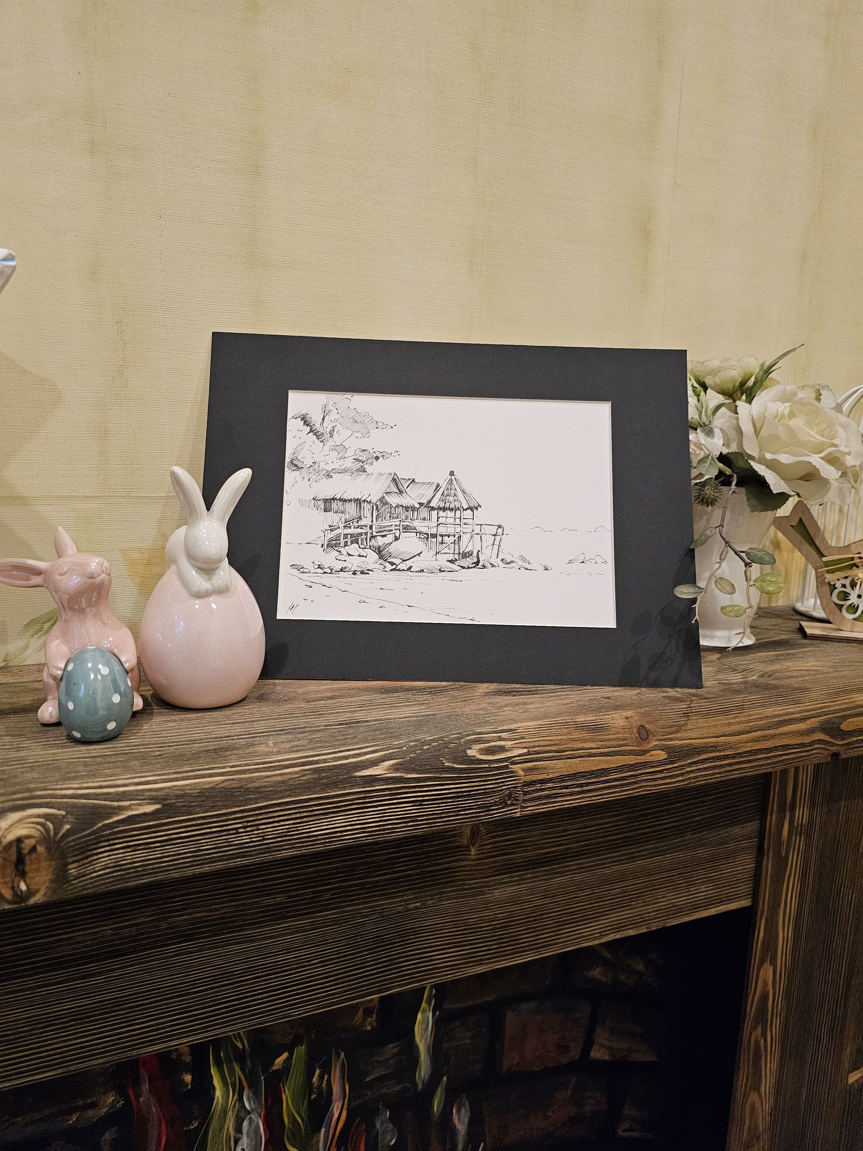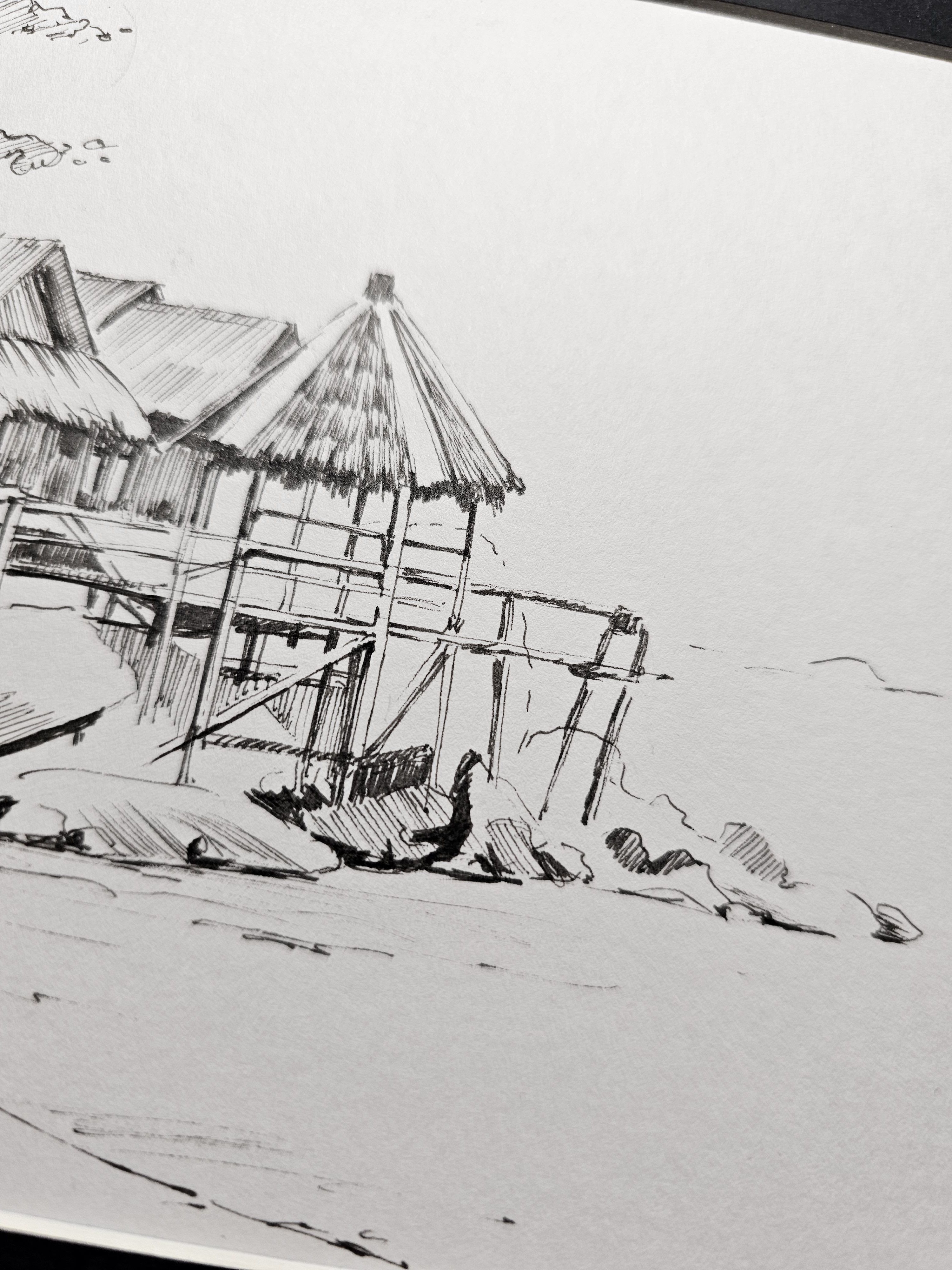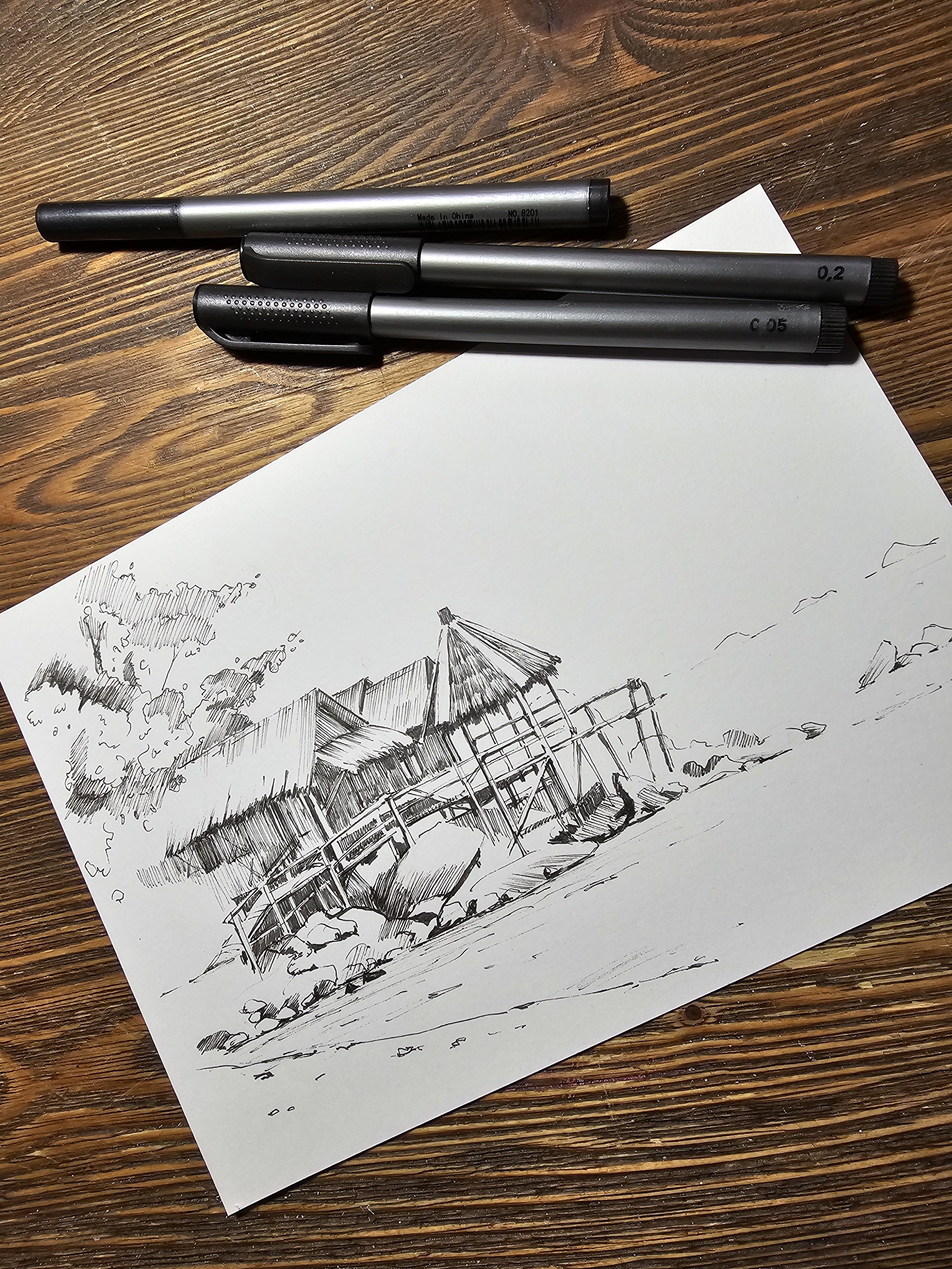 Нам представлена чёрно-белая графическая картина, на которой изображена деревянная хижина с соломенной крышей. Хижина расположена на возвышении, вероятно, на берегу водоёма, так как видно деревянные сваи и ступени, ведущие к ней. На переднем плане находятся камни и песчаная территория. Слева изображены деревья или кустарники, создающие фон для хижины. Атмосфера рисунка спокойная и слегка деревенская.