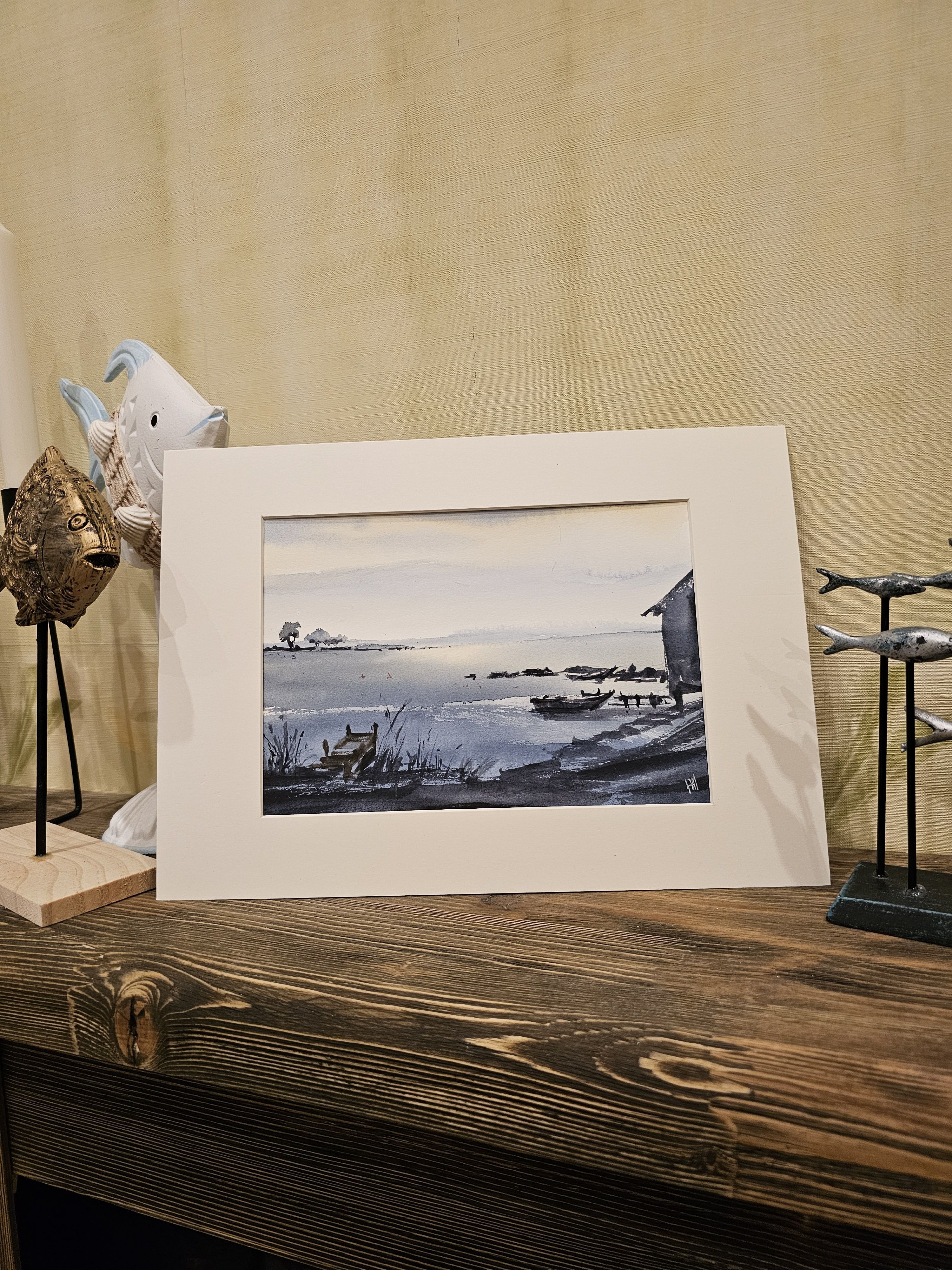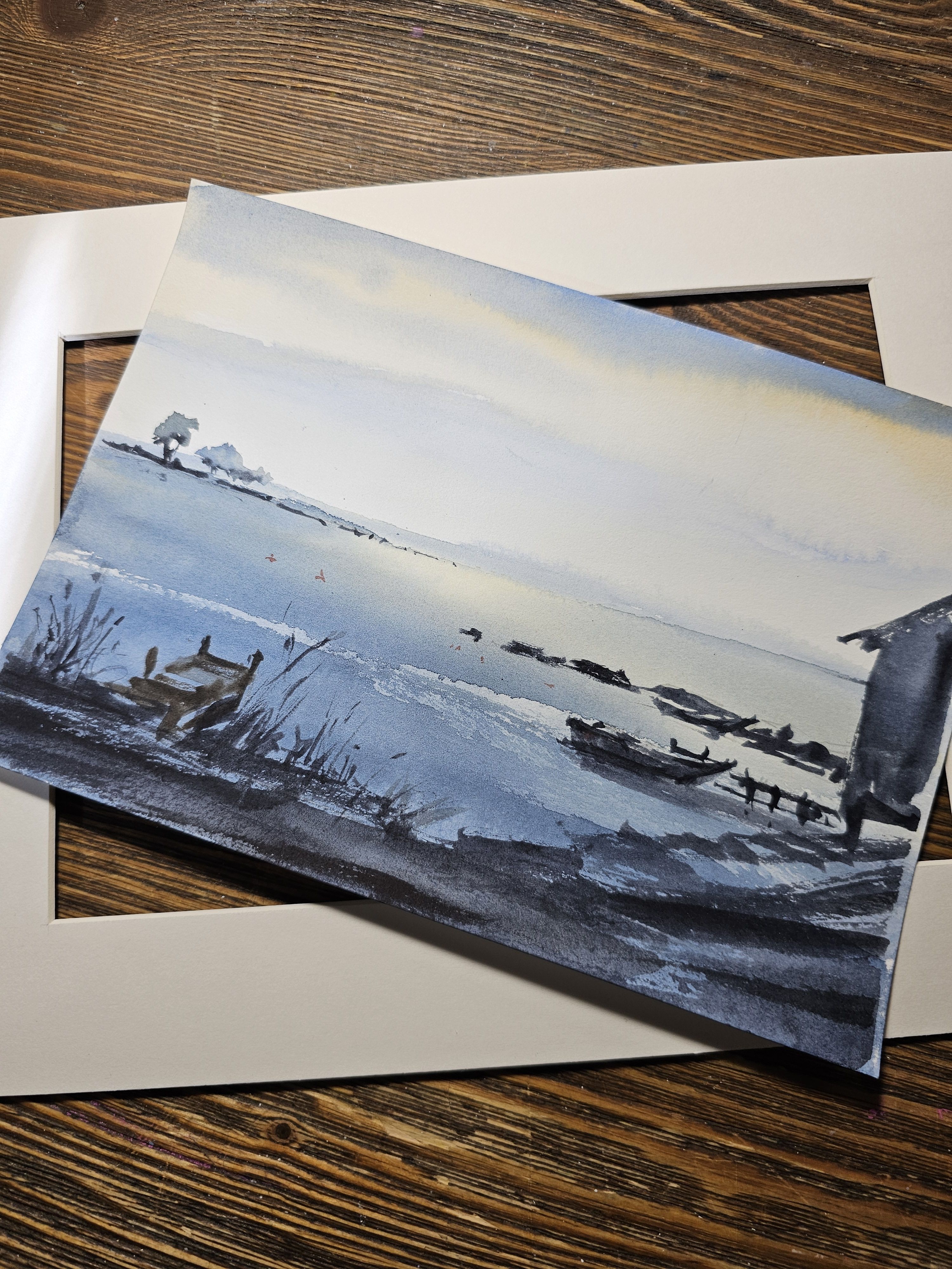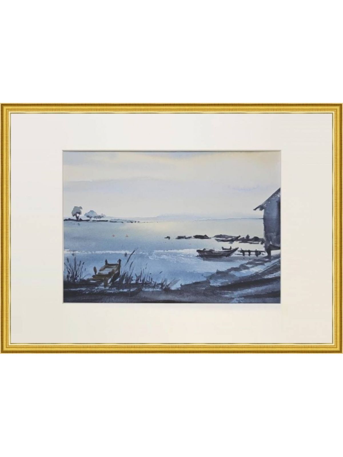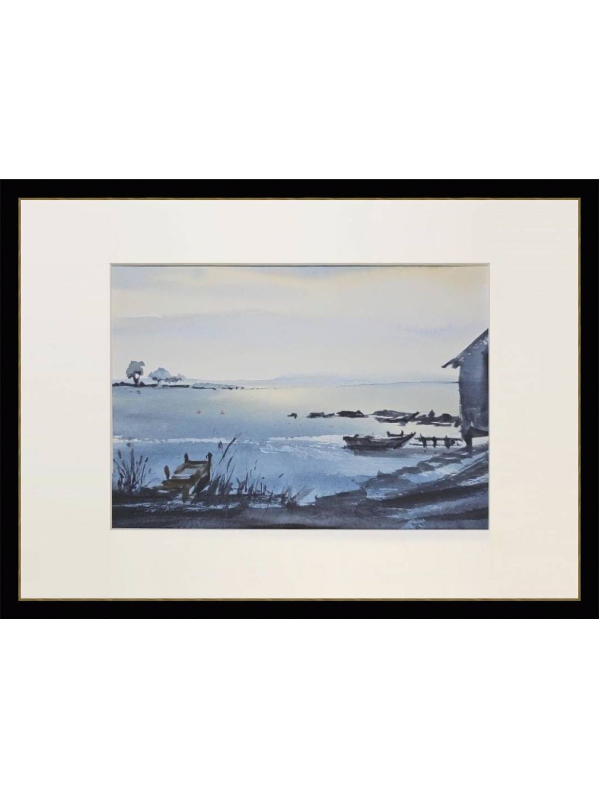 Нам представлена акварельная картина с пейзажем. В центре композиции находится спокойная водная поверхность, которая простирается к горизонту. На переднем плане слева виден небольшой деревянный причал, окруженный высокой травой и растительностью. Справа изображена часть деревянного строения, предположительно домик на берегу. На воде расположены несколько лодок. На горизонте вдали виднеется часть ландшафта с деревьями и кустарниками. Картина выполнена в холодных голубых и серых тонах, создавая атмосферу спокойствия и умиротворения.