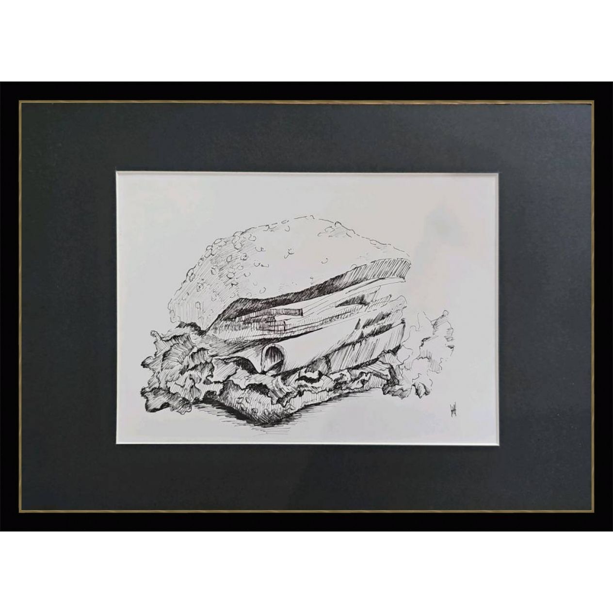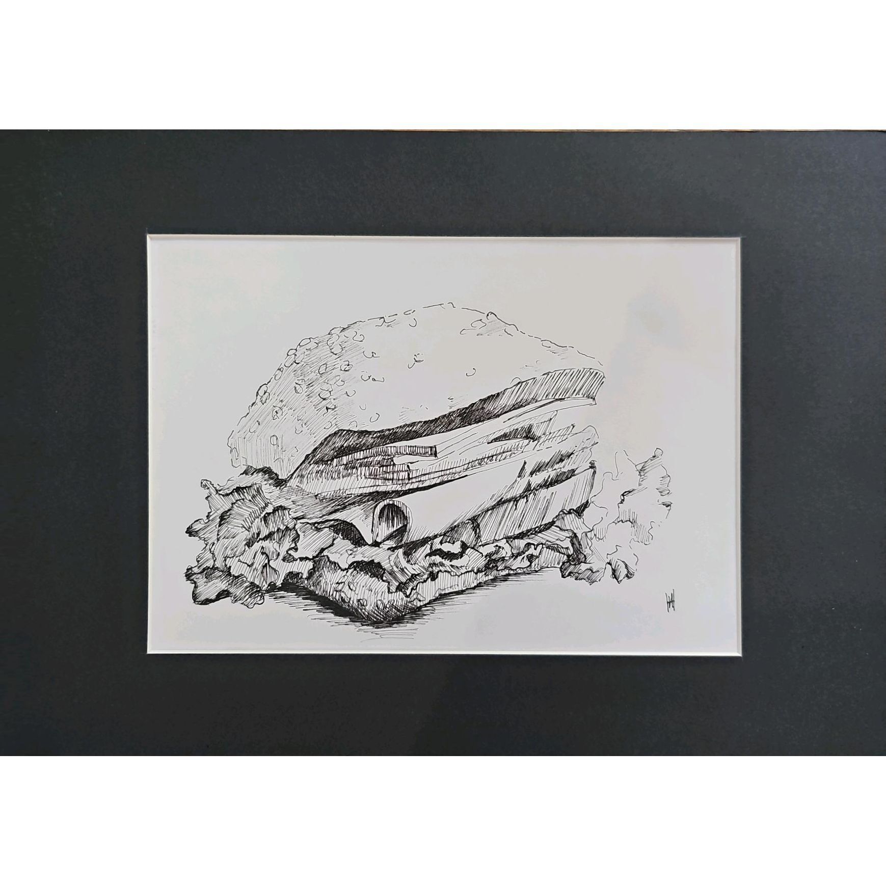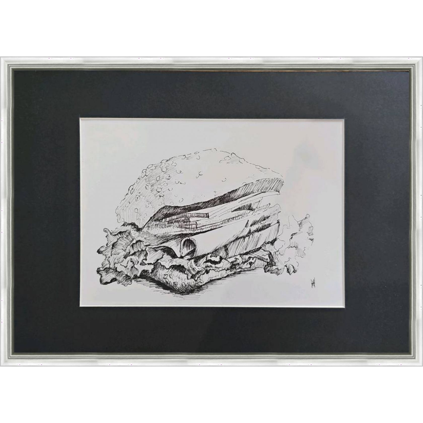 Нам представлен рисунок в графике, выполненный черными чернилами, на котором изображен гамбургер. Сэндвич состоит из двух частей булочки с кунжутом, между которыми находятся листья салата, ломтики сыра, мяса и, возможно, овощи. Изображение находится в темном паспарту. Рисунок выполнен в реалистичном стиле с применением детальной штриховки для выделения текстуры и контуров.