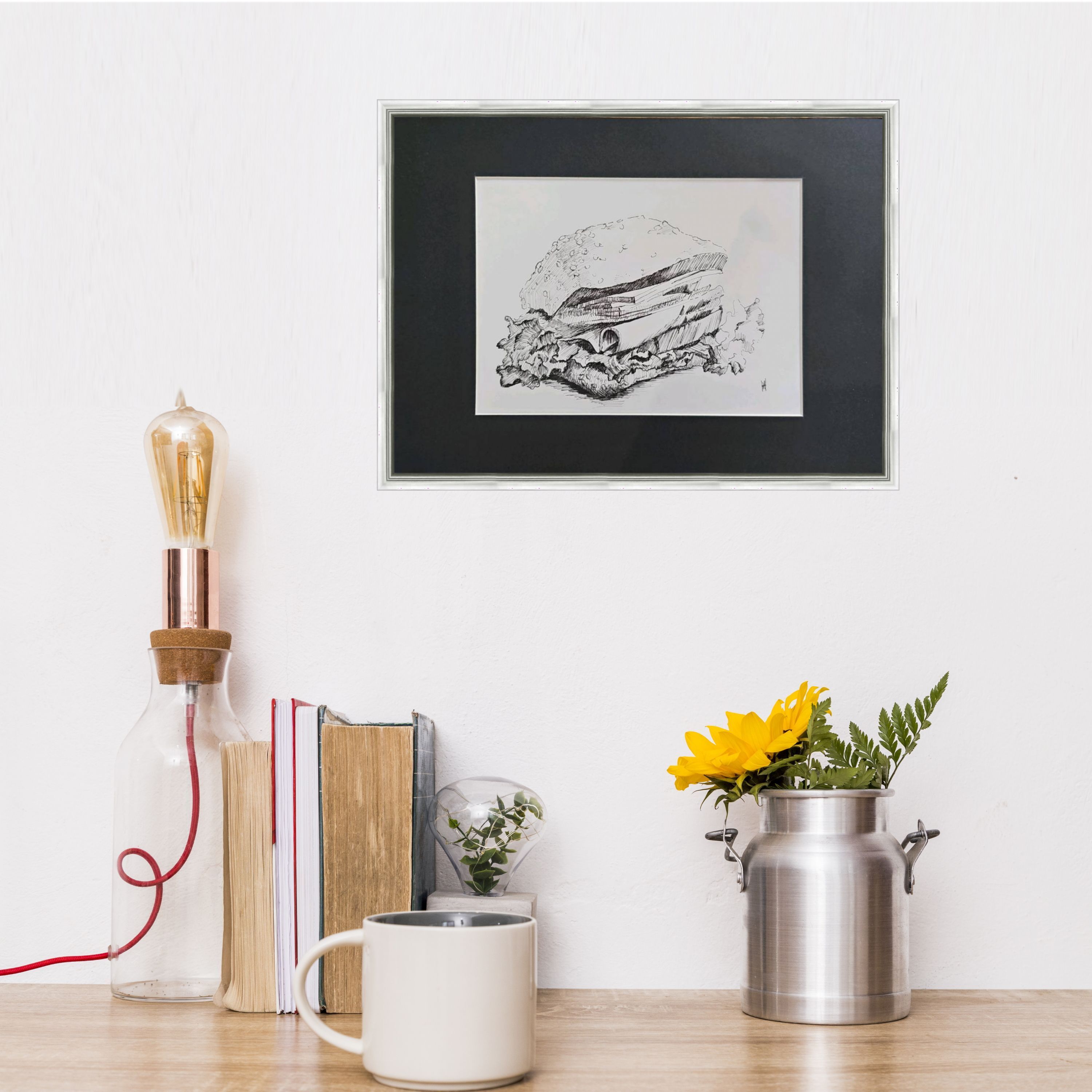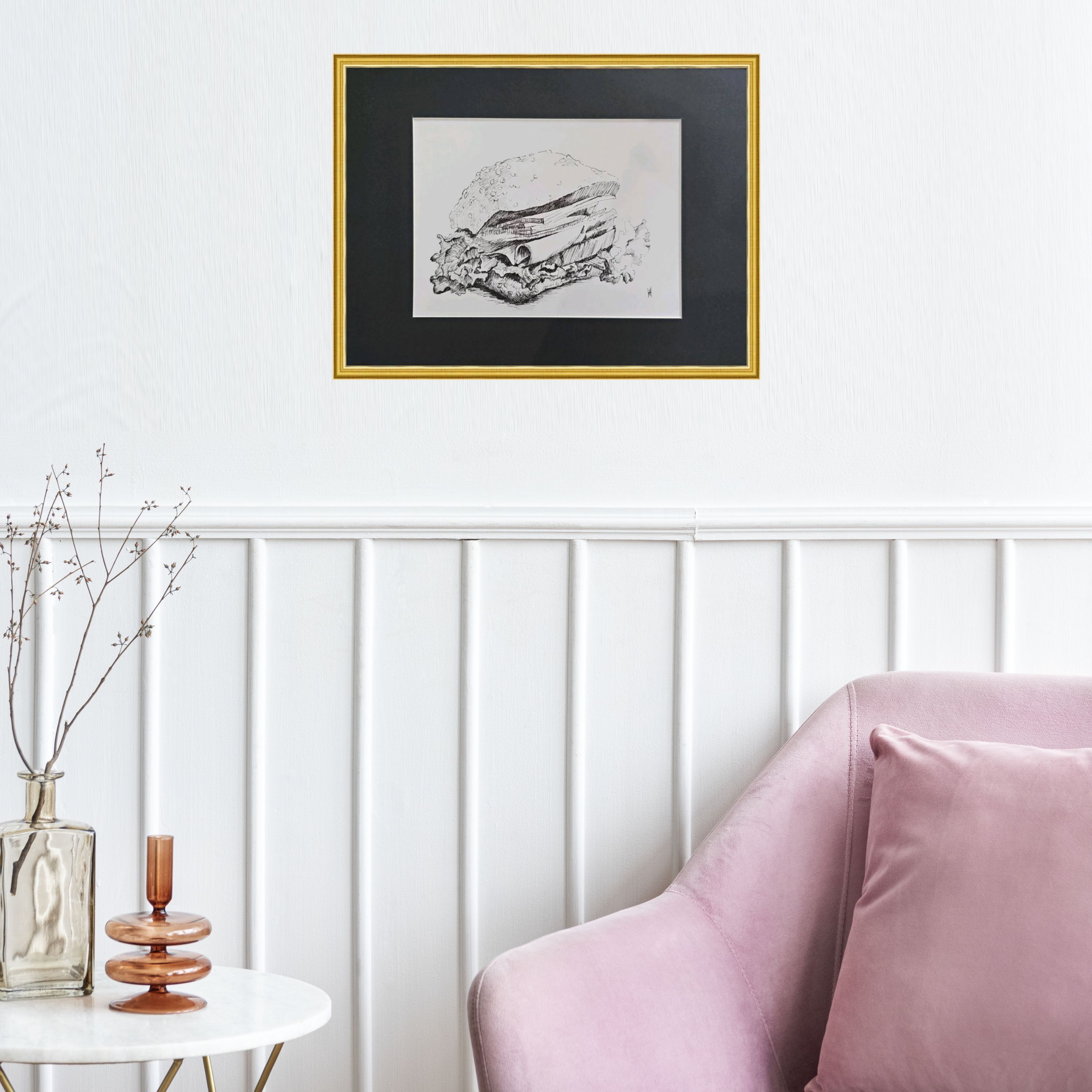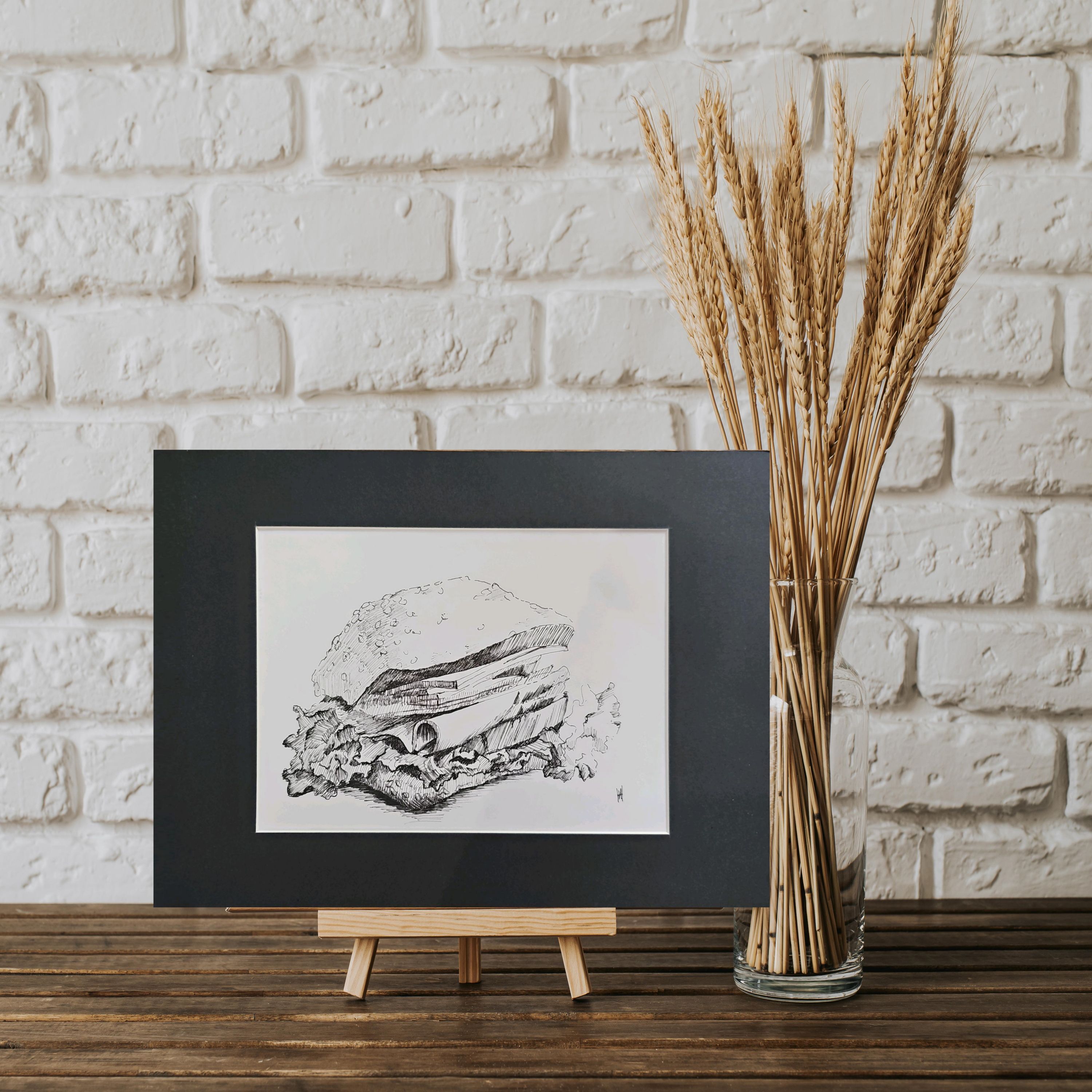 Нам представлен рисунок в графике, выполненный черными чернилами, на котором изображен гамбургер. Сэндвич состоит из двух частей булочки с кунжутом, между которыми находятся листья салата, ломтики сыра, мяса и, возможно, овощи. Изображение находится в темном паспарту. Рисунок выполнен в реалистичном стиле с применением детальной штриховки для выделения текстуры и контуров.