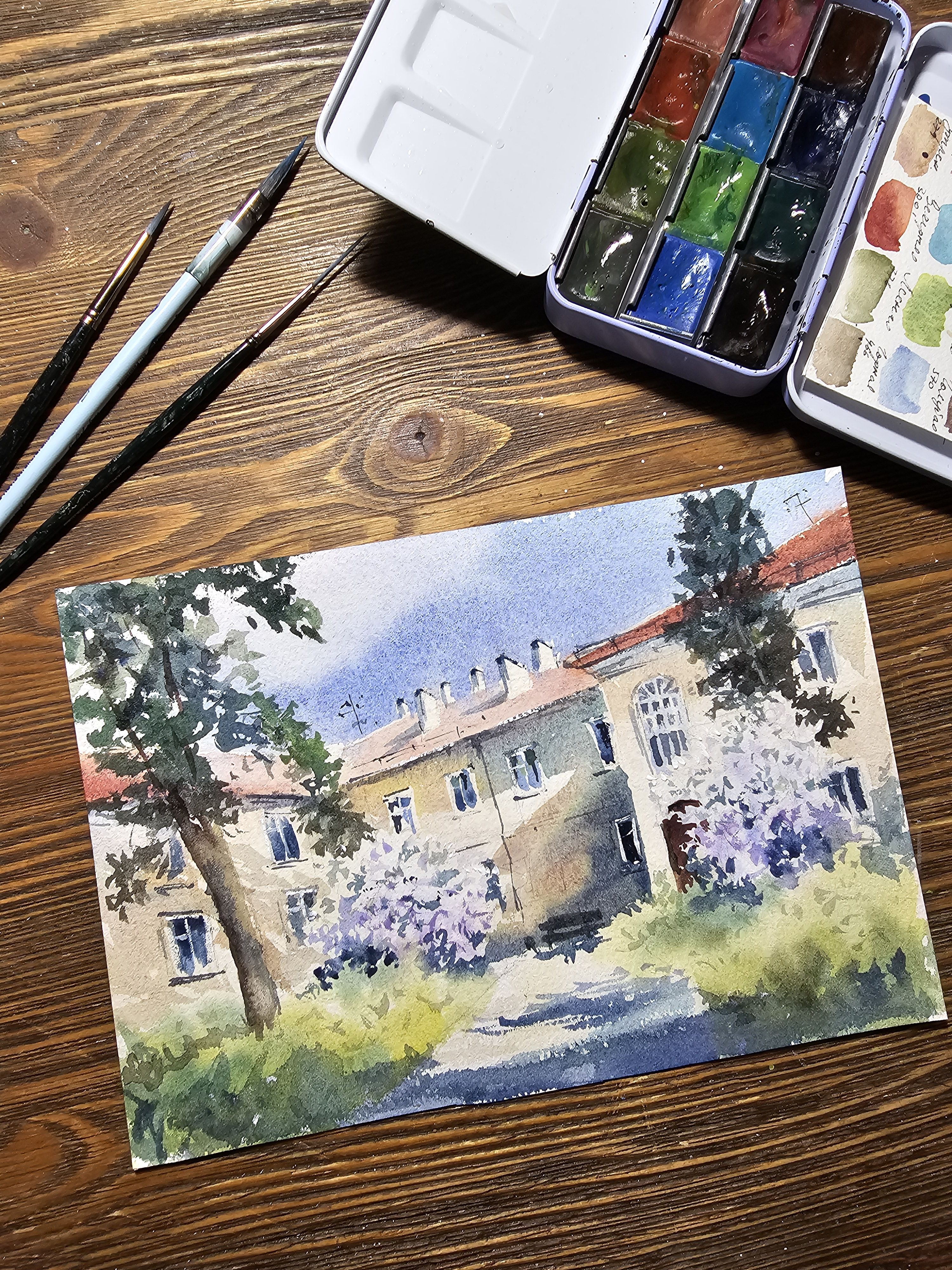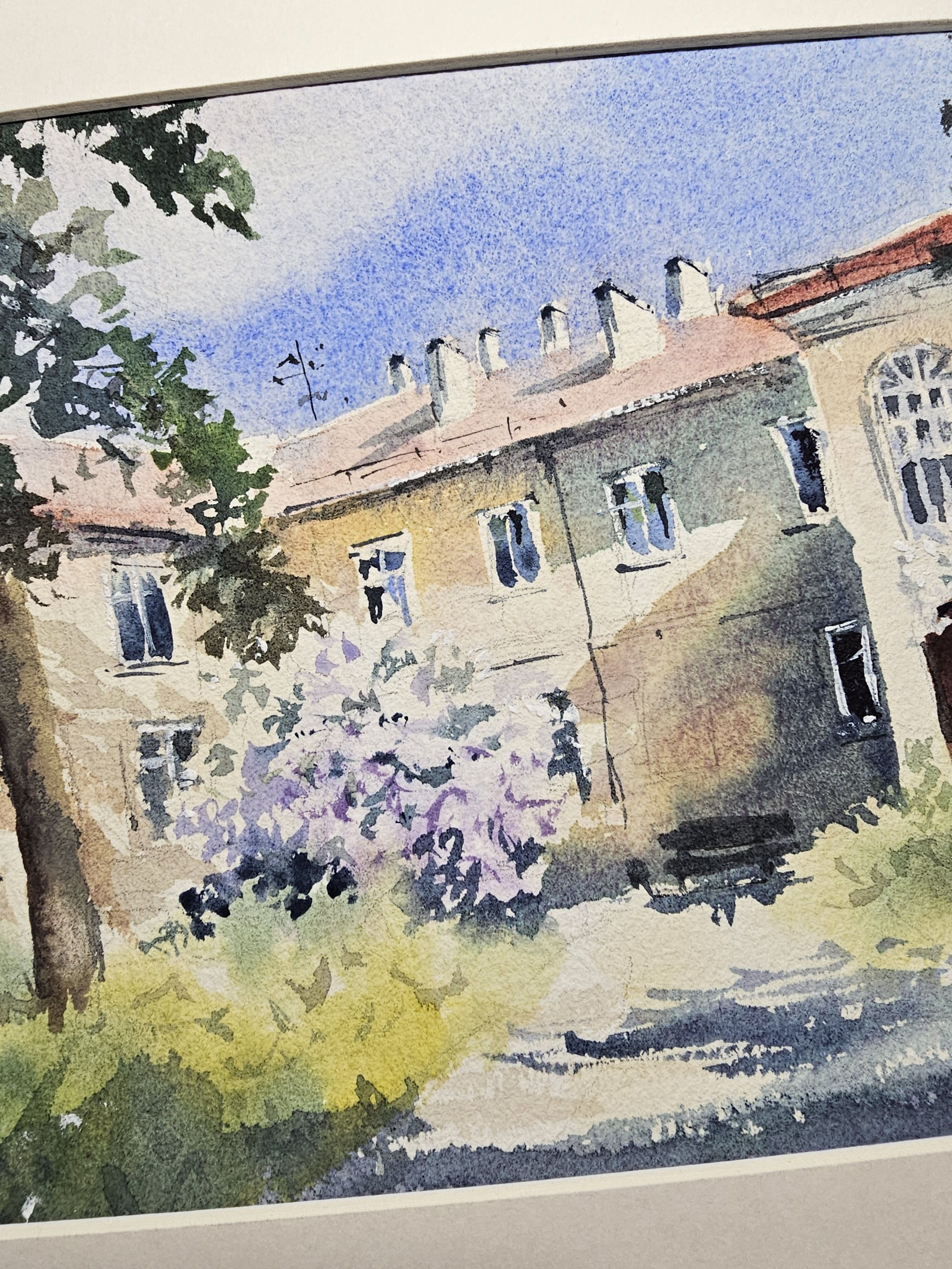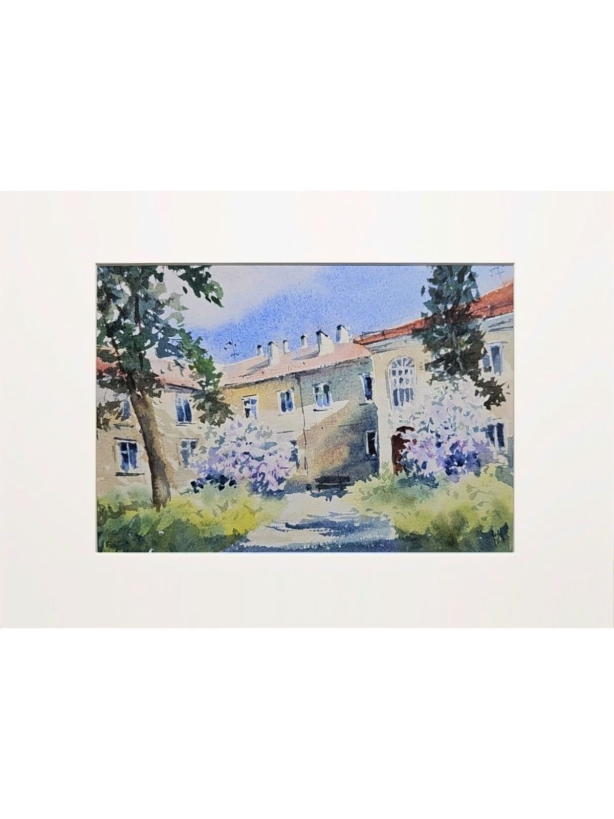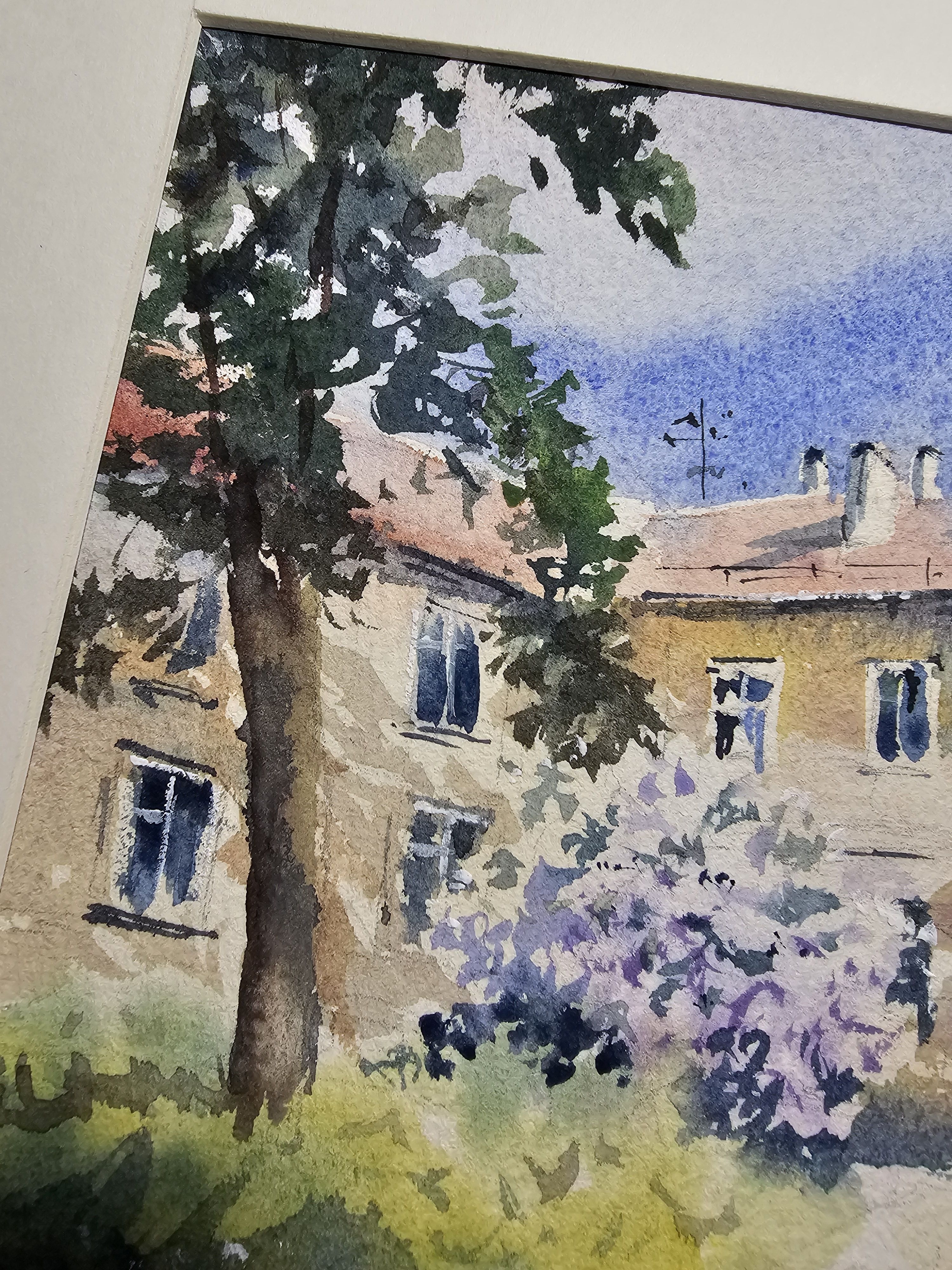 Нам представлена акварельная картина, на которой изображен небольшой дворик с многоквартирным домом на заднем плане. Дом представляет собой светлое здание с красной крышей и несколькими окнами. На переднем плане растут деревья сирени с цветами, создавая впечатление зелёного, ухоженного сада. Небо ясное и голубое, добавляющее свежести и спокойствия в общую атмосферу картины.