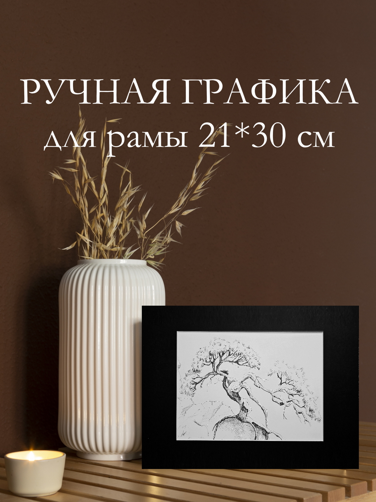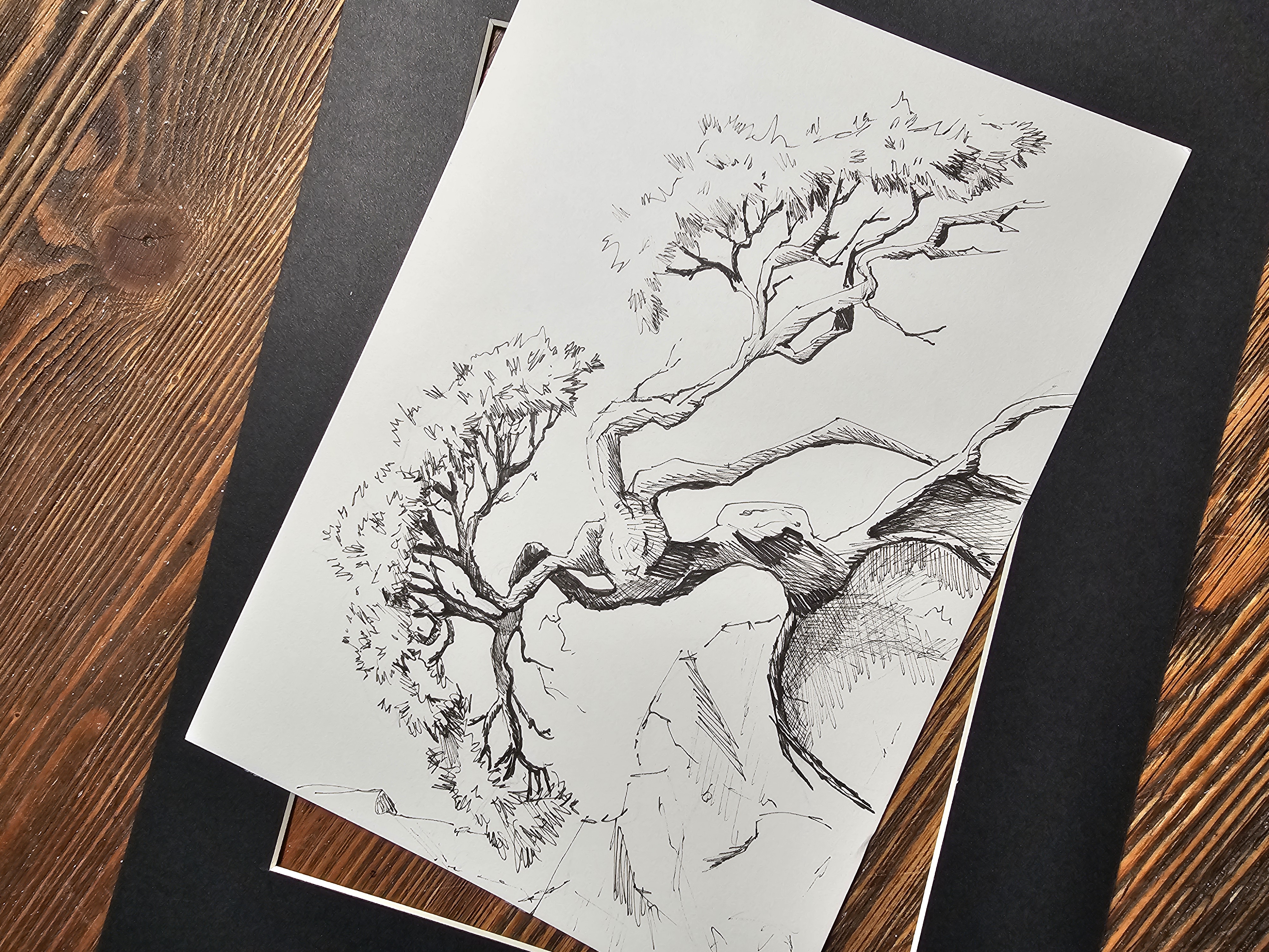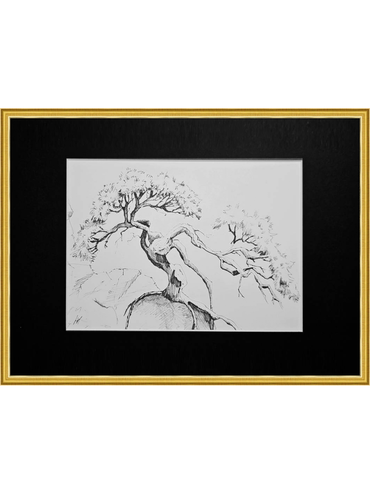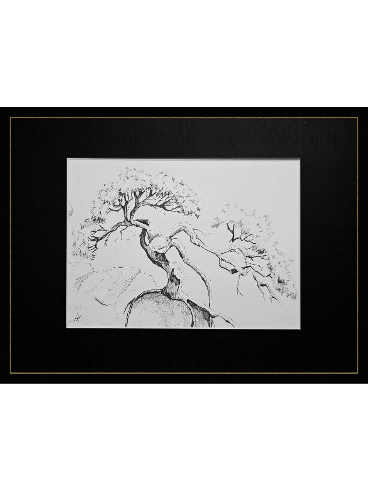 Нам представлена черно-белая графическая картина, изображающая сосну на утесе с изогнутым стволом и ветвями. Дерево имеет густую крону с листвой, нарисованной тонкими линиями. Ствол дерева изогнут и имеет сложную форму, что придаёт ему выразительность. Вокруг дерева видны очертания скал и камней, выполненные в минималистичном стиле. Картина заключена в темное паспарту, которое подчеркивает контрастность изображения.