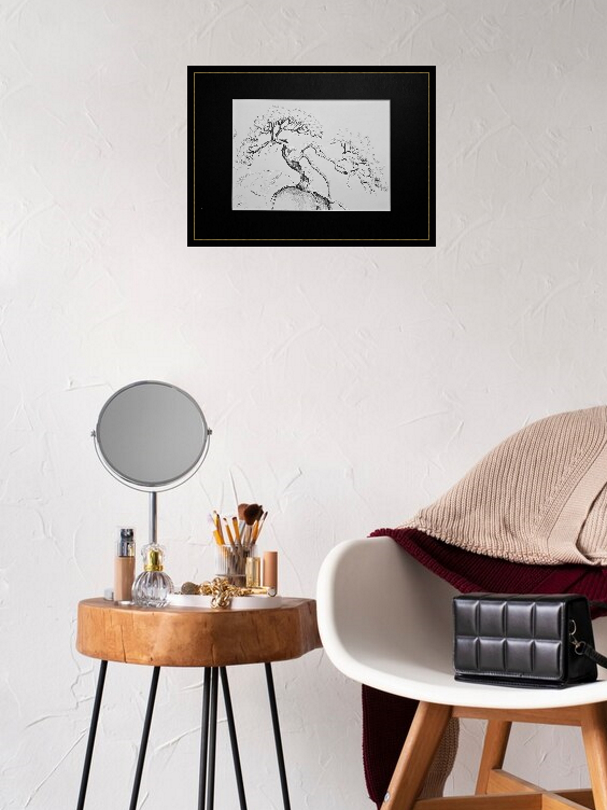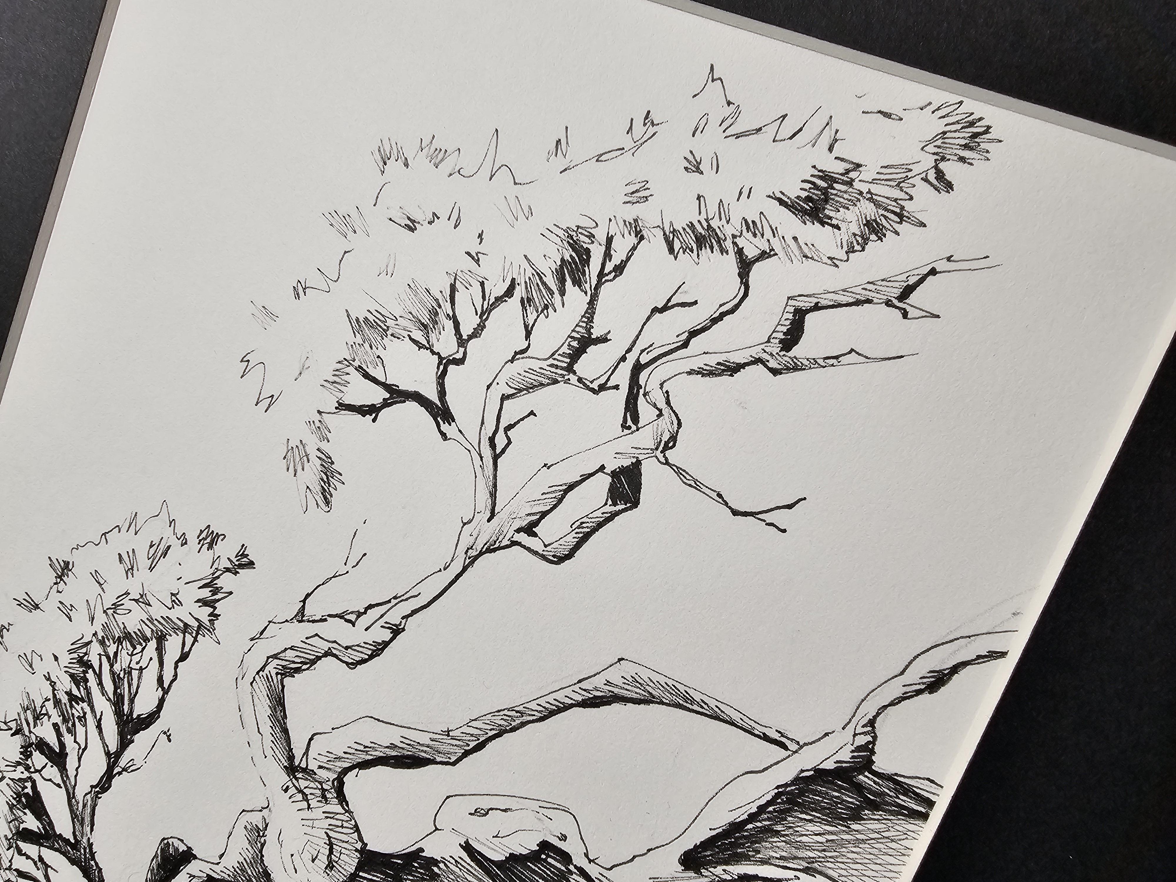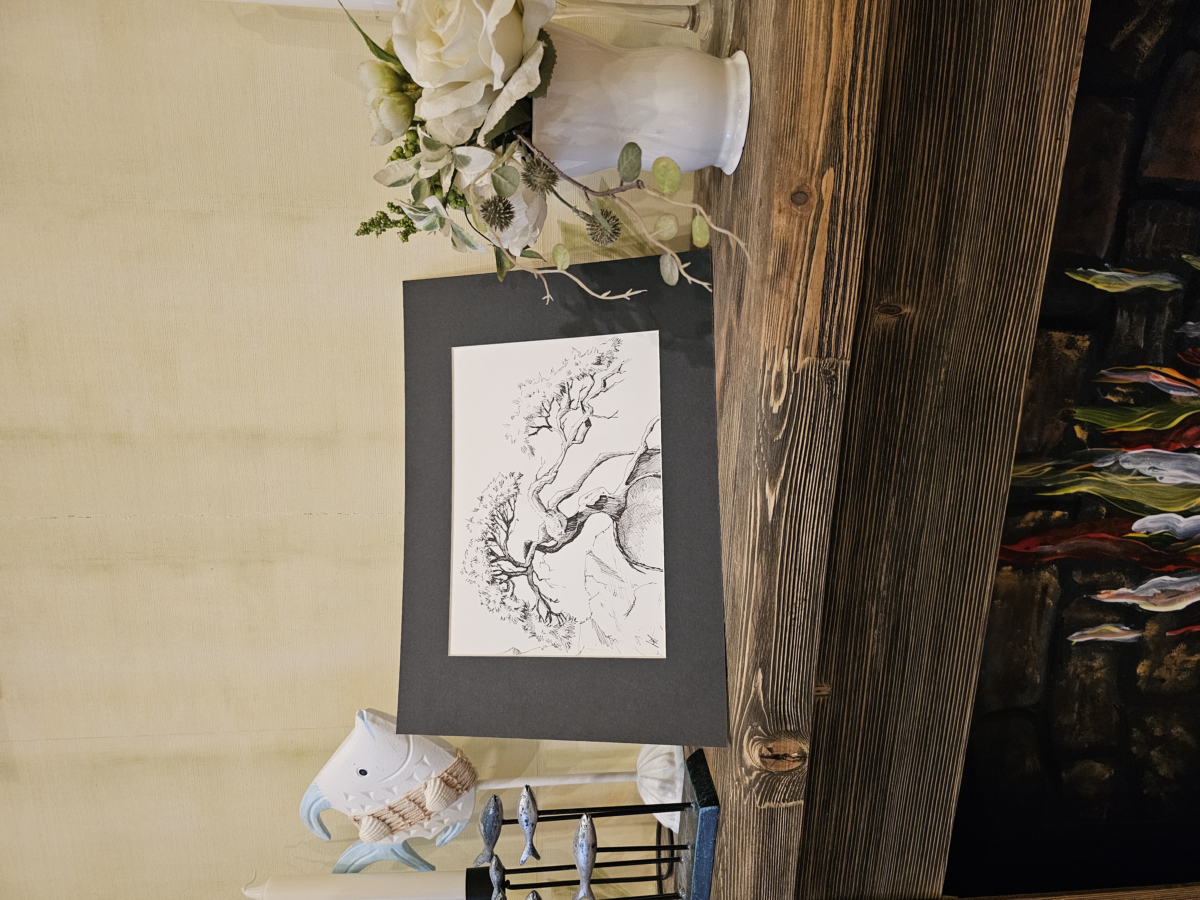 Нам представлена черно-белая графическая картина, изображающая сосну на утесе с изогнутым стволом и ветвями. Дерево имеет густую крону с листвой, нарисованной тонкими линиями. Ствол дерева изогнут и имеет сложную форму, что придаёт ему выразительность. Вокруг дерева видны очертания скал и камней, выполненные в минималистичном стиле. Картина заключена в темное паспарту, которое подчеркивает контрастность изображения.
