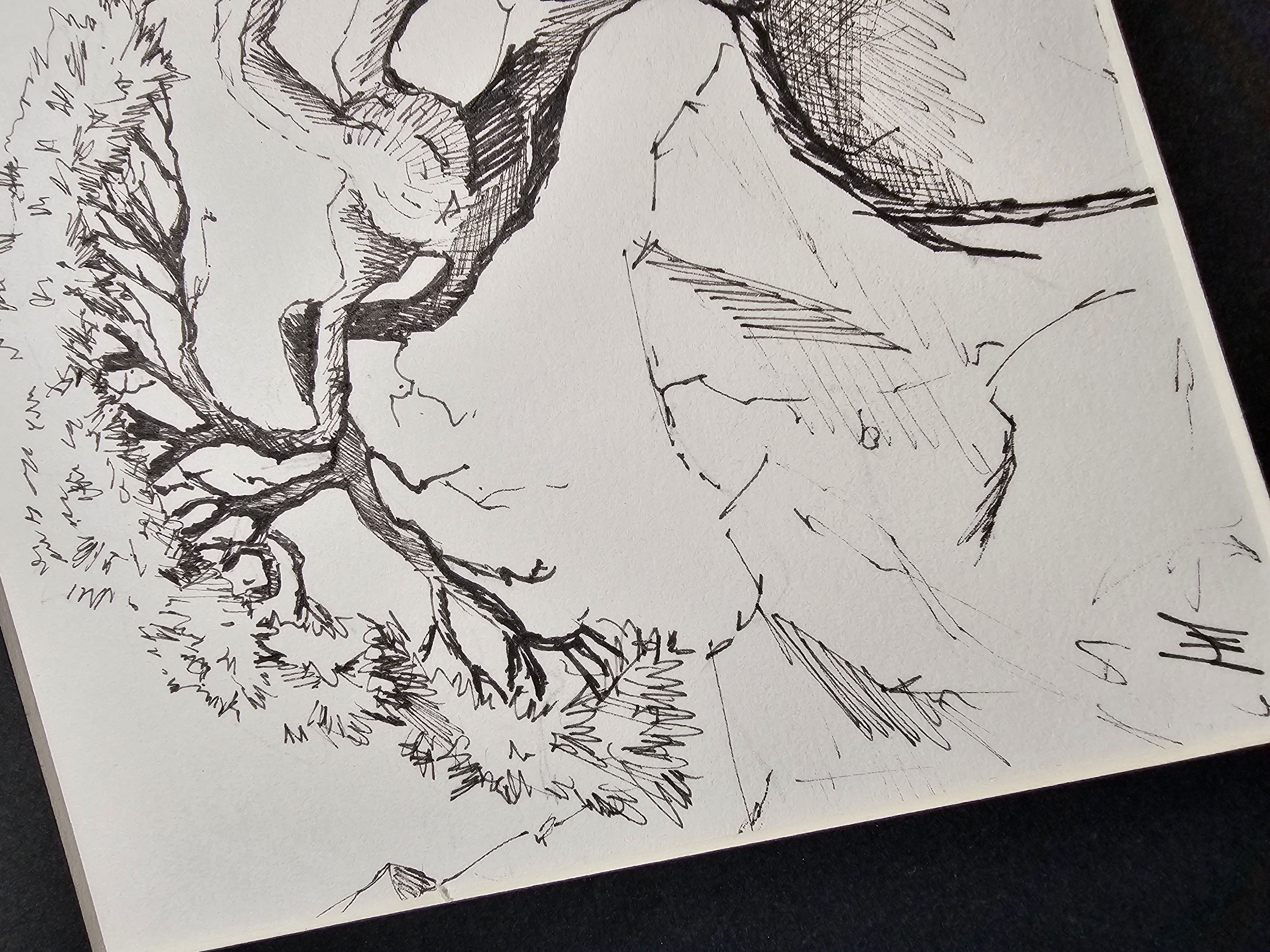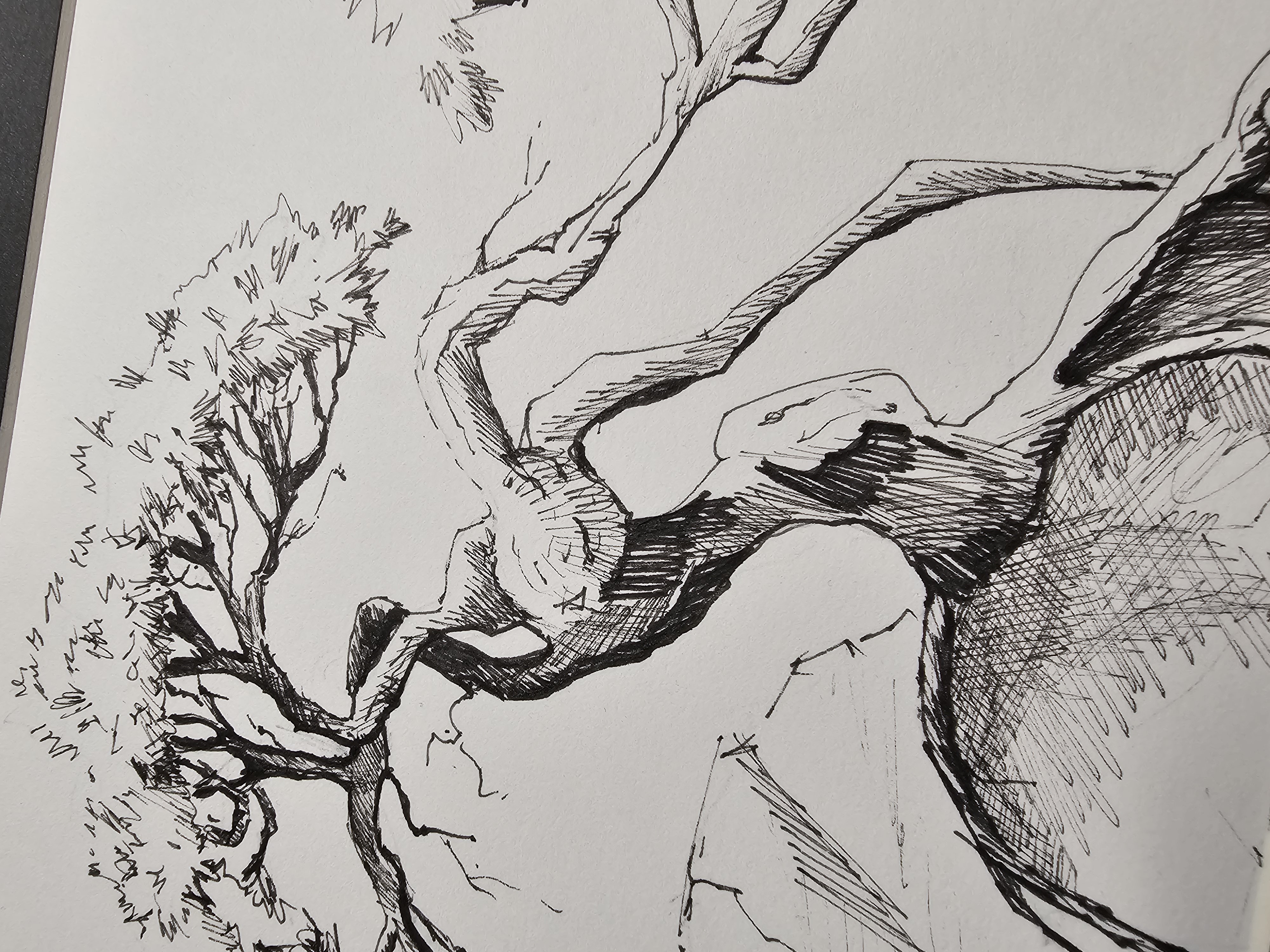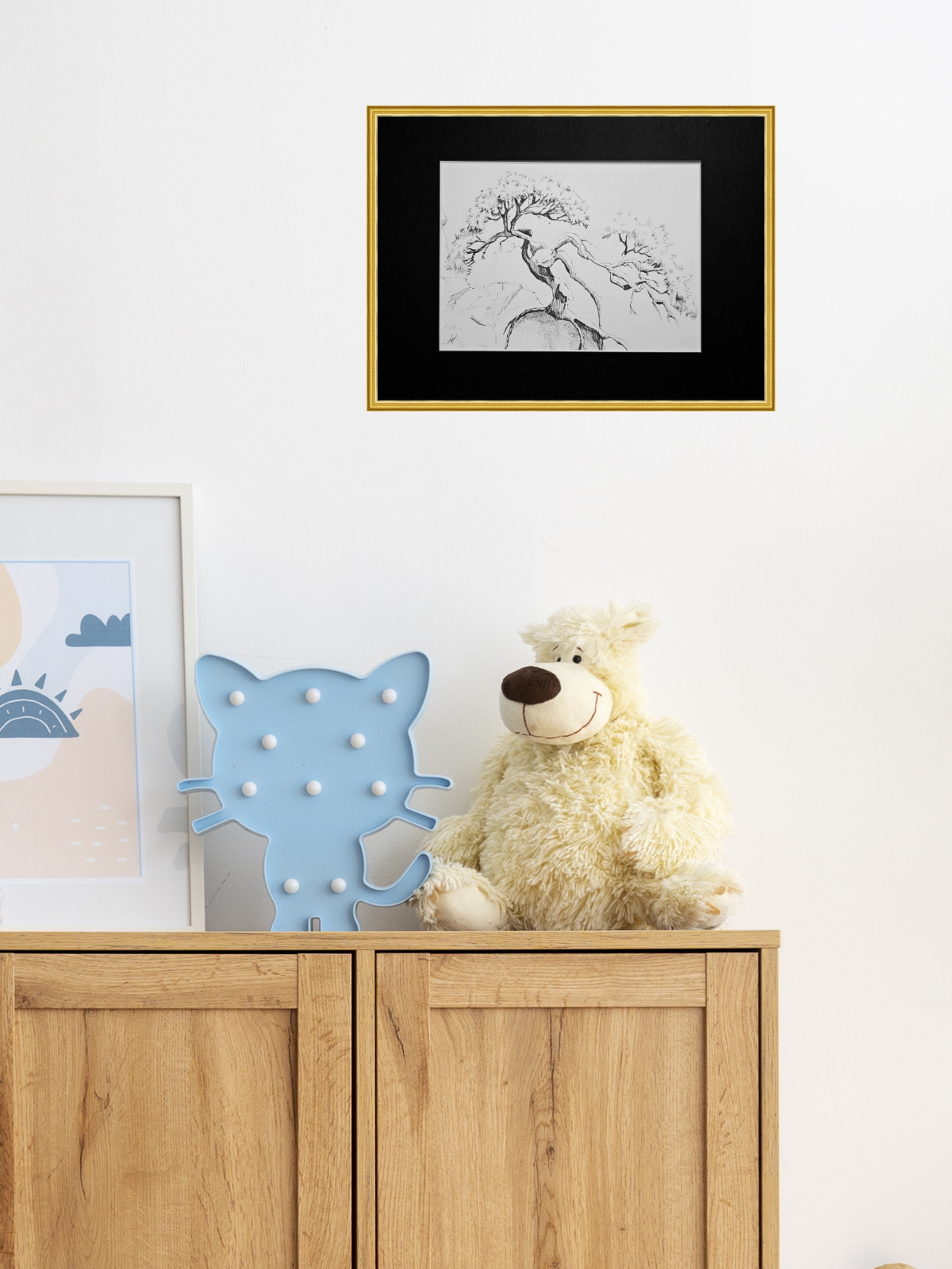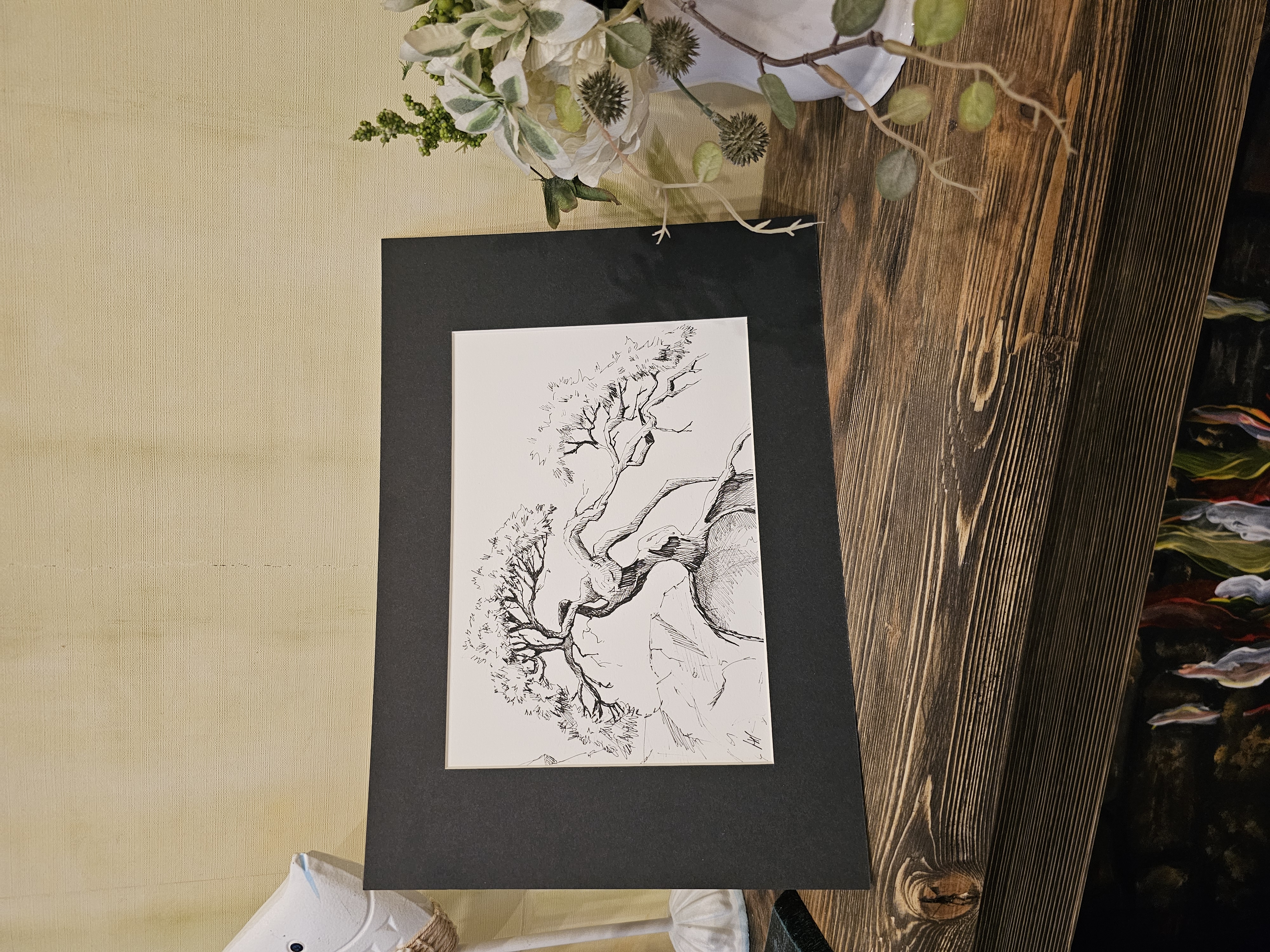 Нам представлена черно-белая графическая картина, изображающая сосну на утесе с изогнутым стволом и ветвями. Дерево имеет густую крону с листвой, нарисованной тонкими линиями. Ствол дерева изогнут и имеет сложную форму, что придаёт ему выразительность. Вокруг дерева видны очертания скал и камней, выполненные в минималистичном стиле. Картина заключена в темное паспарту, которое подчеркивает контрастность изображения.
