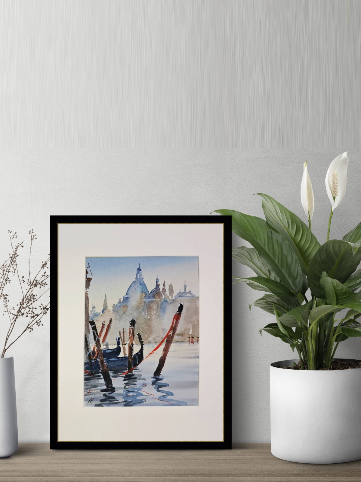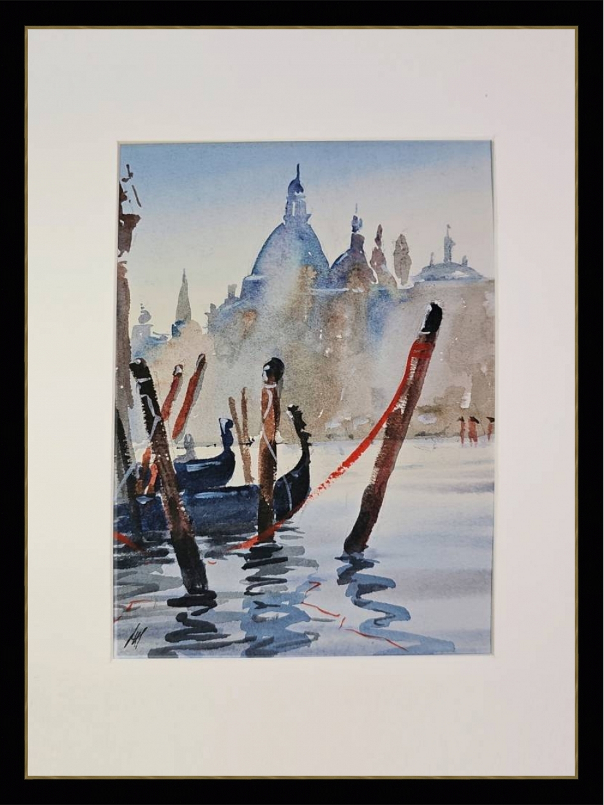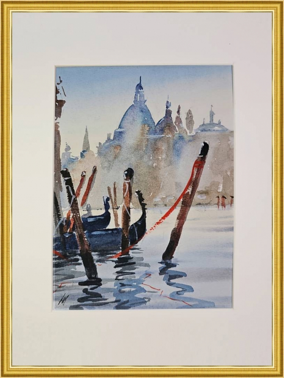 Нам представлена акварельная картина, изображающая венецианский пейзаж. На переднем плане видны гондолы, пришвартованные у деревянных столбов, которые частично погружены в воду. Вода отражает цвета неба и лодок, создавая мягкие оттенки. На заднем плане виден силуэт архитектурных сооружений с куполами и башнями, характерных для Венеции. Картина выполнена в нежных пастельных тонах, с преобладанием голубых и бежевых оттенков, что придаёт ей атмосферу утренней свежести и лёгкой дымки.