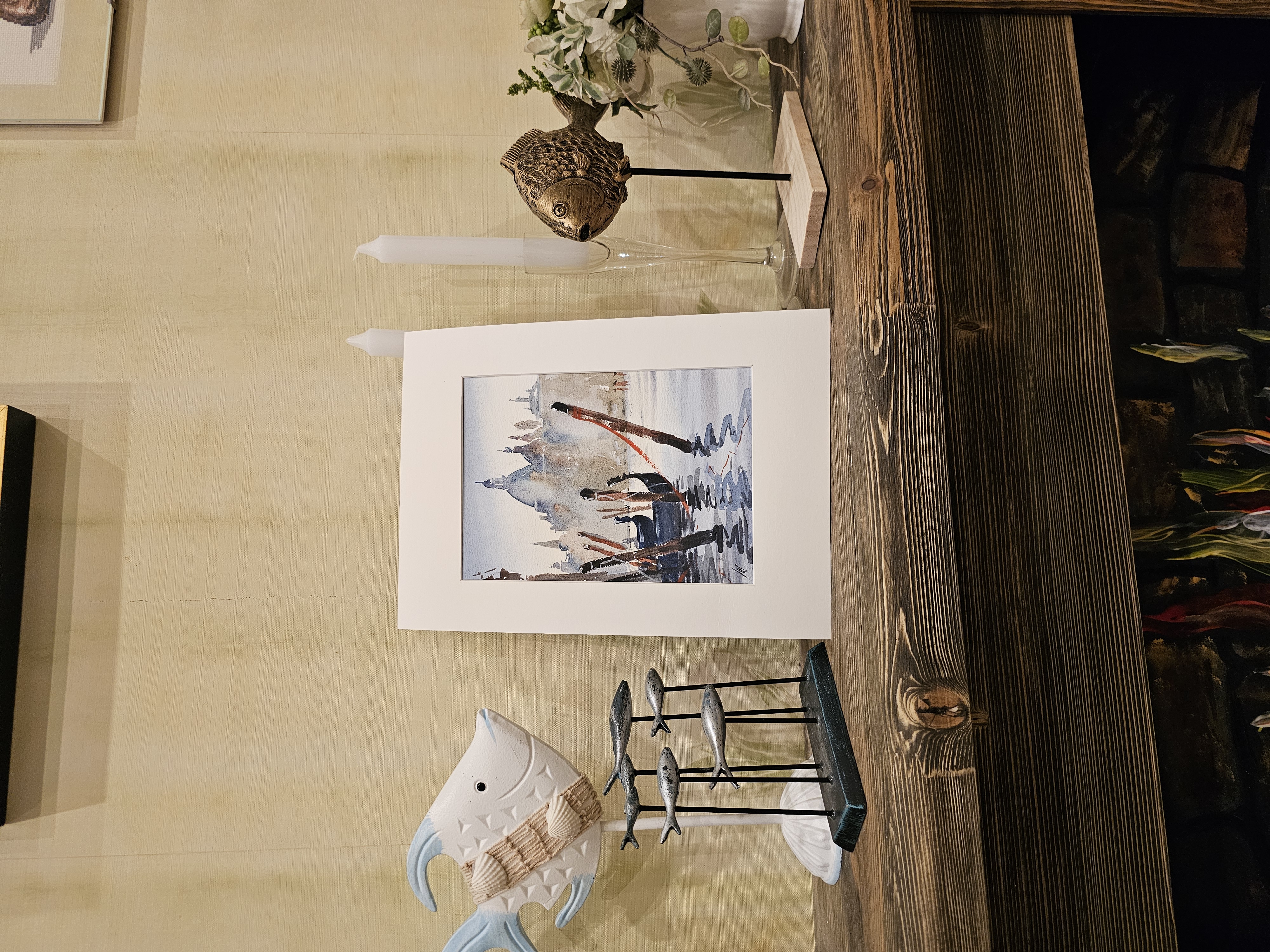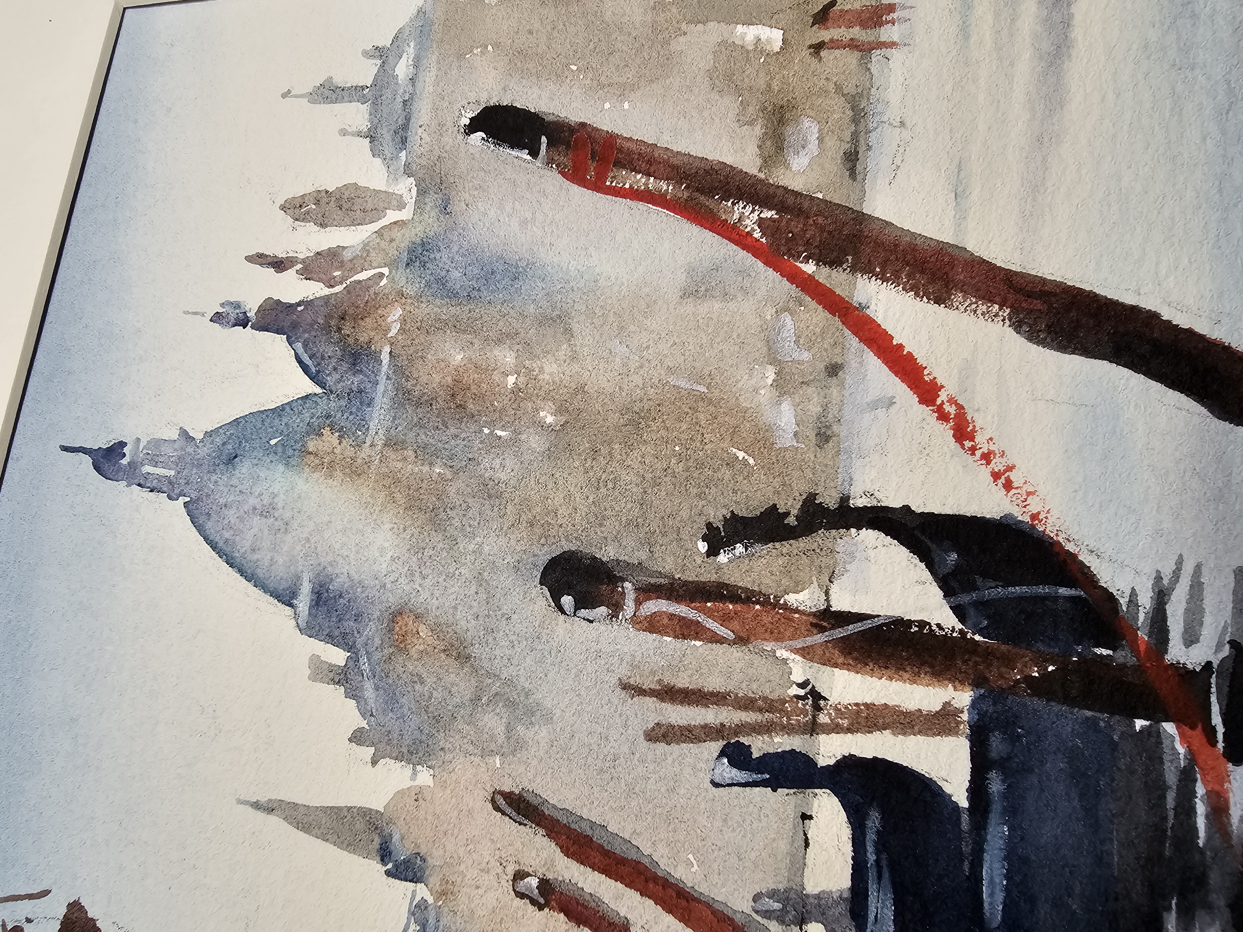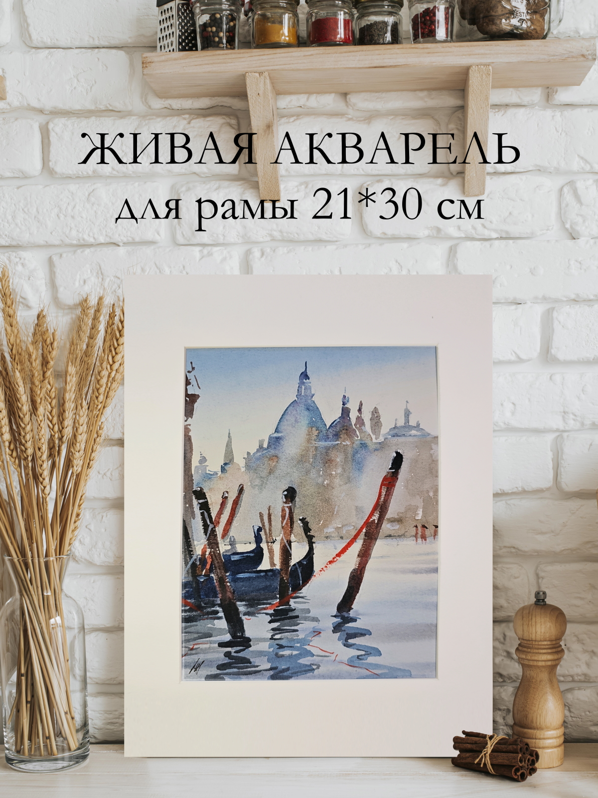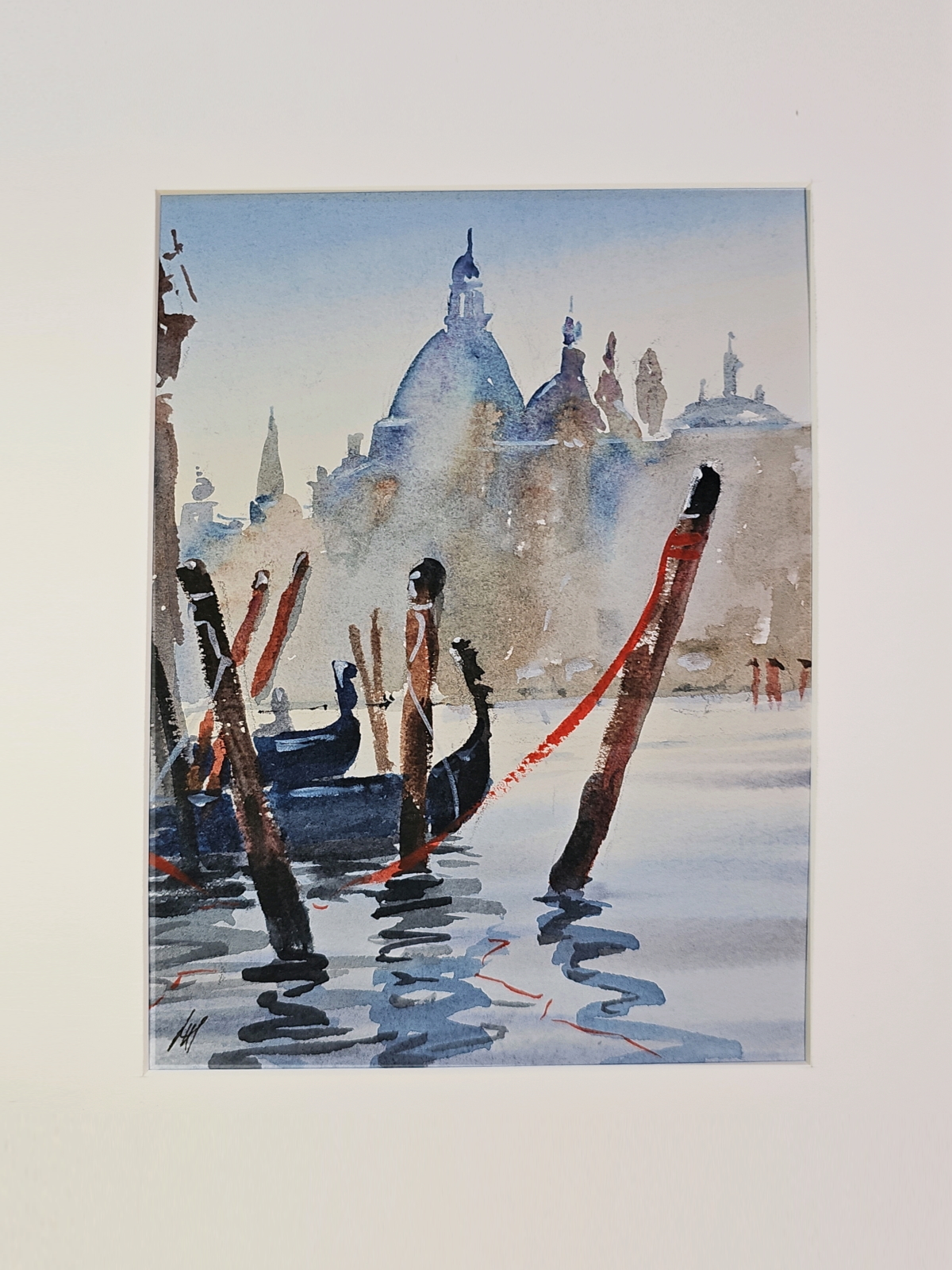 Нам представлена акварельная картина, изображающая венецианский пейзаж. На переднем плане видны гондолы, пришвартованные у деревянных столбов, которые частично погружены в воду. Вода отражает цвета неба и лодок, создавая мягкие оттенки. На заднем плане виден силуэт архитектурных сооружений с куполами и башнями, характерных для Венеции. Картина выполнена в нежных пастельных тонах, с преобладанием голубых и бежевых оттенков, что придаёт ей атмосферу утренней свежести и лёгкой дымки.