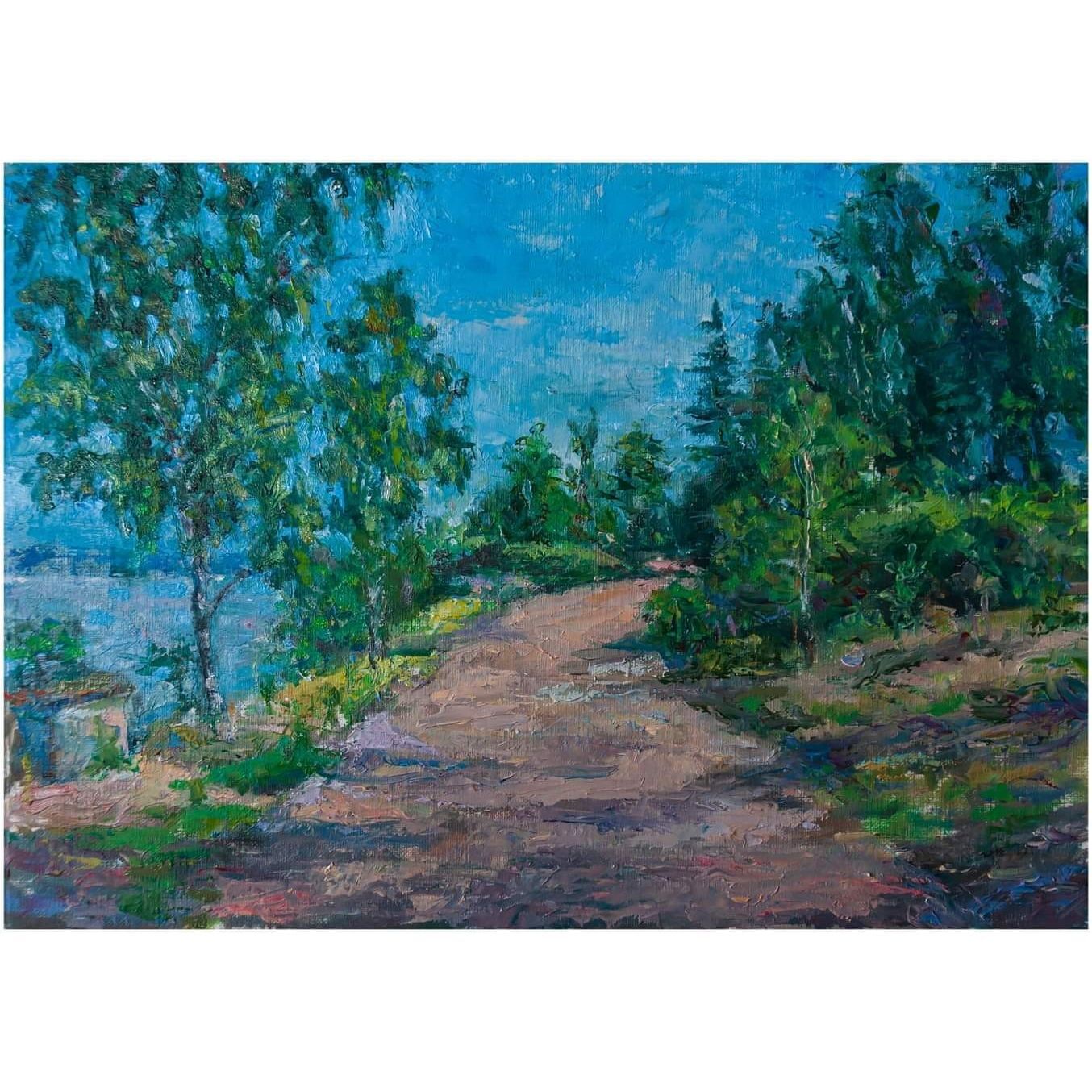 На живописной картине, выполненной масляными красками мы видим пейзаж: дорогу, идущую вдоль берега водоёма. Небо ясное, почти безоблачное и окрашено в различные оттенки голубого цвета.