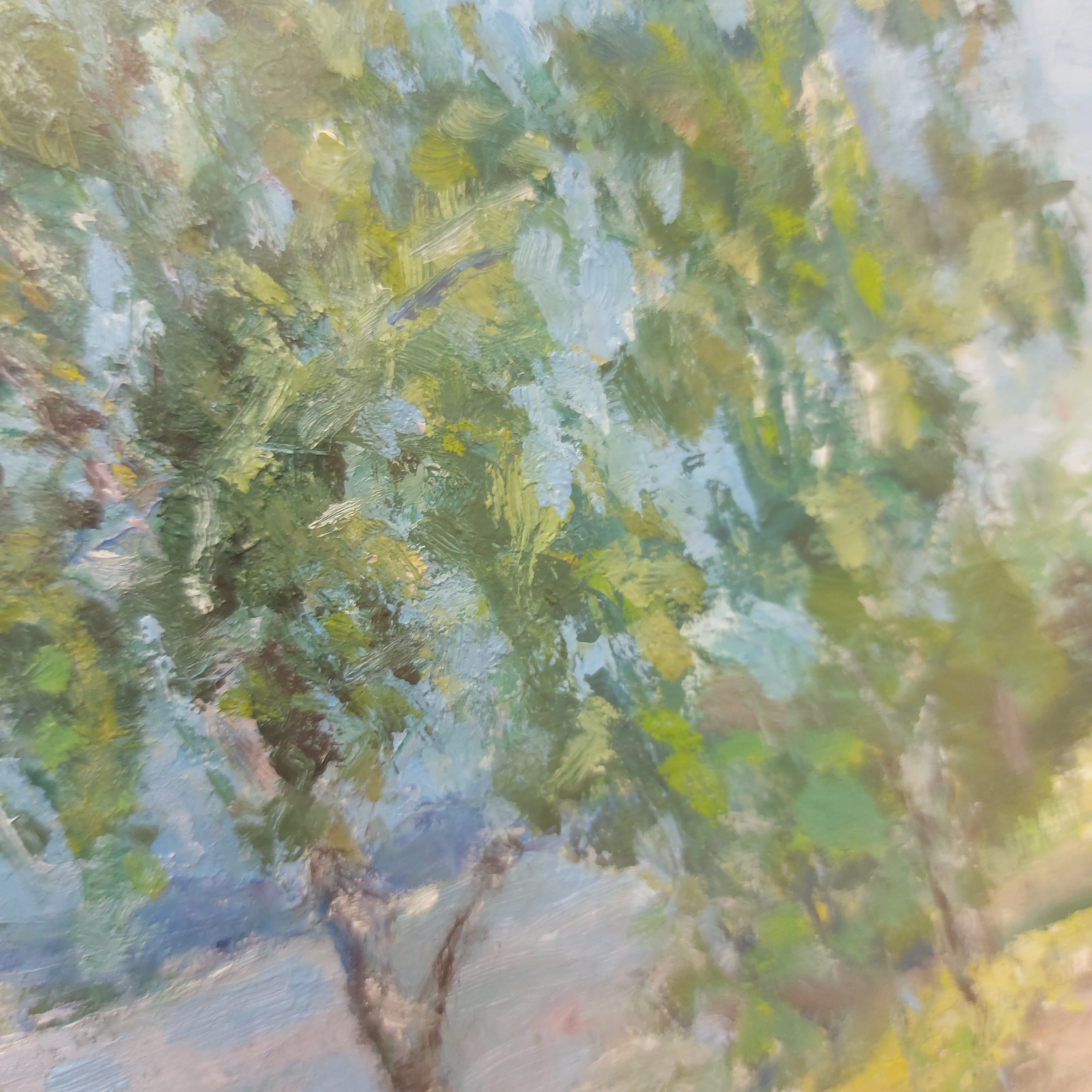 Дорога скорее грунтованная с неровными камнями и пролегает среди зелени. Слева от тропы видны высокие деревья с пышной листвой, колыхающимися от ветра. С правой стороны также присутствует зелёная растительность, но деревья находятся на некотором отдалении от тропы. Вдоль тропы видны пятна света и тени, что создаёт ощущение солнечного дня.