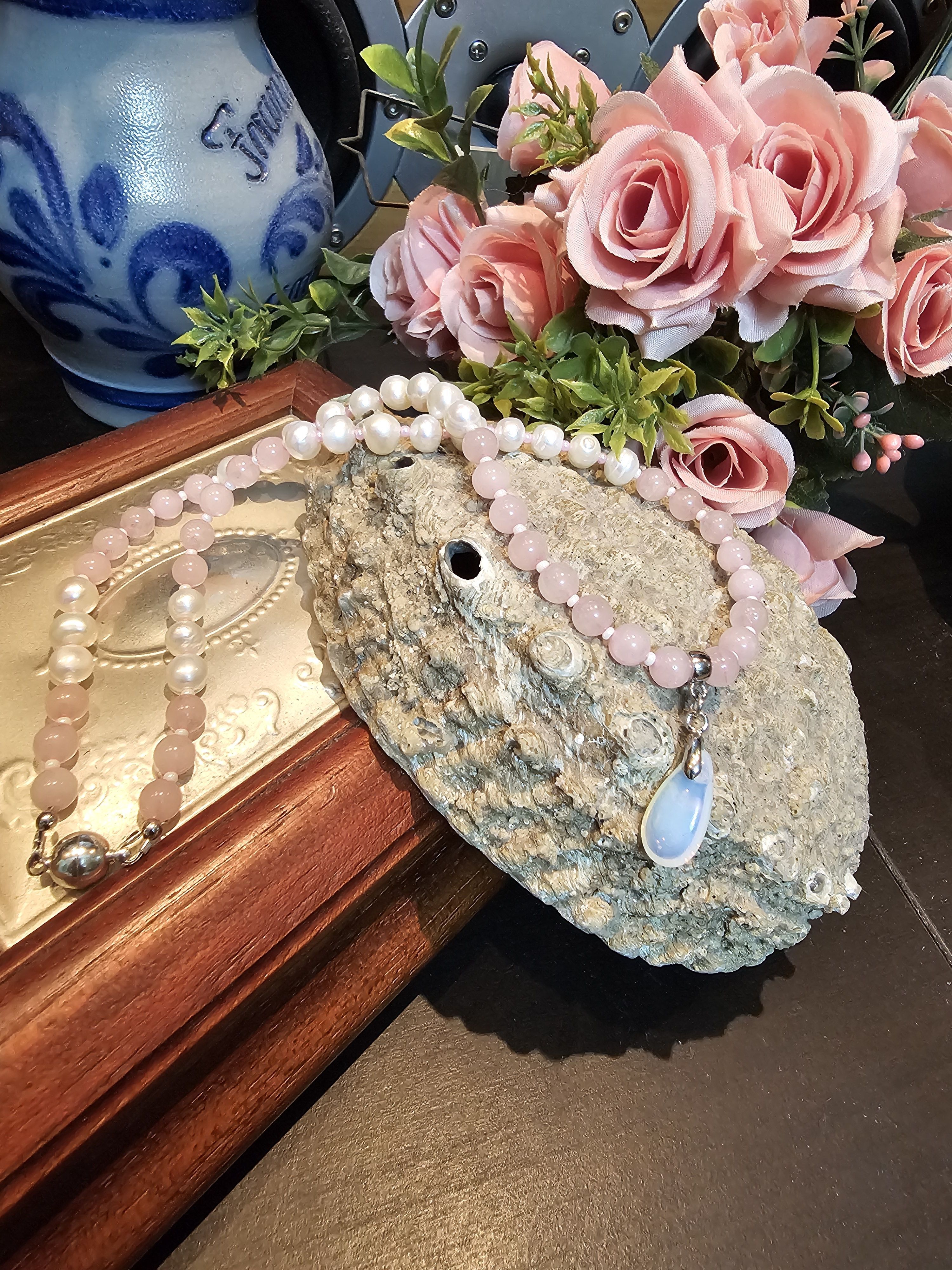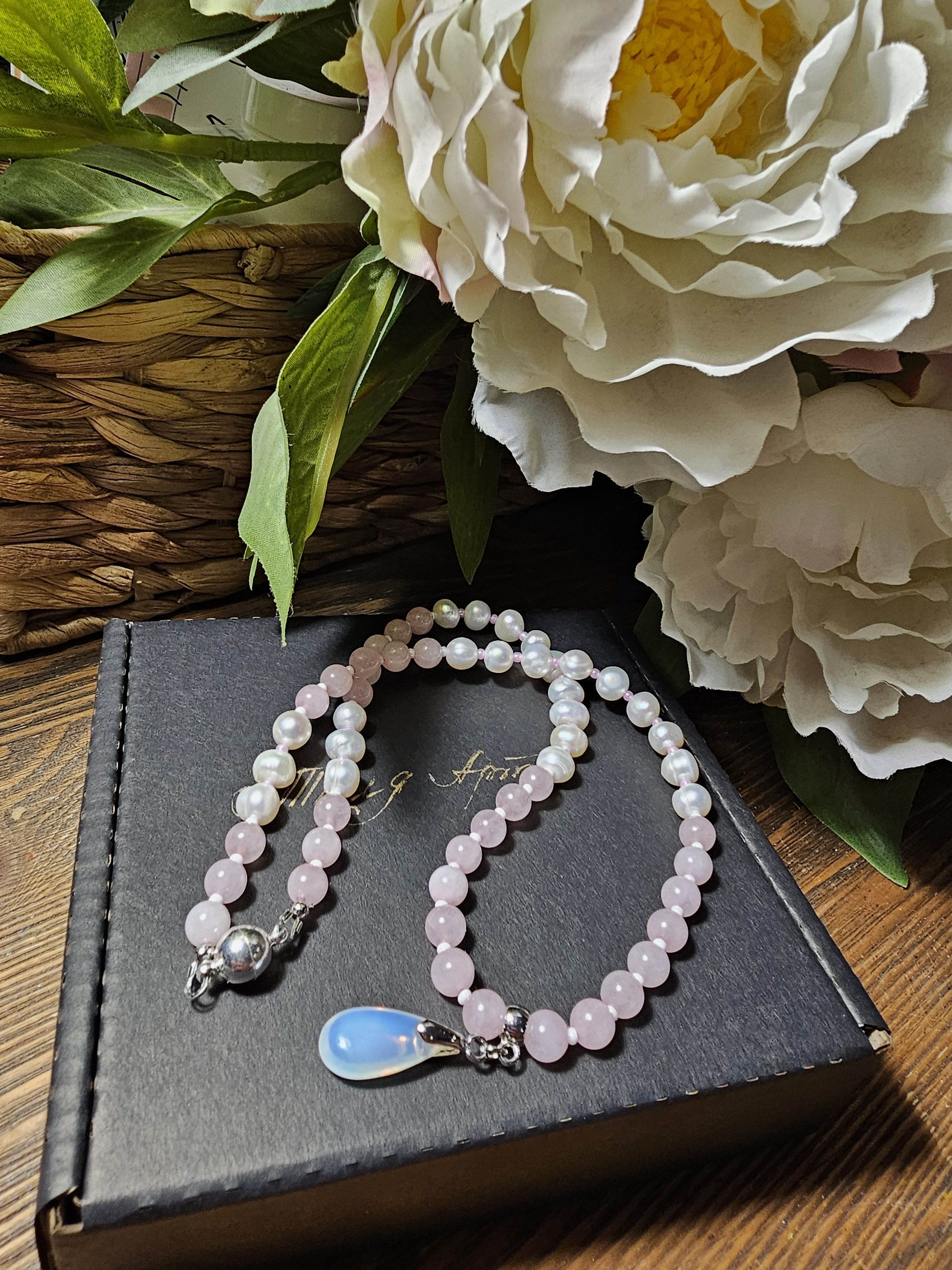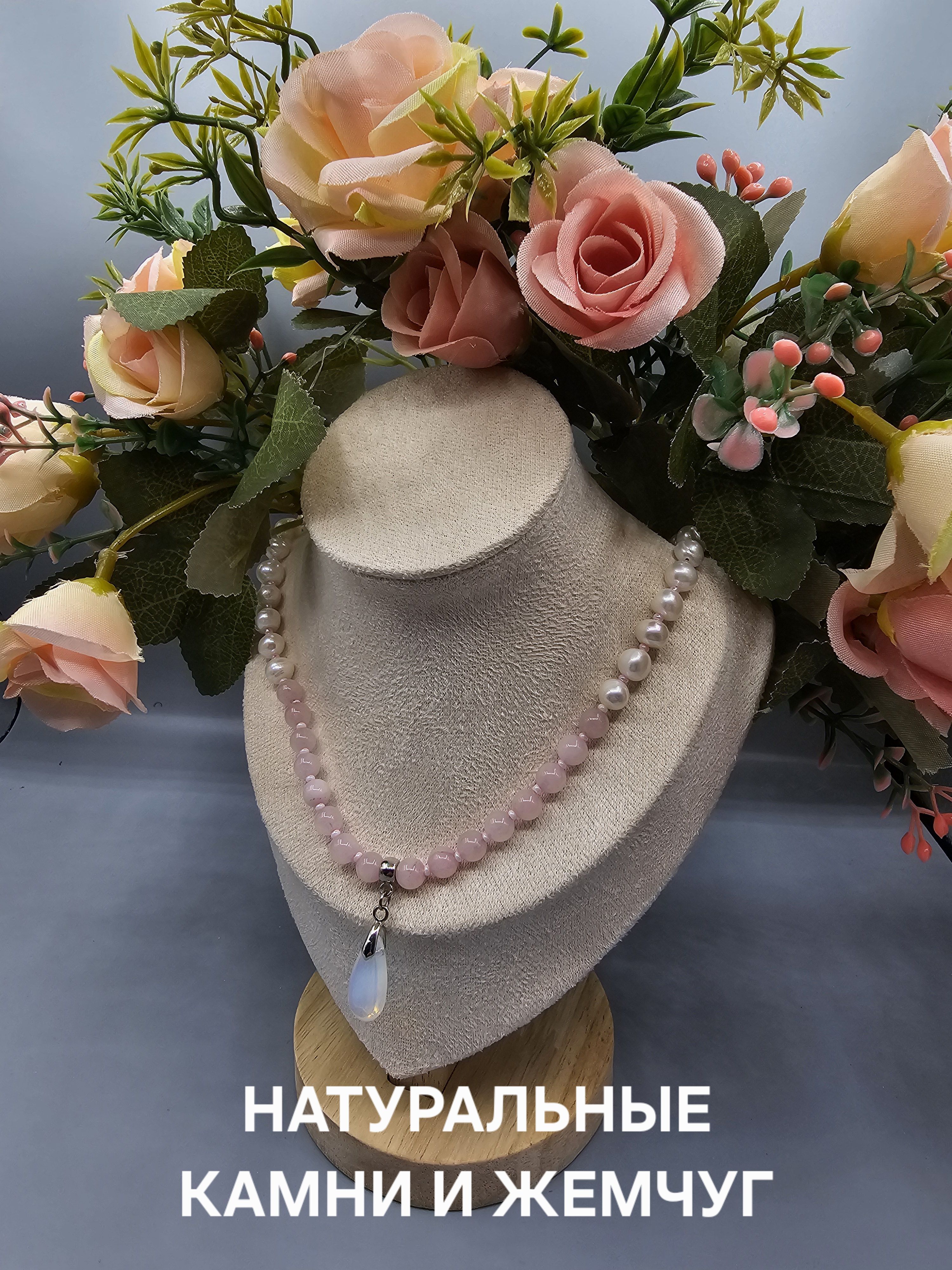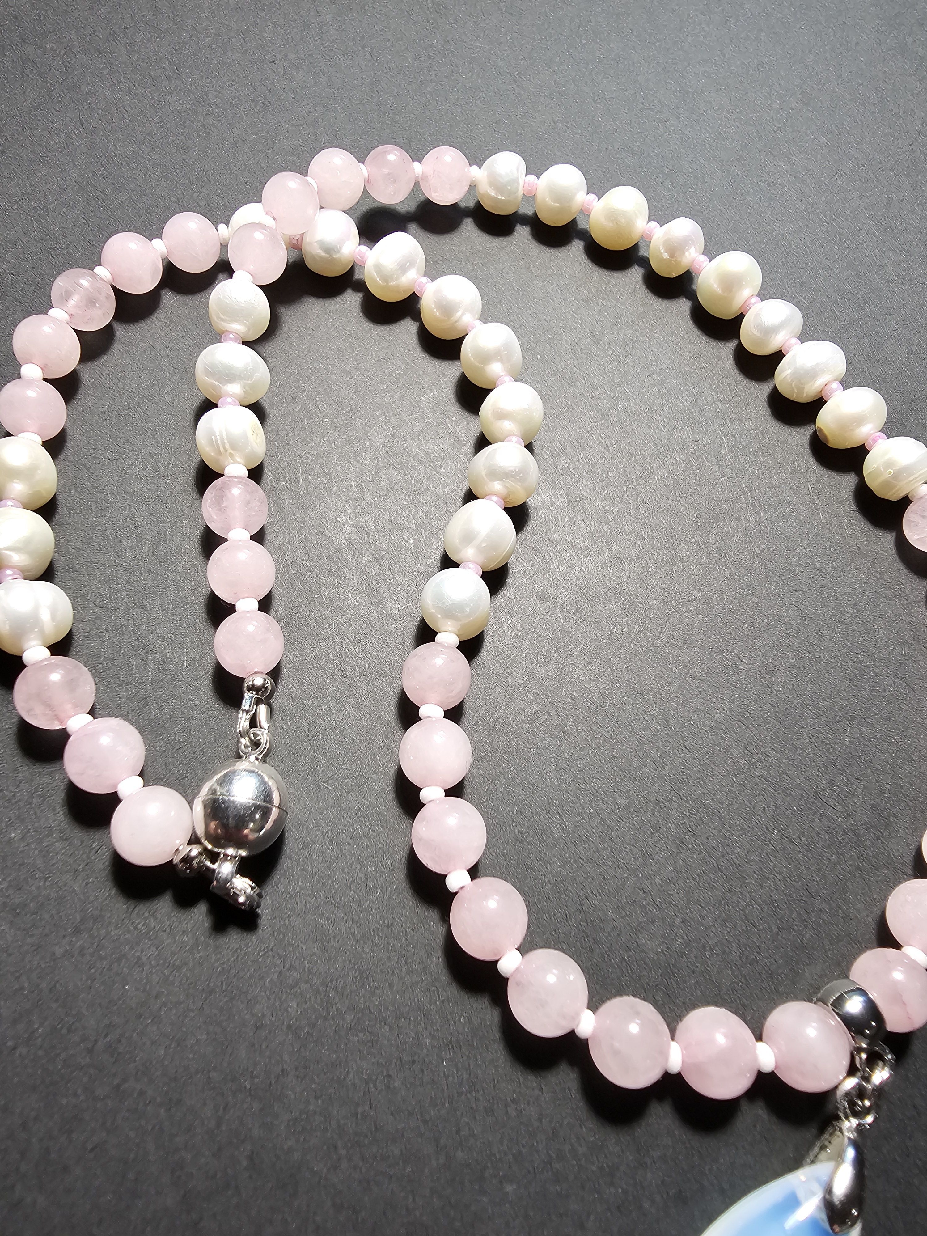 Колье (ожерелье) ручной работы из натуральных бусин розового кварца, речного жемчуга и чешского бисера. По центру колье украшено кулоном-каплей из лунного камня. Магнитный замок позволит быстро снимать и надевать колье.