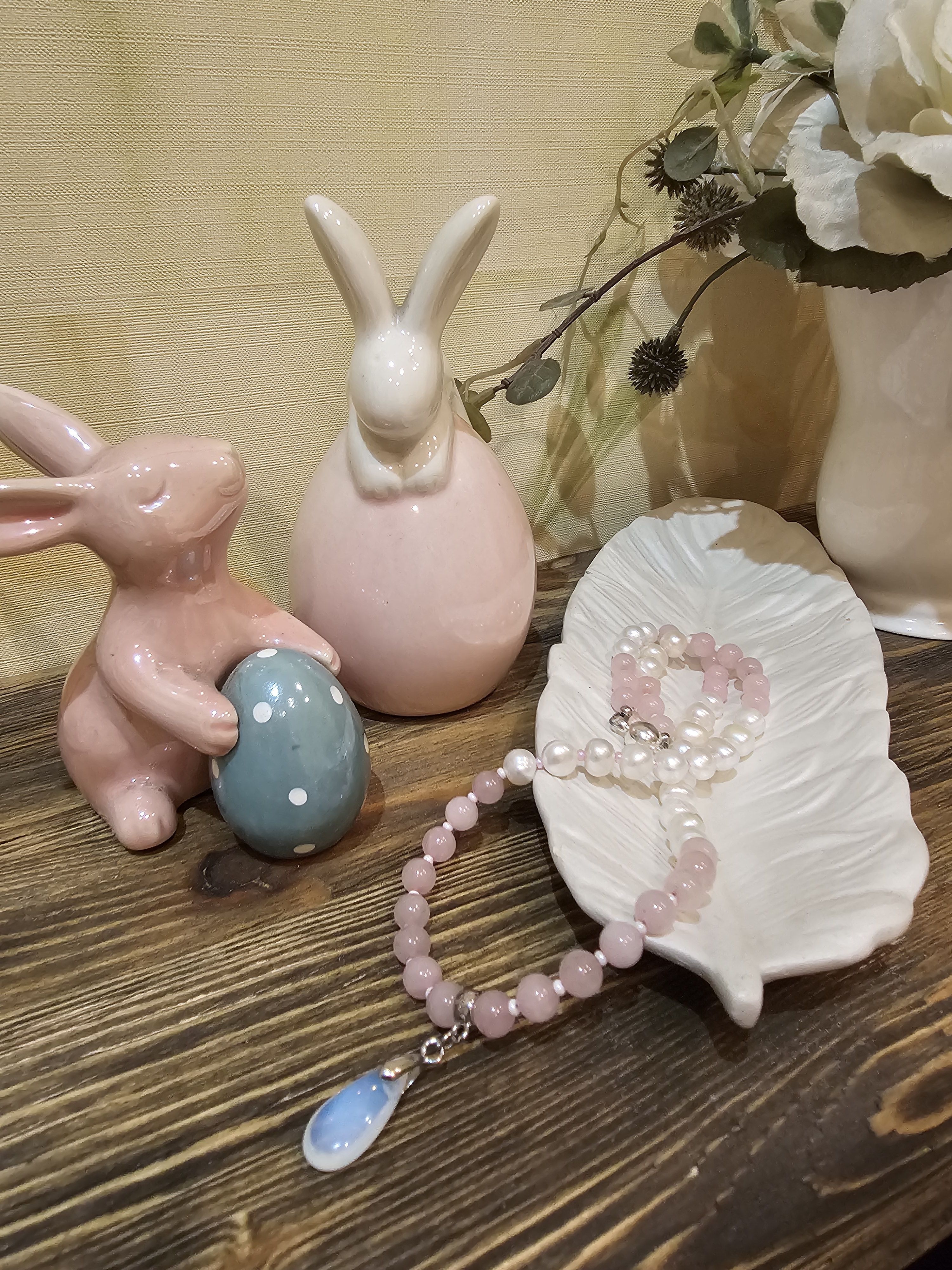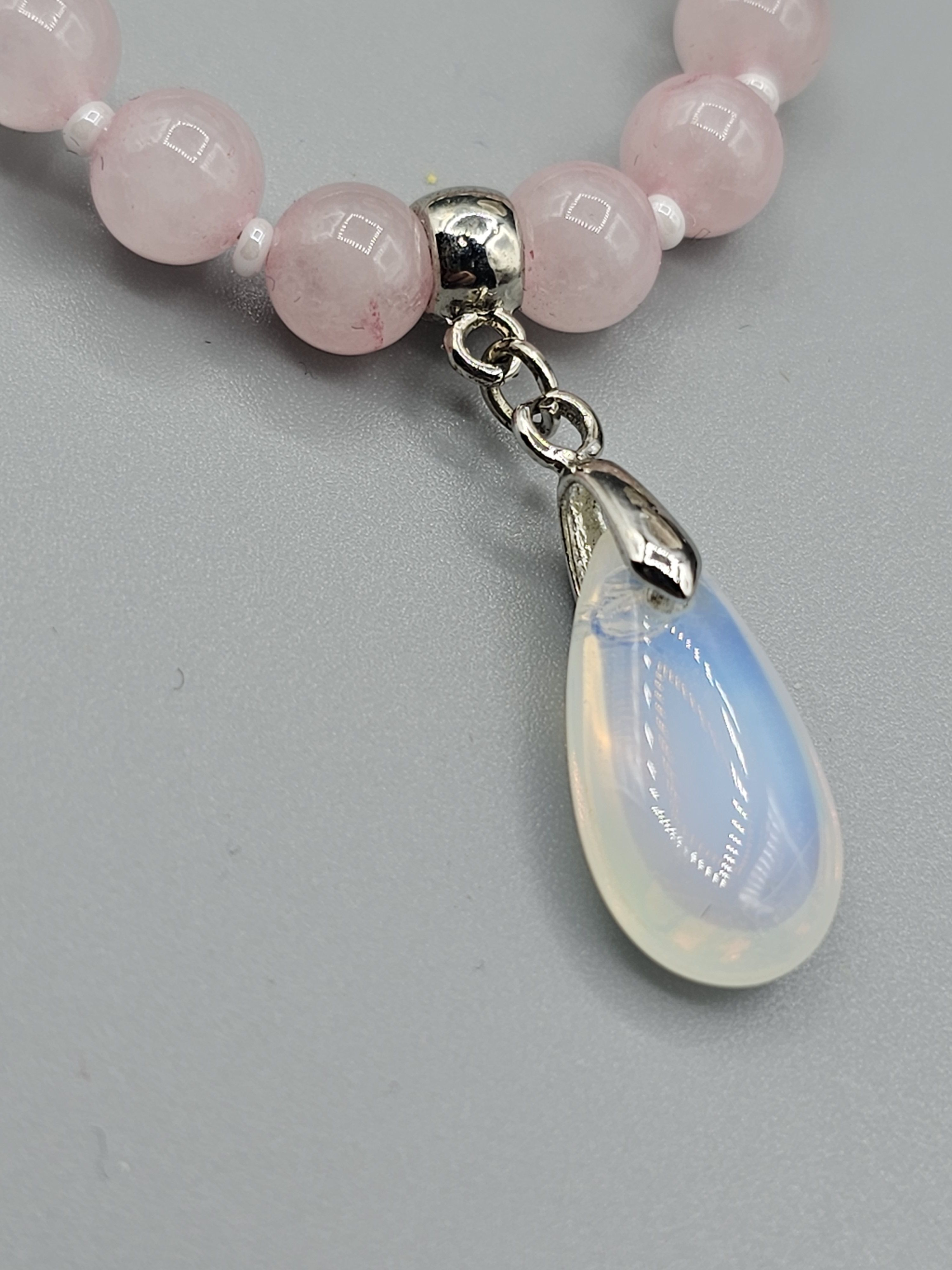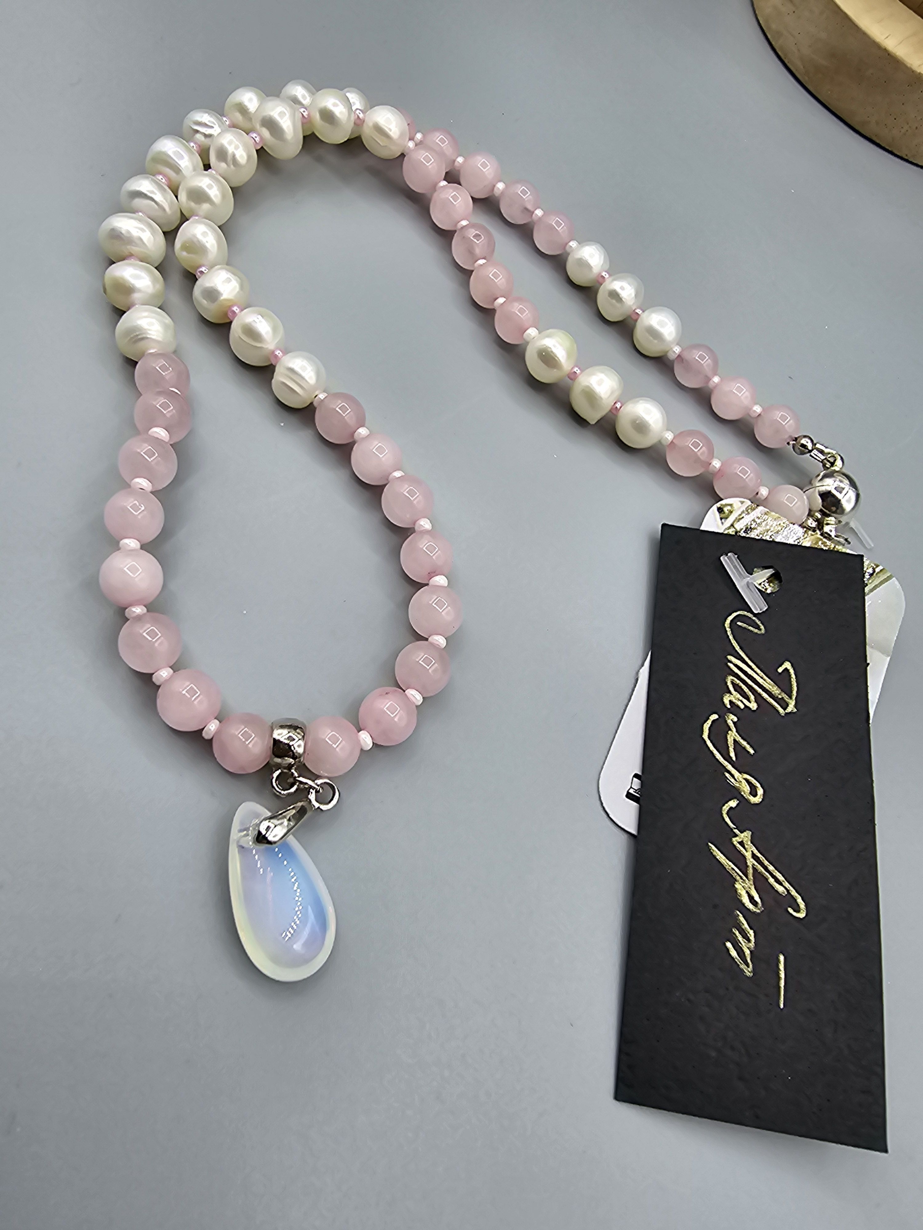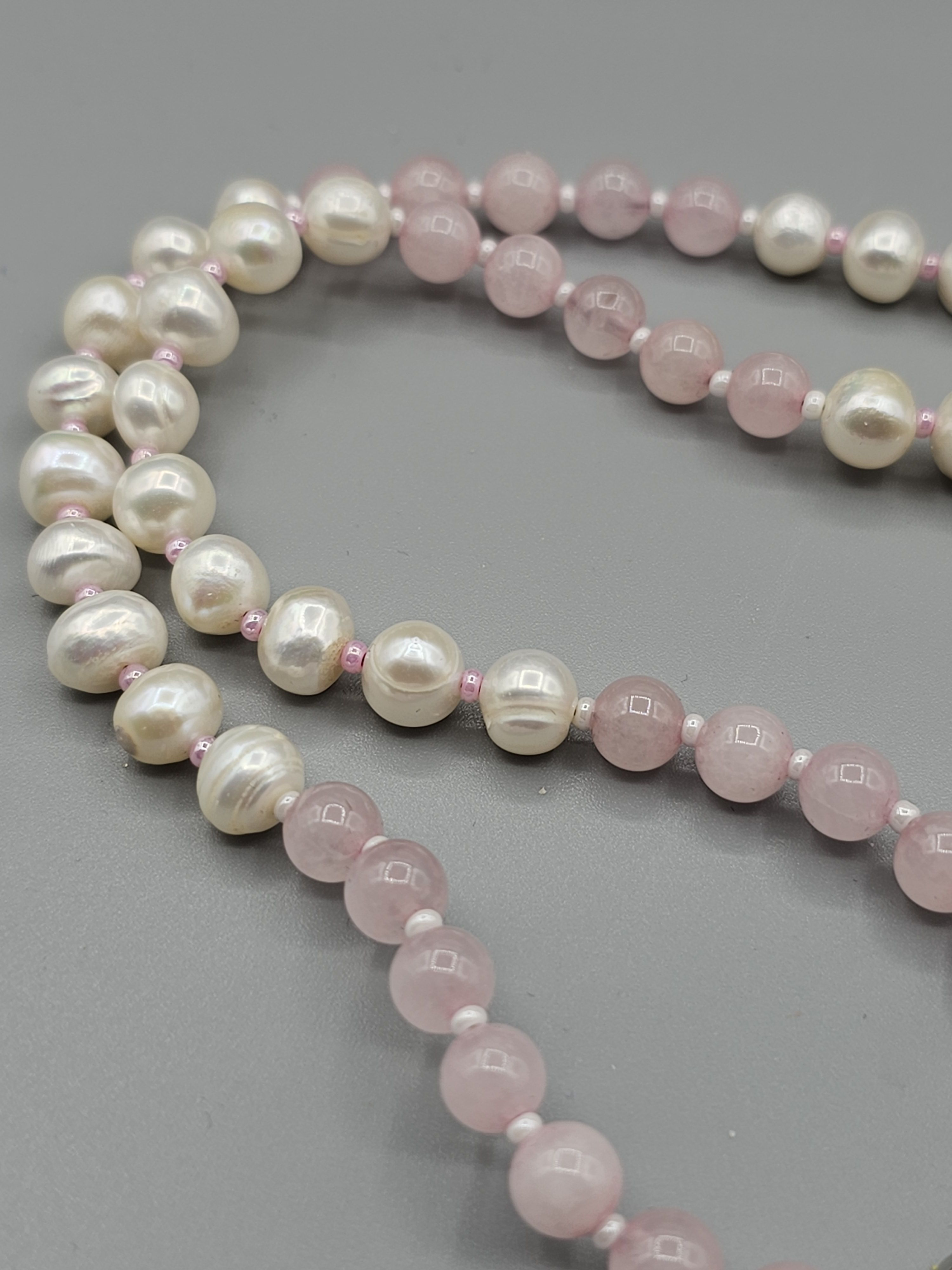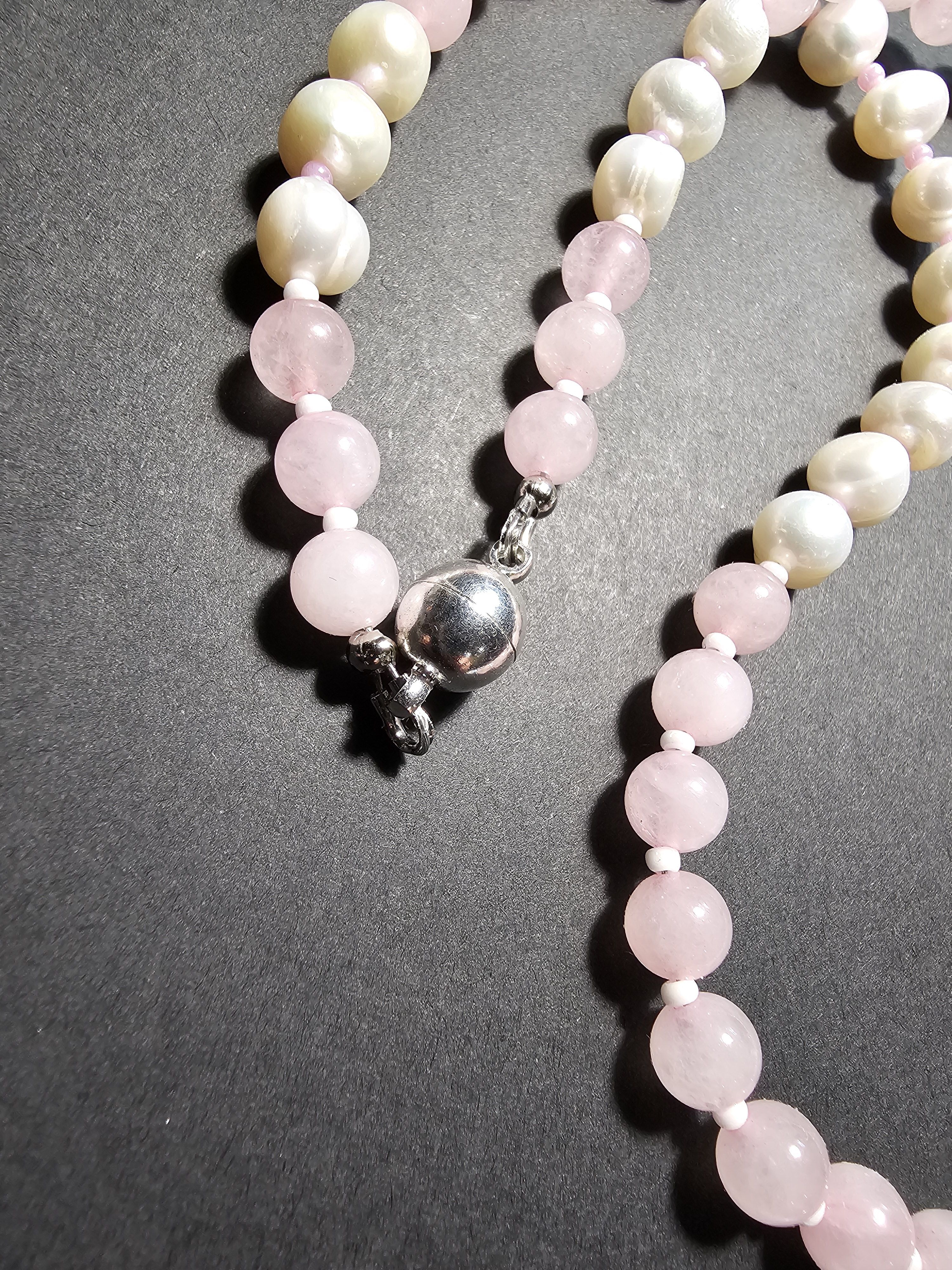 Колье (ожерелье) ручной работы из натуральных бусин розового кварца, речного жемчуга и чешского бисера. По центру колье украшено кулоном-каплей из лунного камня. Магнитный замок позволит быстро снимать и надевать колье.