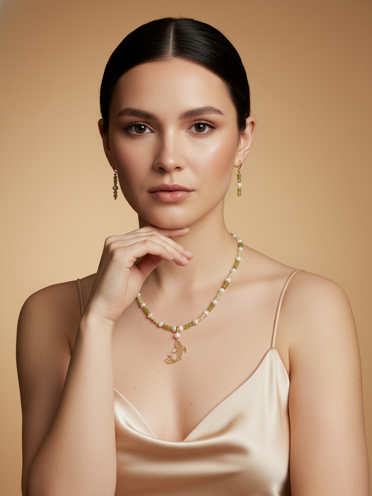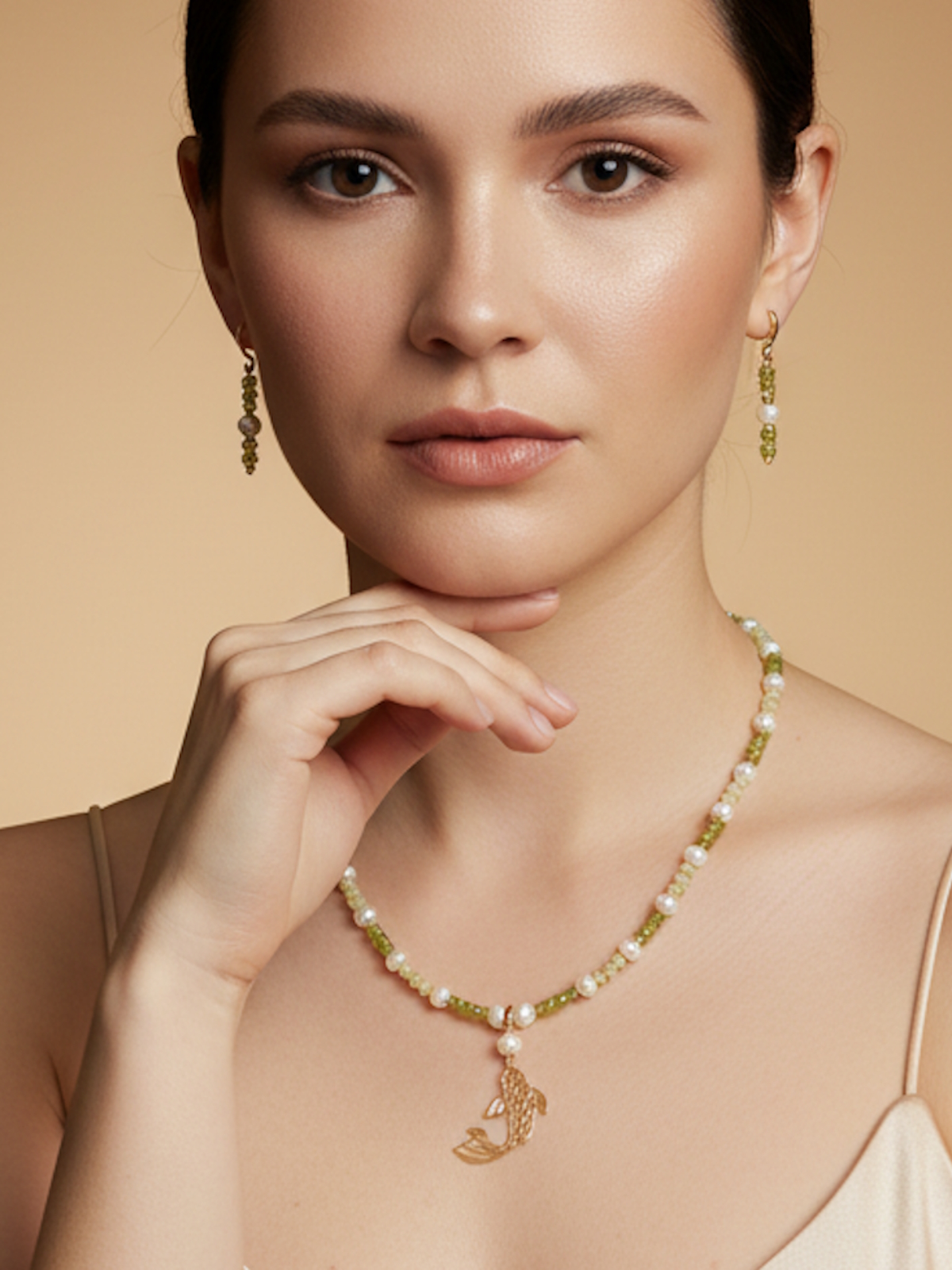 Колье ручной работы создано из сочетания культивированного жемчуга, лимонного и зеленого нефрита и бисера. Съёмный кулон в форме ажурной рыбки подчеркивает романтичность и индивидуальность, делая его идеальным выбором для вечерних событий.