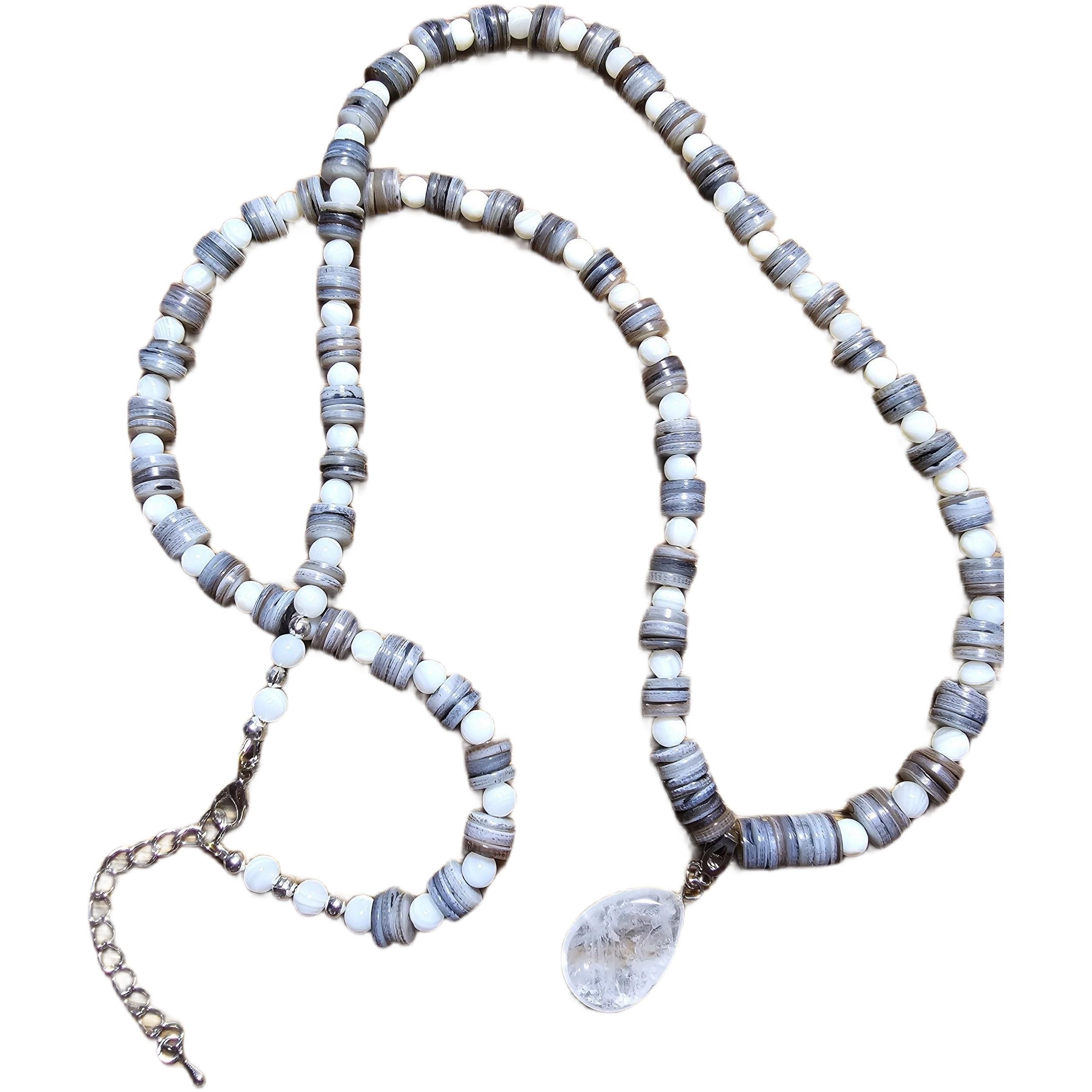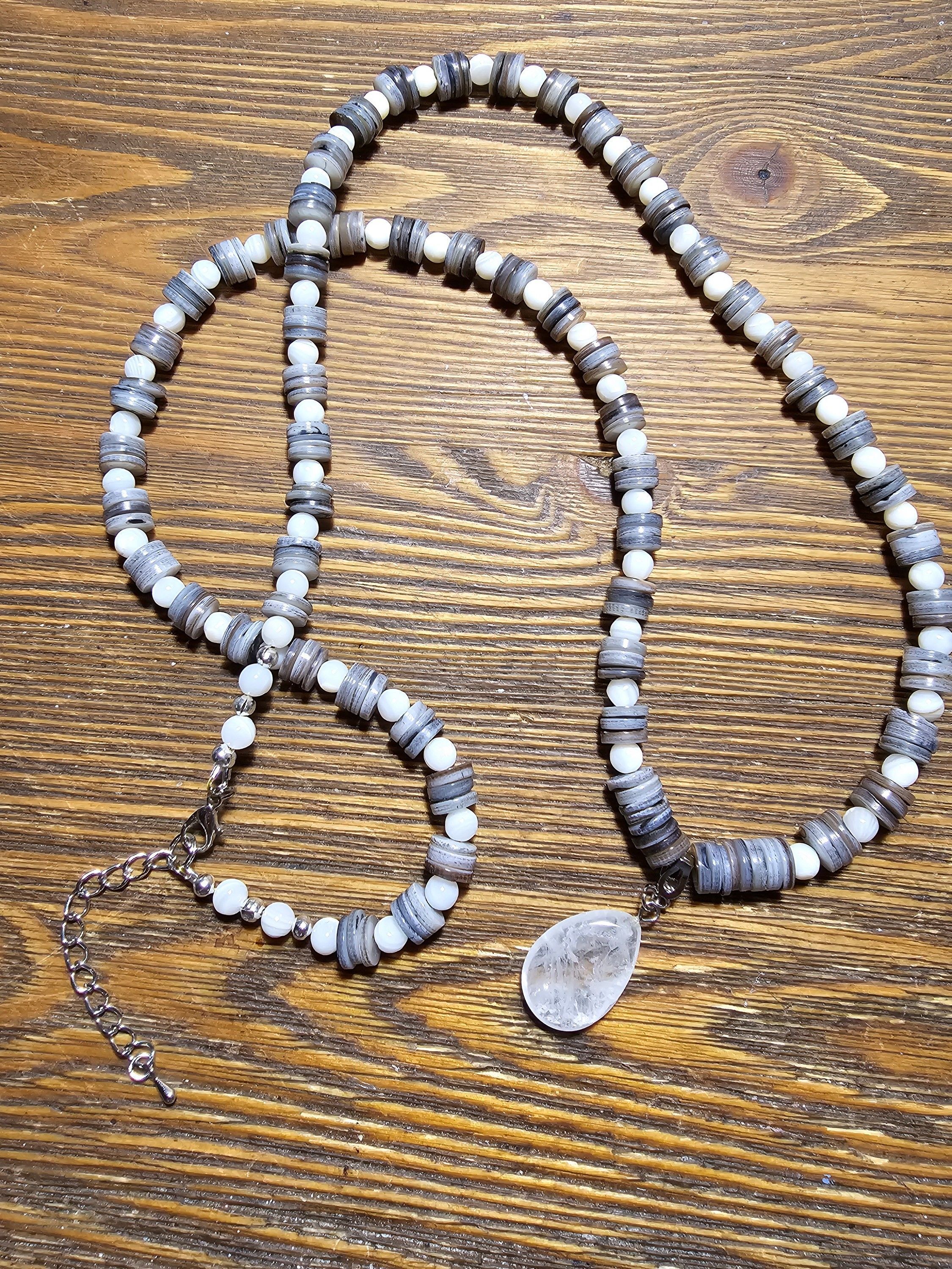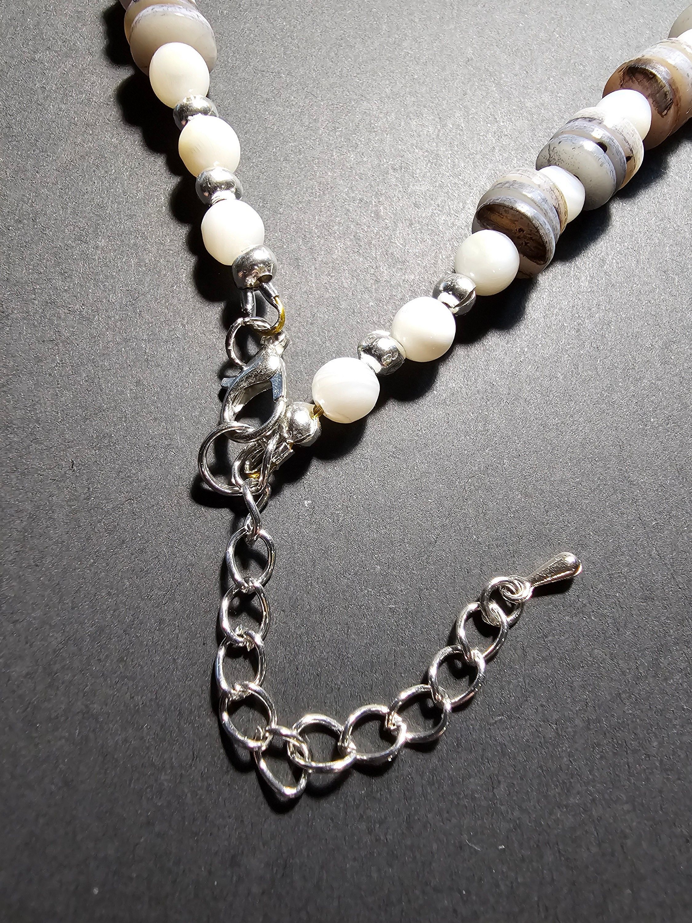 Ожерелье состоит из чередующихся круглых черных матовых бусин и овальных серо-белых бусин с узорами, выполненных из натурального агата двух видов, разбавленного серебристым бисером. В центре ожерелья находится декоративная подвеска в виде собаки-шарика, которая придает украшению особый шарм.