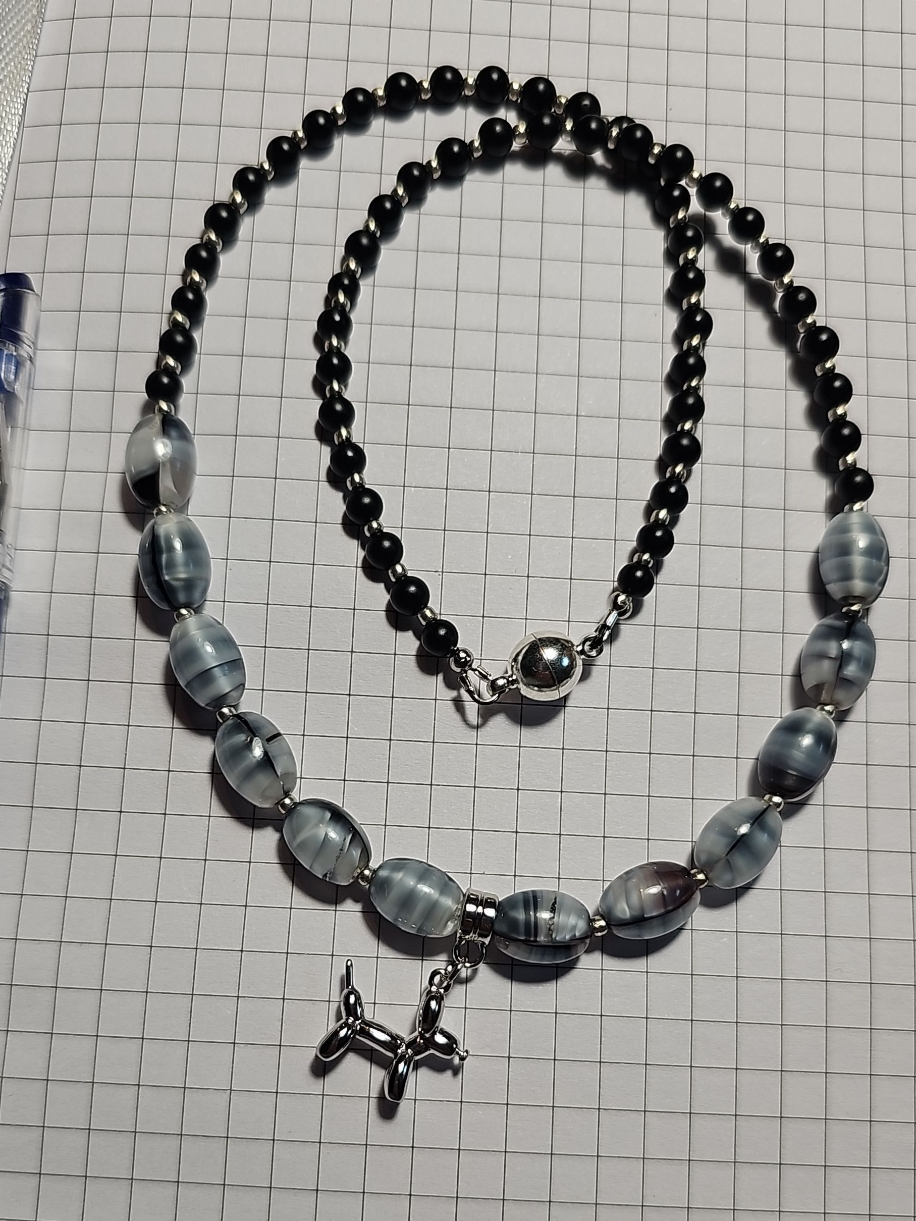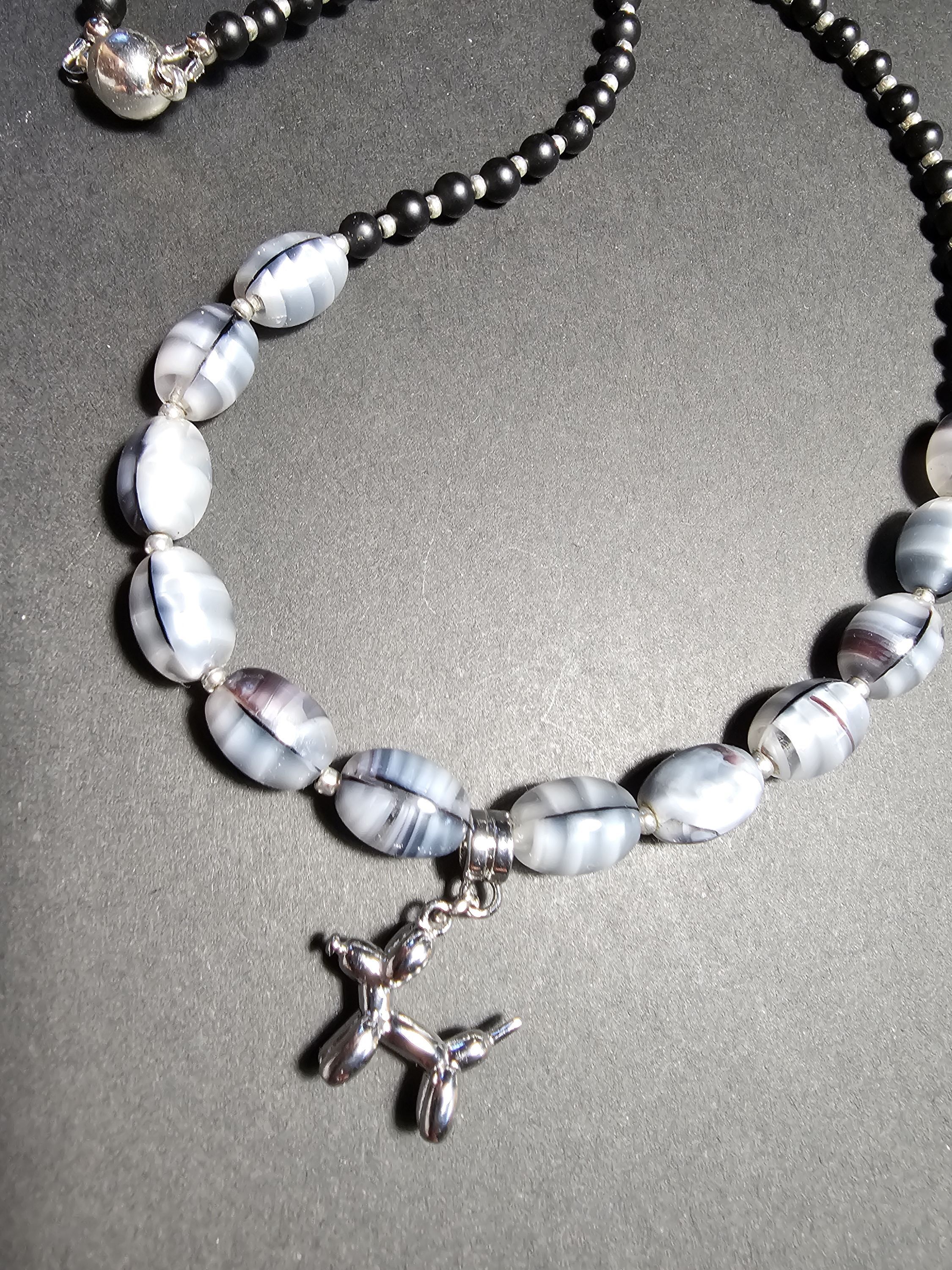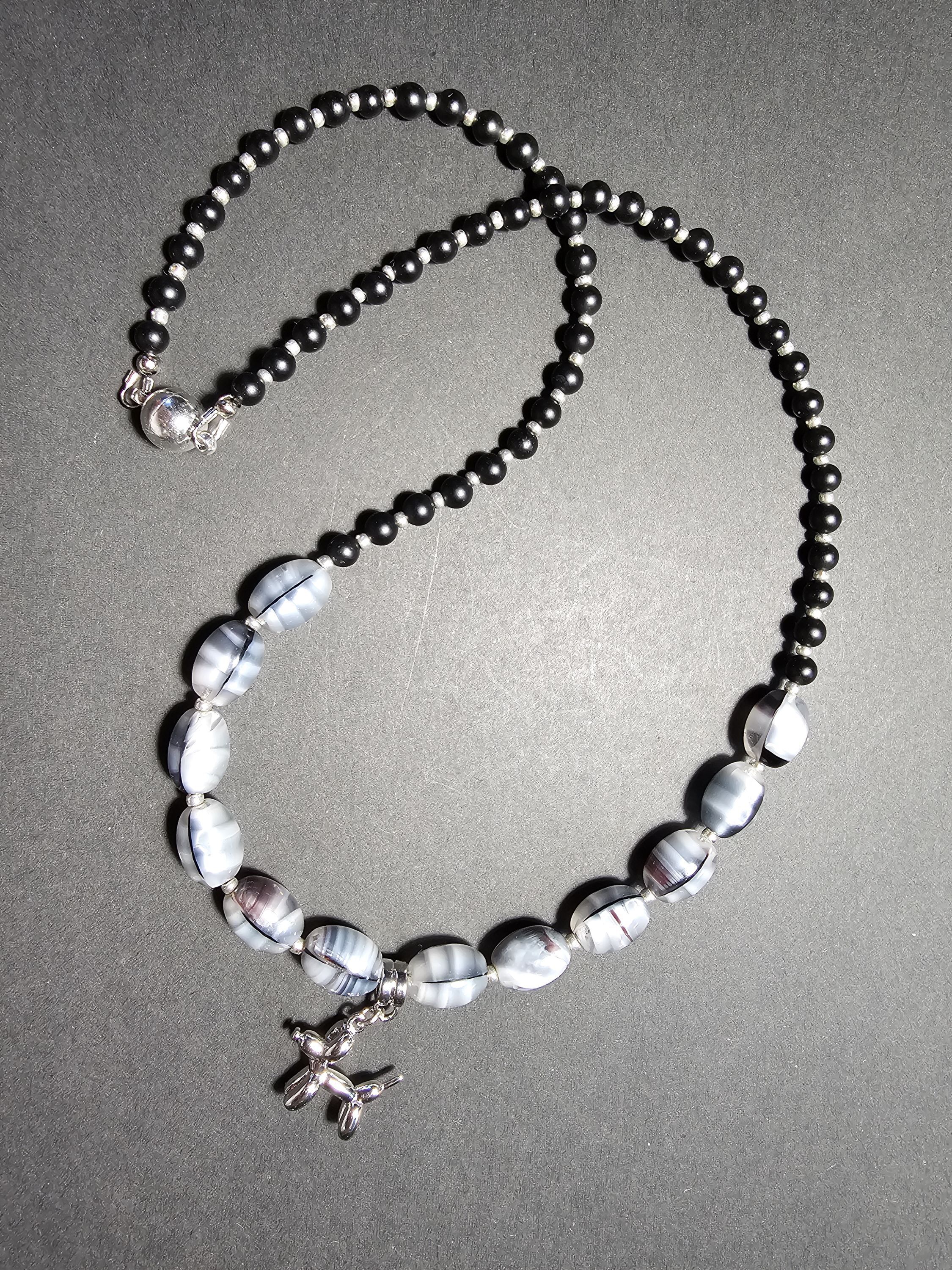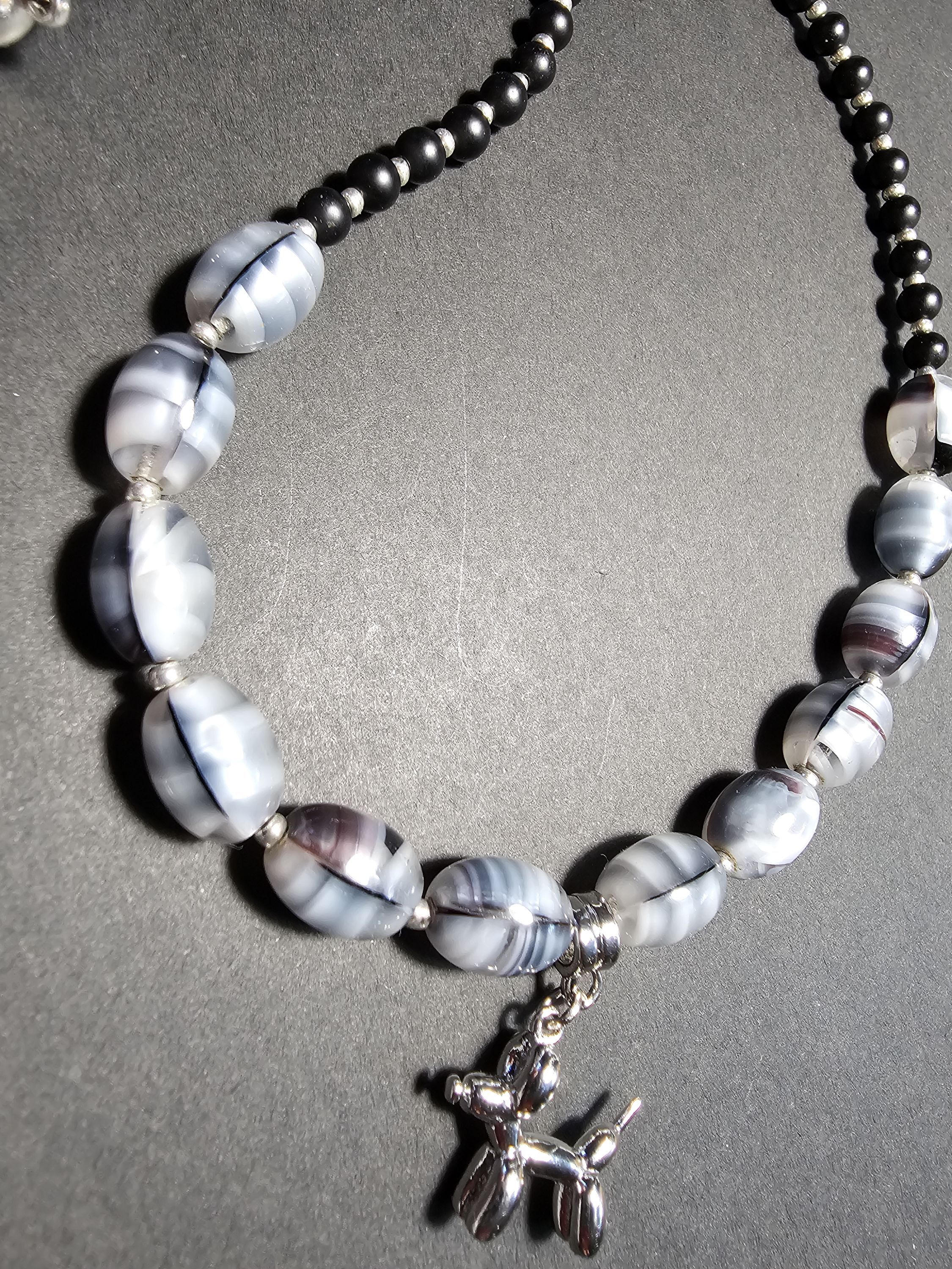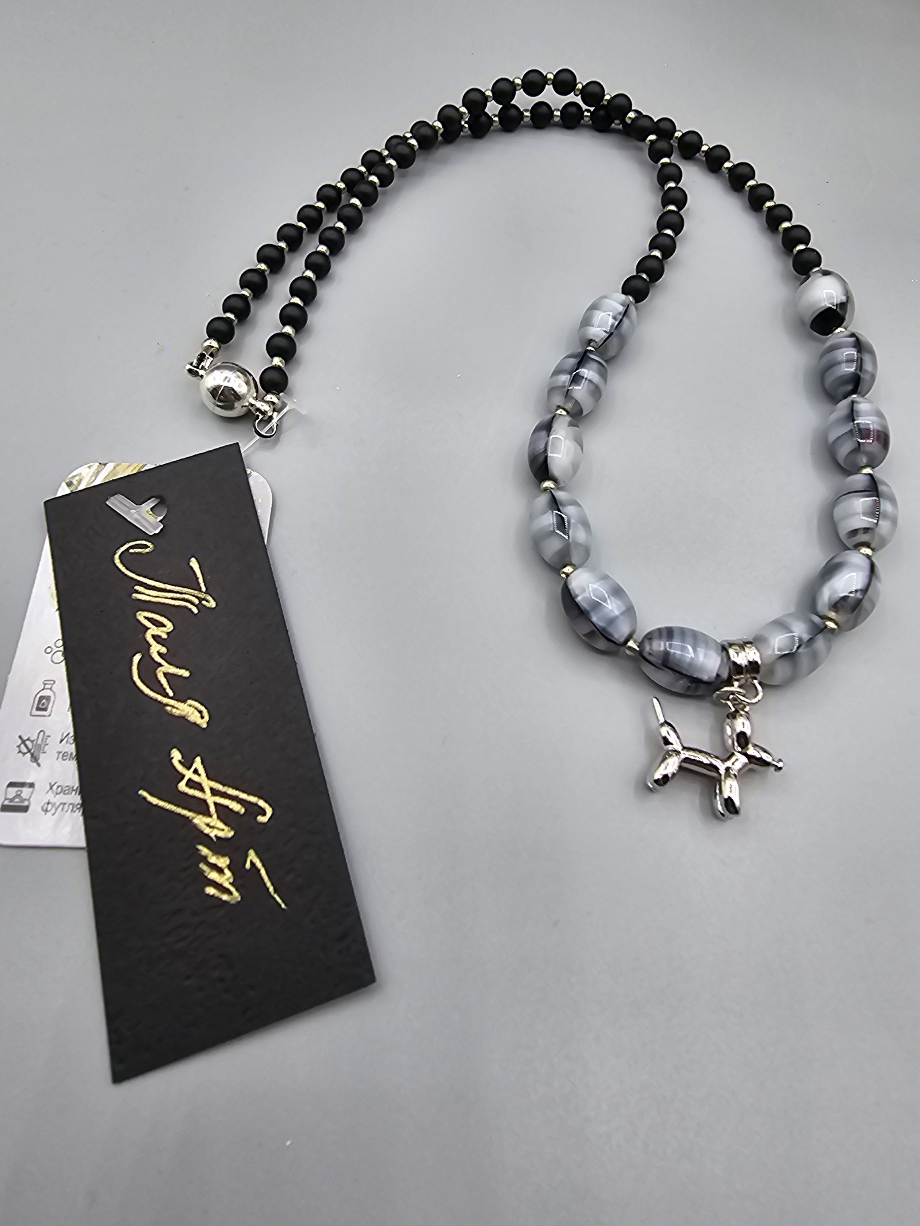 Ожерелье выполнено из чередующихся круглых черных матовых бусин и овальных серо-белых бусин с узорами, что придает ему неповторимый и яркий вид. В центре ожерелья находится декоративная подвеска в виде собаки-шарика, выполненная из натурального агата двух видов, разбавленного серебристым бисером.