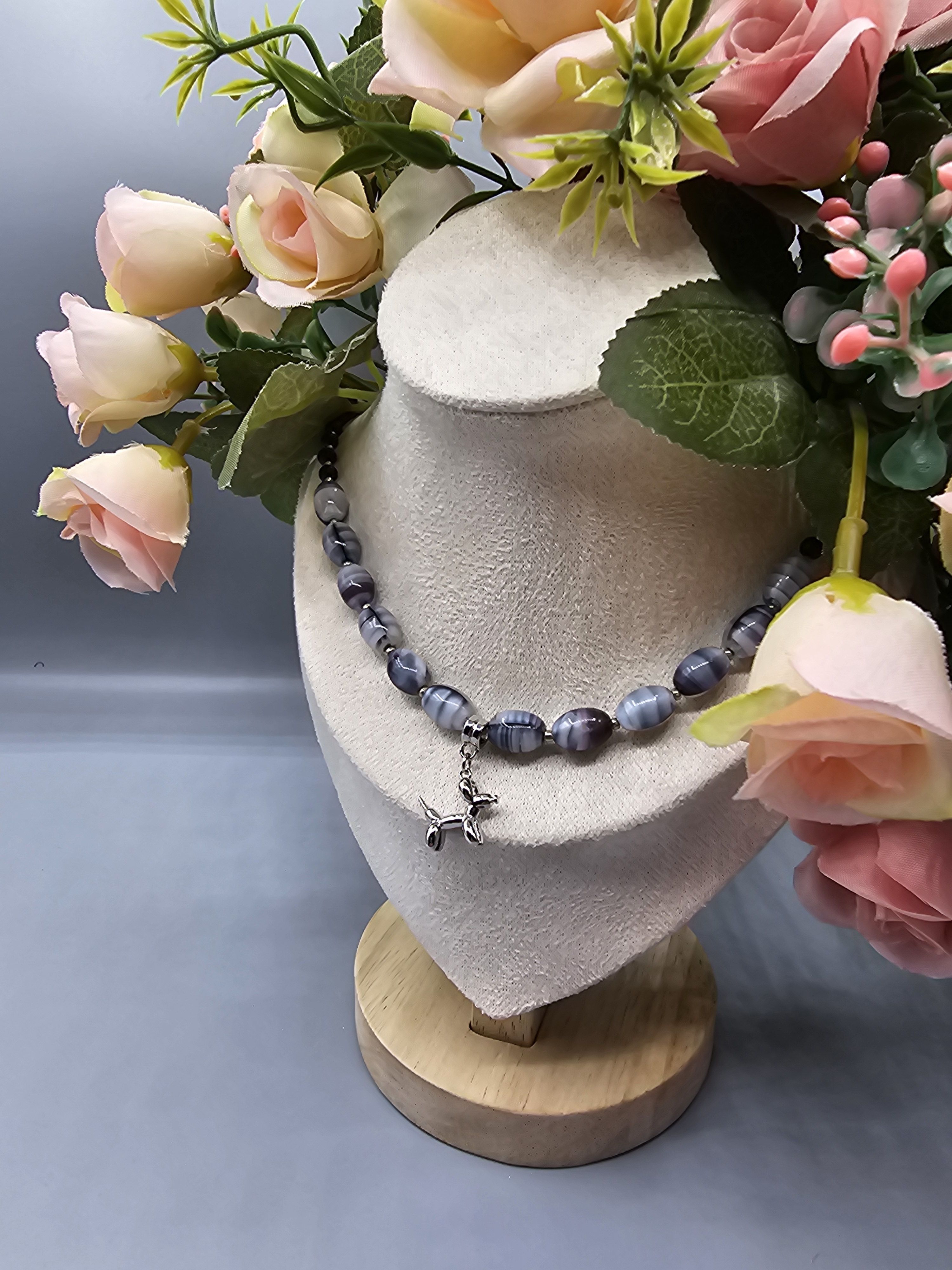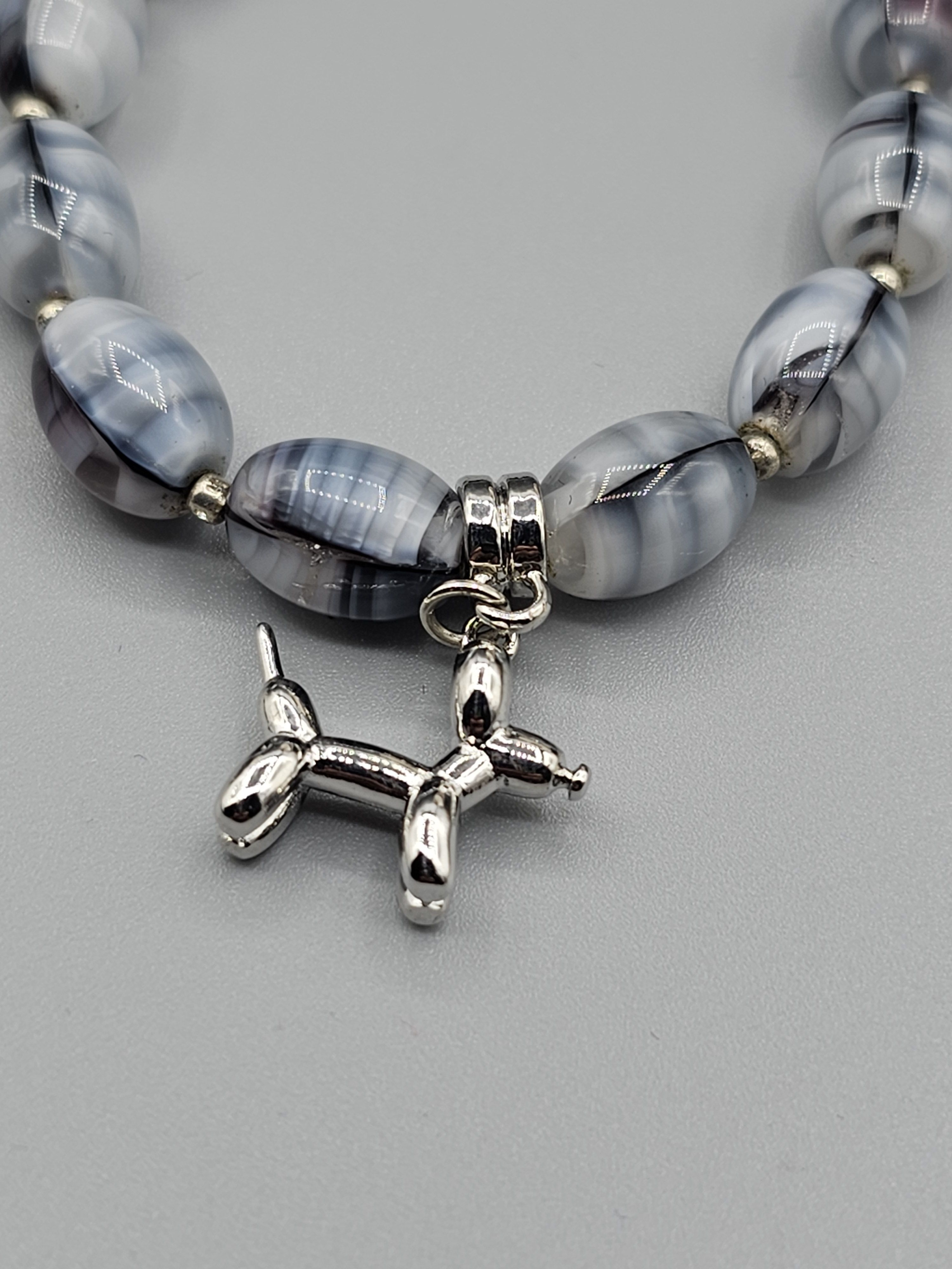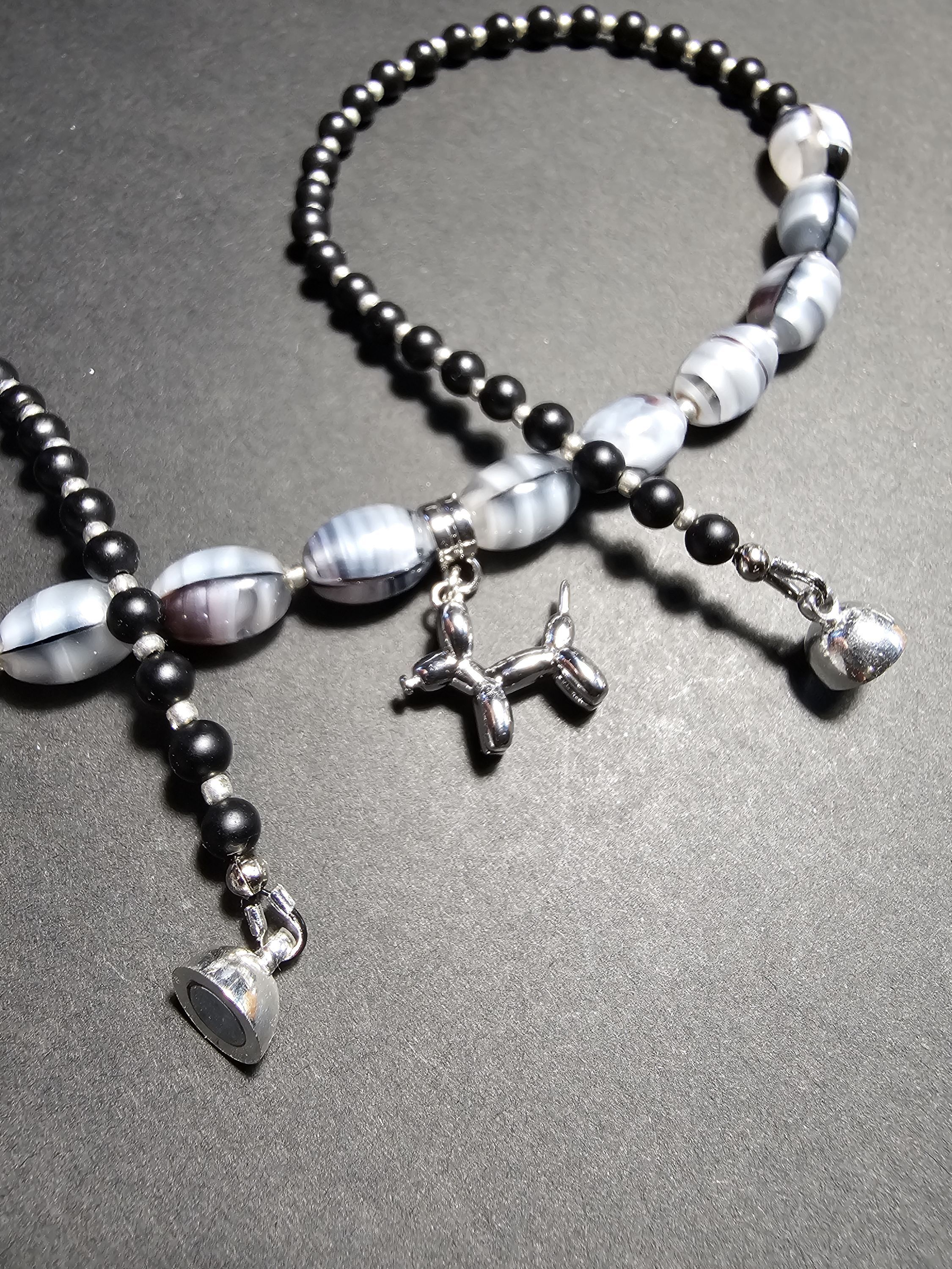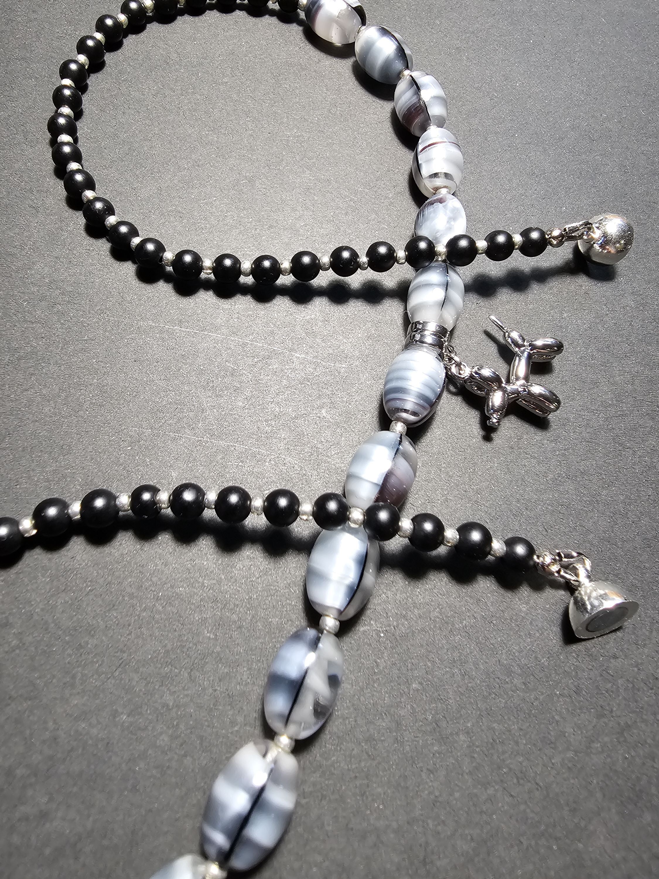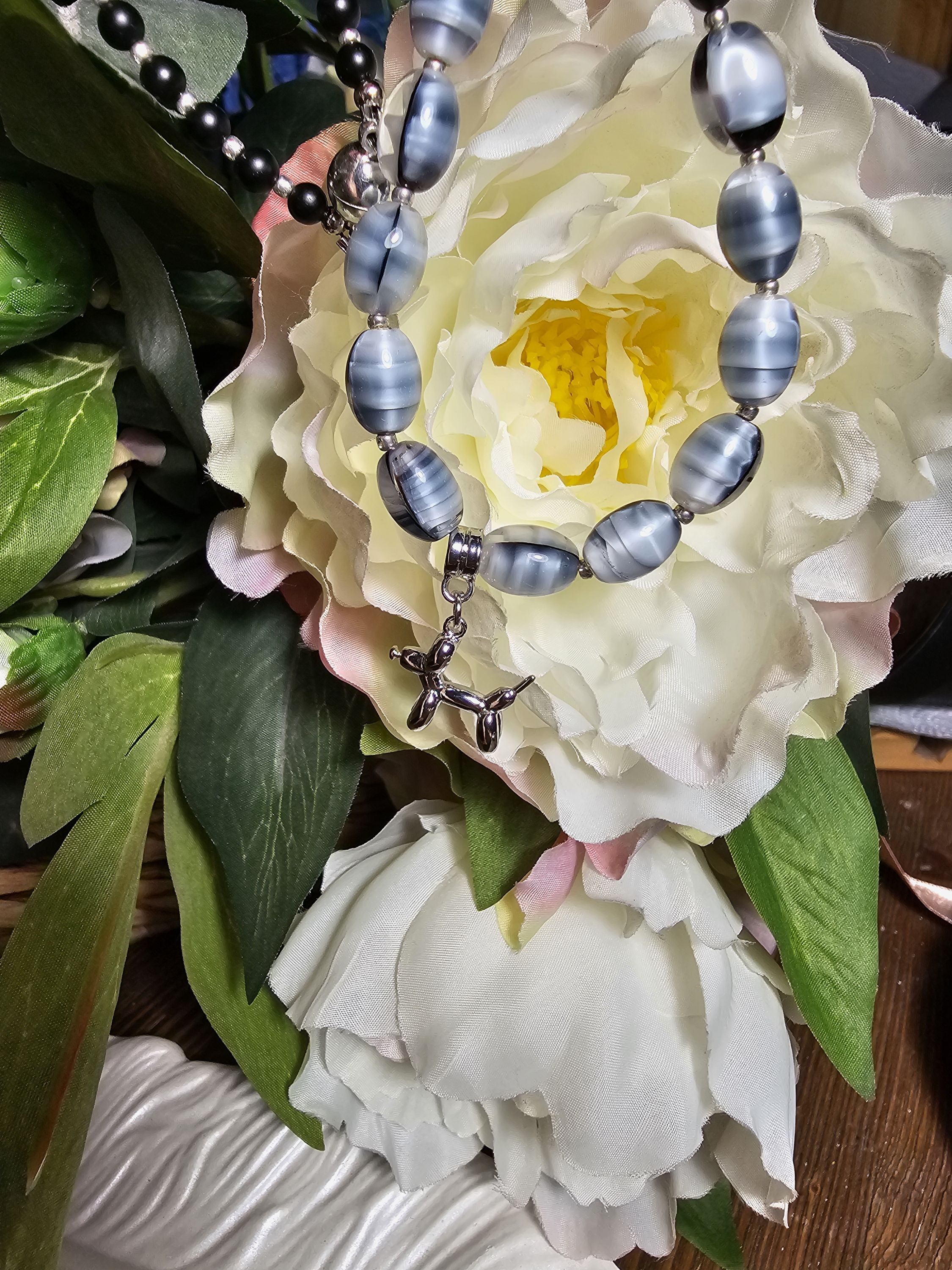 Ожерелье выполнено из чередующихся круглых черных матовых бусин и овальных серо-белых бусин с узорами, что придает ему неповторимый и яркий вид. В центре ожерелья находится декоративная подвеска в виде собаки-шарика, выполненная из натурального агата двух видов, разбавленного серебристым бисером.