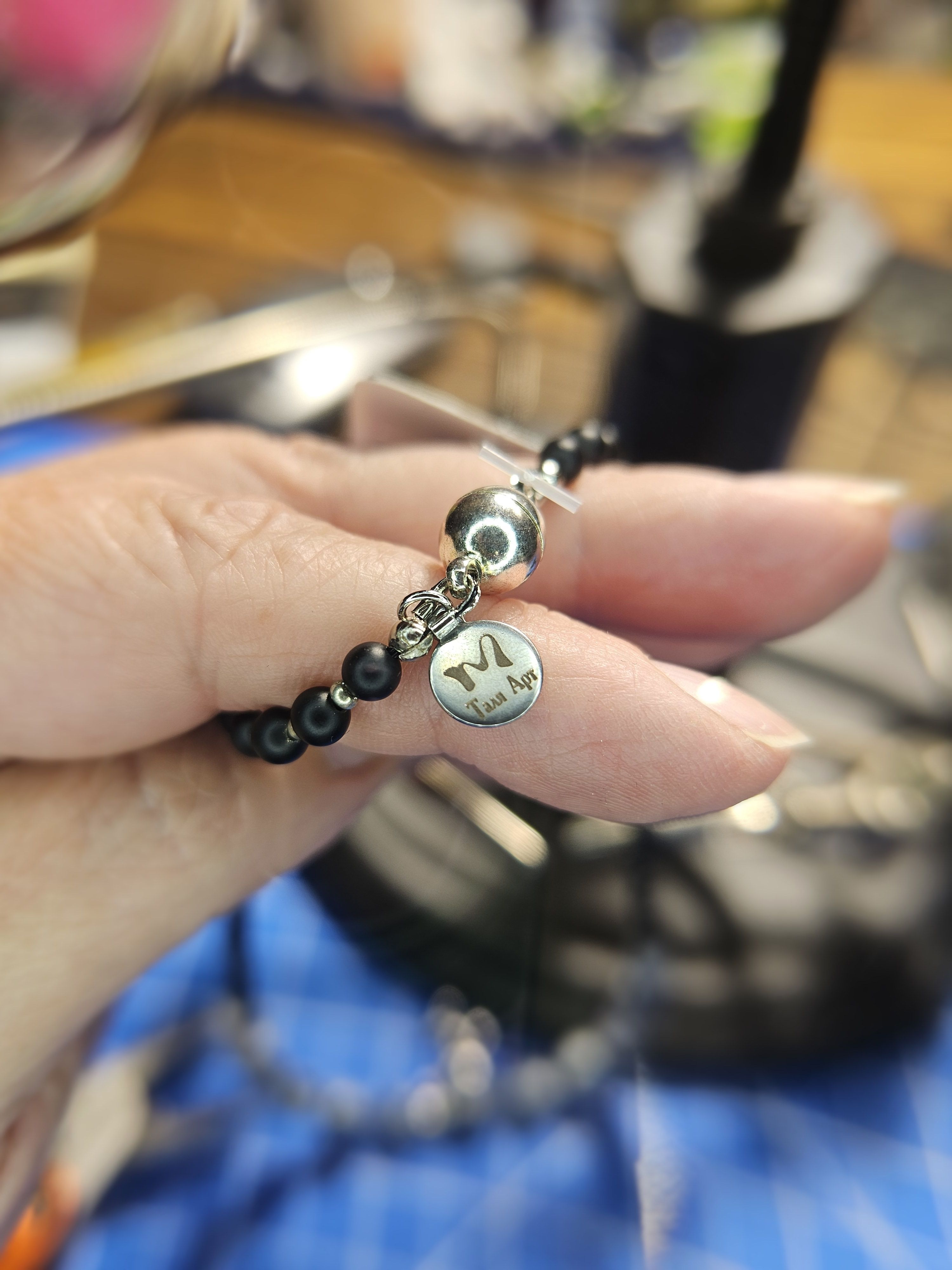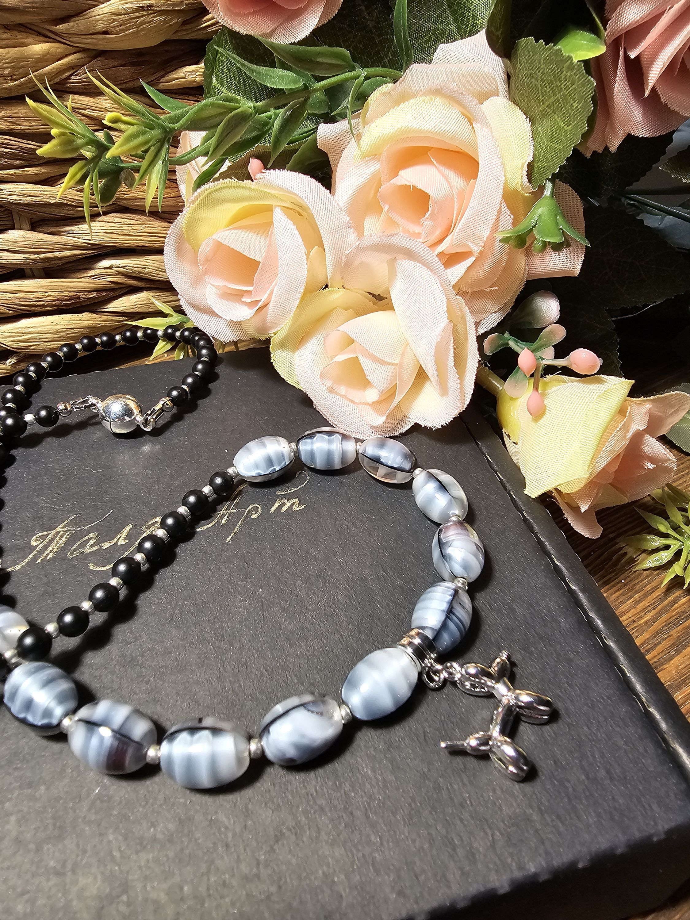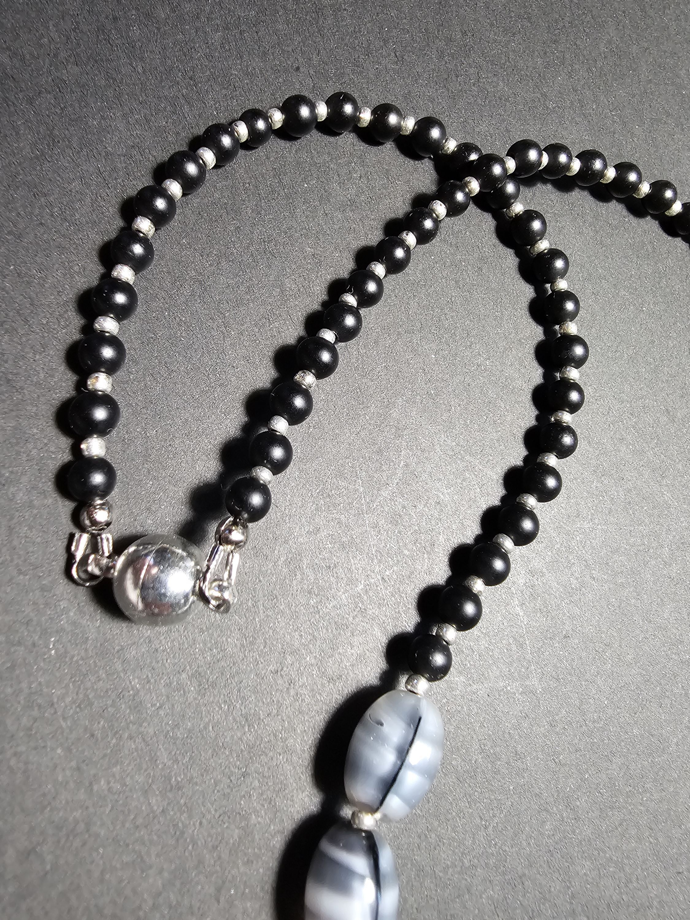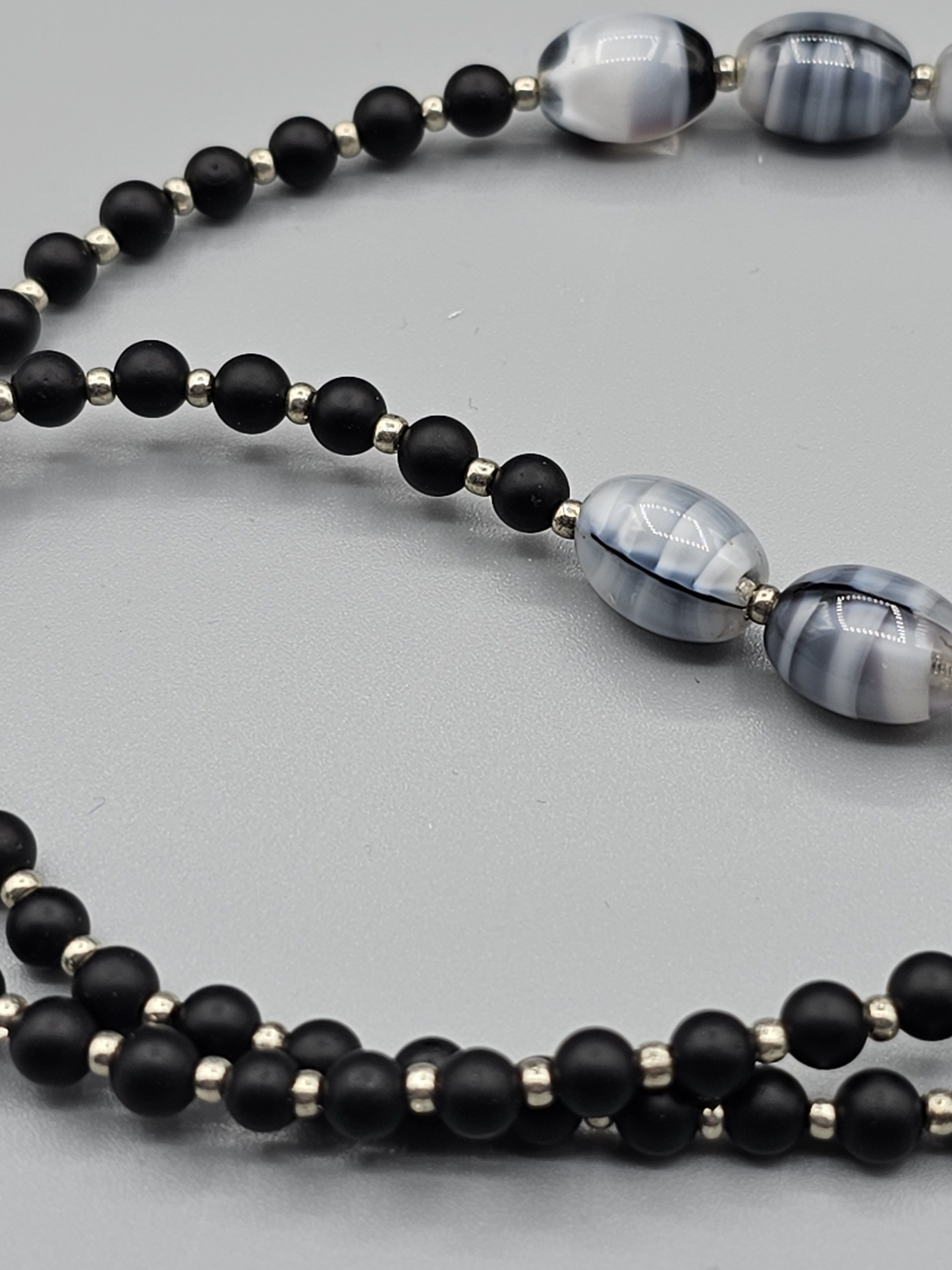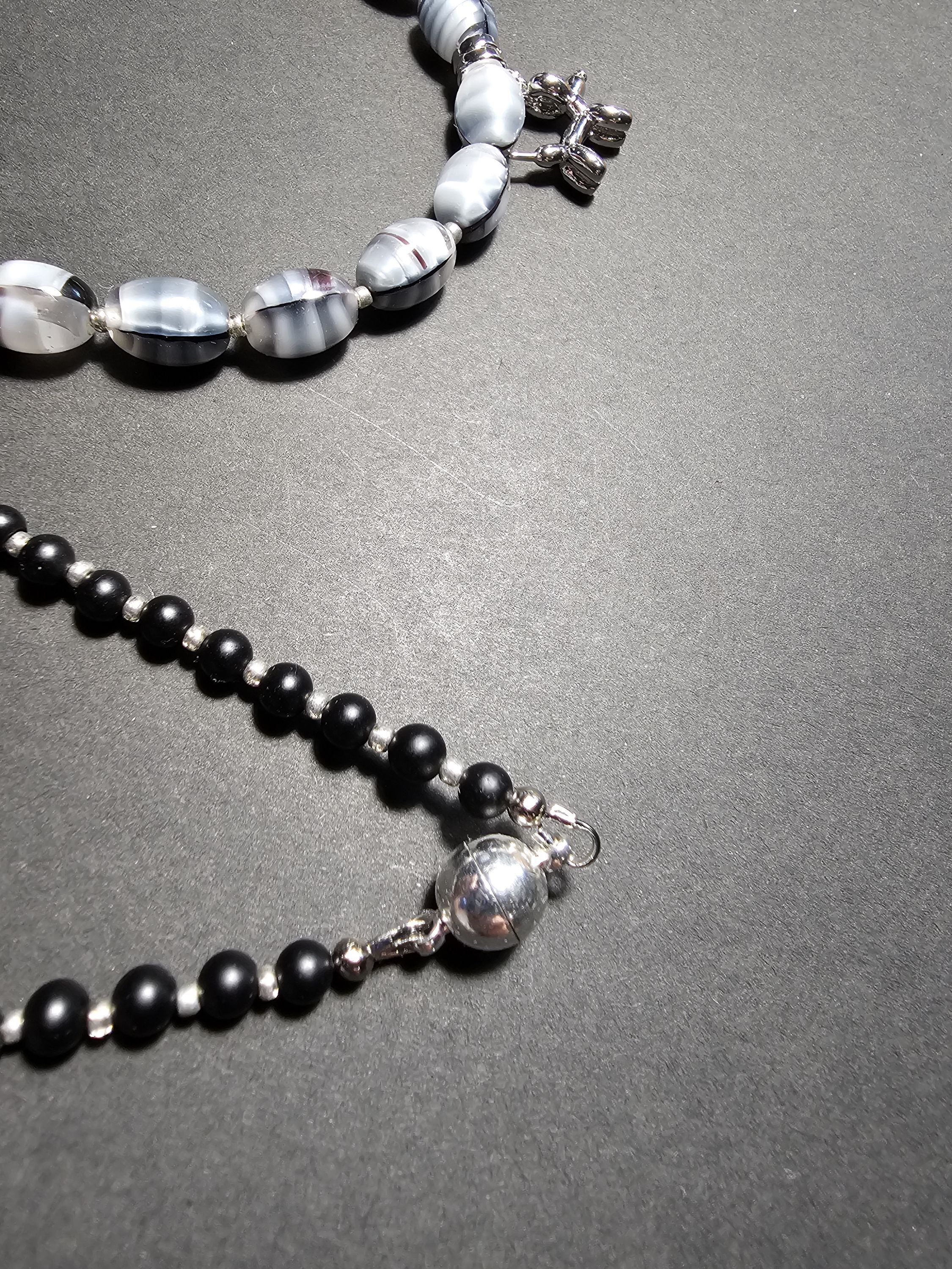 Ожерелье выполнено из чередующихся круглых черных матовых бусин и овальных серо-белых бусин с узорами, что придает ему неповторимый и яркий вид. В центре ожерелья находится декоративная подвеска в виде собаки-шарика, выполненная из натурального агата двух видов, разбавленного серебристым бисером.