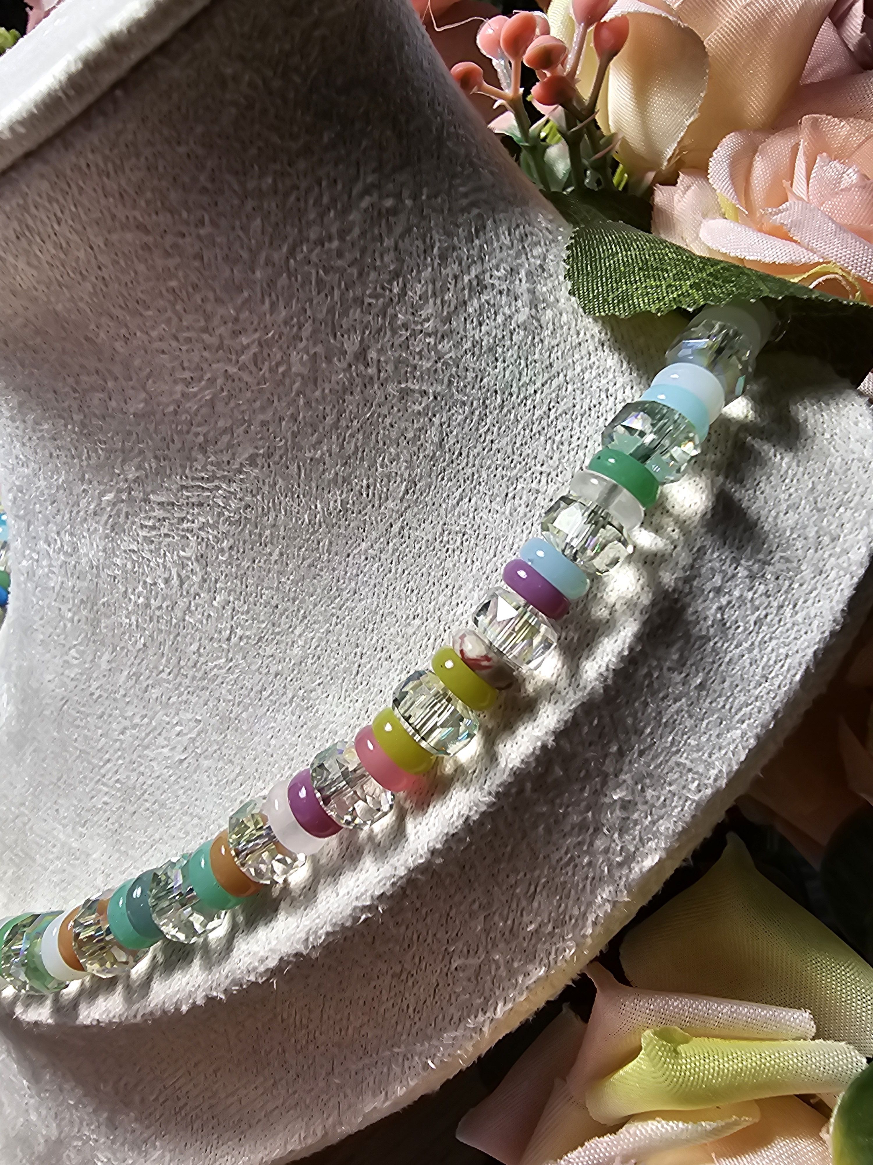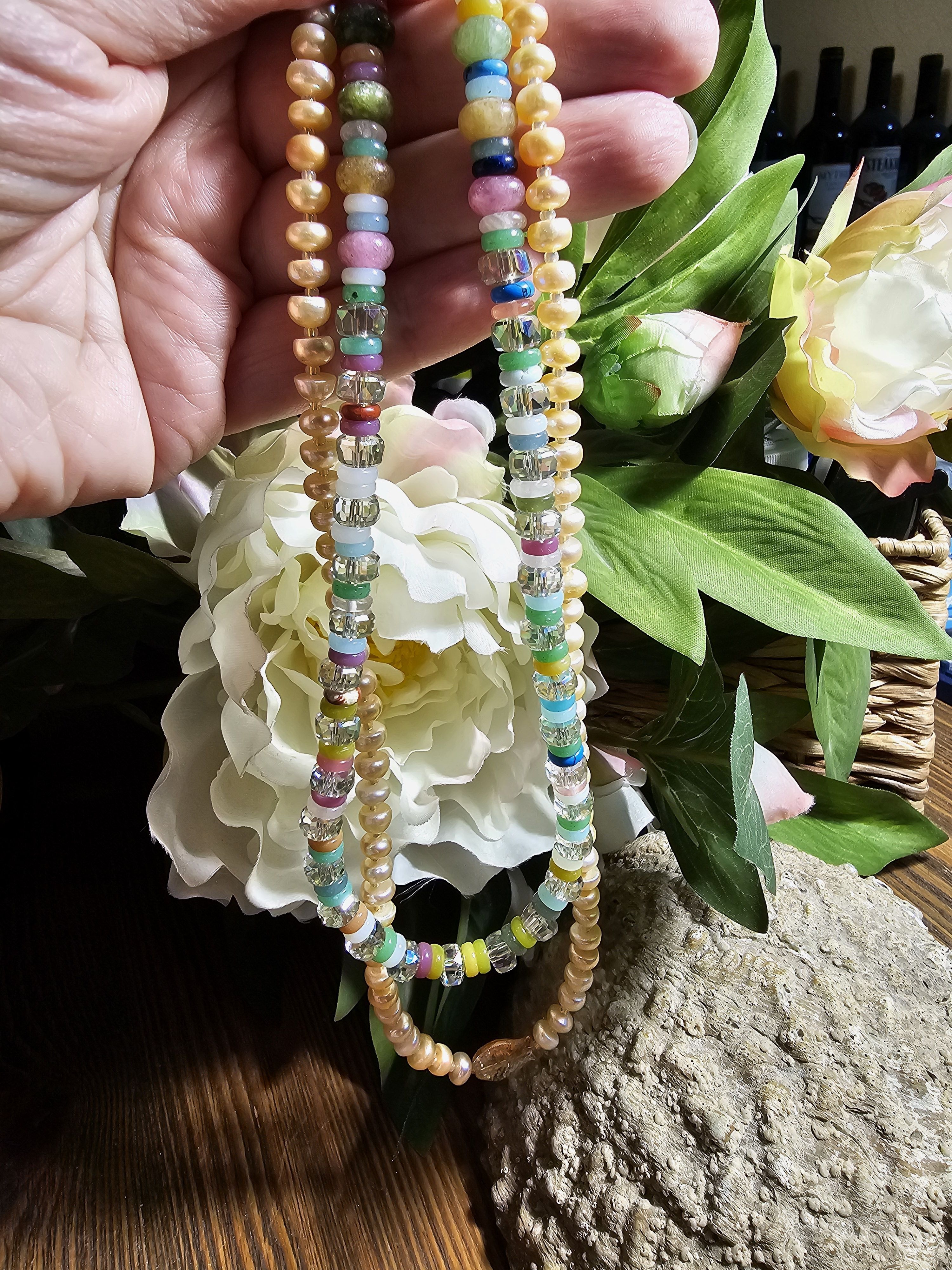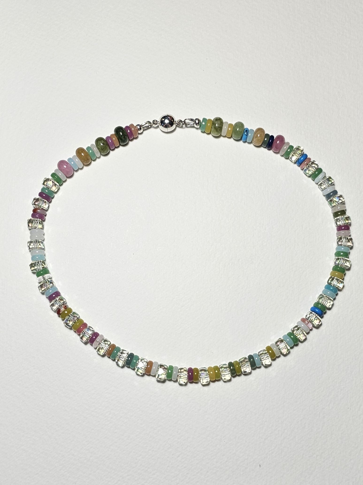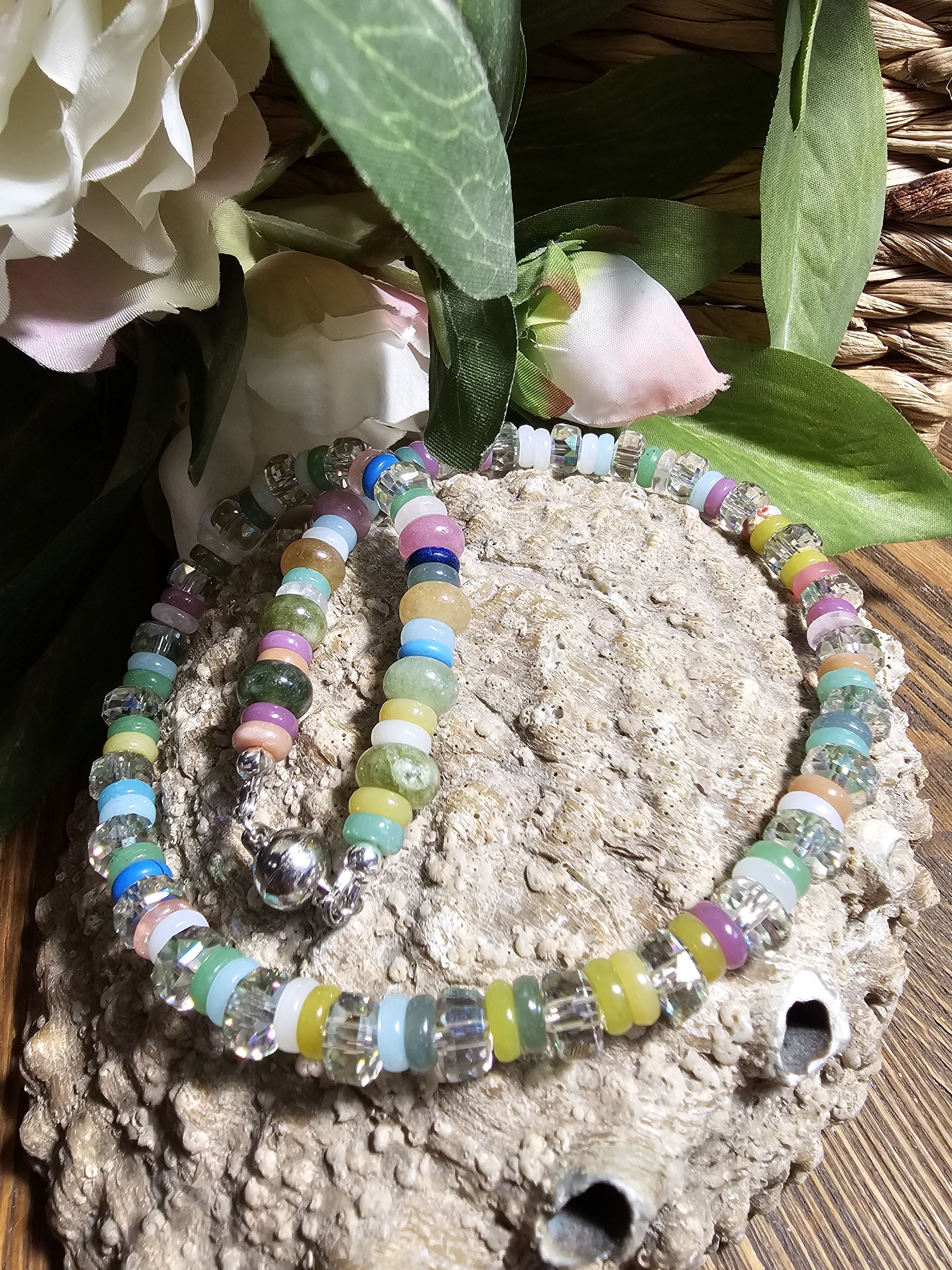 Колье выполнено из натуральных камней и граненого хрусталя, что придает ему особую изысканность и шарм. Бусины из натуральных камней обладают красивыми нежными цветами, а граненый хрусталь добавляет изделию блеска и сияния.