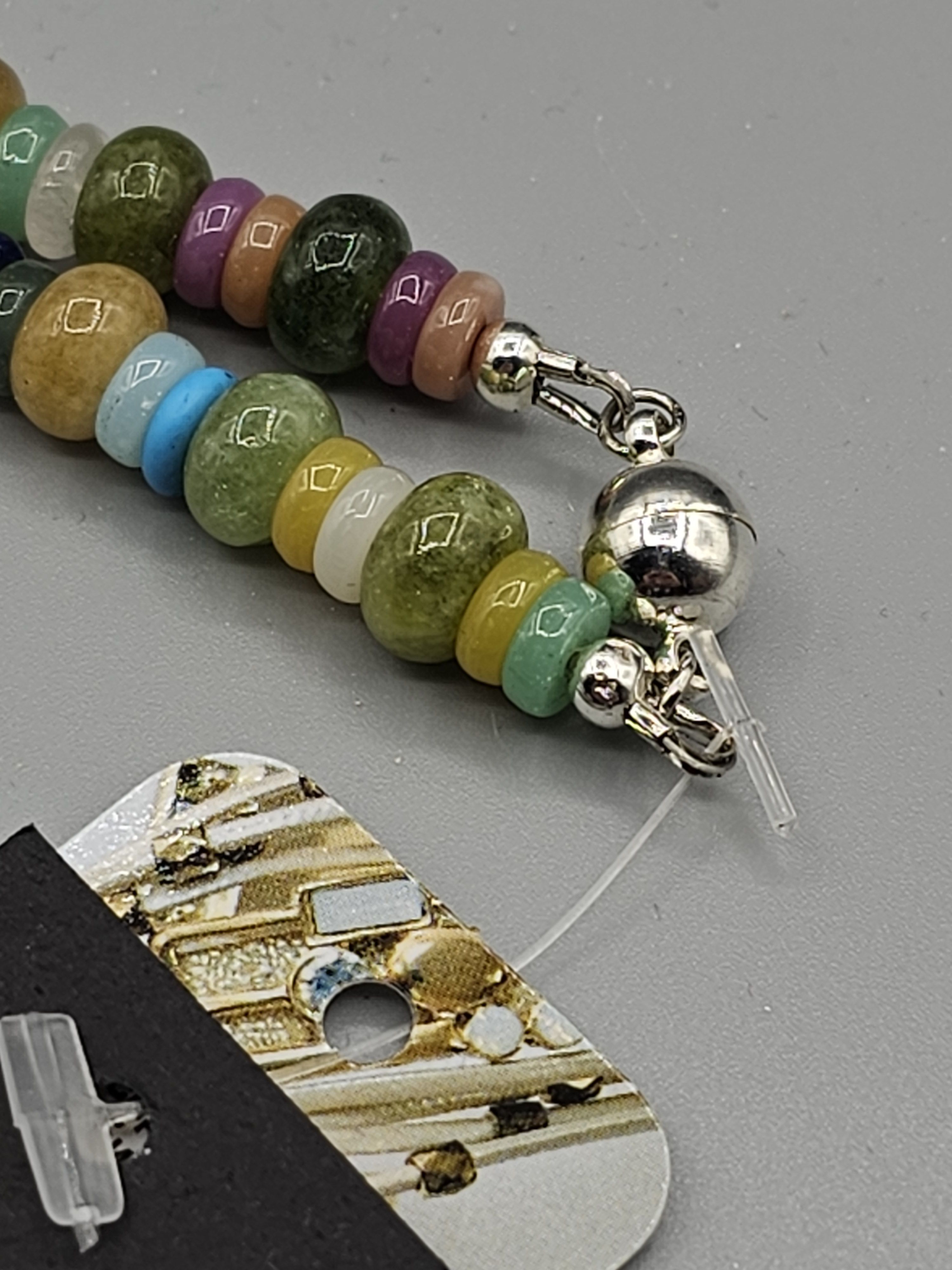 Магнитная застежка серебристого цвета позволяет быстро и легко надевать и снимать колье.